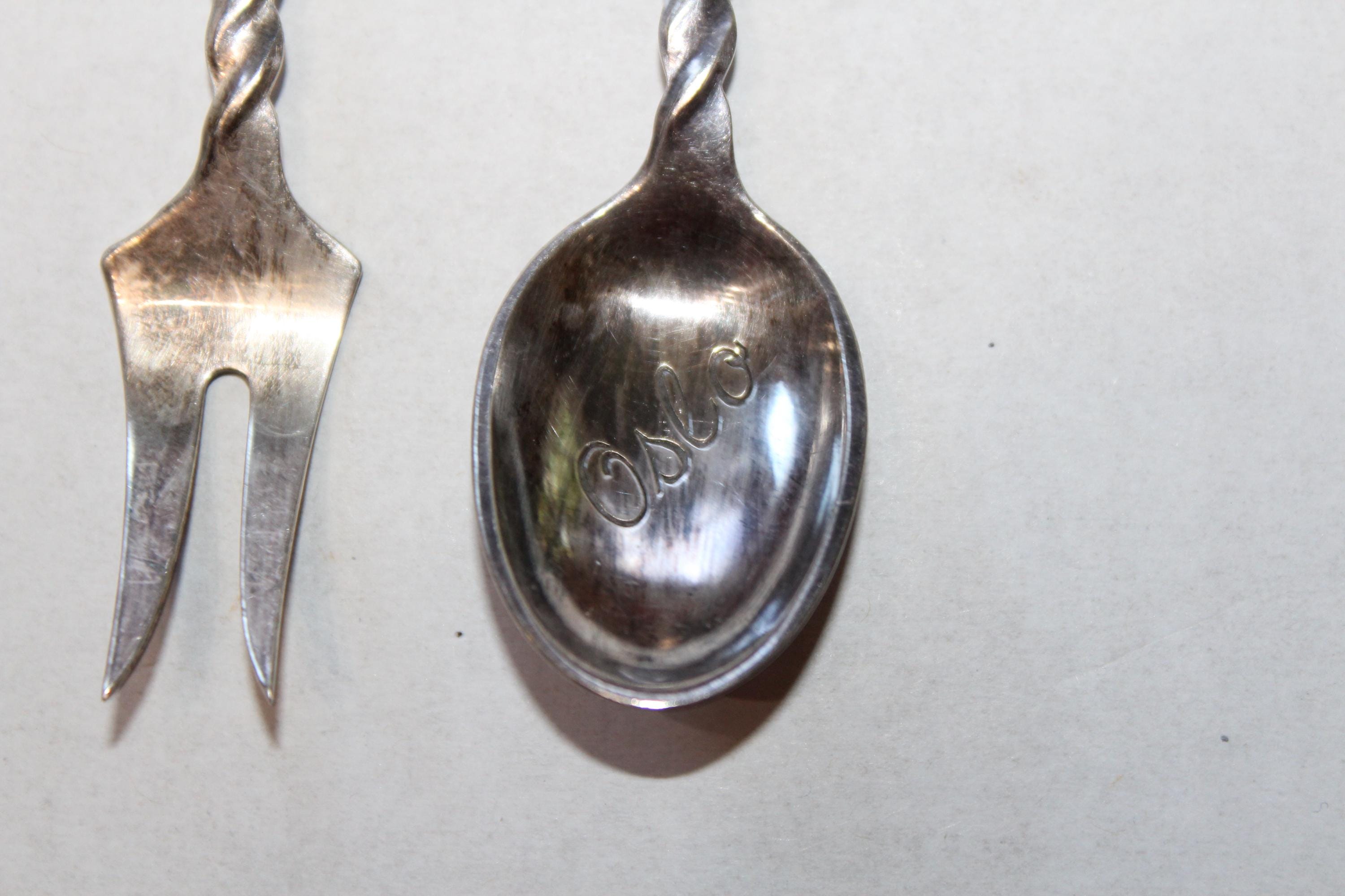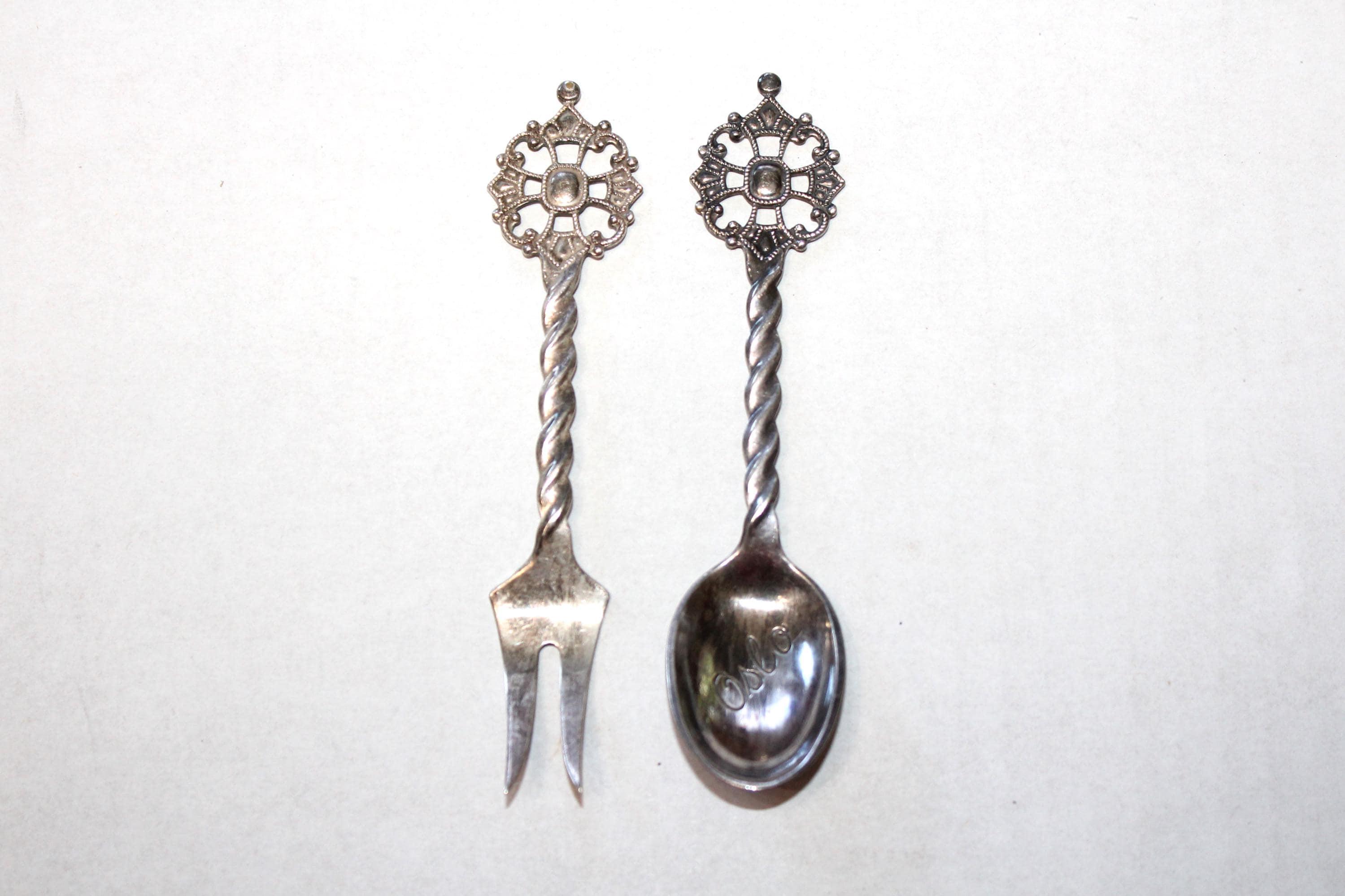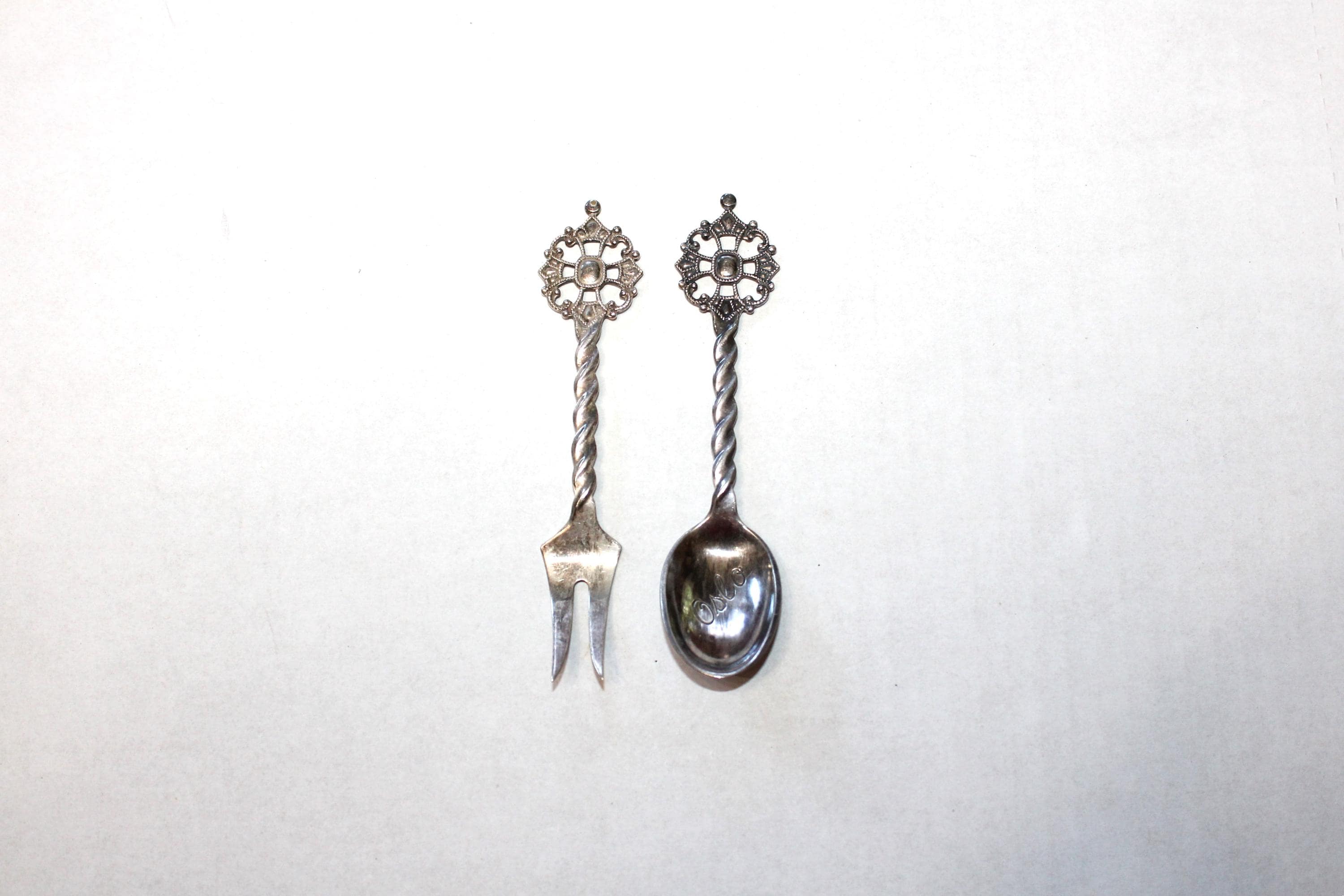 Vintage Oslo Norway souvenir silverplate Kings Cross spoon and fork, in very good condition. They measure 4 1/2" long and are perfect for use or display. Enjoy!