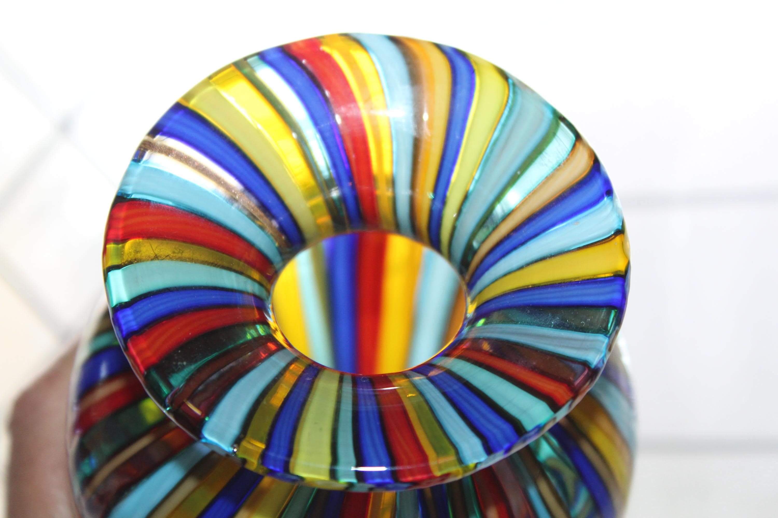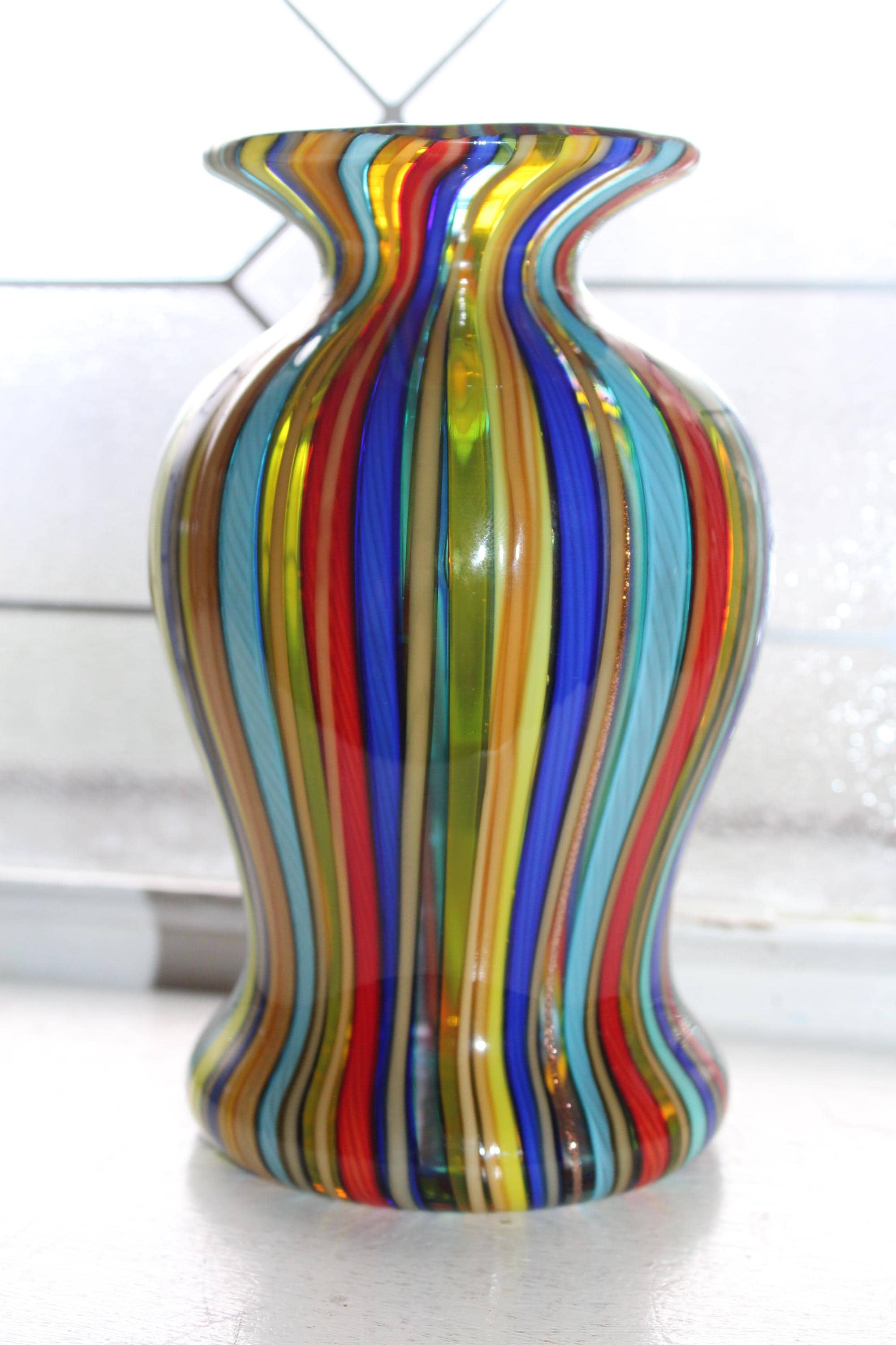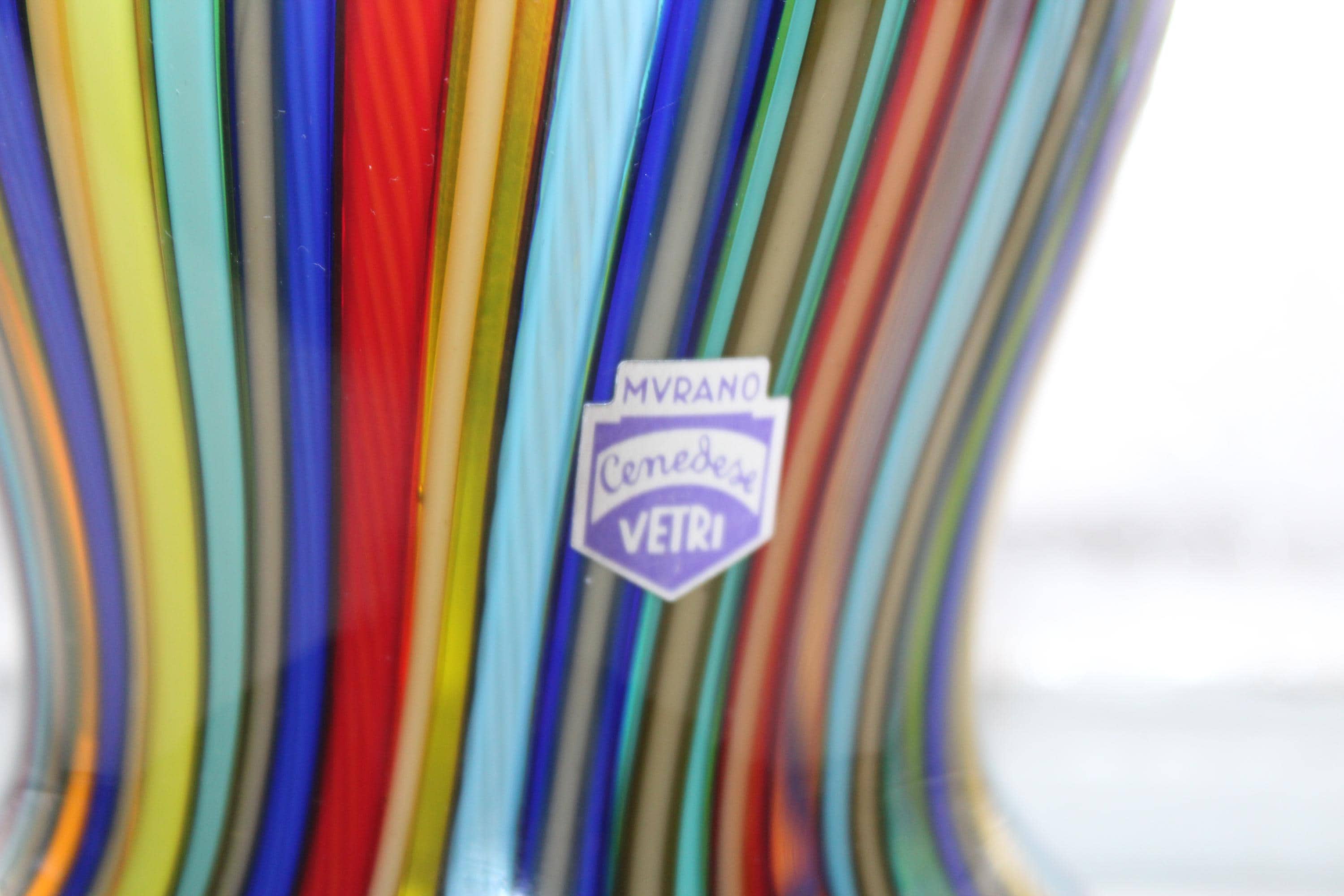 This wonderful Murano Cenedese Vetri art glass vase is decorated with multi colored ribbon, latticino and gold aventurine stripes. It measures 7" high, weighs 2 lbs. and is in excellent condition with no damage. It is signed Cenedese on the underside and has the original Murano Cenedese Vetri sticker. Enjoy!