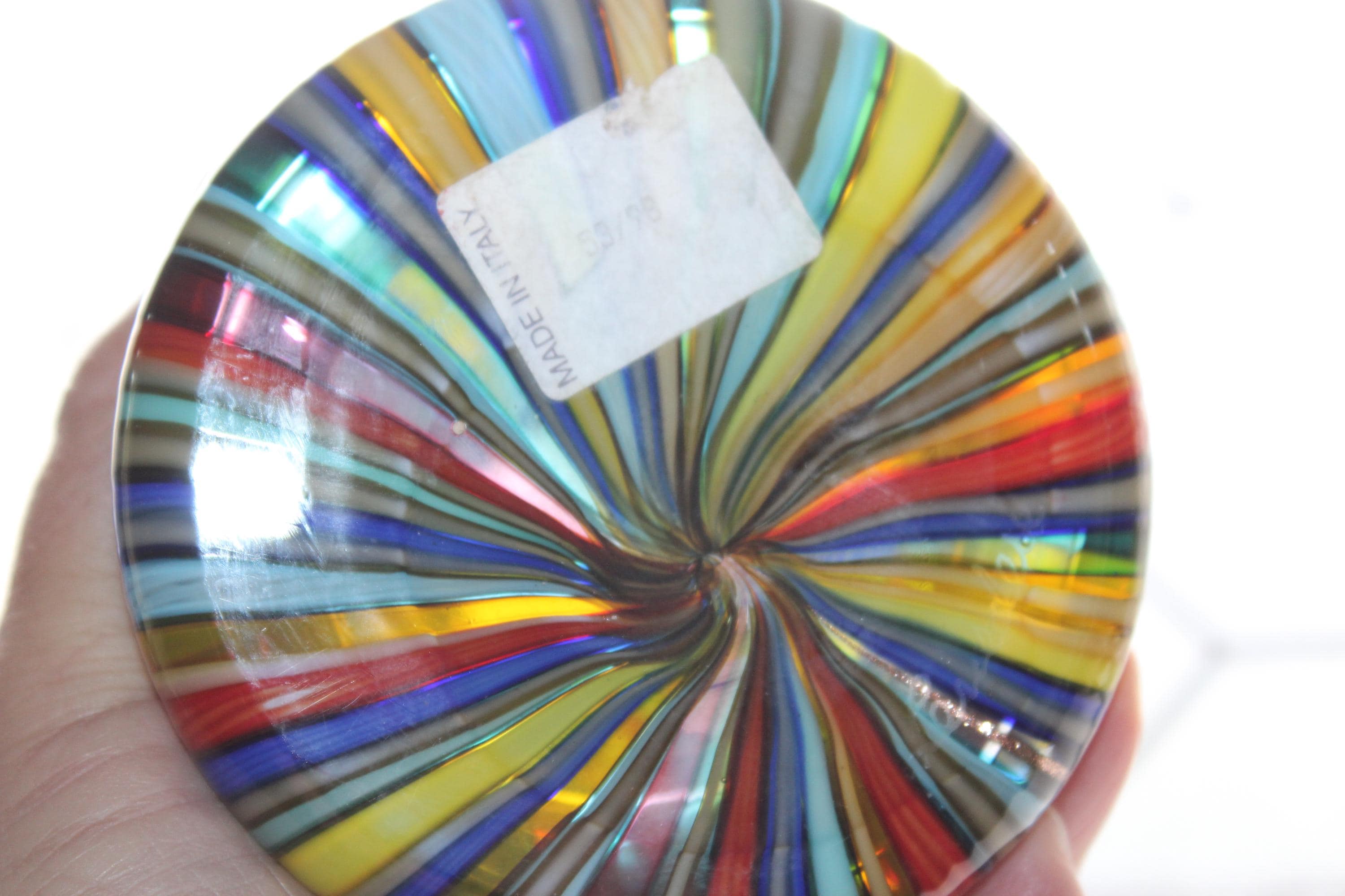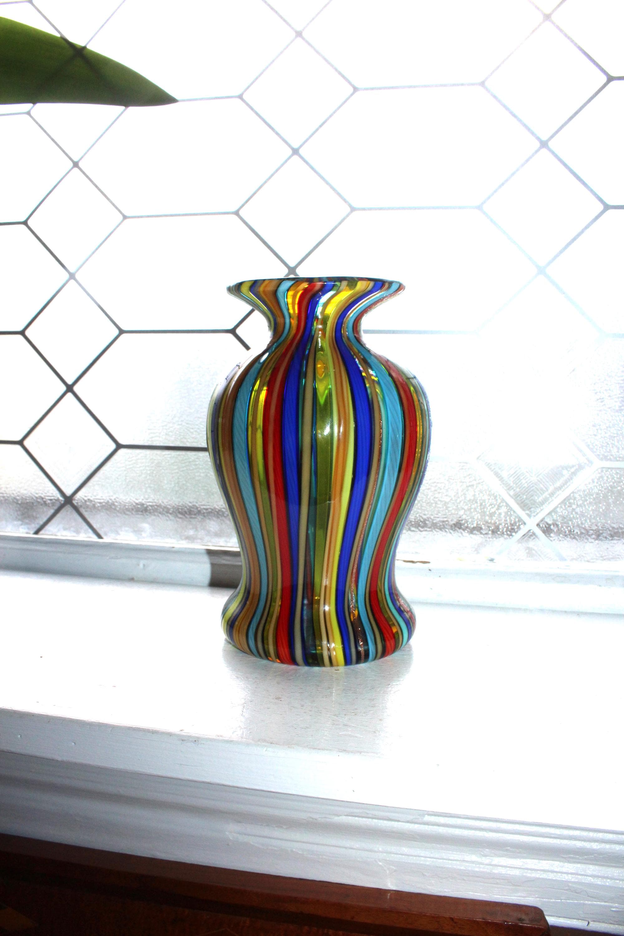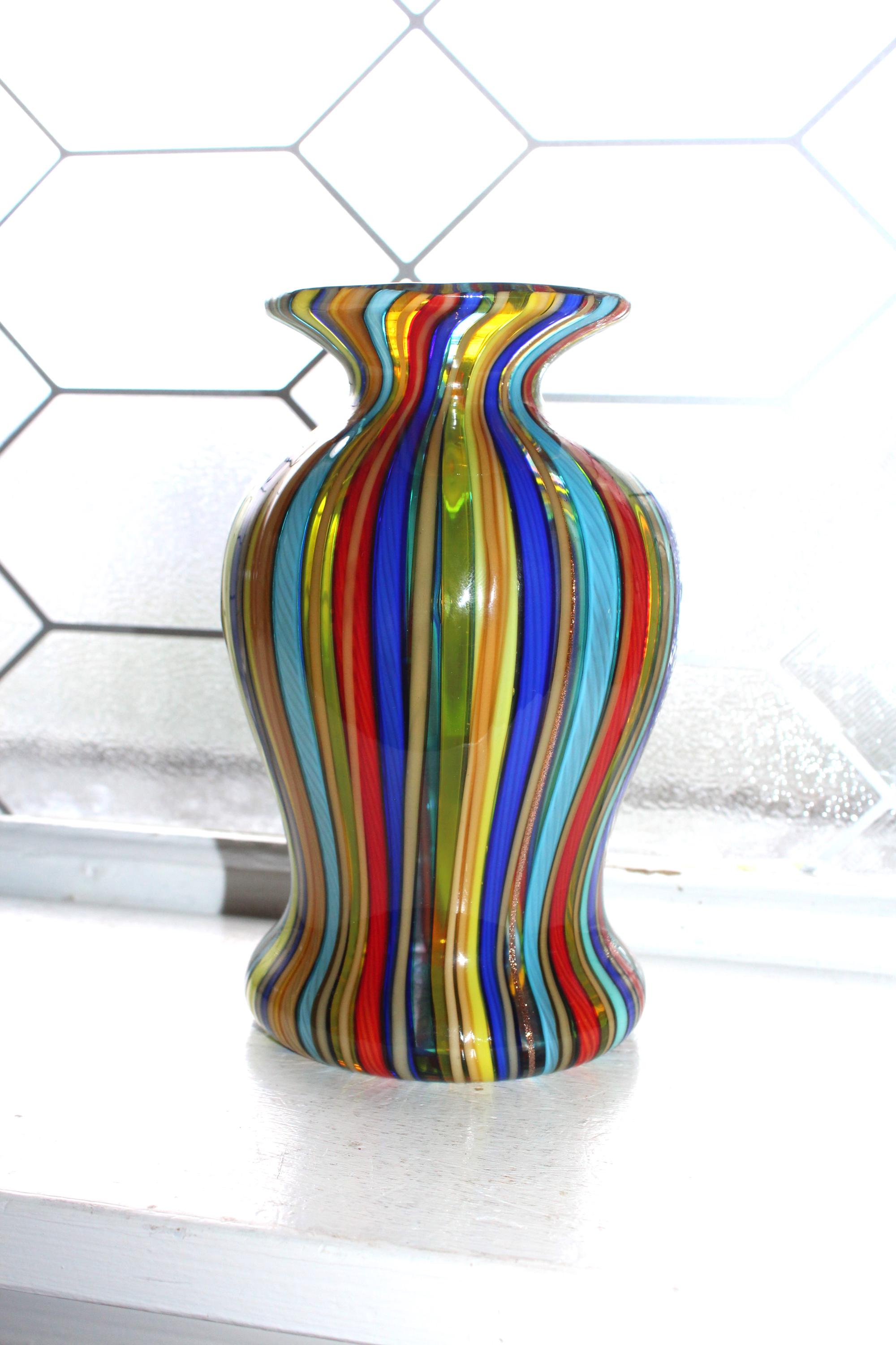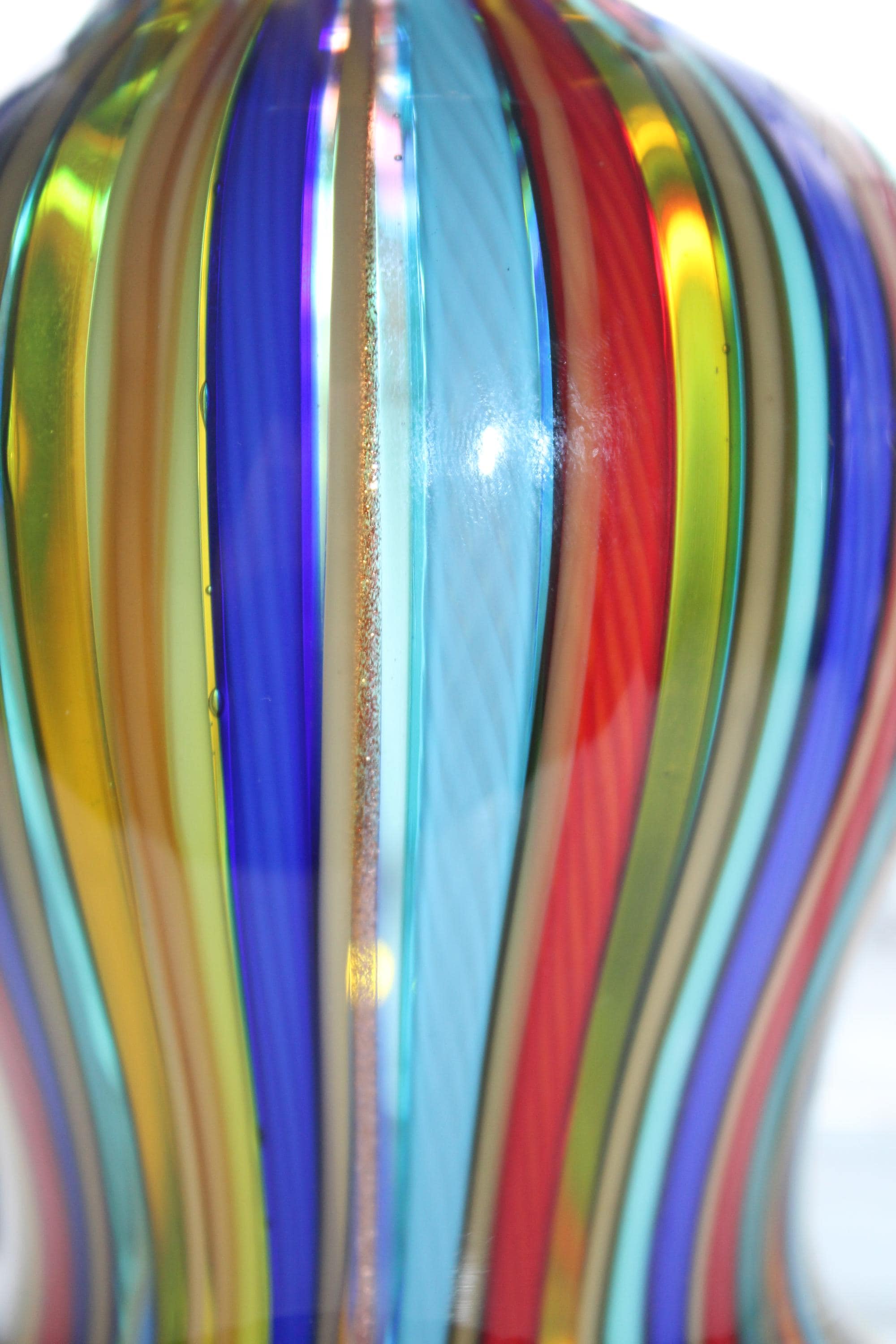 This wonderful Murano Cenedese Vetri art glass vase is decorated with multi colored ribbon, latticino and gold aventurine stripes. It measures 7" high, weighs 2 lbs. and is in excellent condition with no damage. It is signed Cenedese on the underside and has the original Murano Cenedese Vetri sticker. Enjoy!
