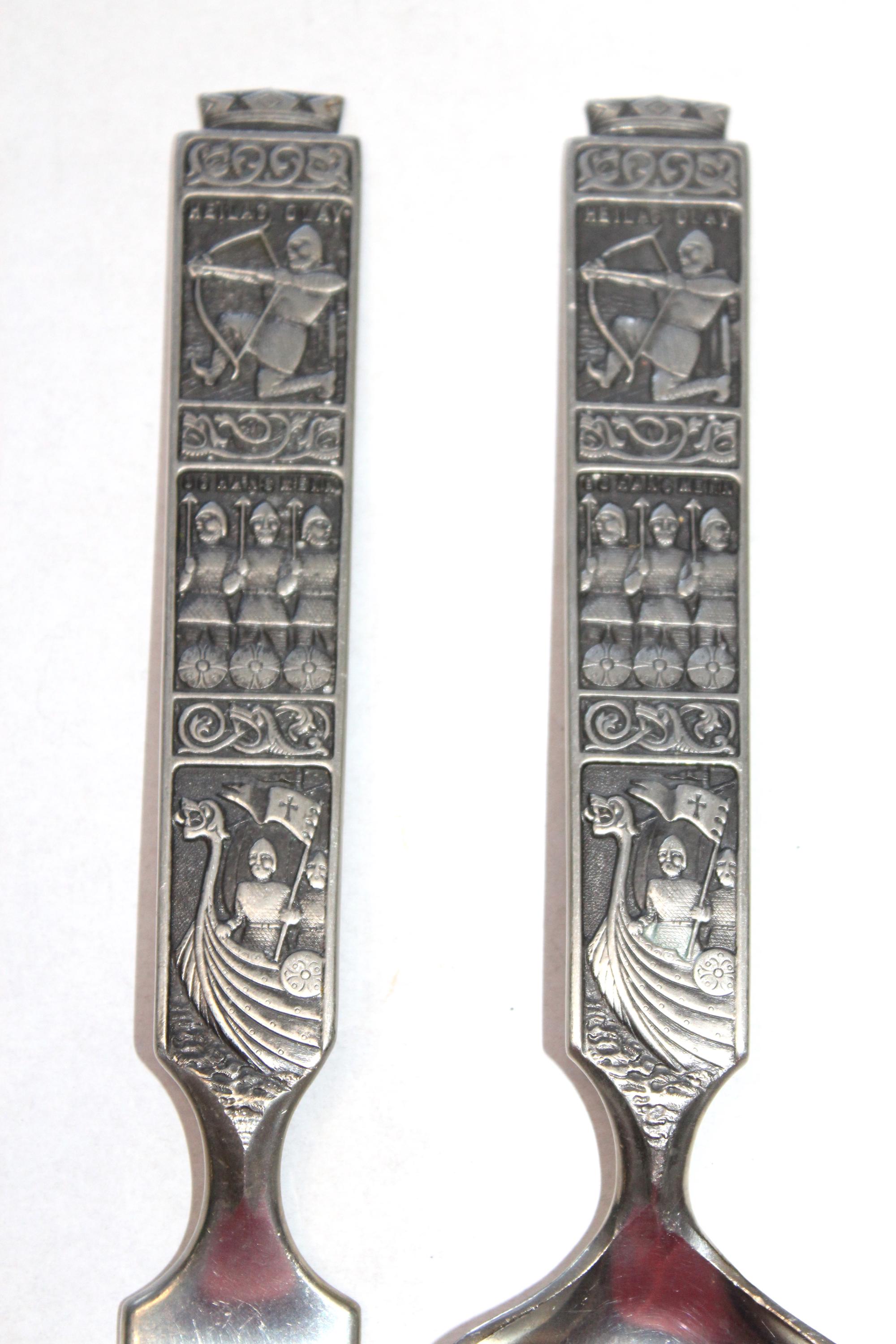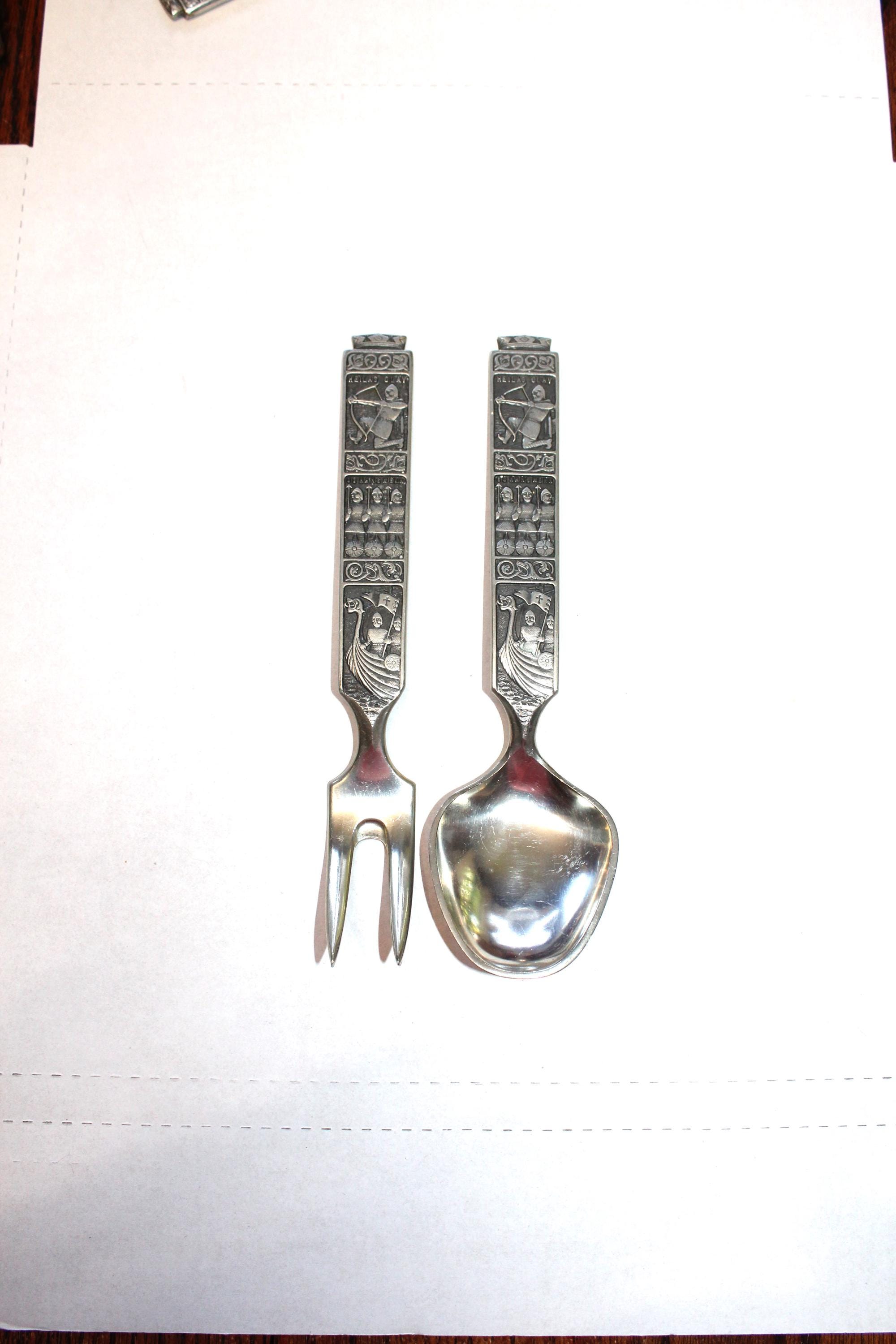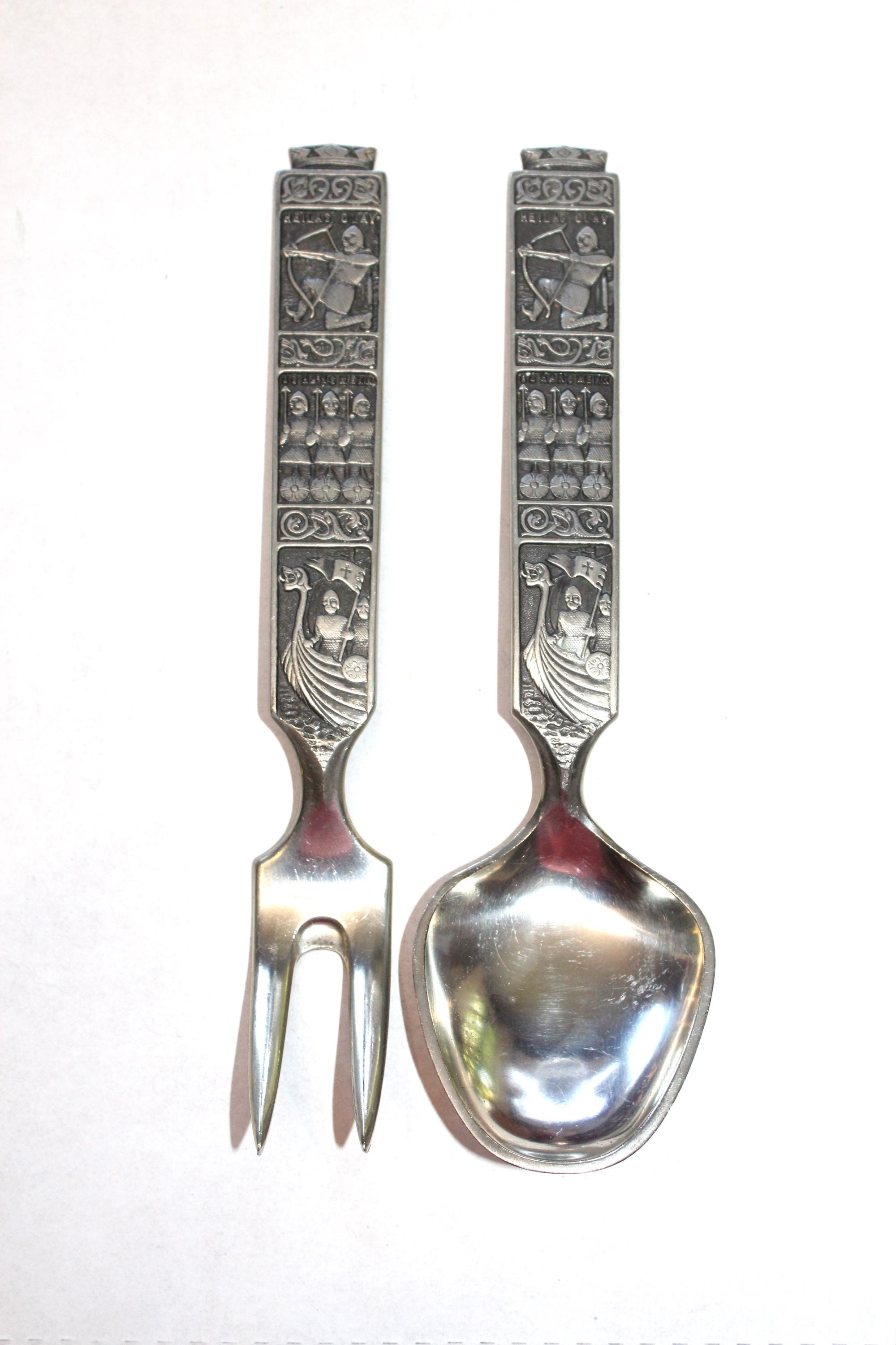 Vintage Norwegian pewter large fork and spoon with Viking scenes, in excellent condition. The fork measures 8 3/8" long and they are perfect for use or display. Marked HS Tinn Pewter Norway on the back. Enjoy!