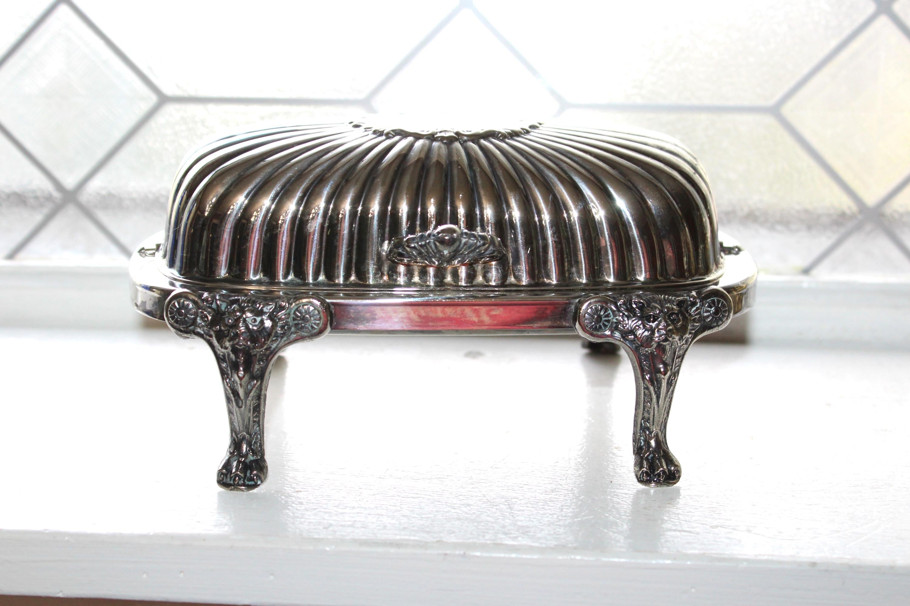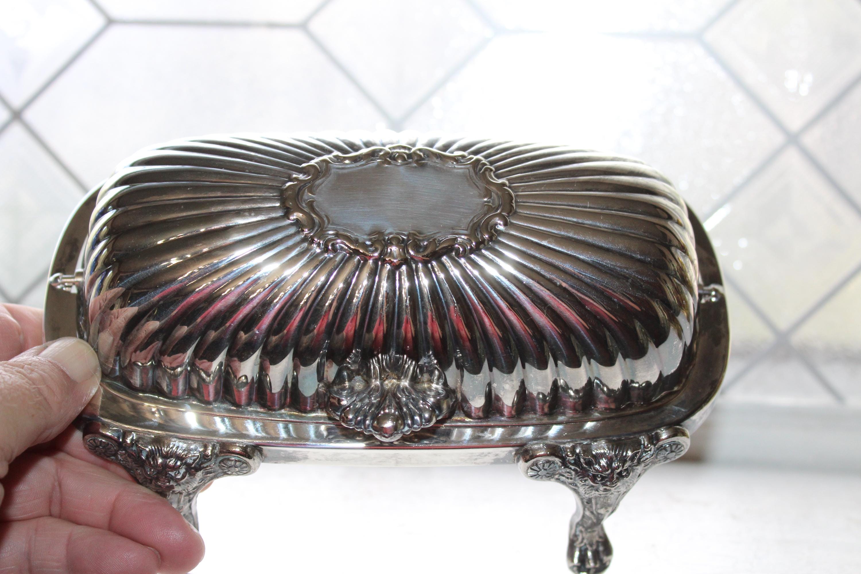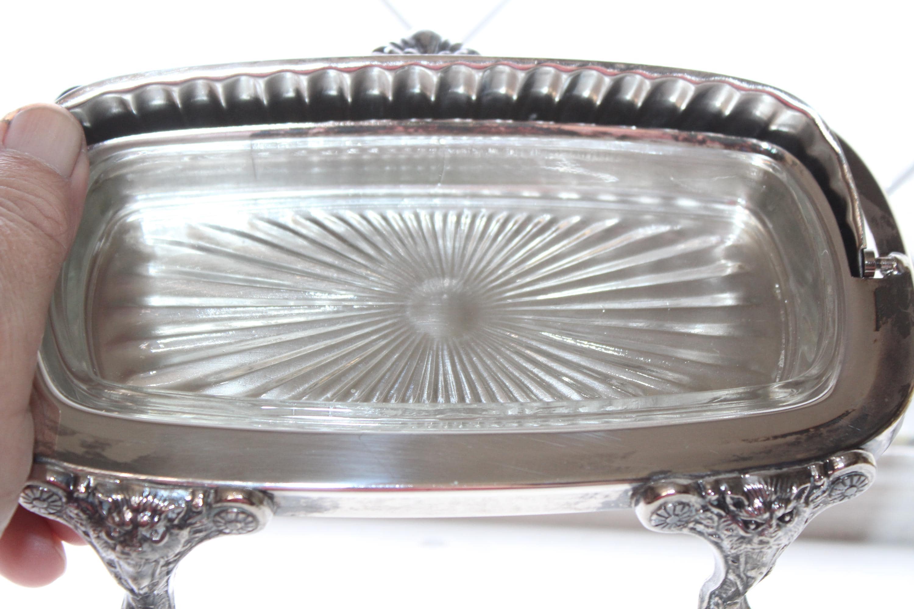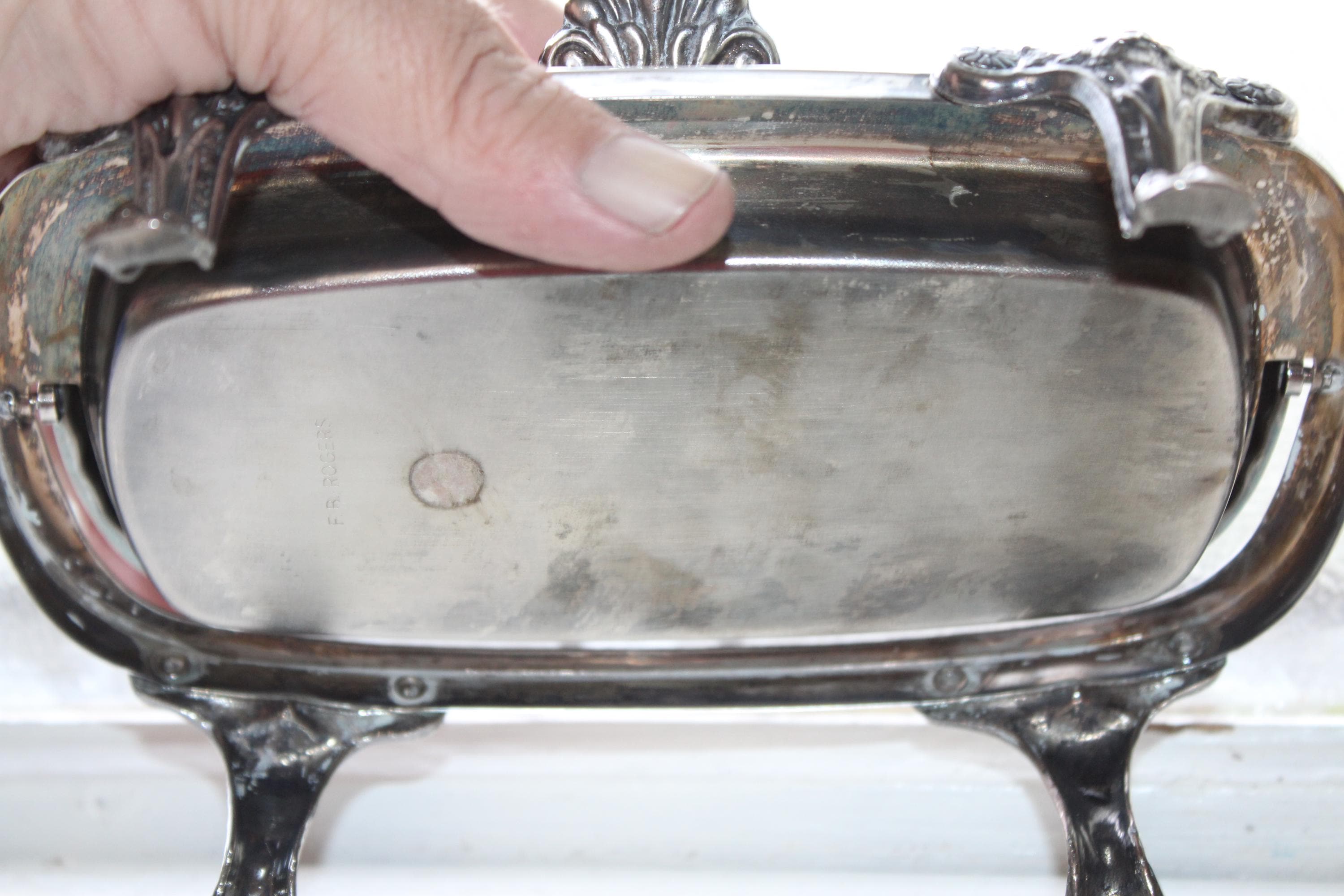 Vintage FB Rogers Silver Co. footed silverplate roll top butter dish with glass insert, in excellent condition. It measures 7 1/2" wide. Enjoy!