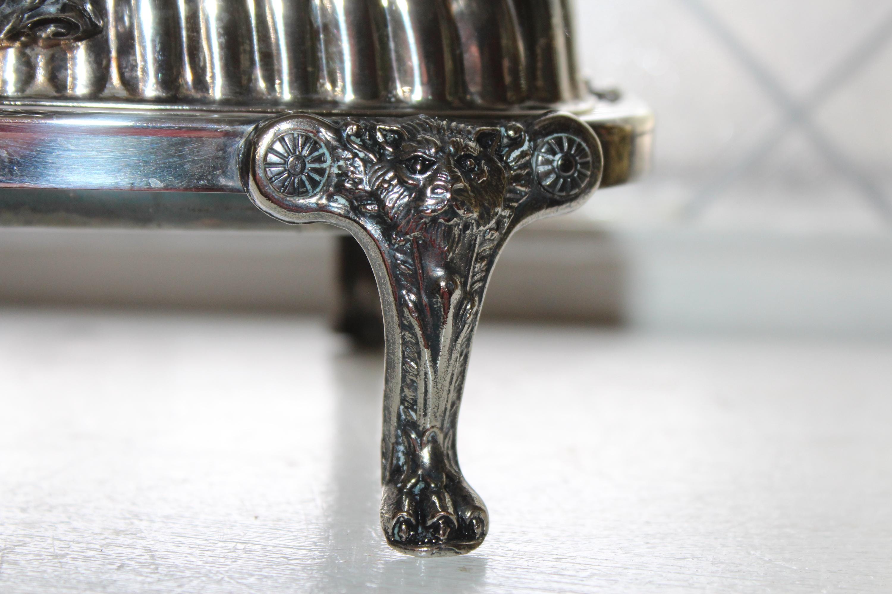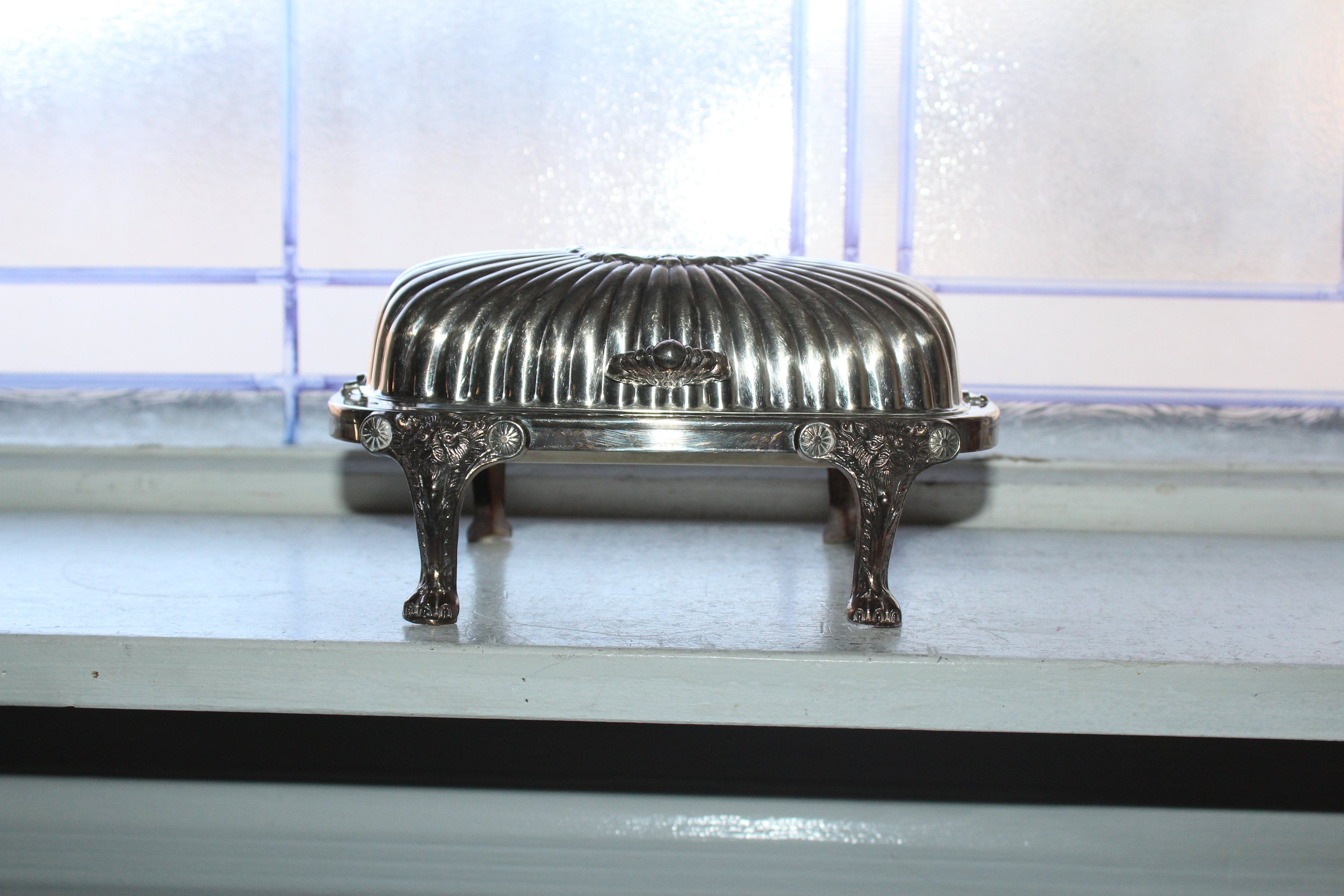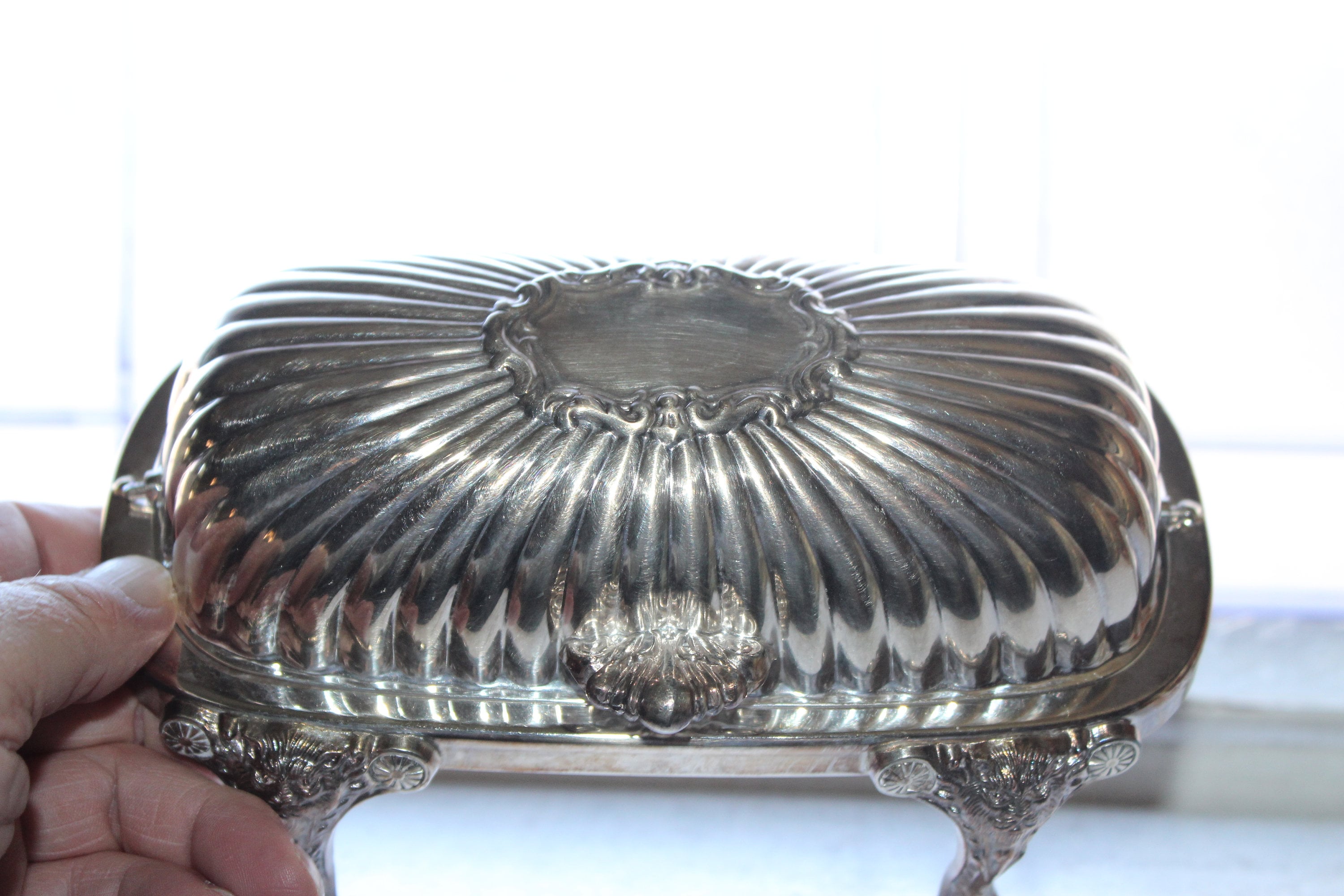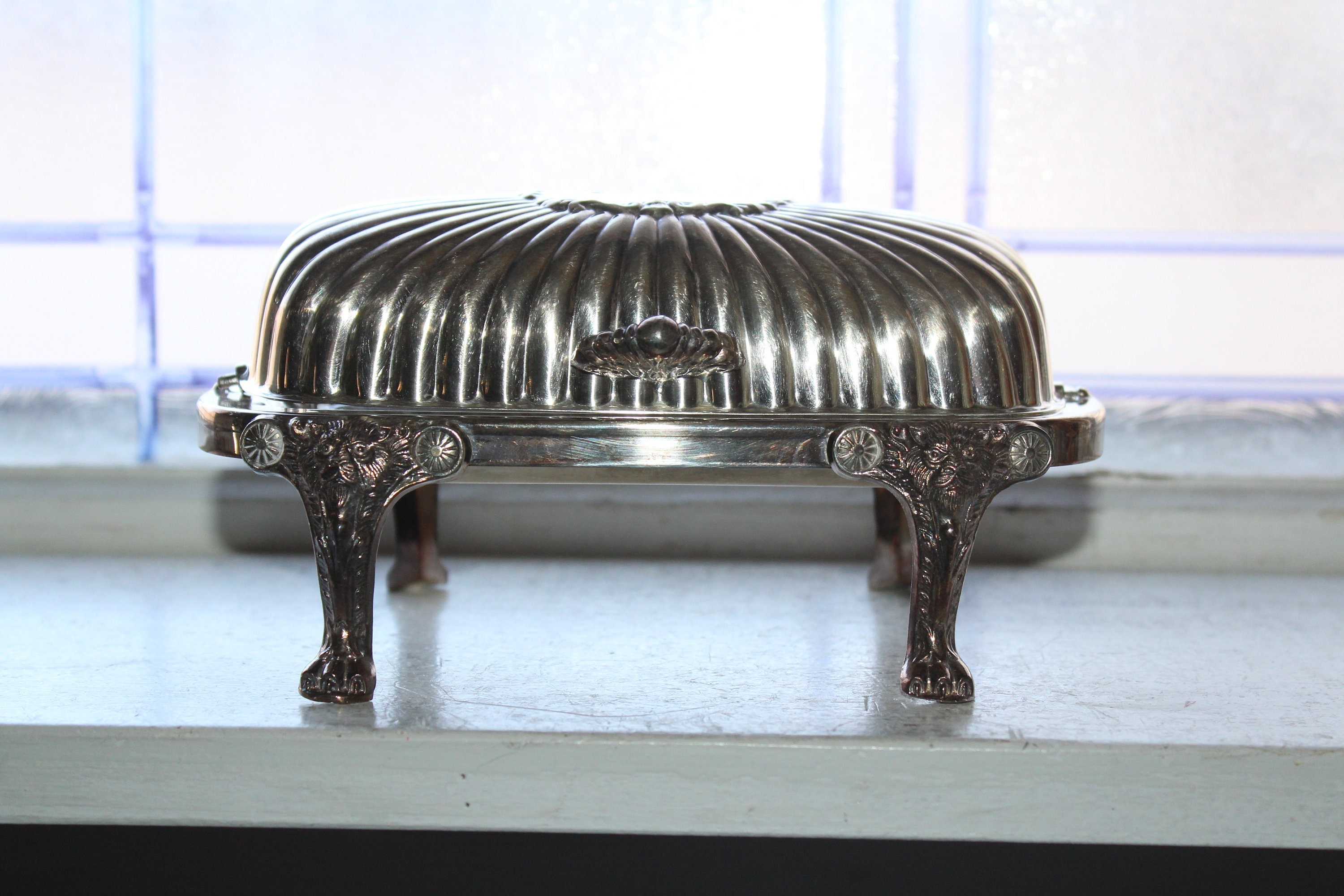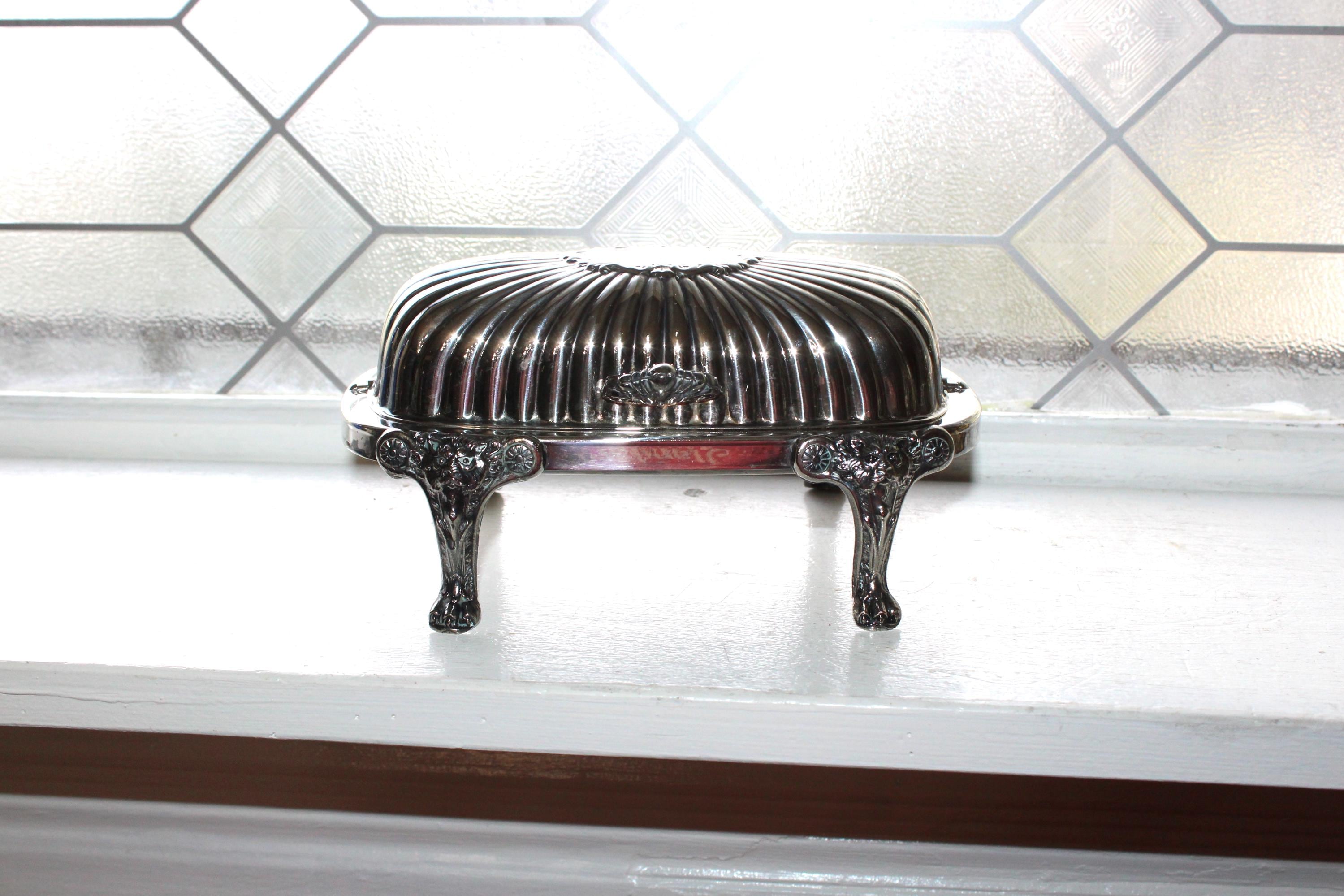 Vintage FB Rogers Silver Co. footed silverplate roll top butter dish with glass insert, in excellent condition. It measures 7 1/2" wide. Enjoy!