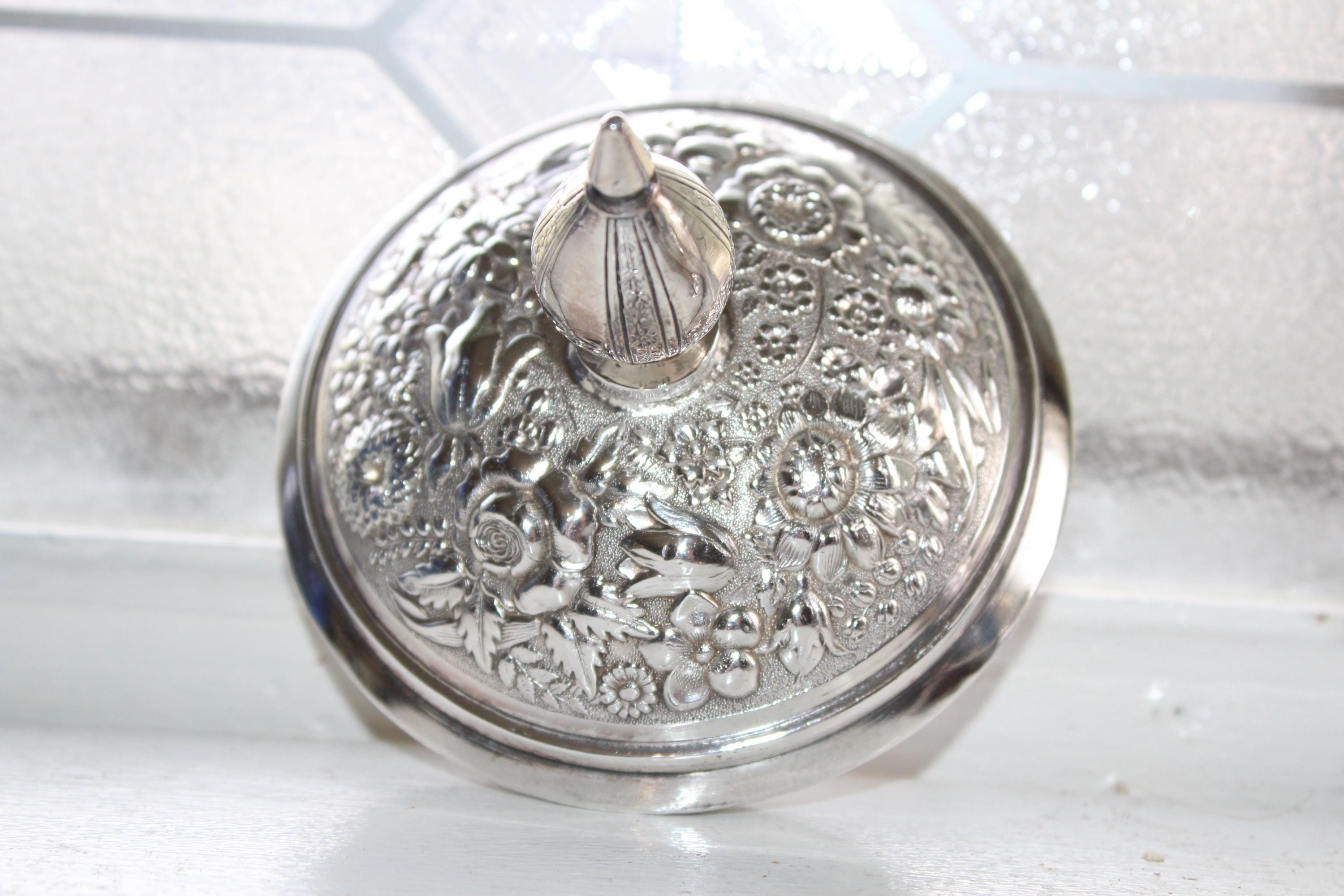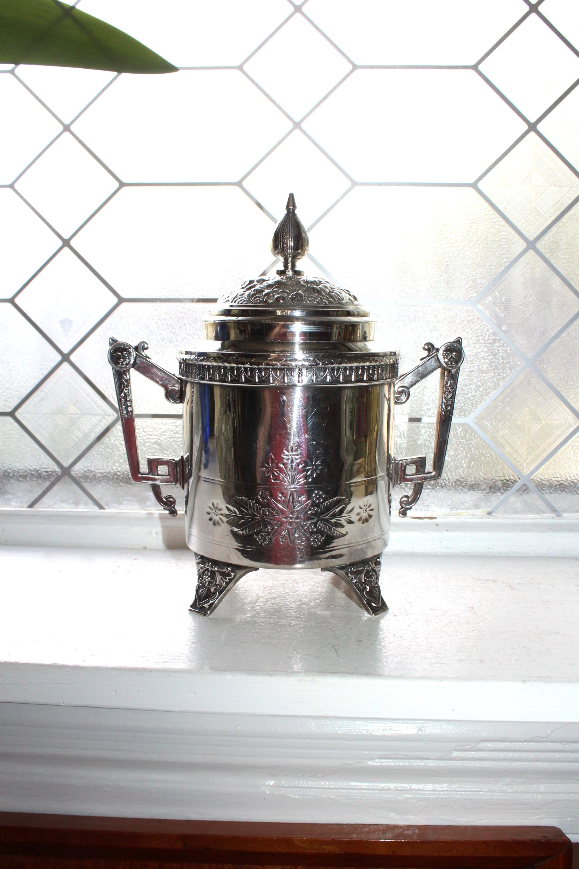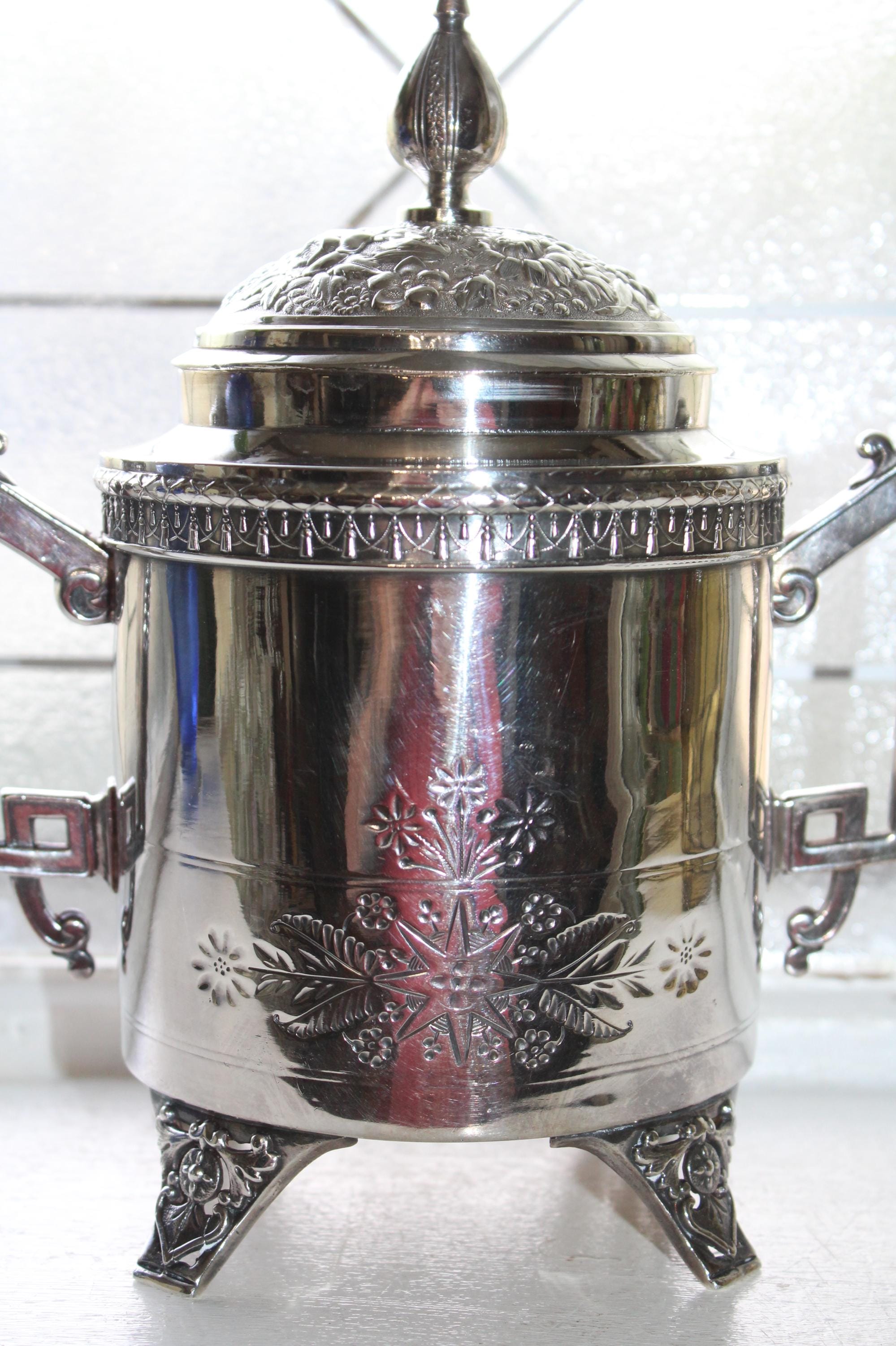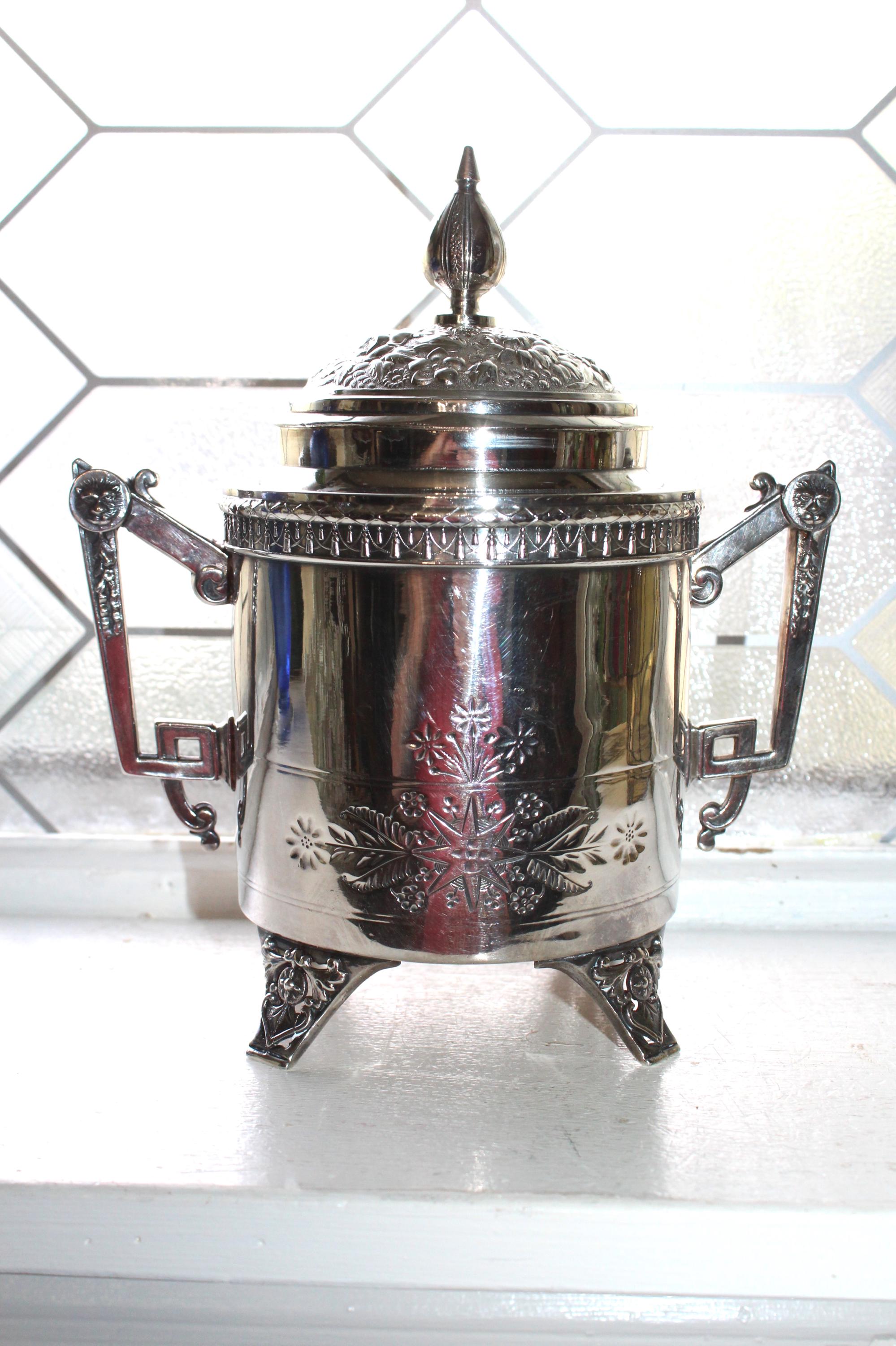 Circa 1870s antique quadruple plate silverplate biscuit barrel/cookie jar or large sugar bowl with lid, typical of the Aesthetic Movement/Eastlake style, made by Rogers, Smith & Co. of New Haven, CT. This gorgeous and ornate piece is in very good condition with no damage. It features ornate floral repousse lid and chased floral and fauna body decor, measures 8 1/4" high and weighs 1 1/2 lbs. Perfect for use and display in a Victorian home. Enjoy!
