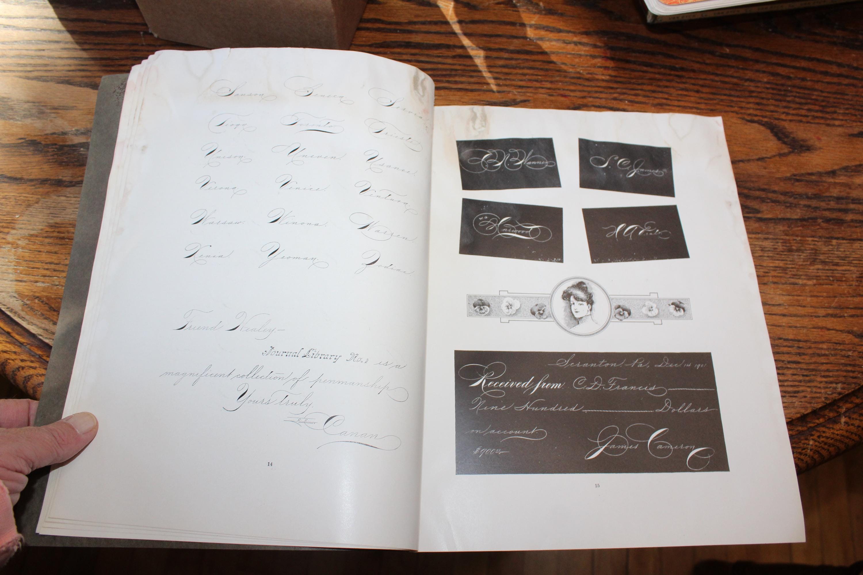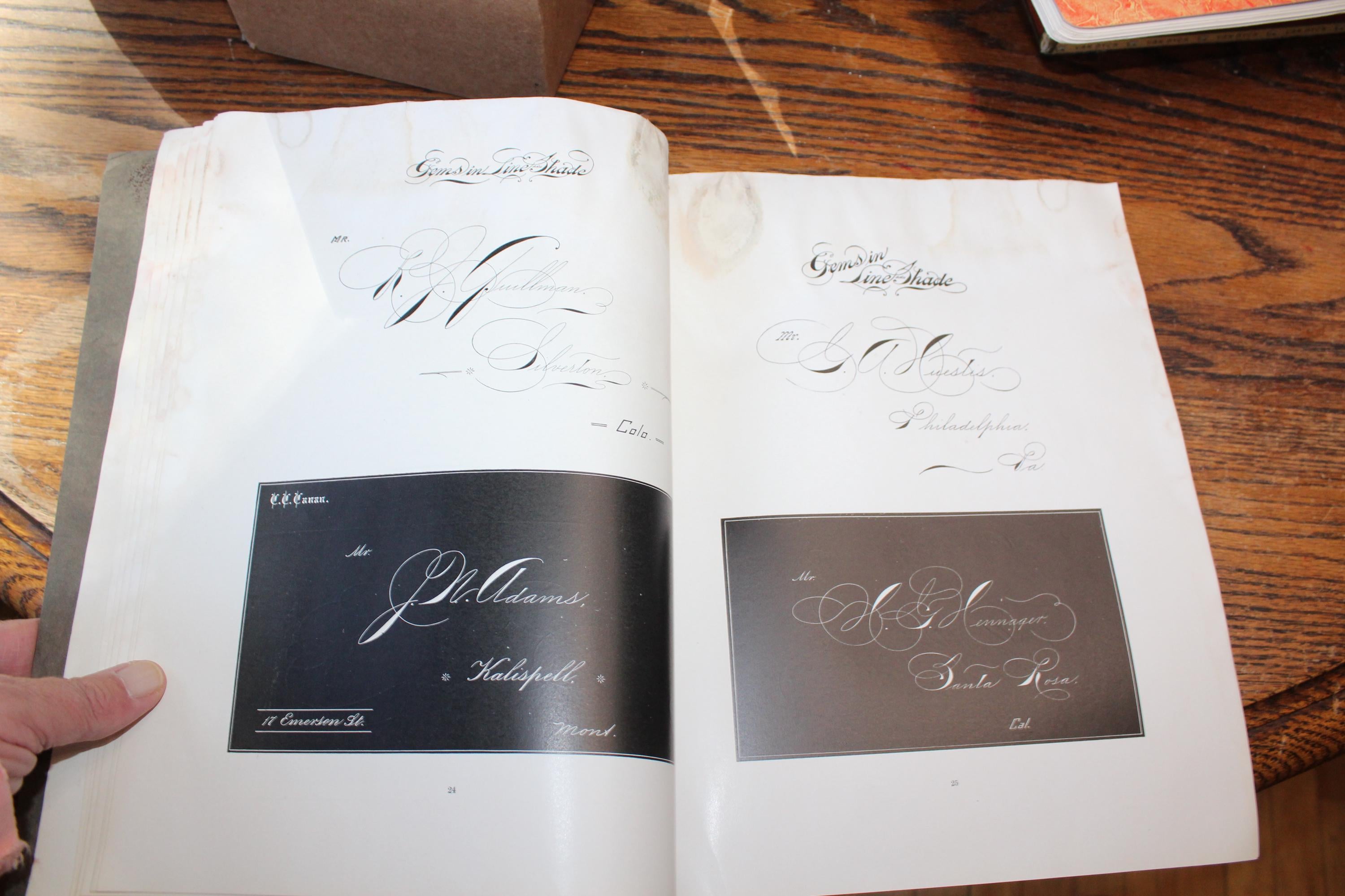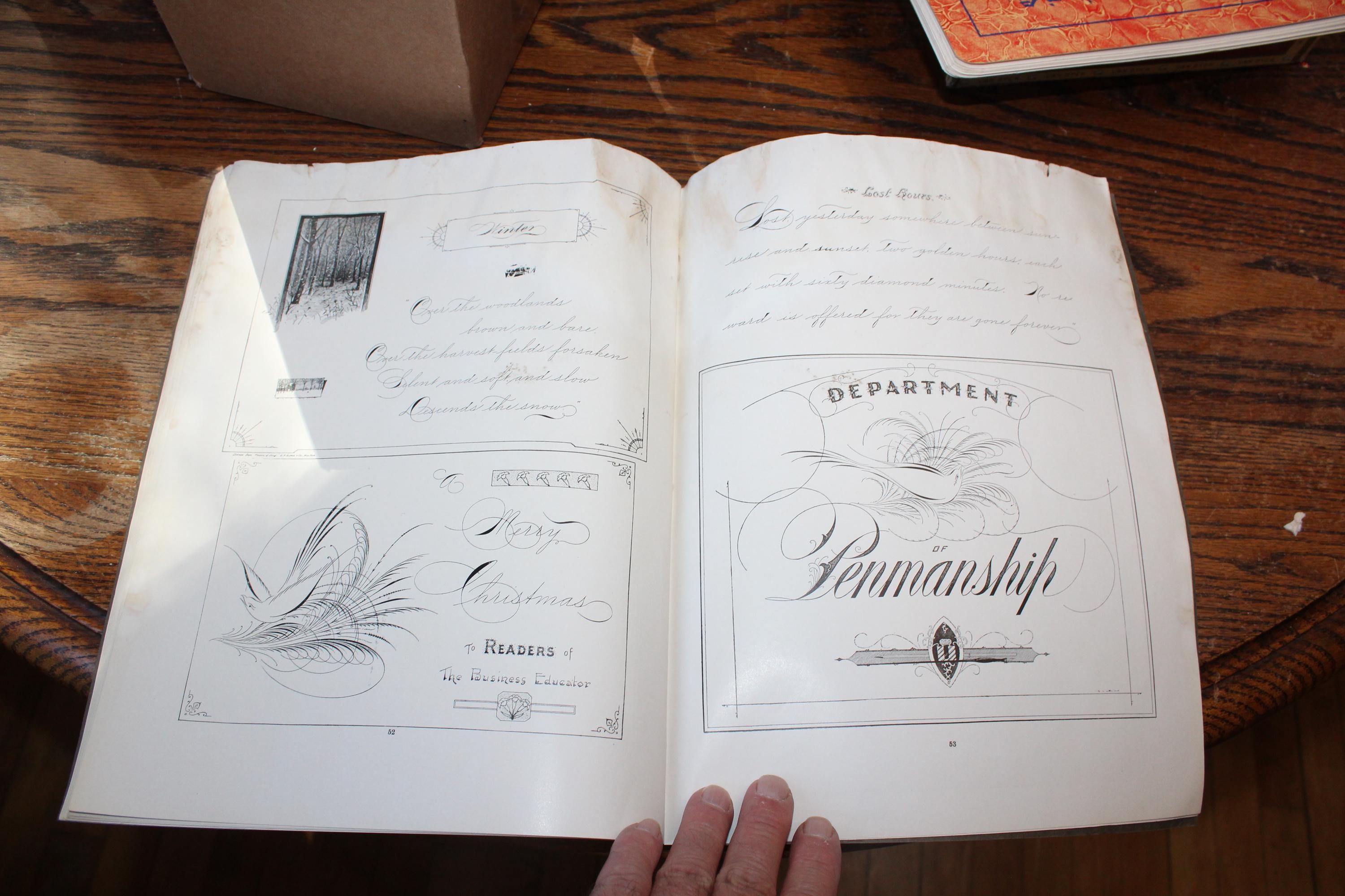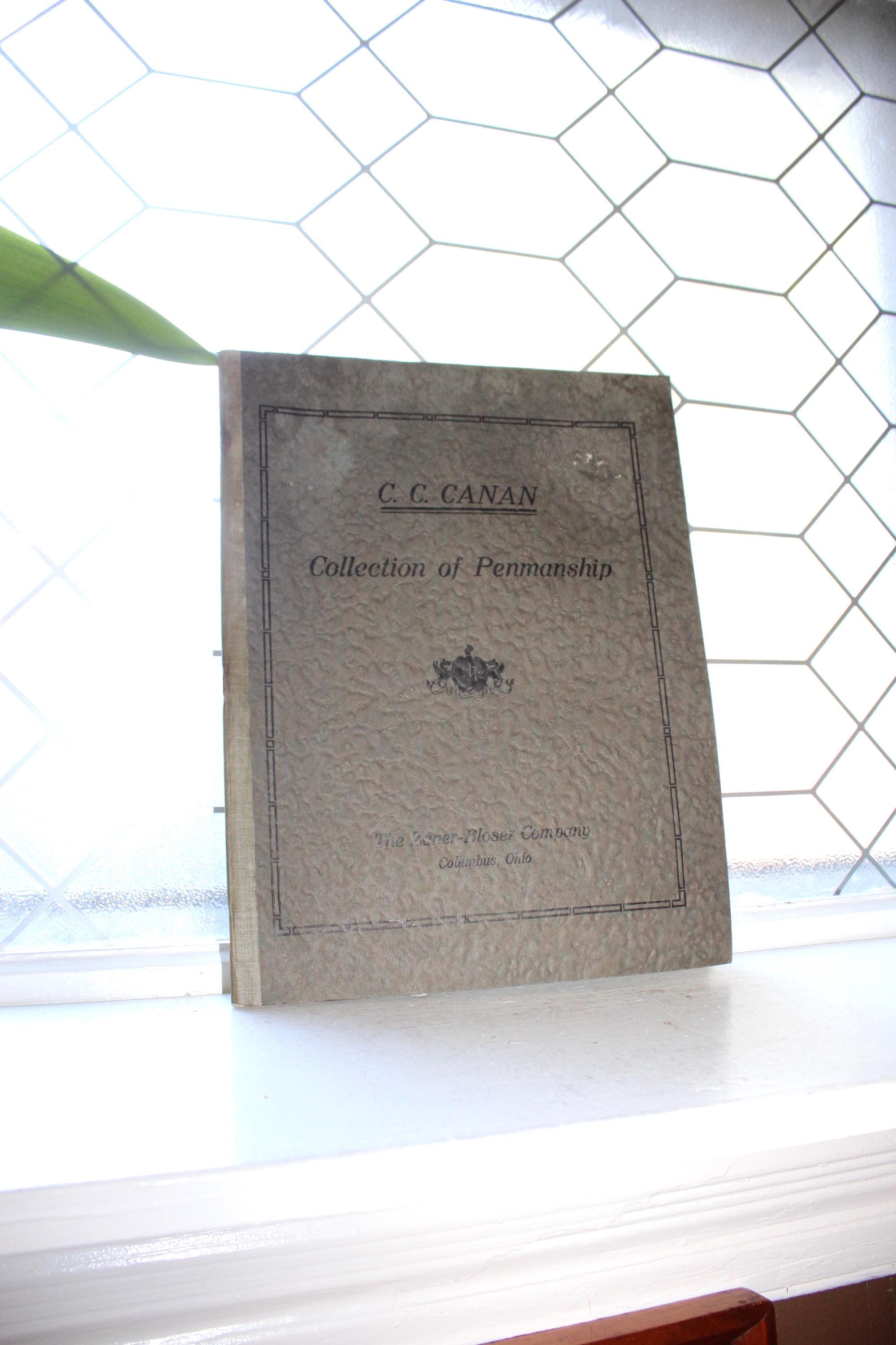 This is C. C. Canan Collection of Penmanship, an antique 1921 soft cover book on penmanship published by The Zaner-Bloser Company. It measures 12 1/4" x 9 1/2" and has 64 pages. Some page and cover staining and soiling along with page tears. Enjoy!