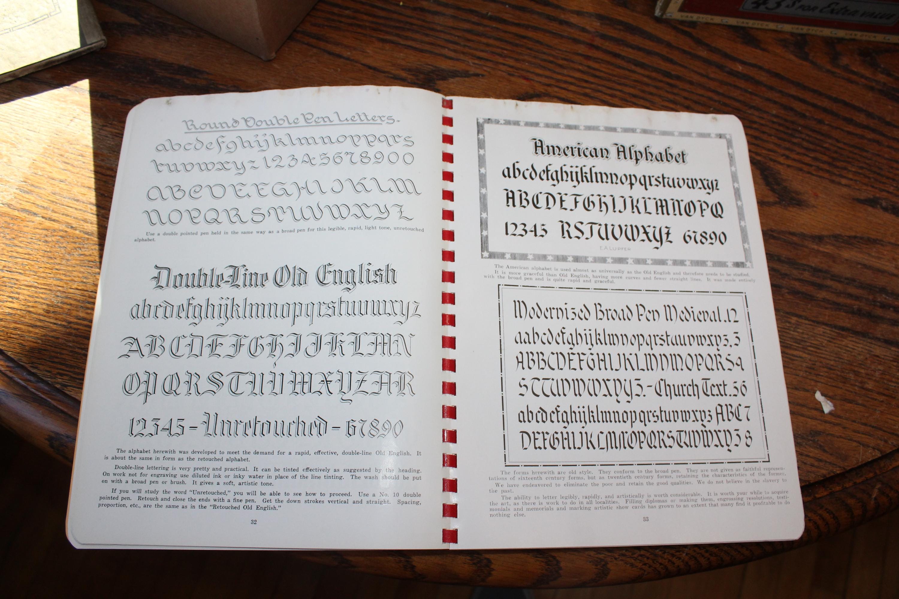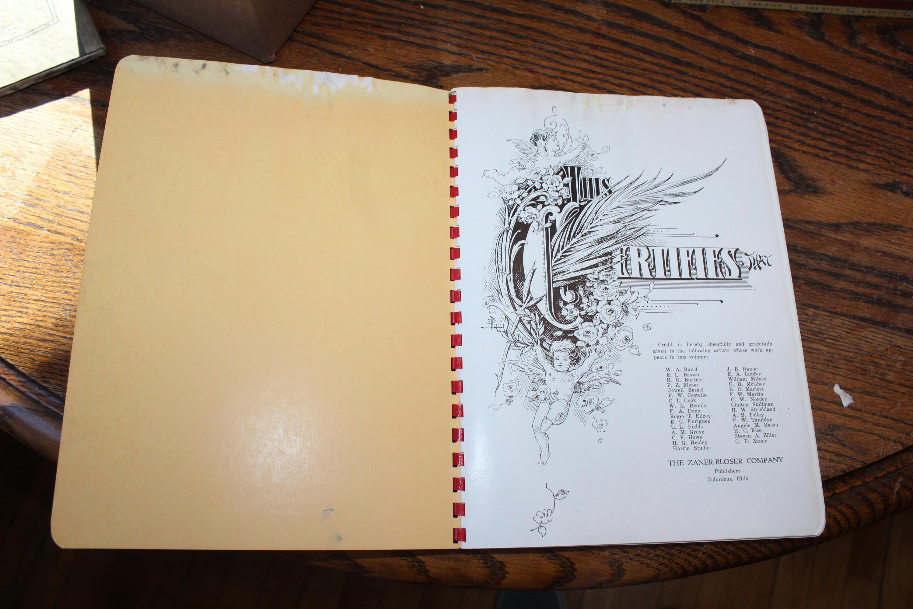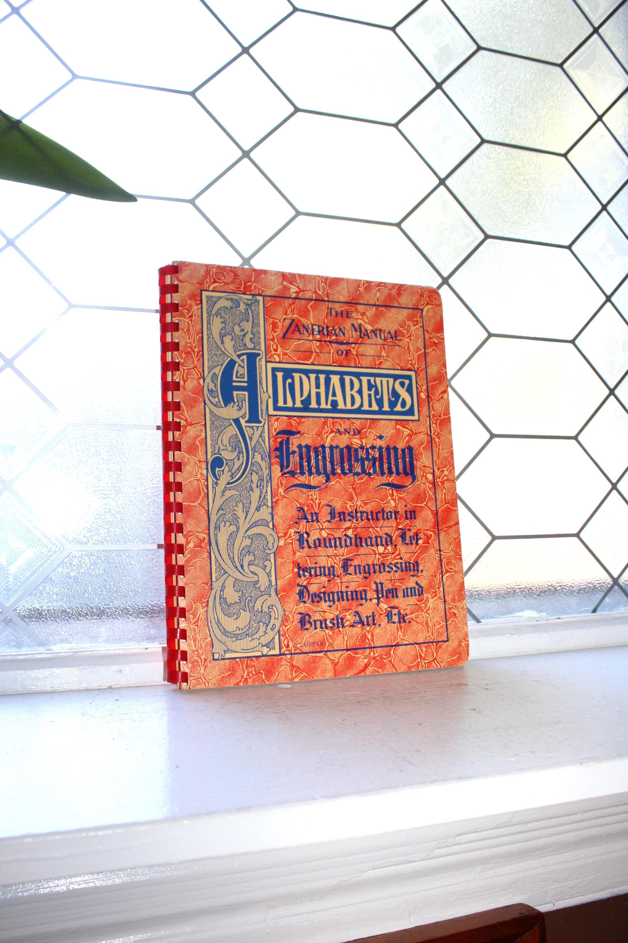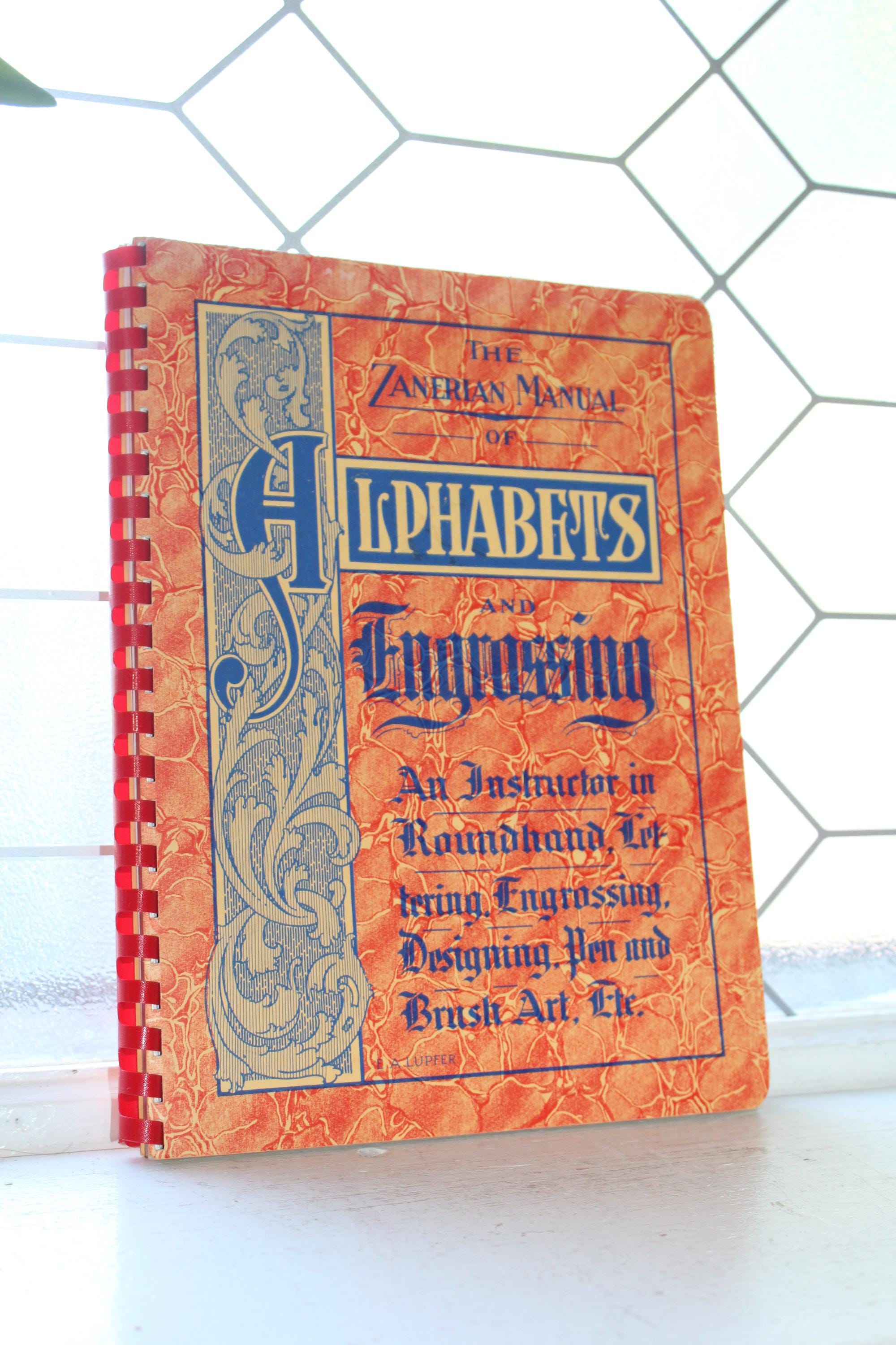 This is The Zanerian Manual of Alphabets and Engraving Book, a vintage 1958 soft cover book on penmanship published by The Zaner-Bloser Company. It measures 10 1/2" x 8 1/4" and has 136 pages. Some page edge staining/water damage, cover is good, displays very well. Enjoy!