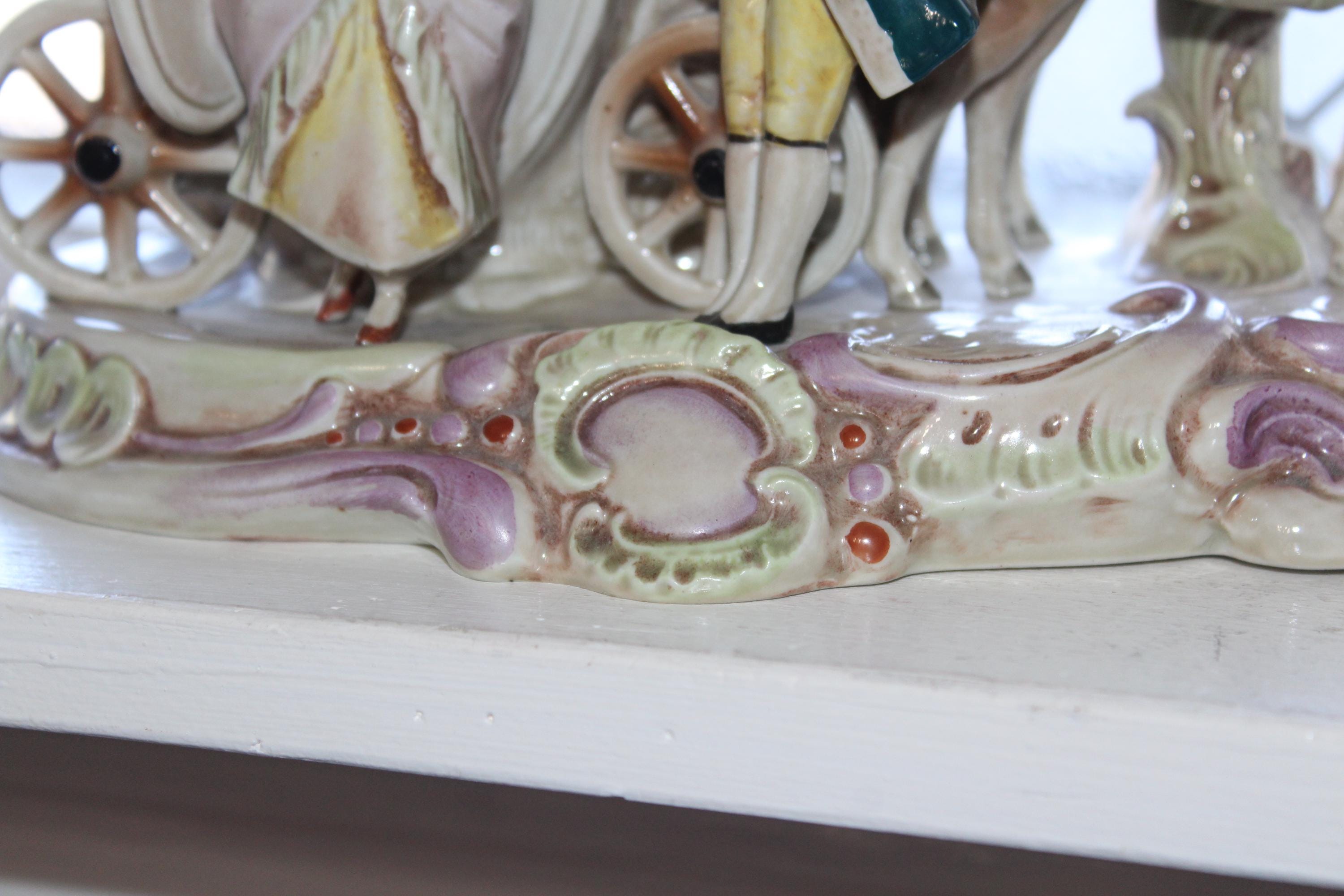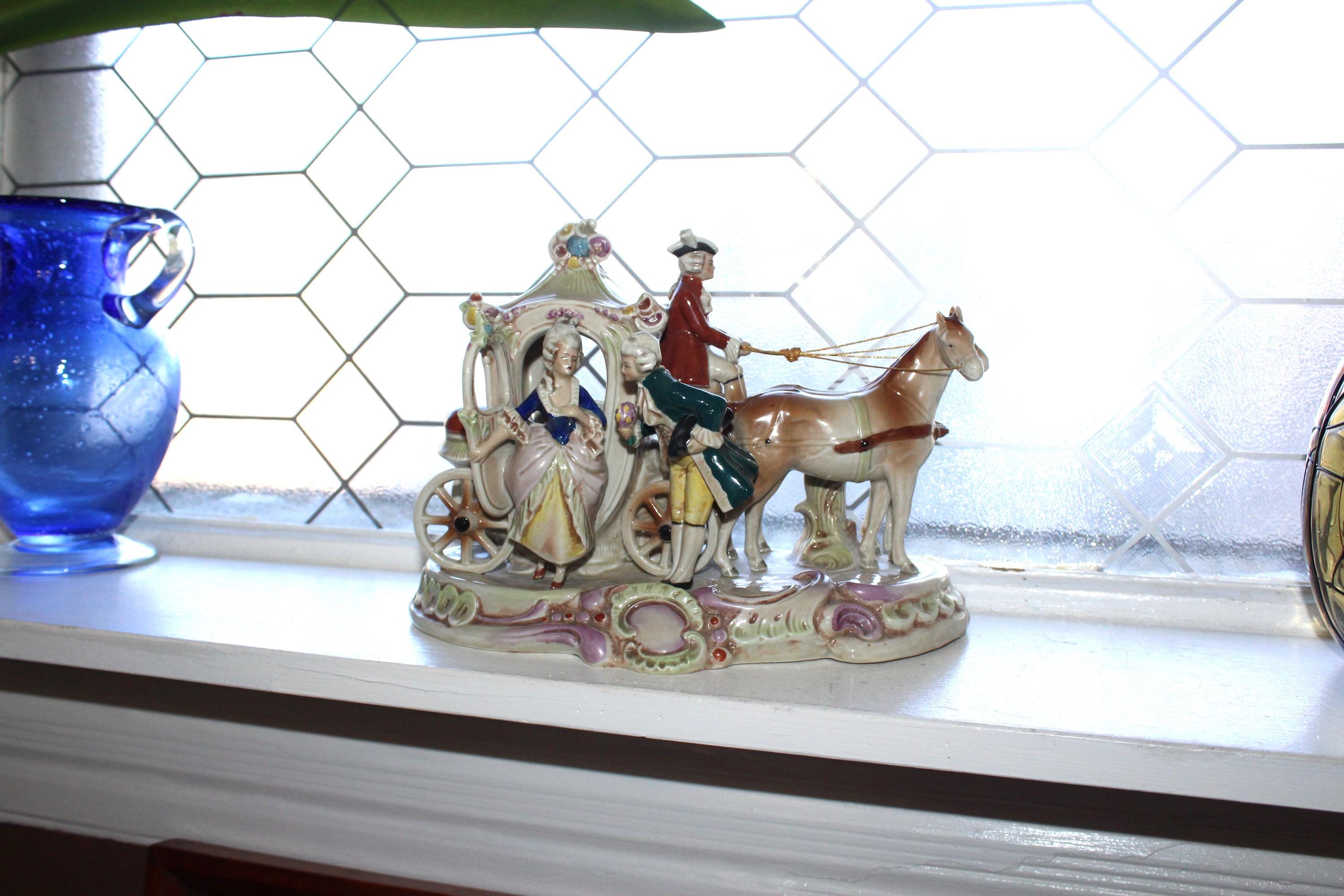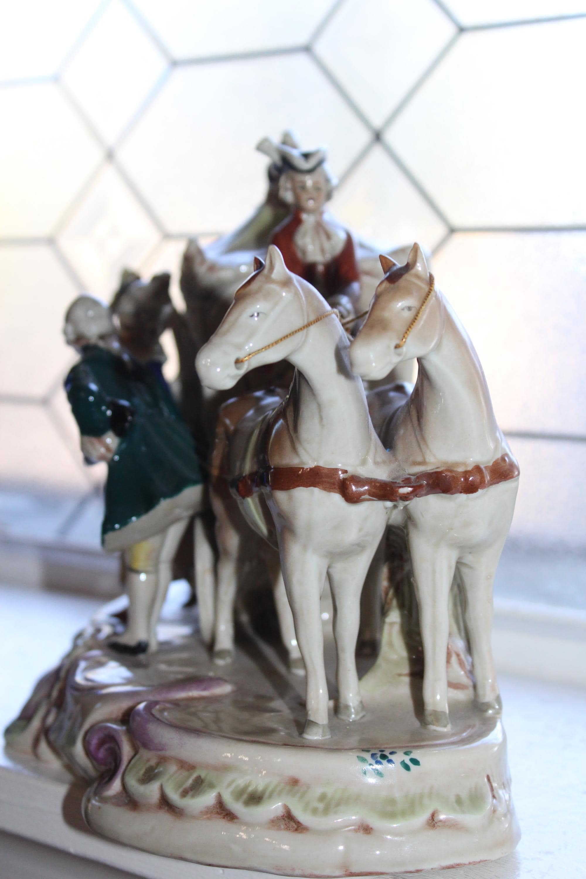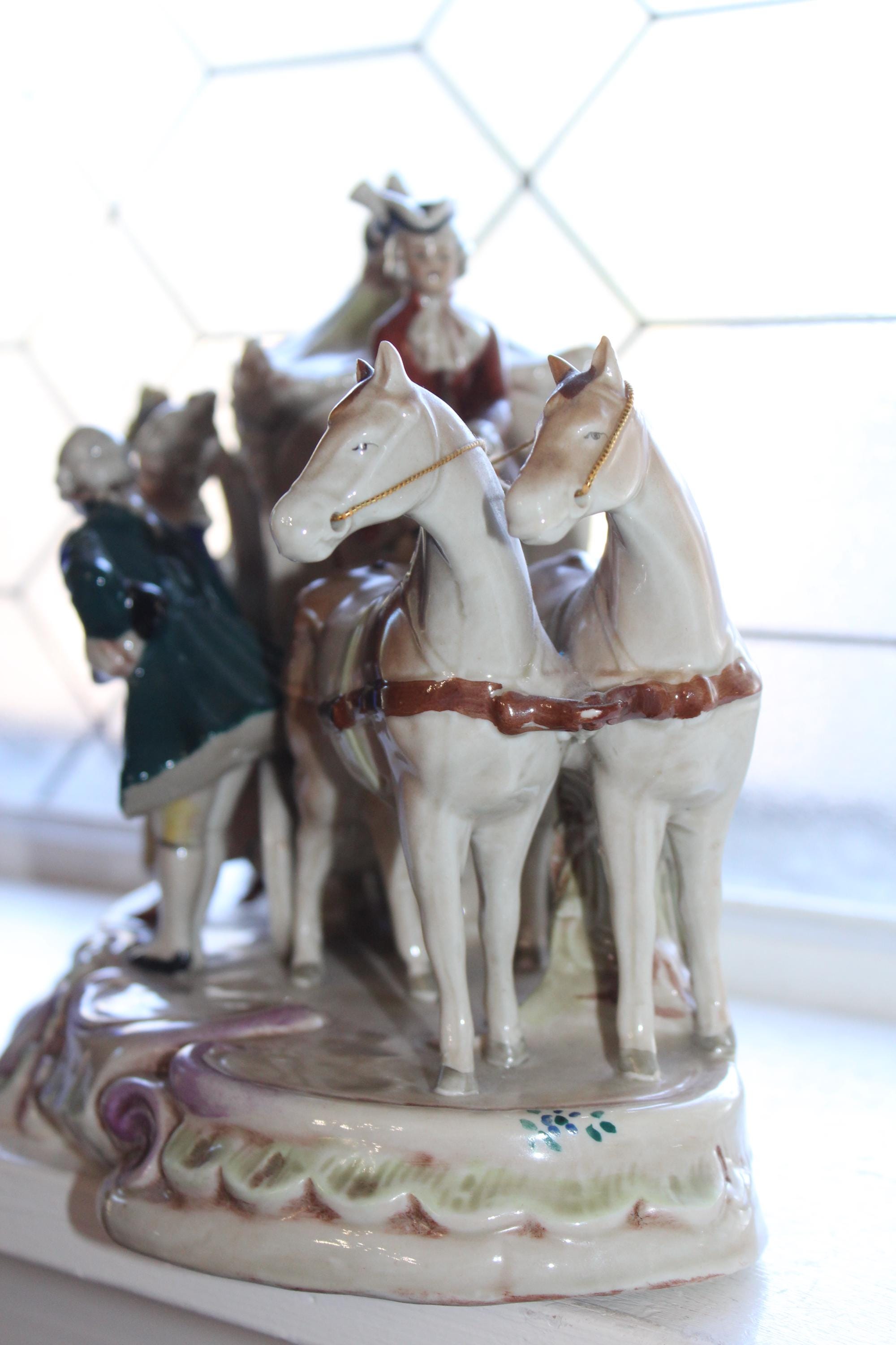 Beautiful antique German Grafenthal porcelain large figurine of horses and royal carriage with people in continental dress, in excellent condition. It measures 10" wide x 7 1/2" high, weighs 3 3/4 lbs and is marked Germany 19436 on the lower back. No chips or cracks, great for display. Enjoy!