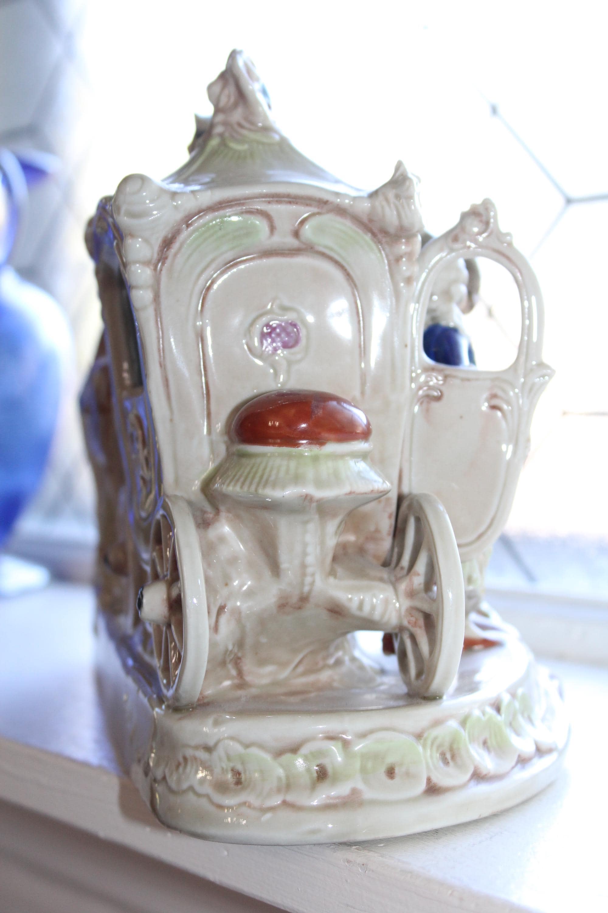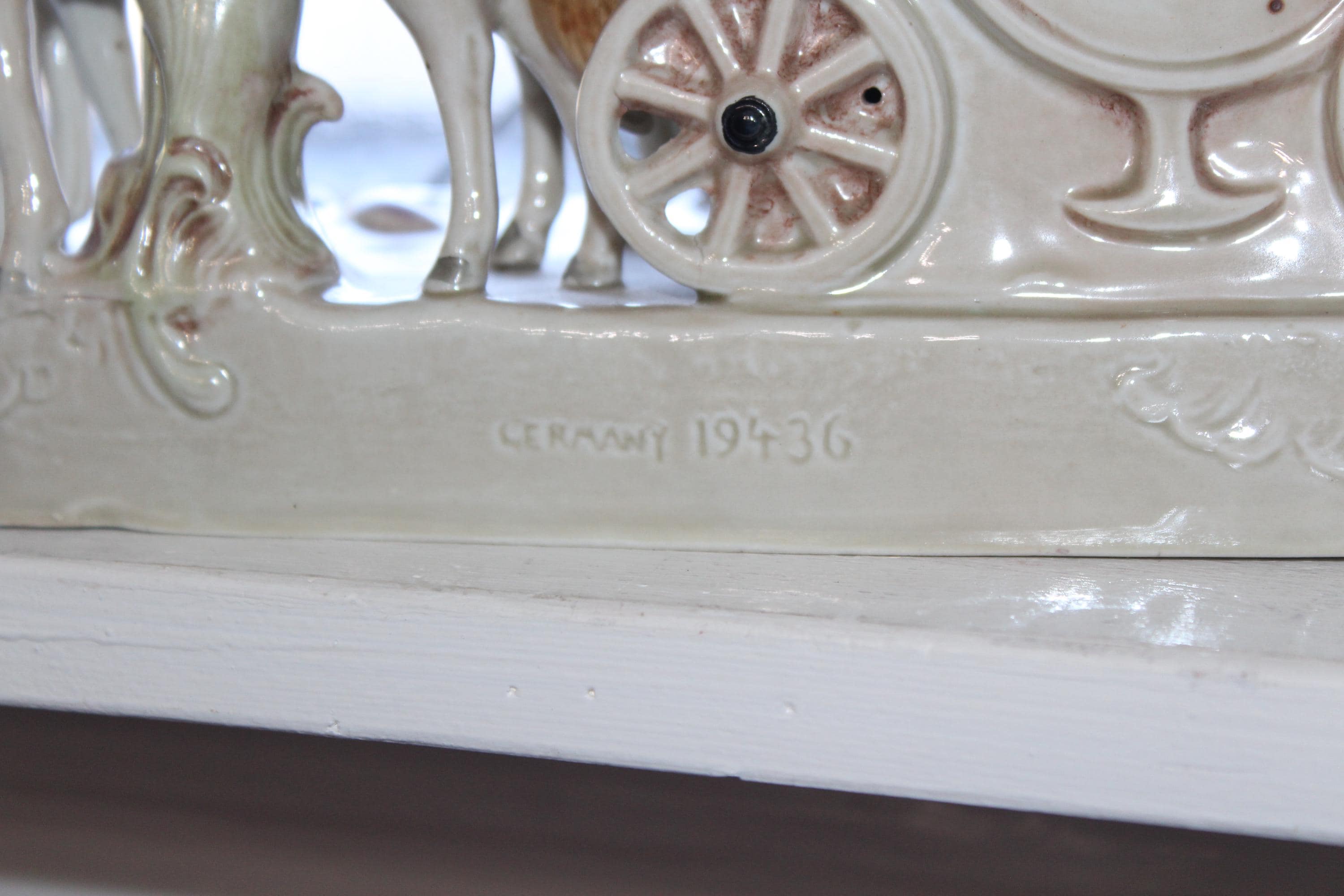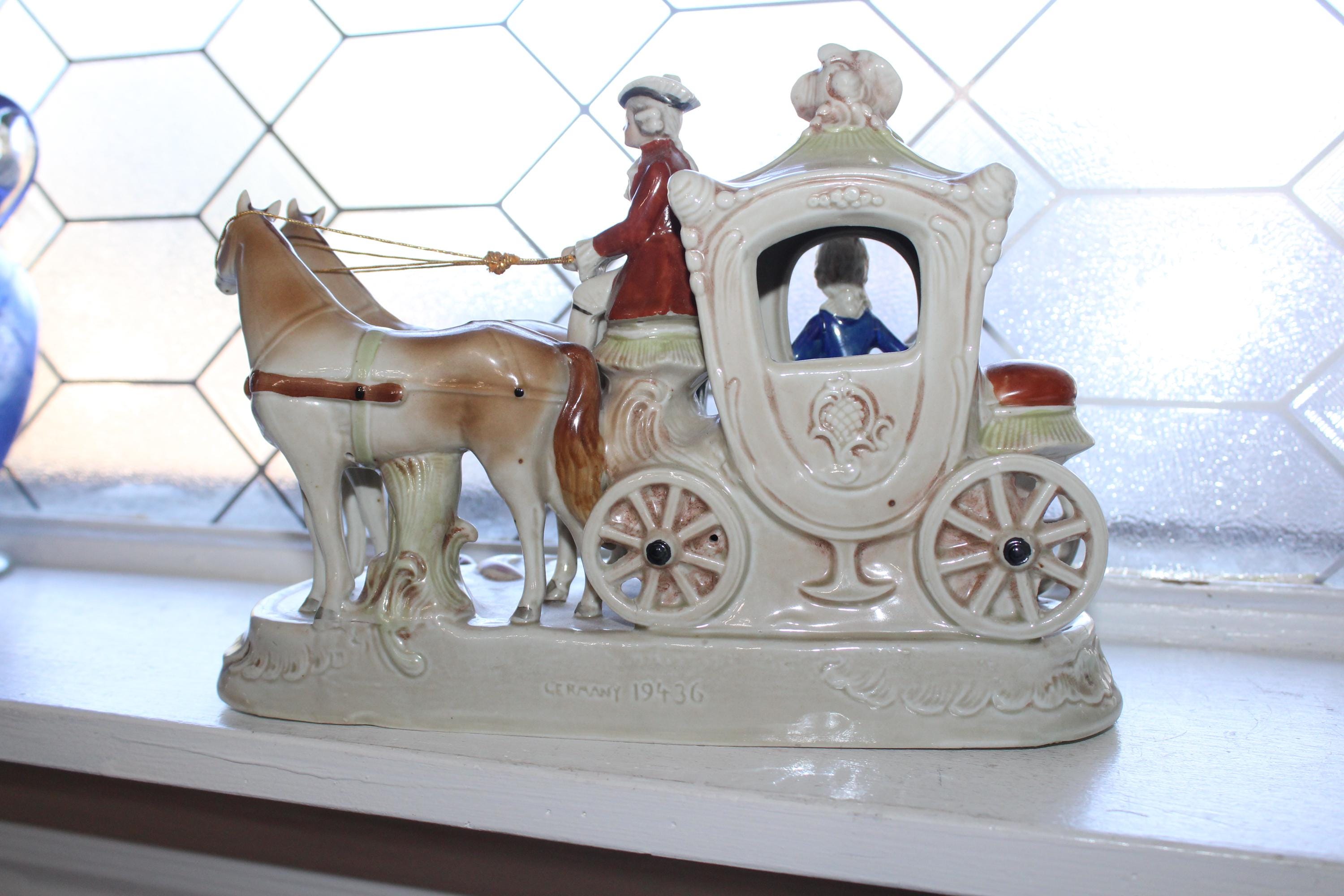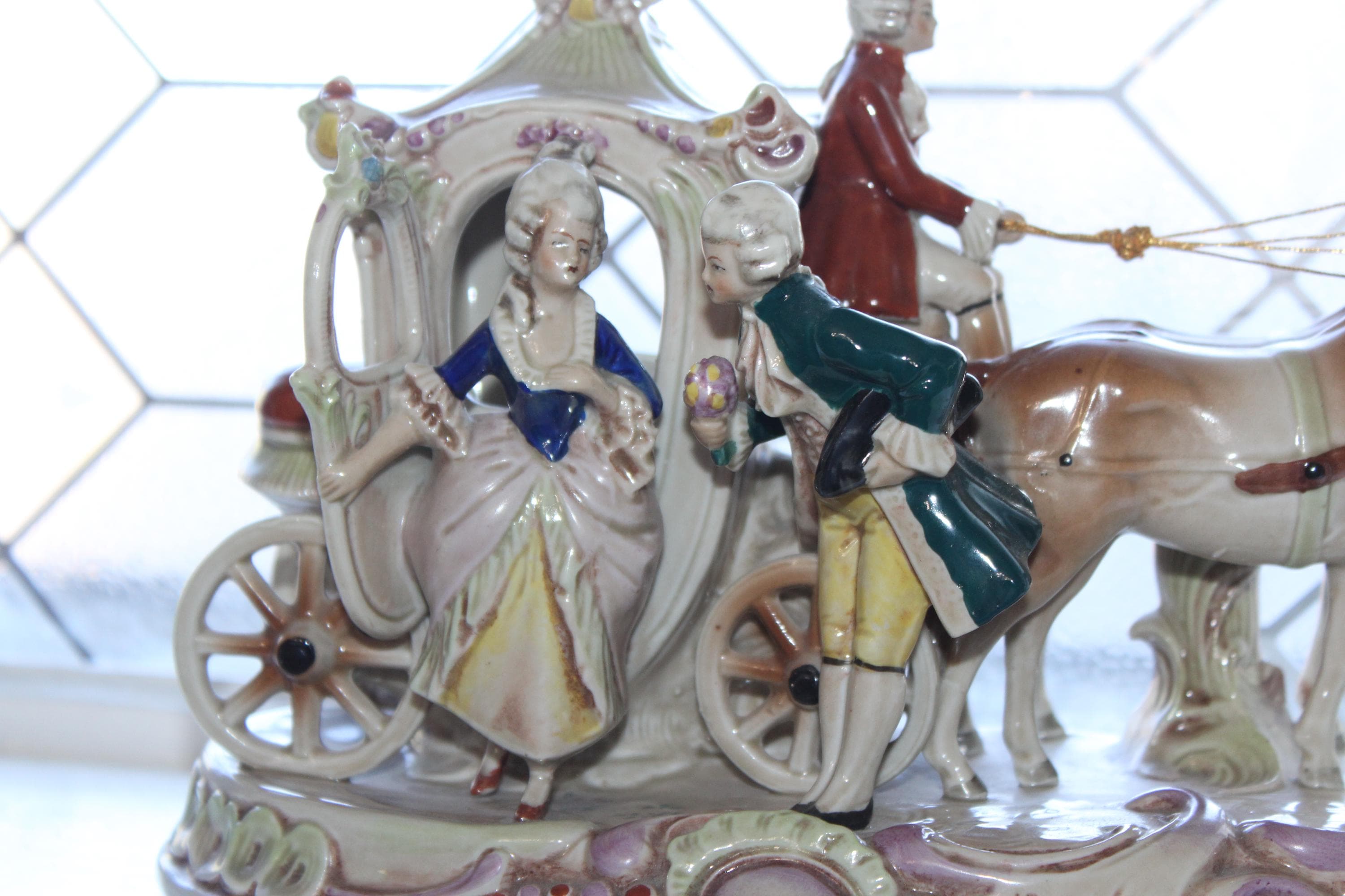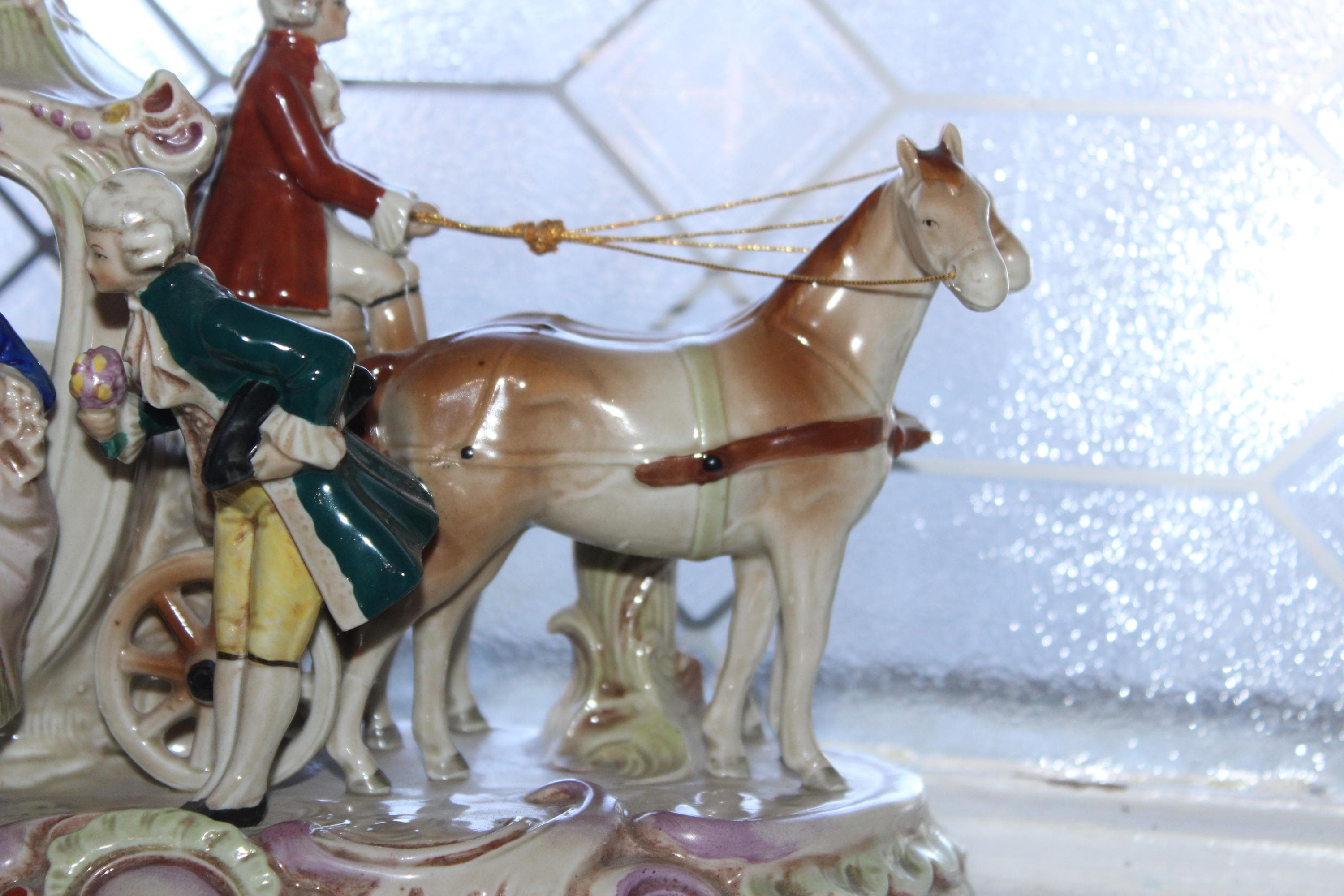 Beautiful antique German Grafenthal porcelain large figurine of horses and royal carriage with people in continental dress, in excellent condition. It measures 10" wide x 7 1/2" high, weighs 3 3/4 lbs and is marked Germany 19436 on the lower back. No chips or cracks, great for display. Enjoy!