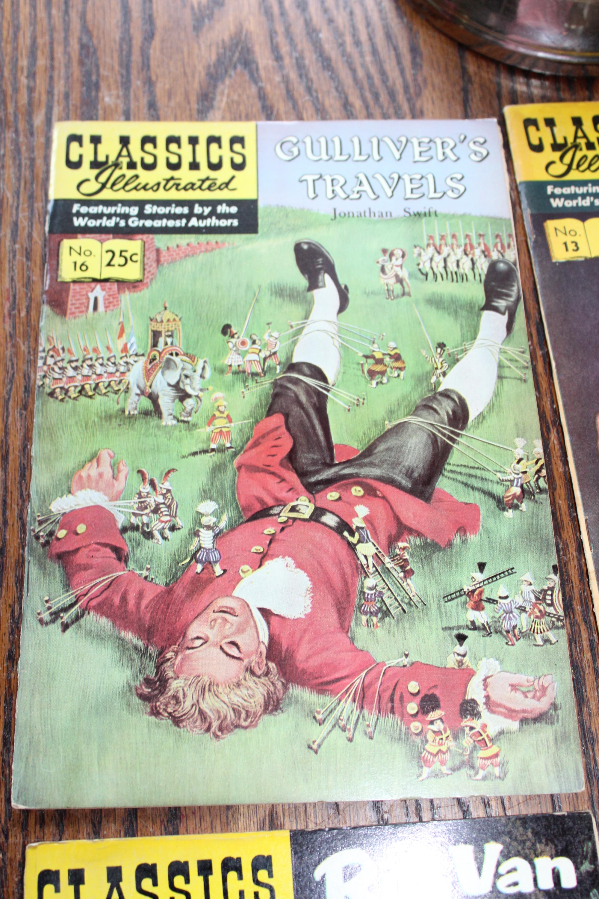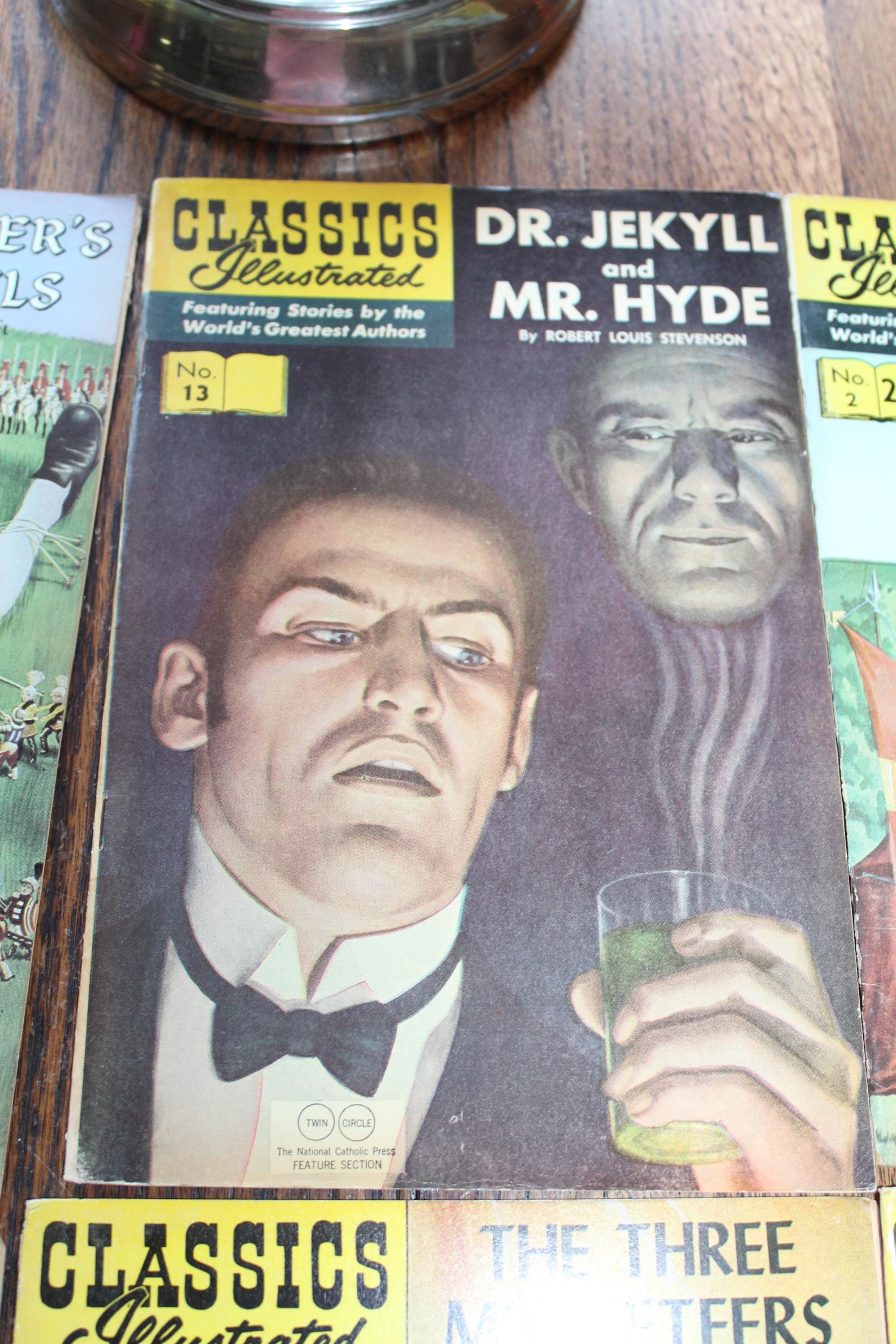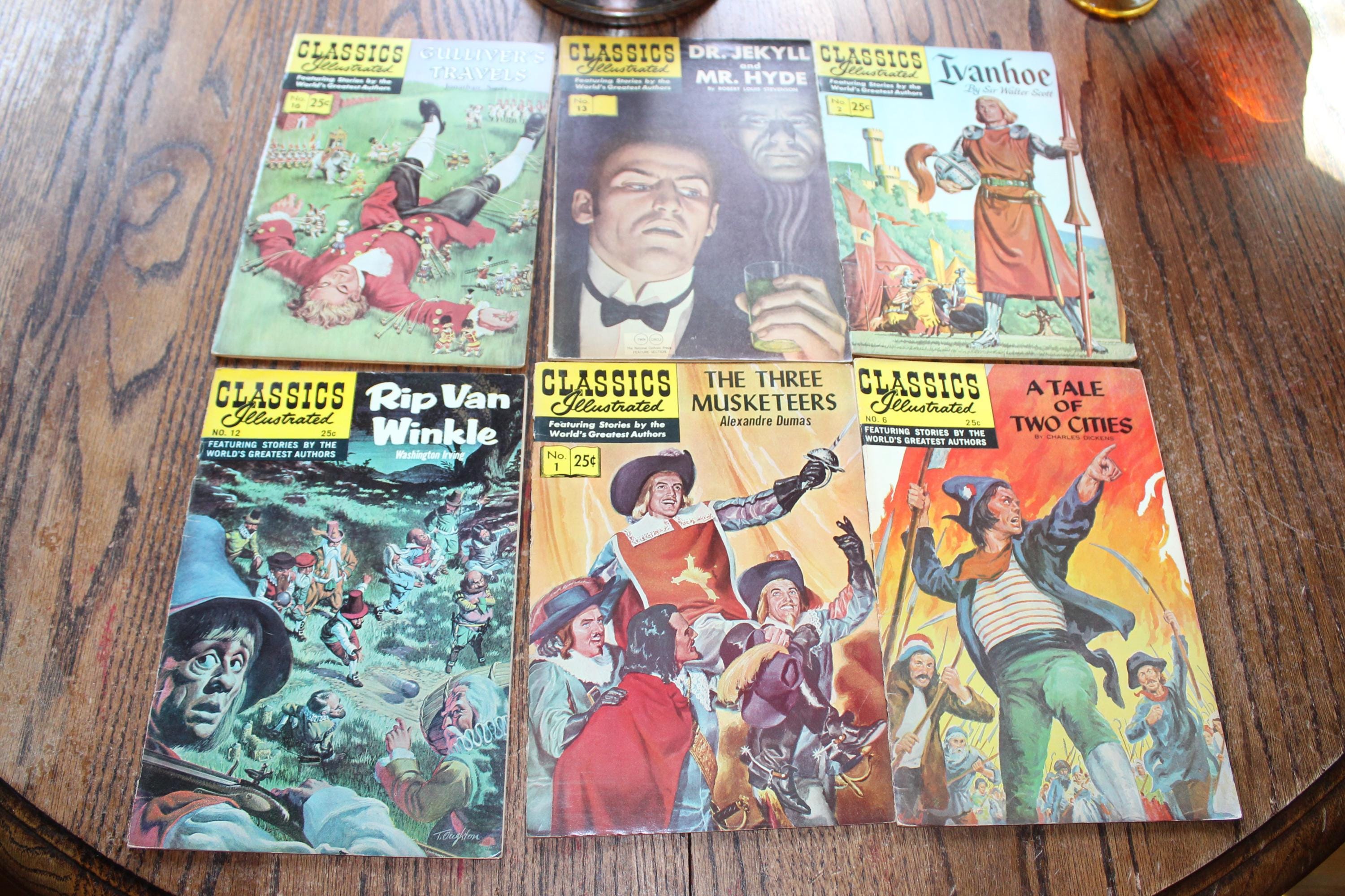 6 vintage Classics Illustrated comic bookd, including Gulliver's Travels No. 16, Dr, Jekyll and Mr. Hyde, no. 13, A Tale of Two Cities no. 6, Rip Van Winkle no. 12, The Three Musketeers no. 1 and Ivanhoe no. 2. In fairly good condition with age appropriate minor wear. Enjoy!