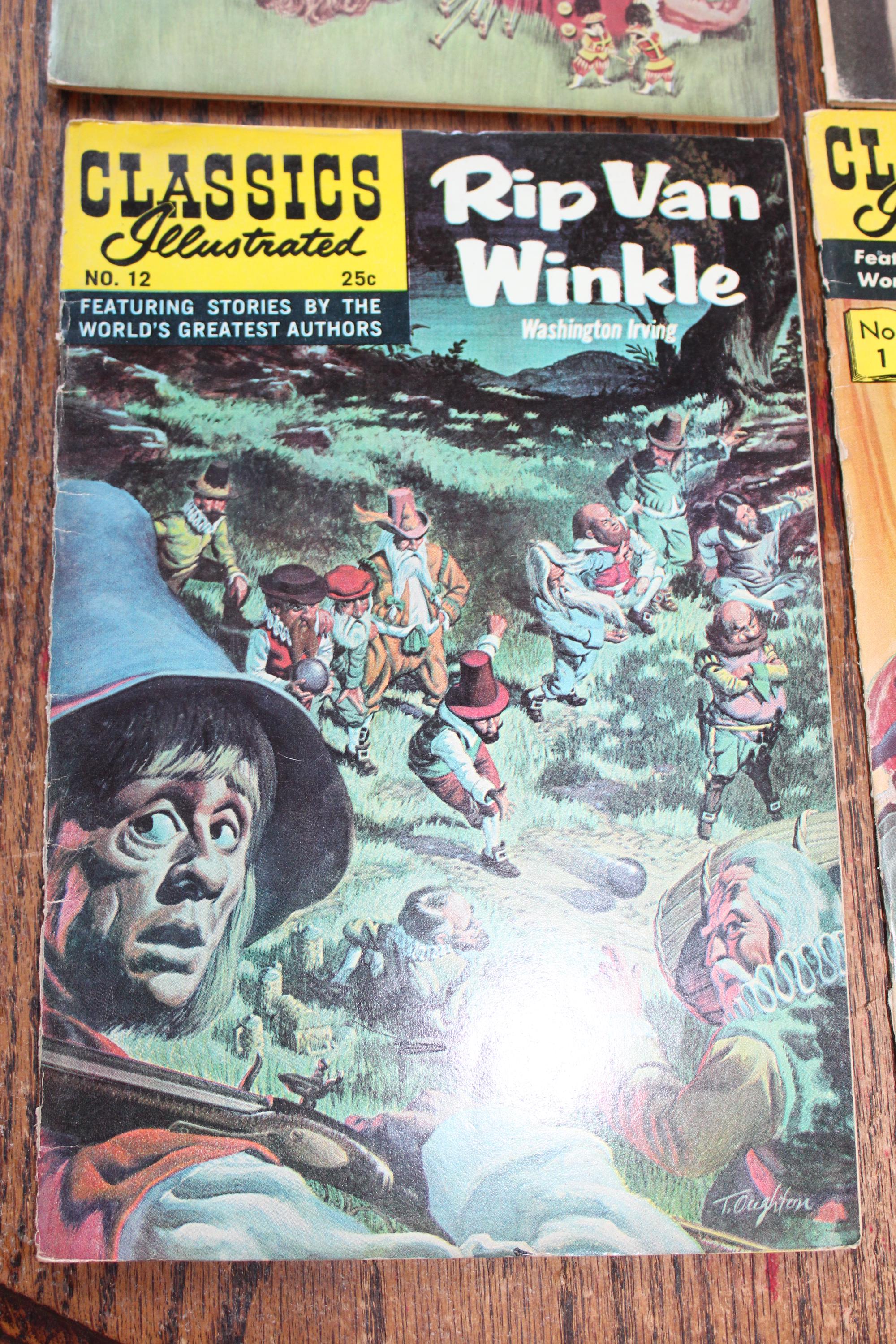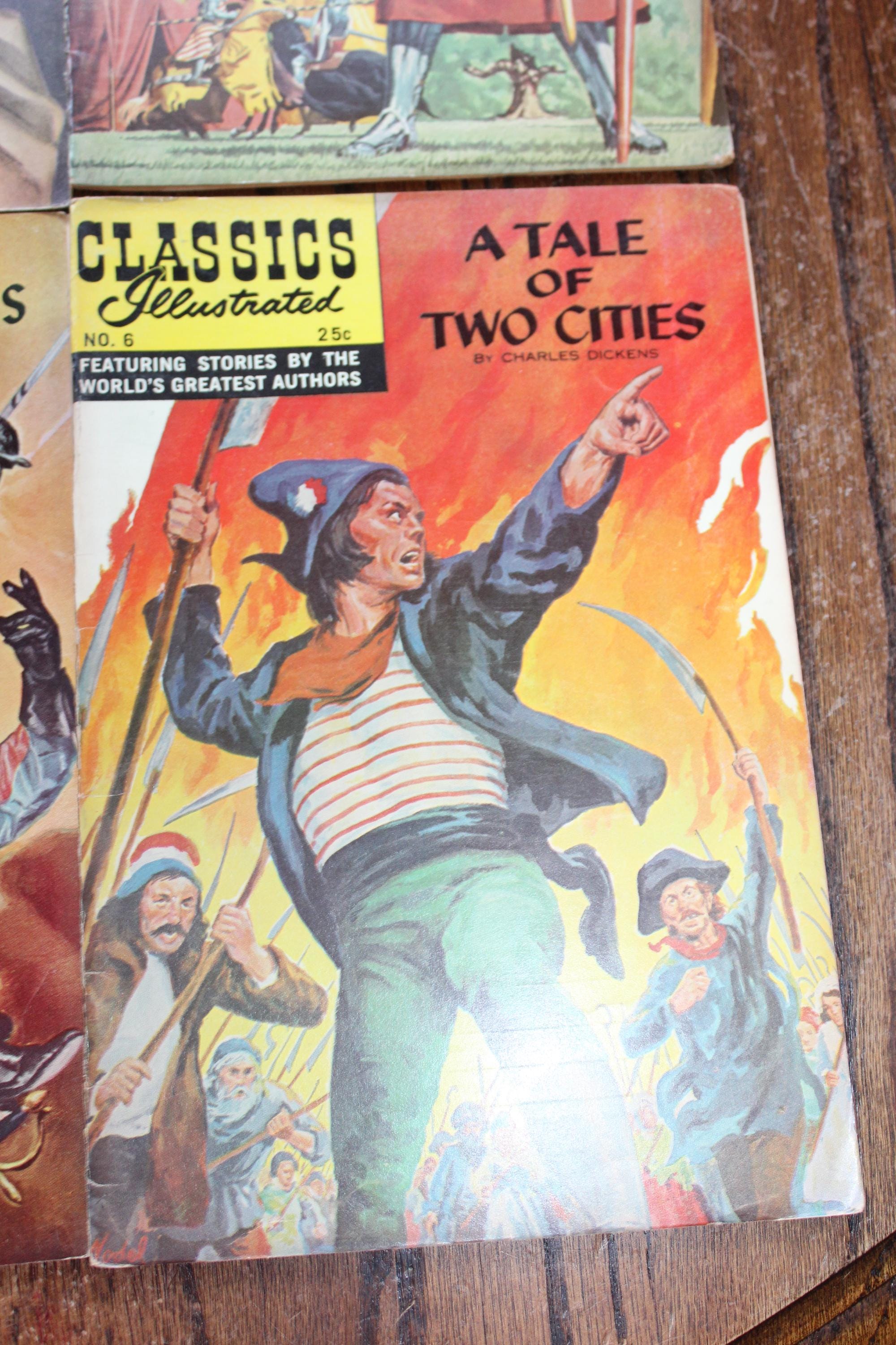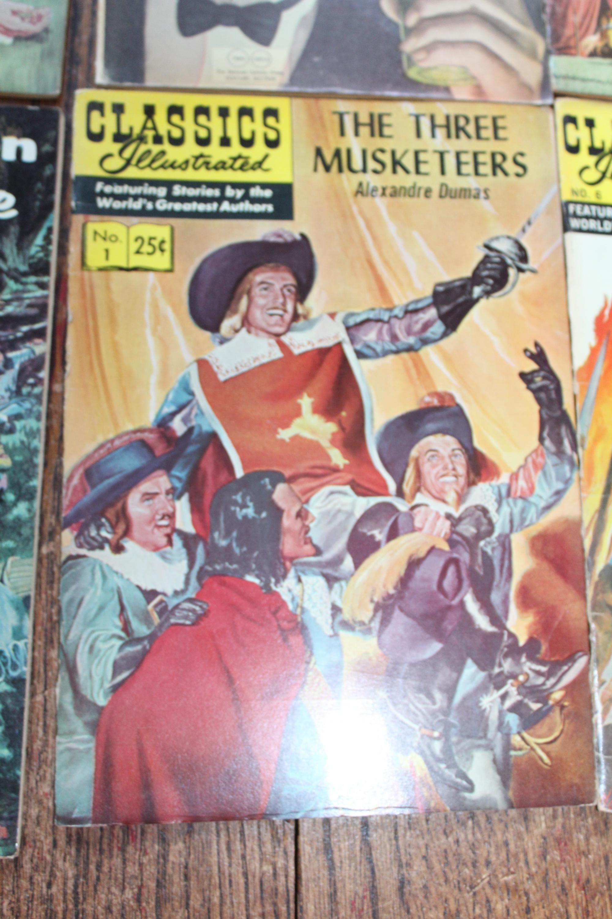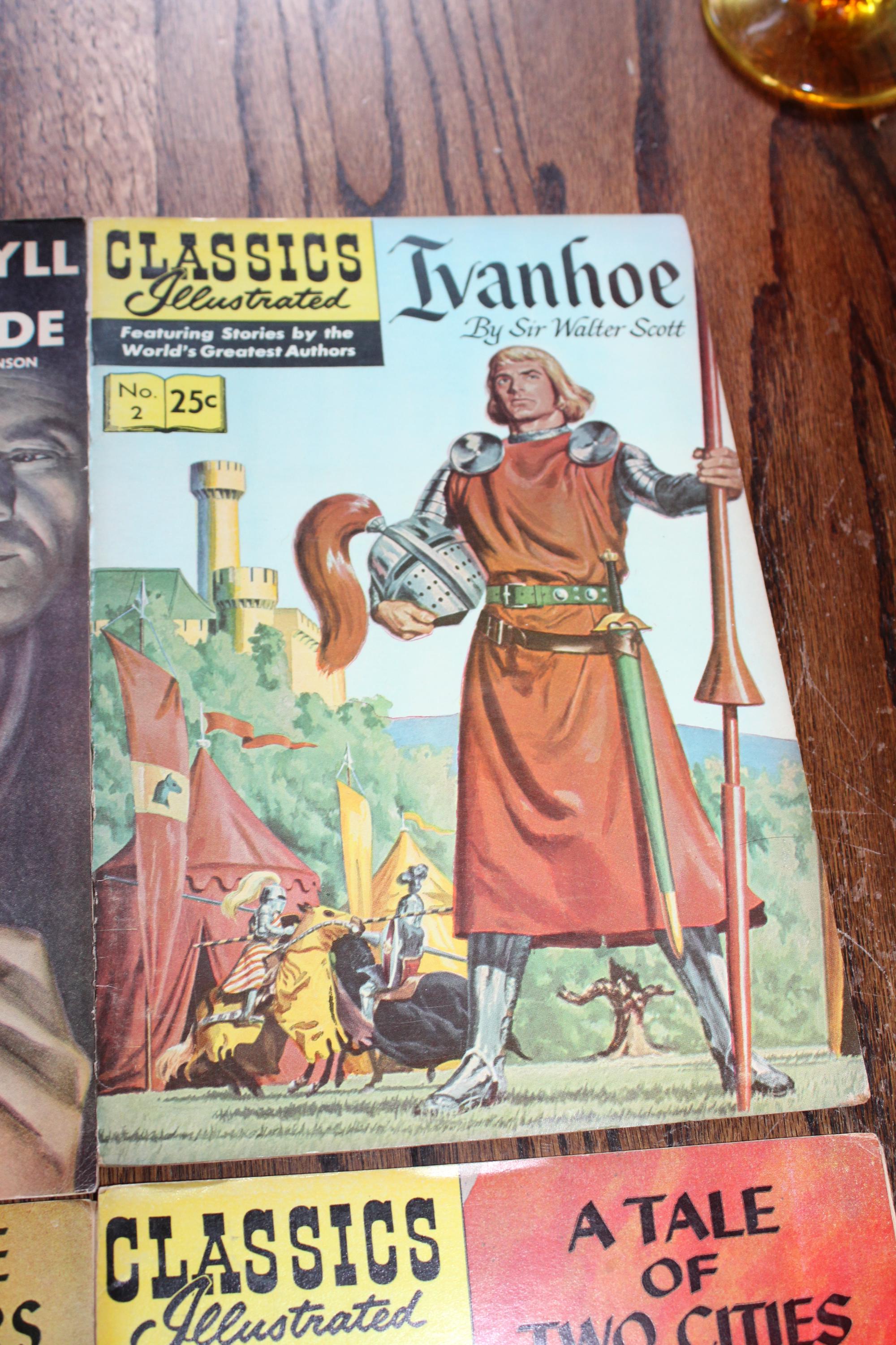 6 vintage Classics Illustrated comic bookd, including Gulliver's Travels No. 16, Dr, Jekyll and Mr. Hyde, no. 13, A Tale of Two Cities no. 6, Rip Van Winkle no. 12, The Three Musketeers no. 1 and Ivanhoe no. 2. In fairly good condition with age appropriate minor wear. Enjoy!