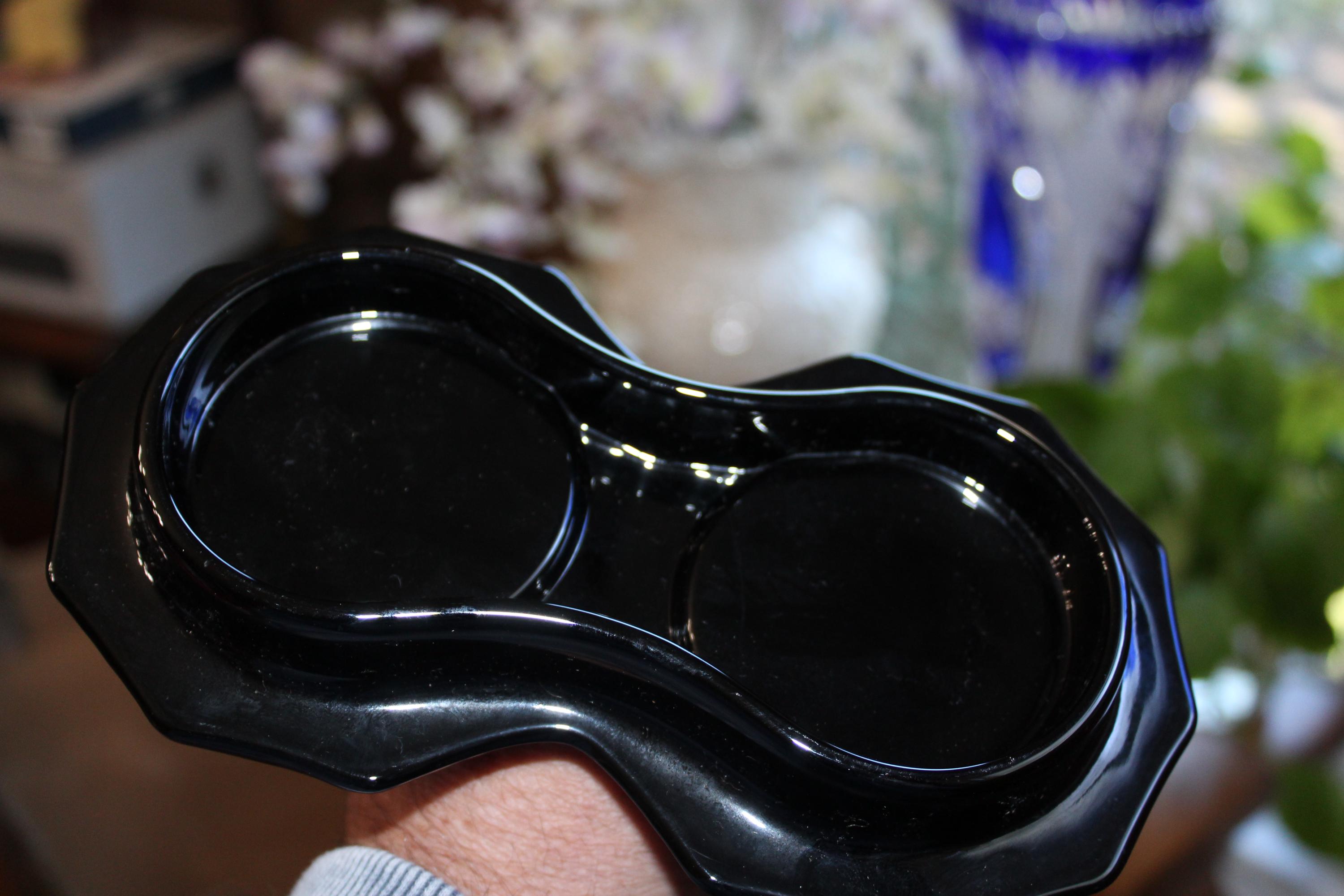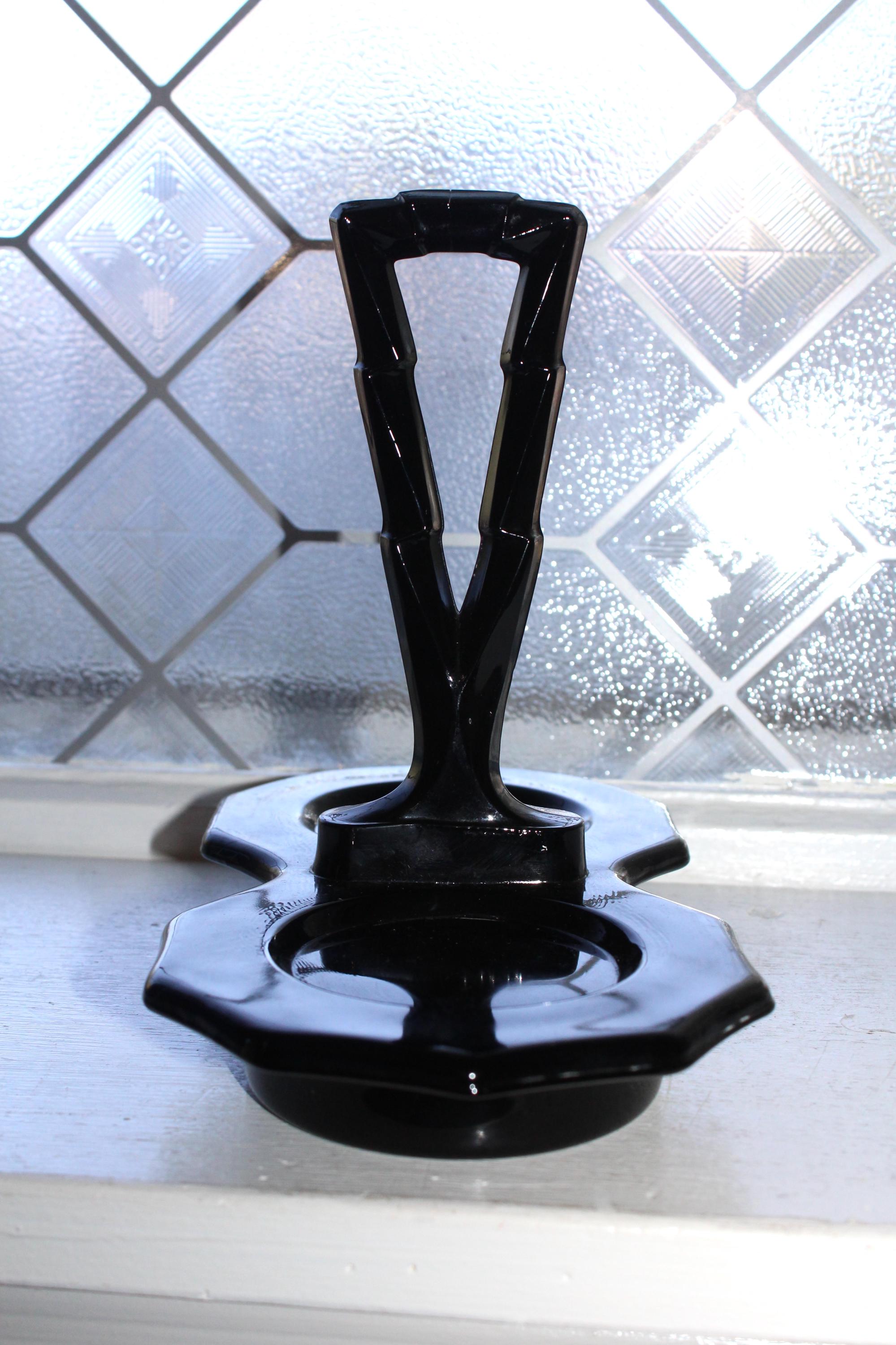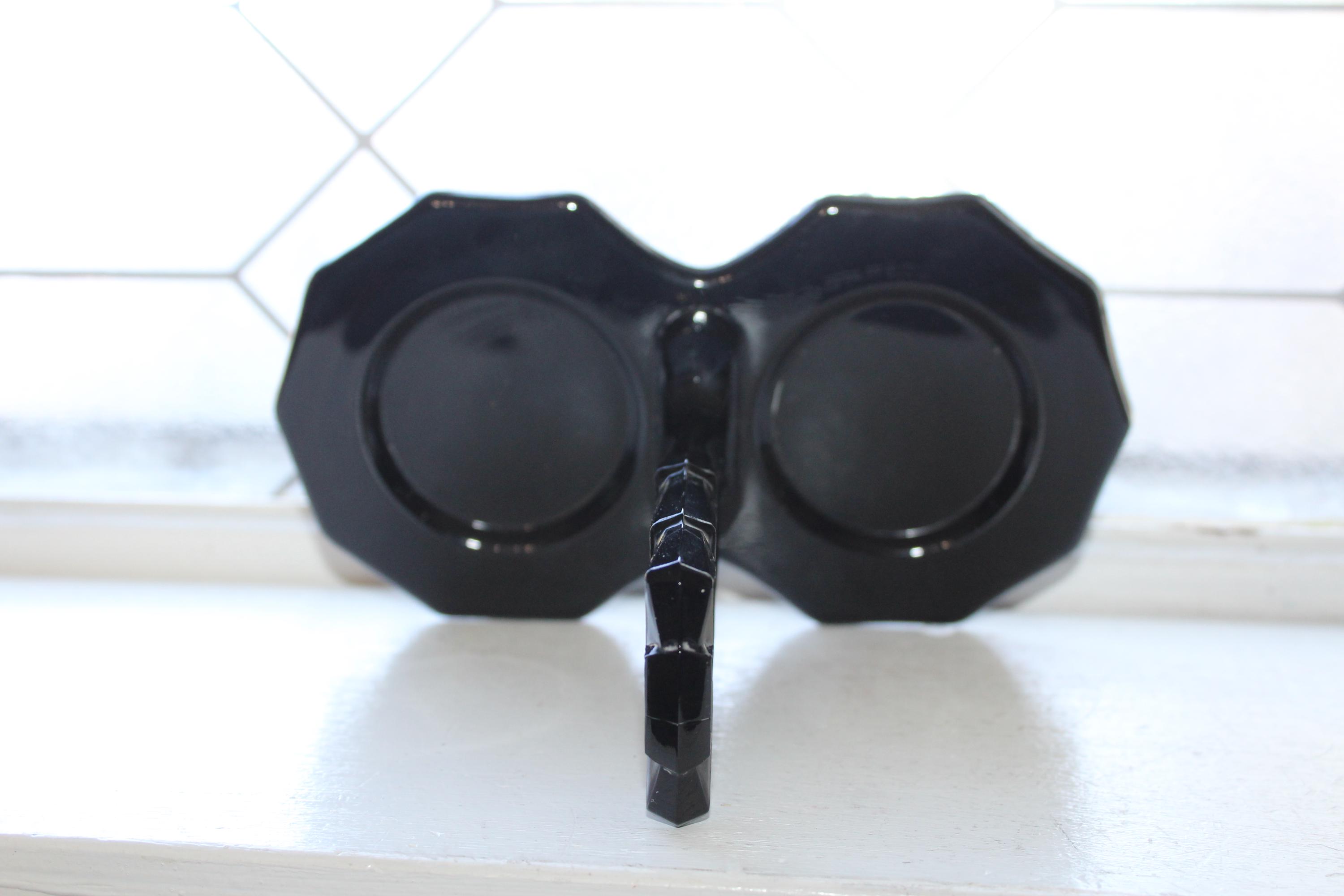 Vintage 1930s Art Deco Cambridge Decagon black glass handled stand for creamer and sugar bowl, in excellent condition. It measures 8" wide x 6 1/4" high. No chips or cracks. Enjoy!