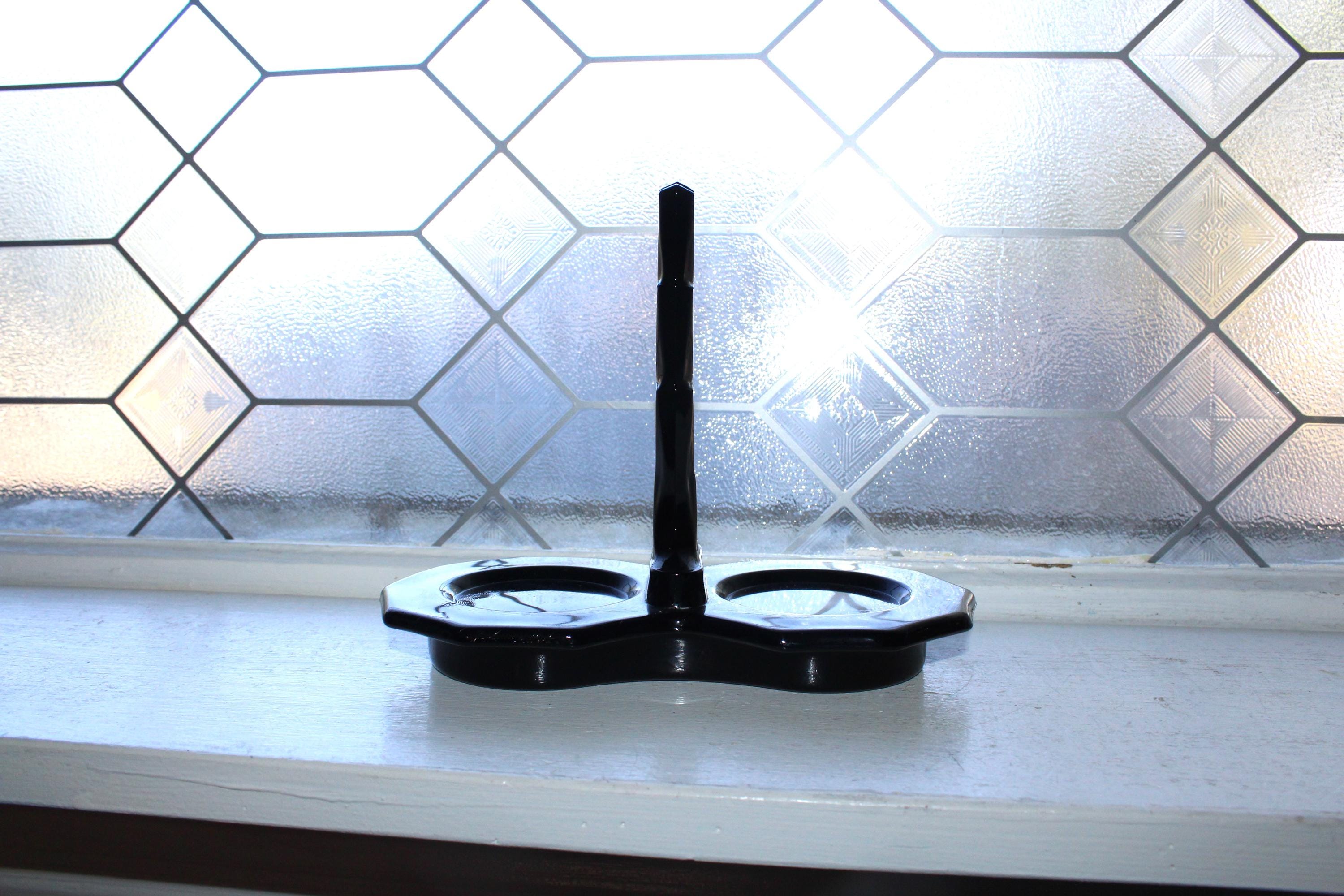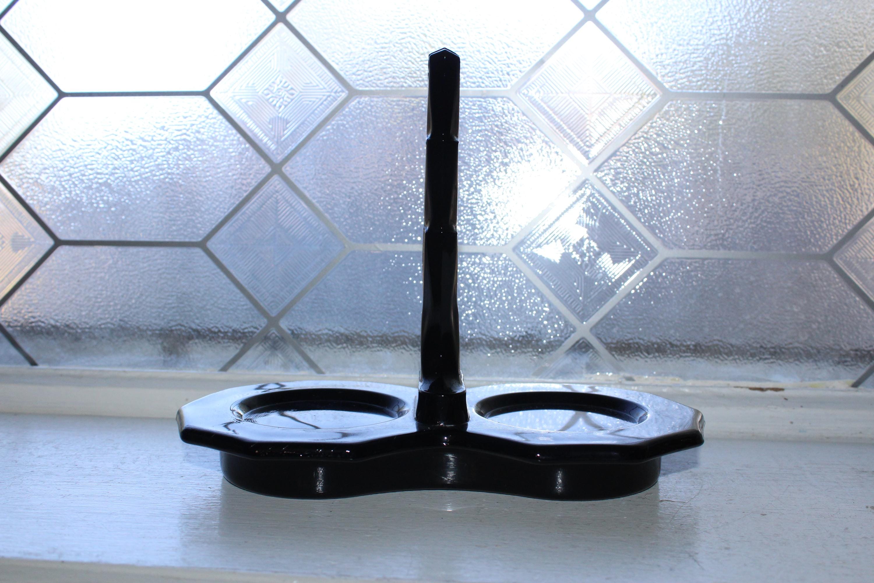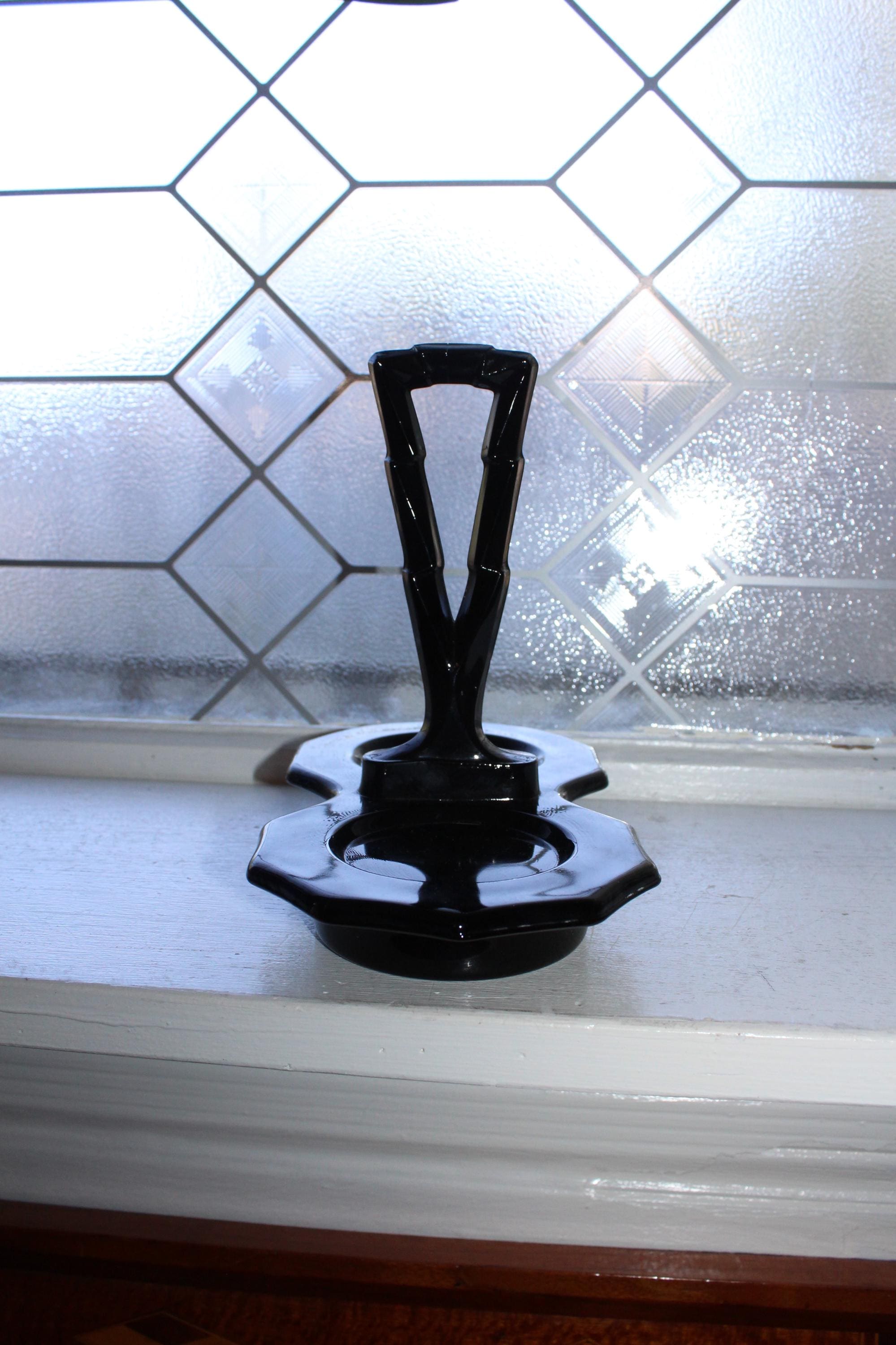 Vintage 1930s Art Deco Cambridge Decagon black glass handled stand for creamer and sugar bowl, in excellent condition. It measures 8" wide x 6 1/4" high. No chips or cracks. Enjoy!