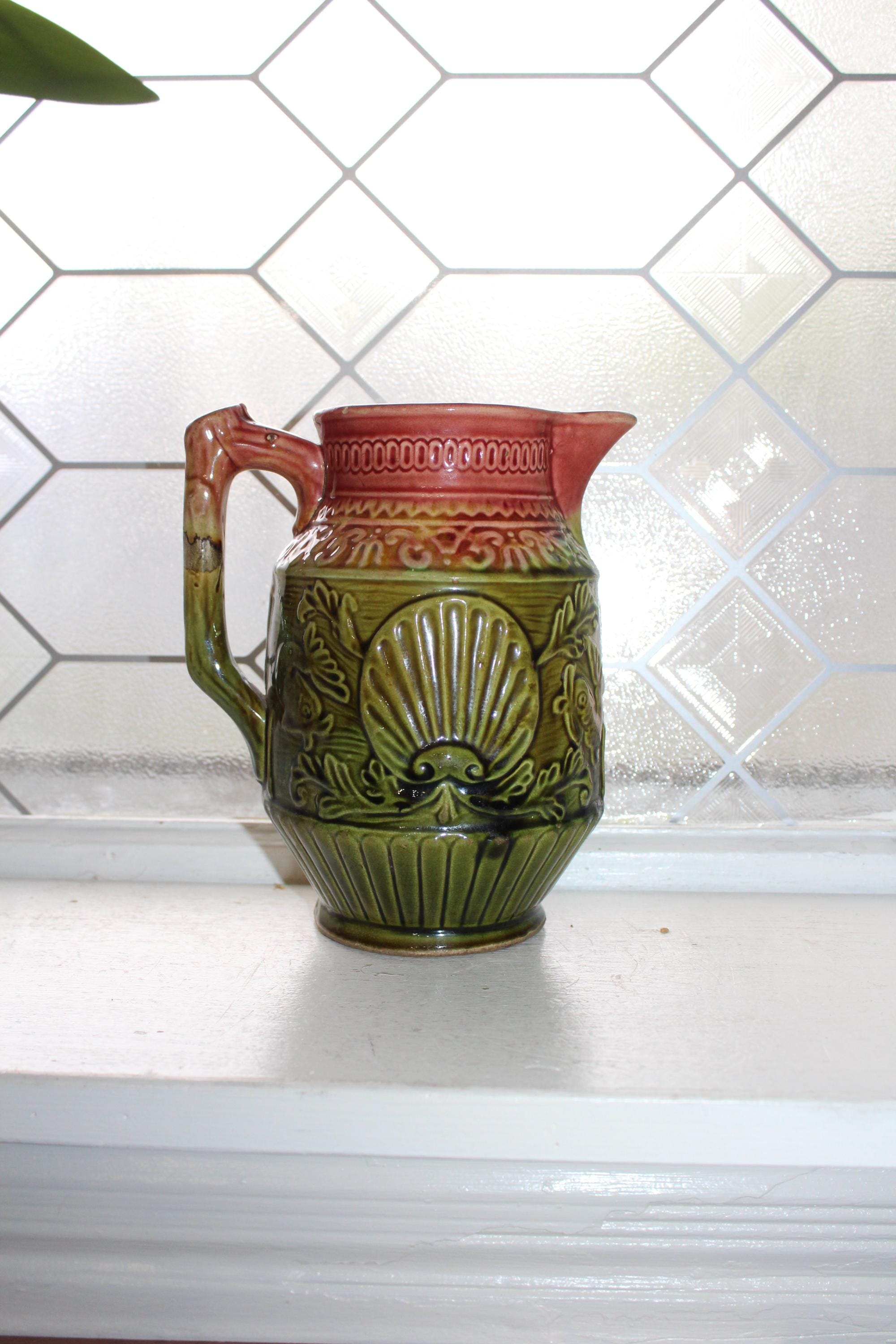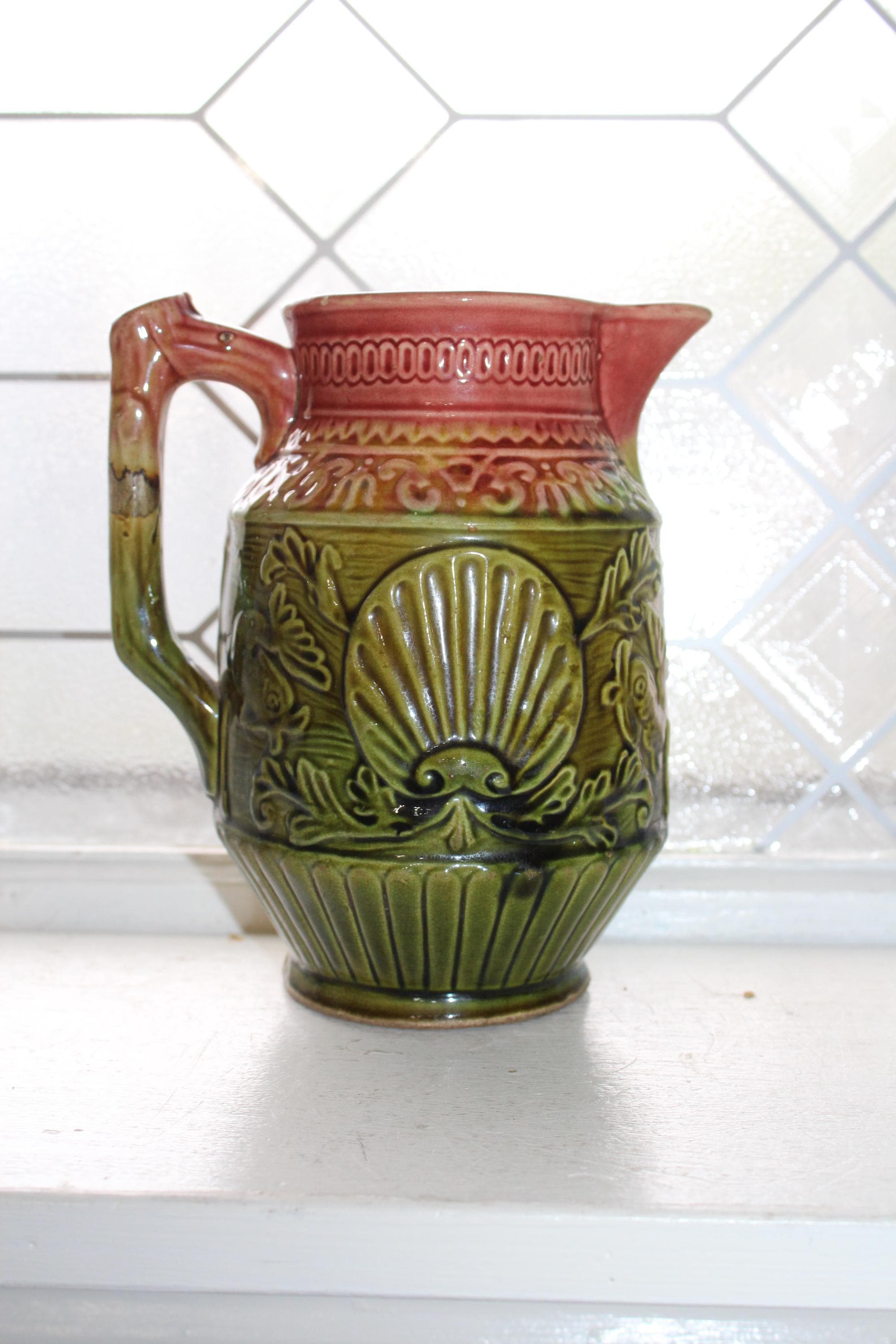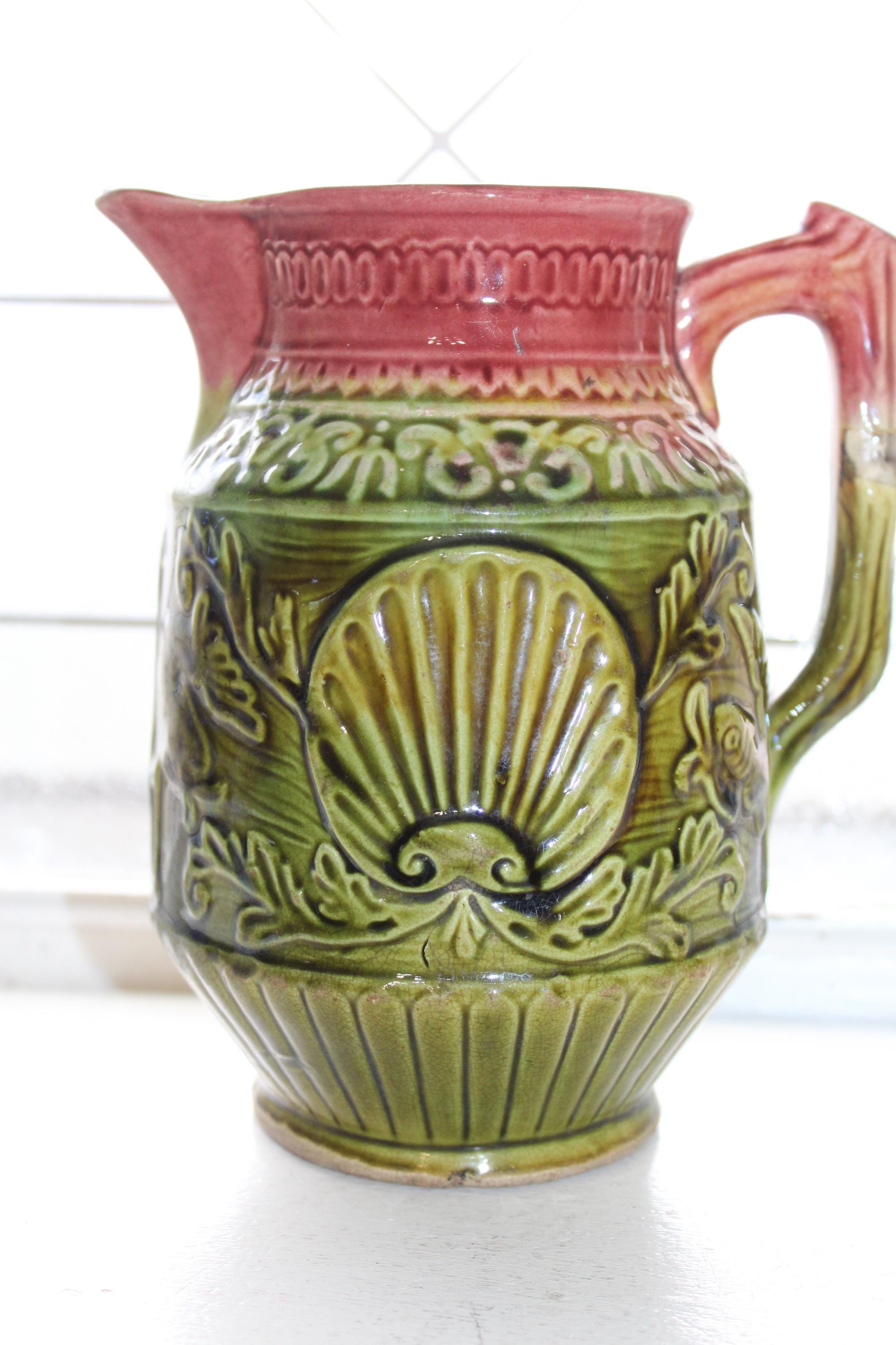 Antique late 1800s majolica pitcher featuring a nautical theme with fish, scallop shells and a trident and a red and green glaze. The pitcher measures 7" high. No maker's mark on the bottom. Age appropriate light wear, no chips or cracks except for a tiny paint chip on the rim. Enjoy!