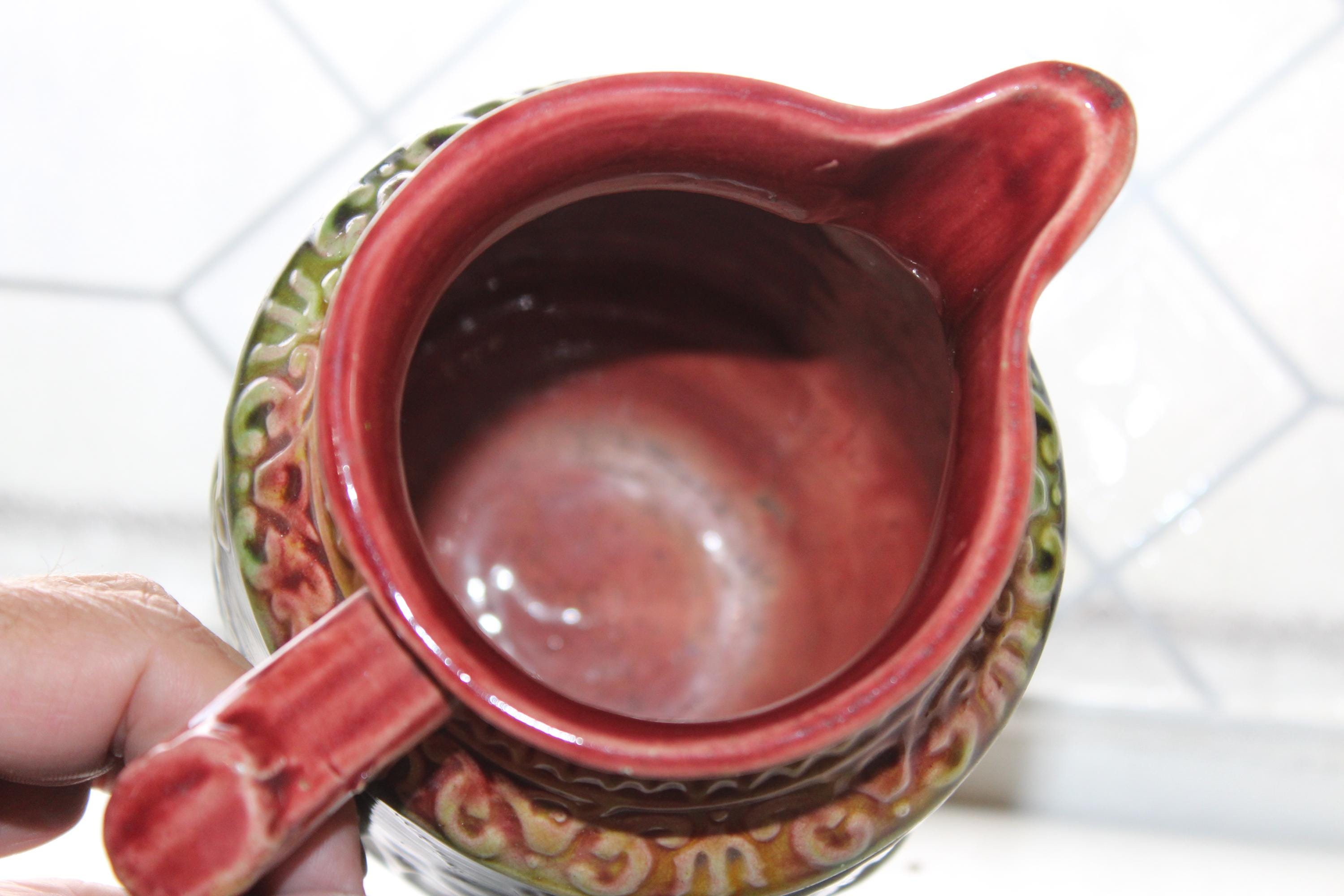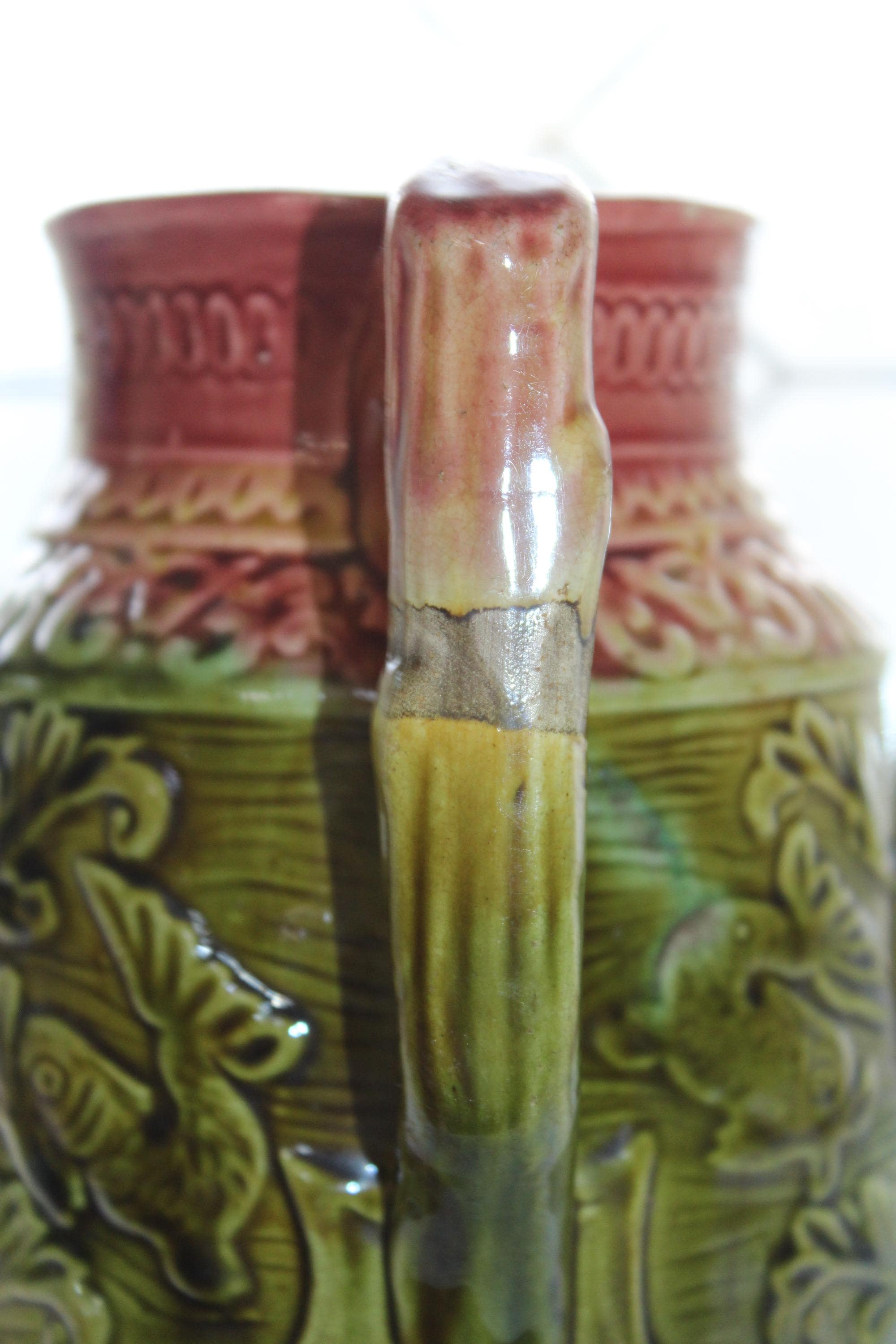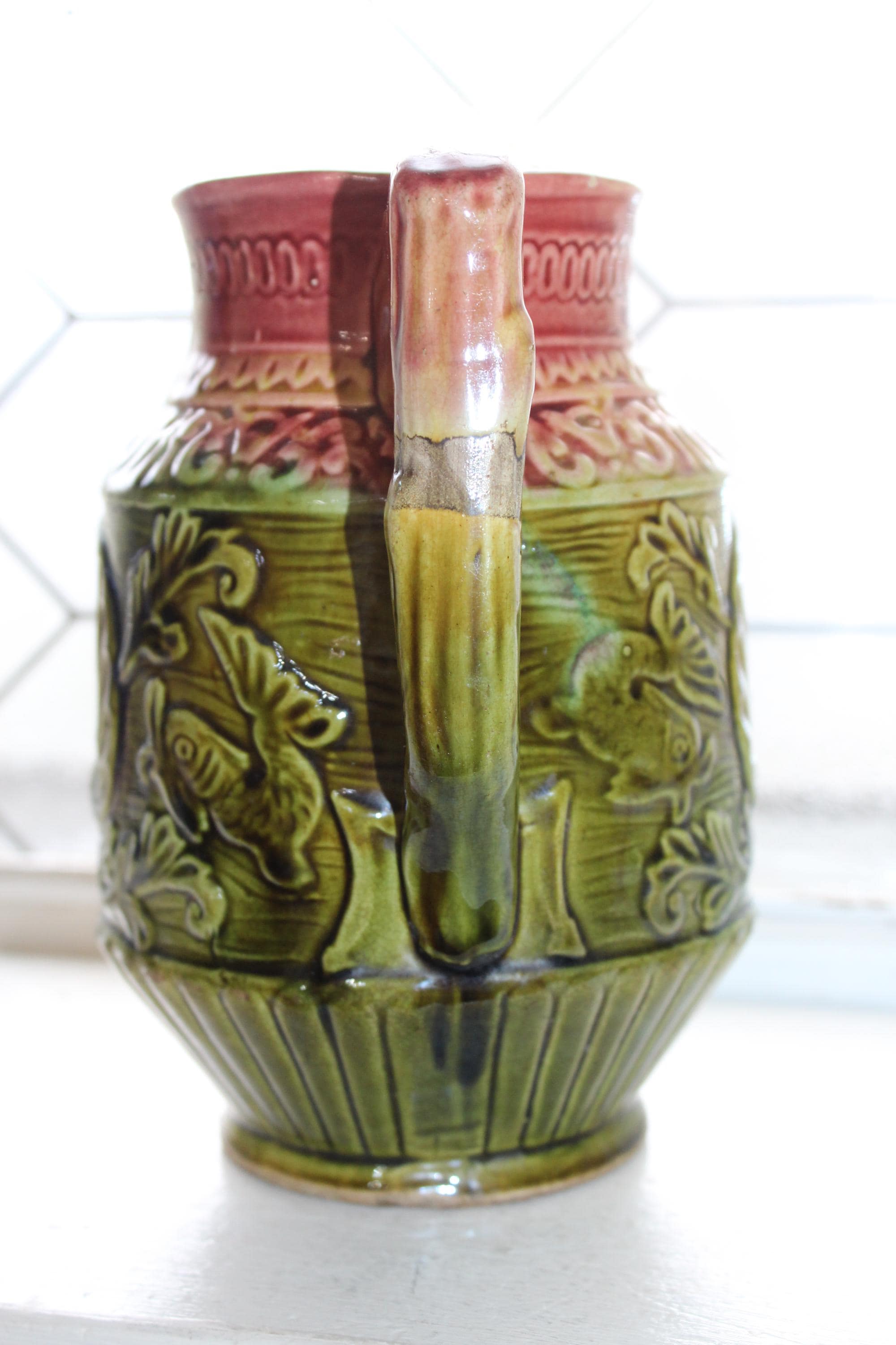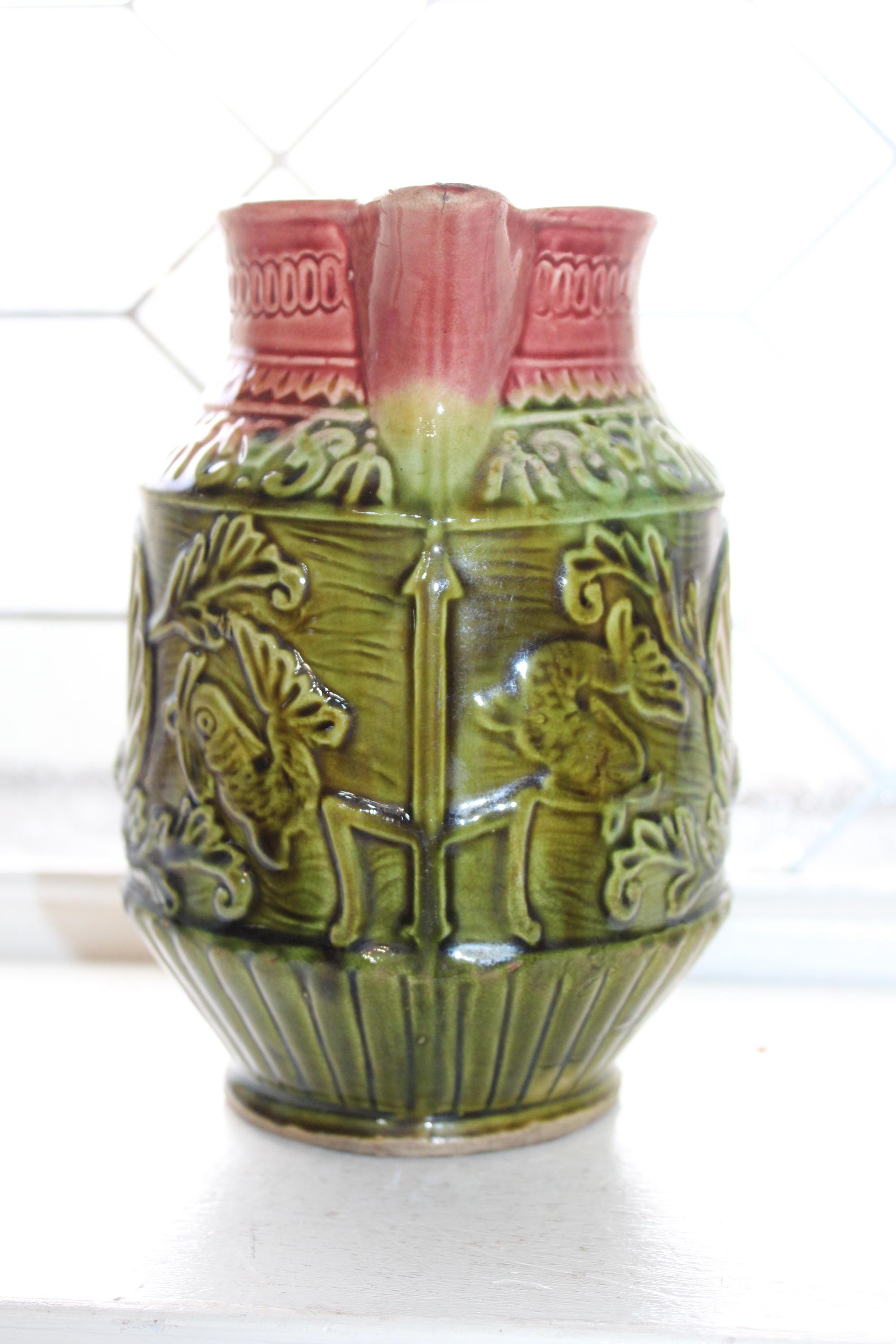 Antique late 1800s majolica pitcher featuring a nautical theme with fish, scallop shells and a trident and a red and green glaze. The pitcher measures 7" high. No maker's mark on the bottom. Age appropriate light wear, no chips or cracks except for a tiny paint chip on the rim. Enjoy!