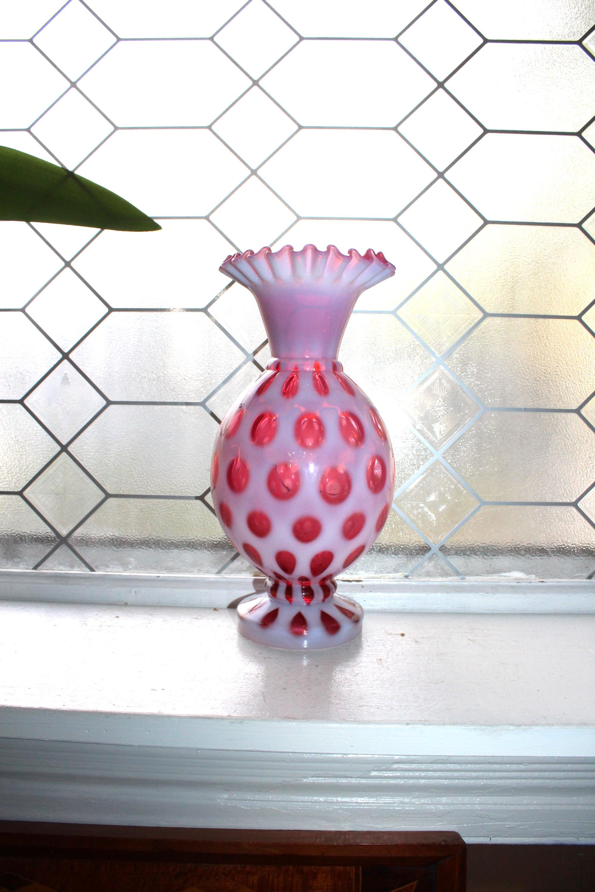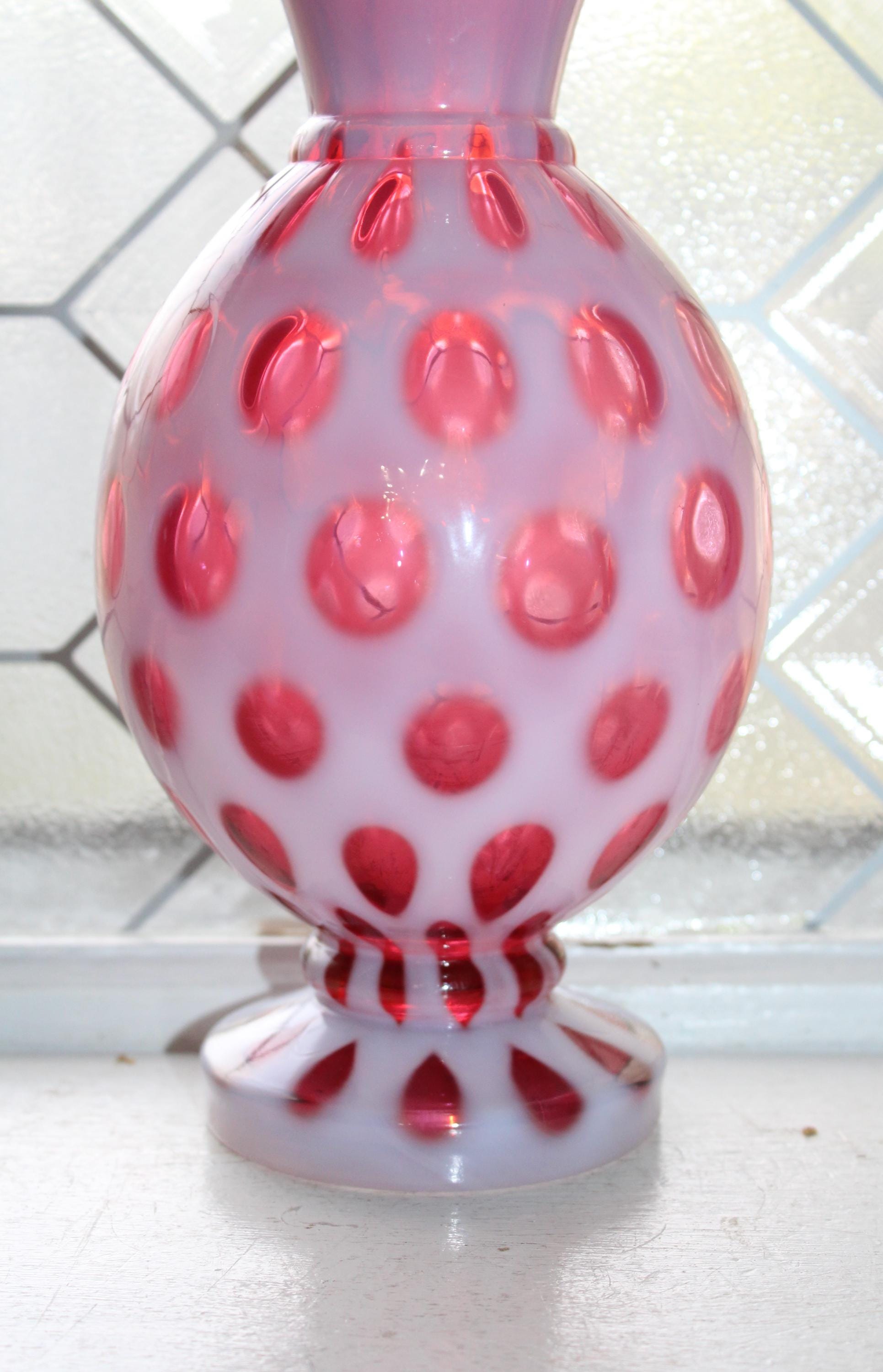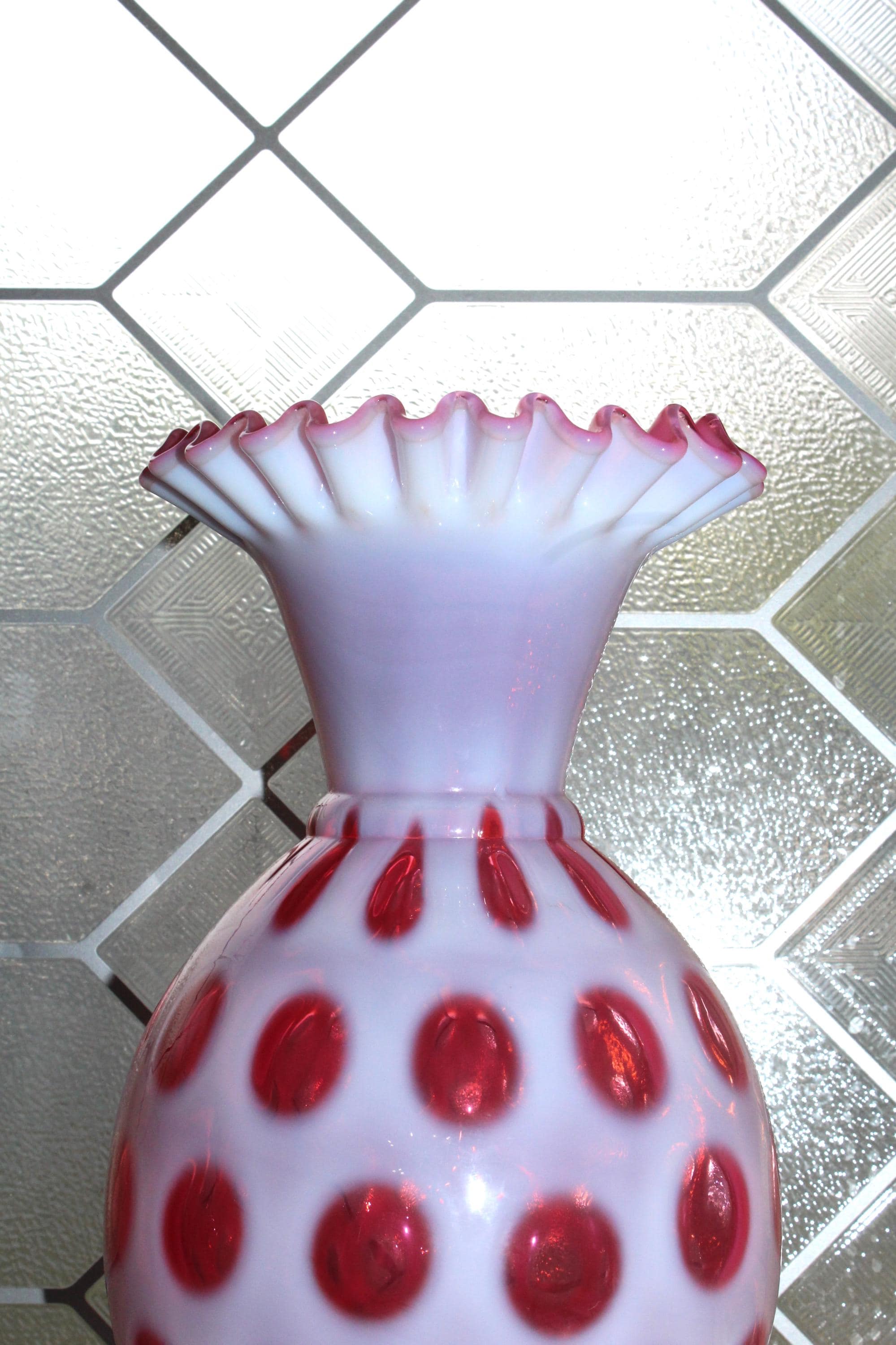 Vintage Fenton cranberry coin dot glass vase with crimped rim, in good condition. The vase measures 10" high and looks fabulous. No chips or cracks, perfect for use or display. Enjoy!
