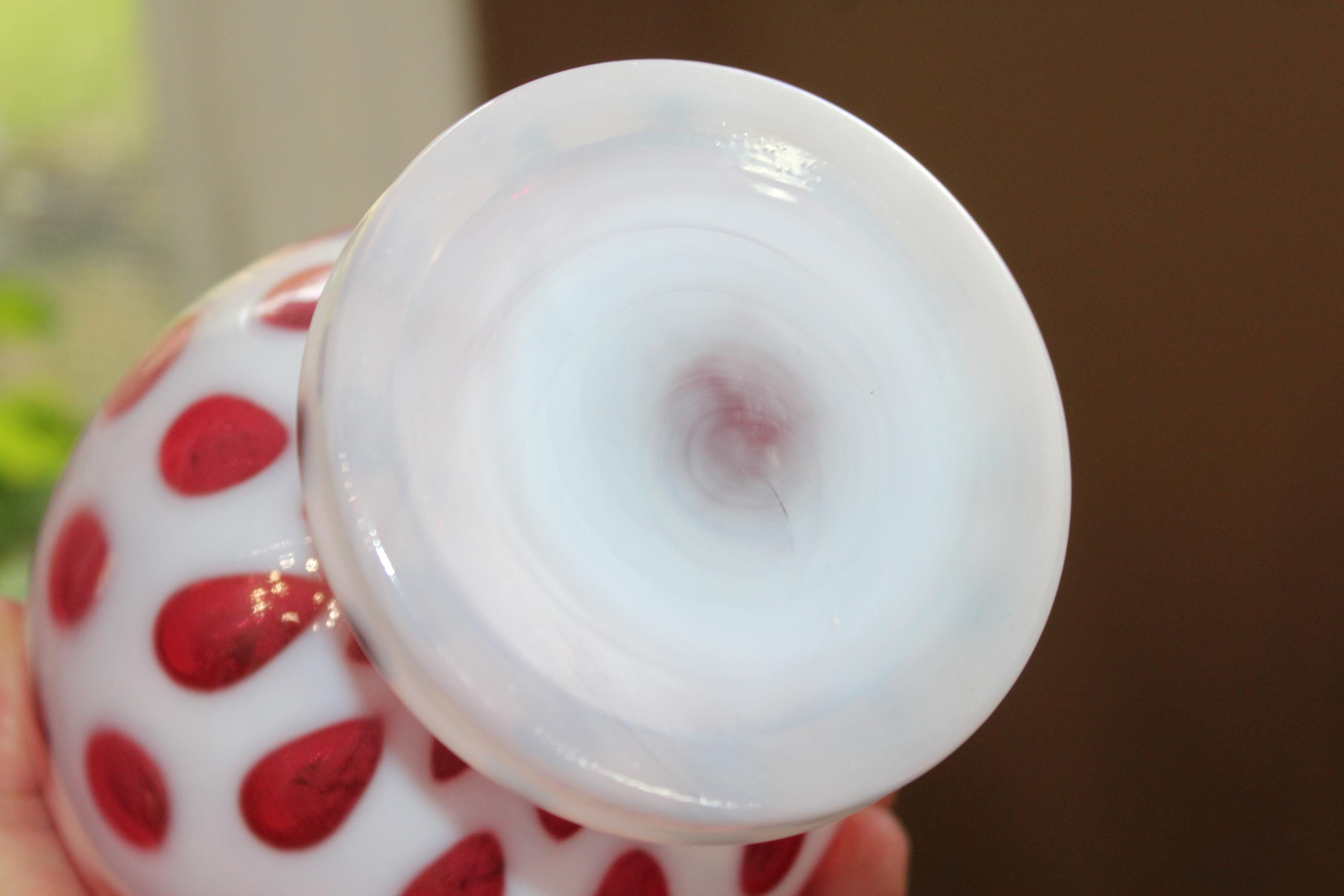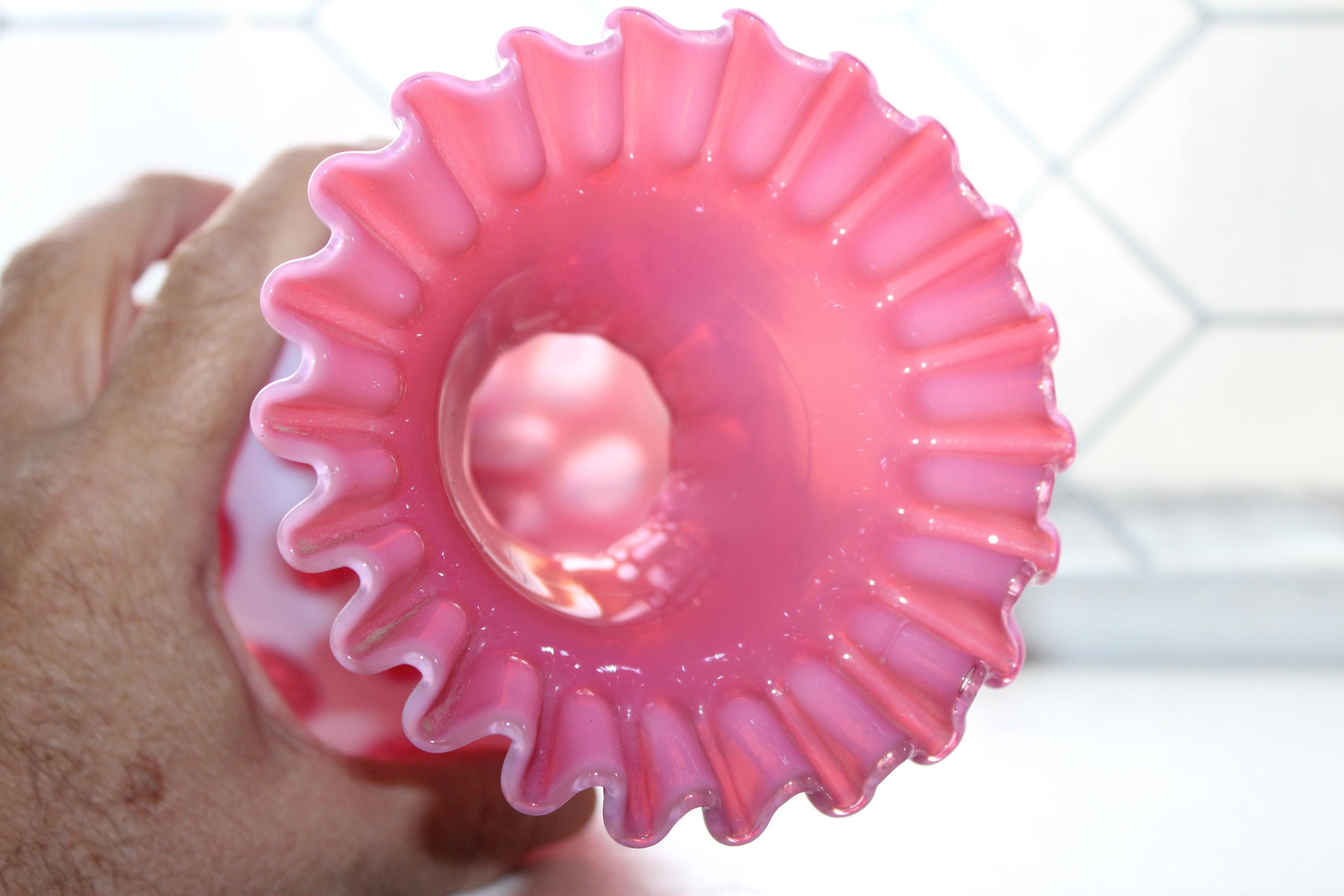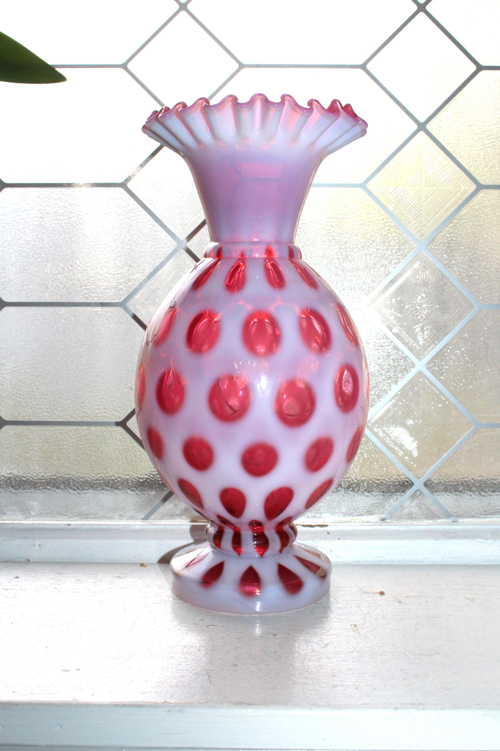 Vintage Fenton cranberry coin dot glass vase with crimped rim, in good condition. The vase measures 10" high and looks fabulous. No chips or cracks, perfect for use or display. Enjoy!