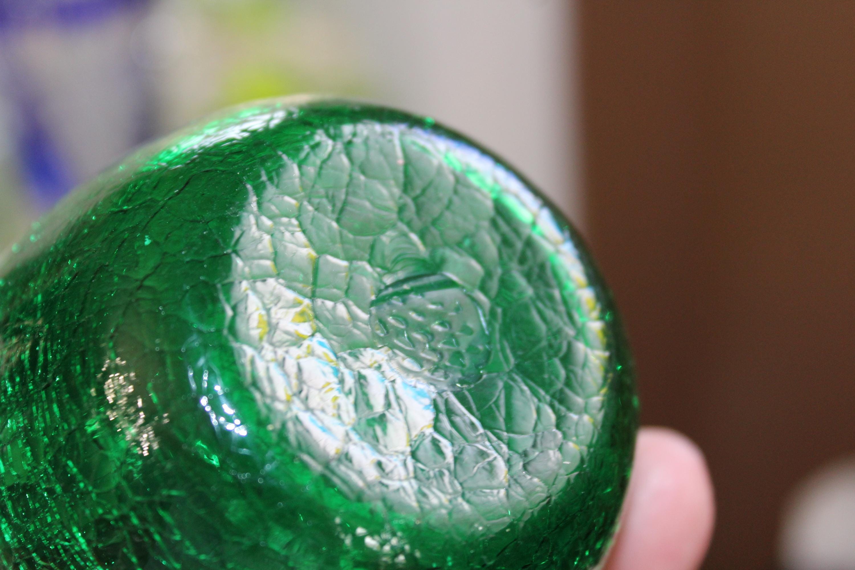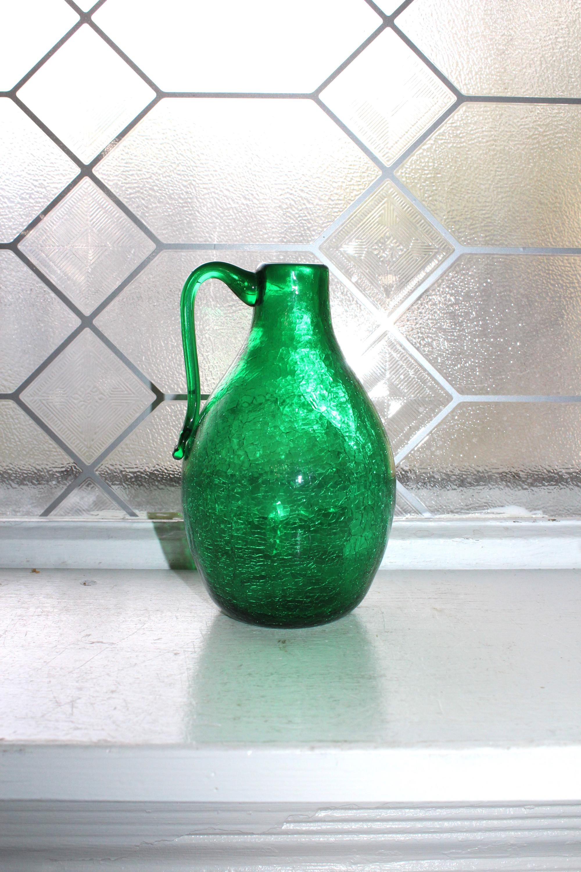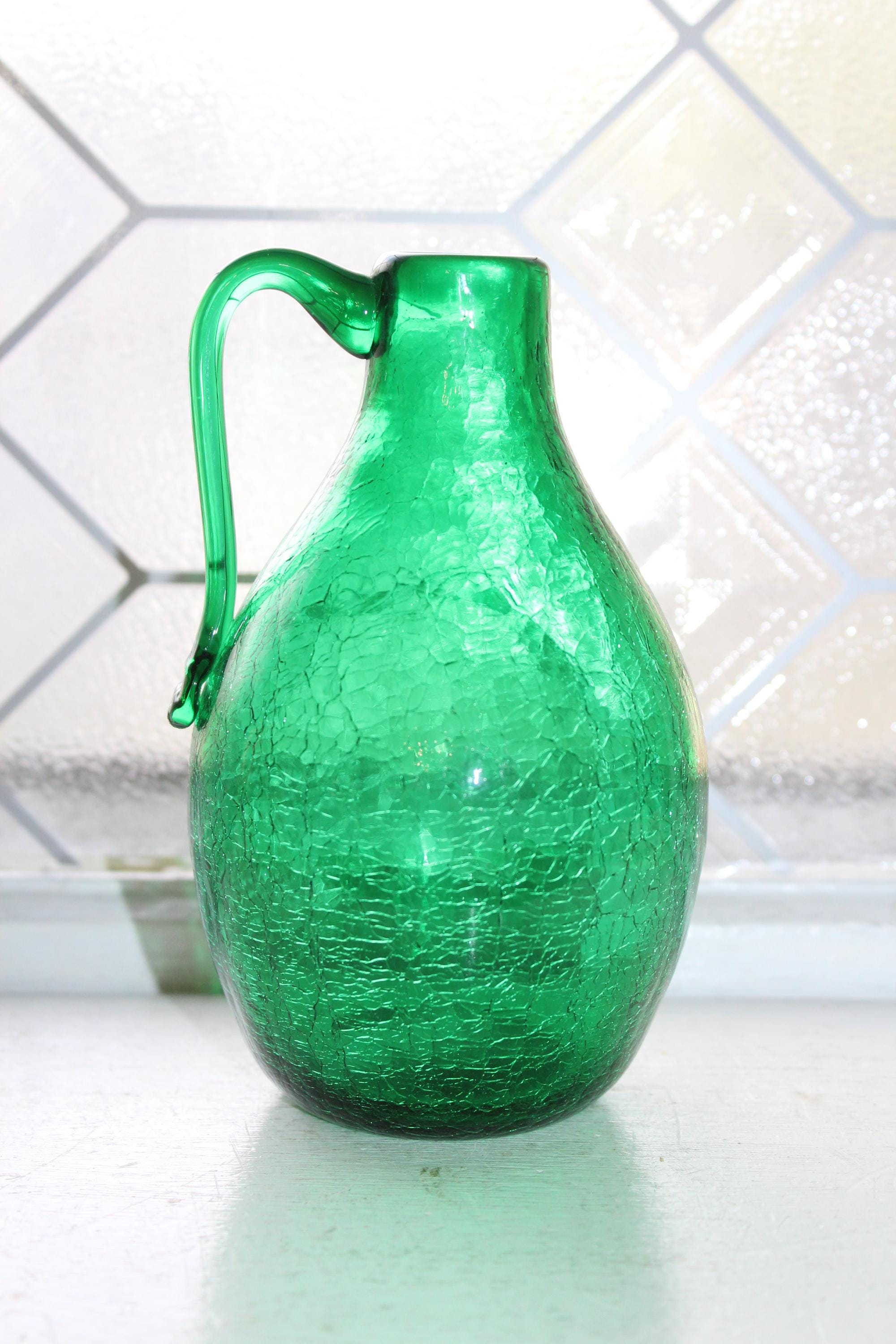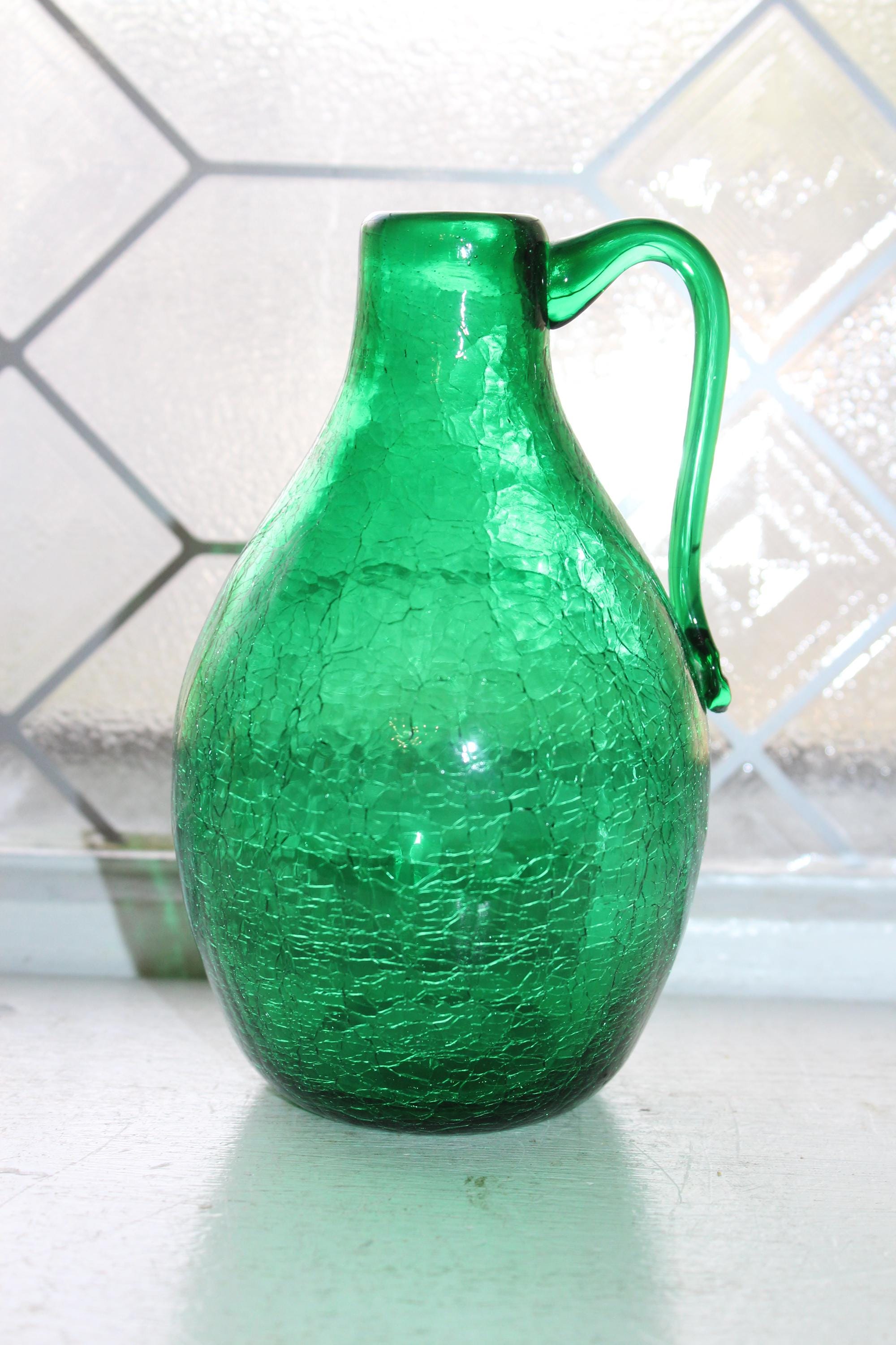 This is a vintage Mid Century green crackle glass pitcher / jug with applied handle, hand blown and in excellent condition. It measures 5 3/4" high and displays very well. It also makes a great bud vase. Enjoy!
