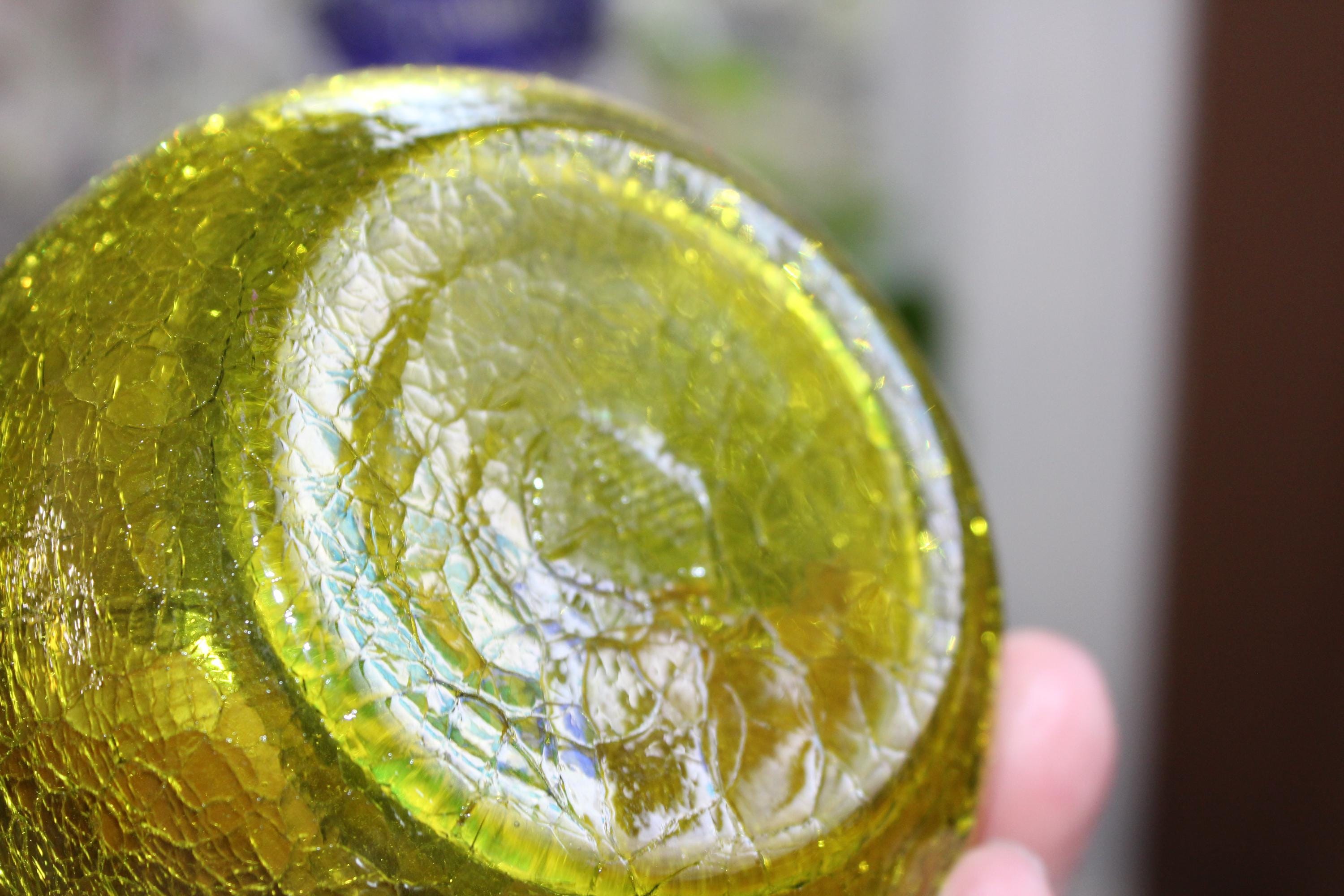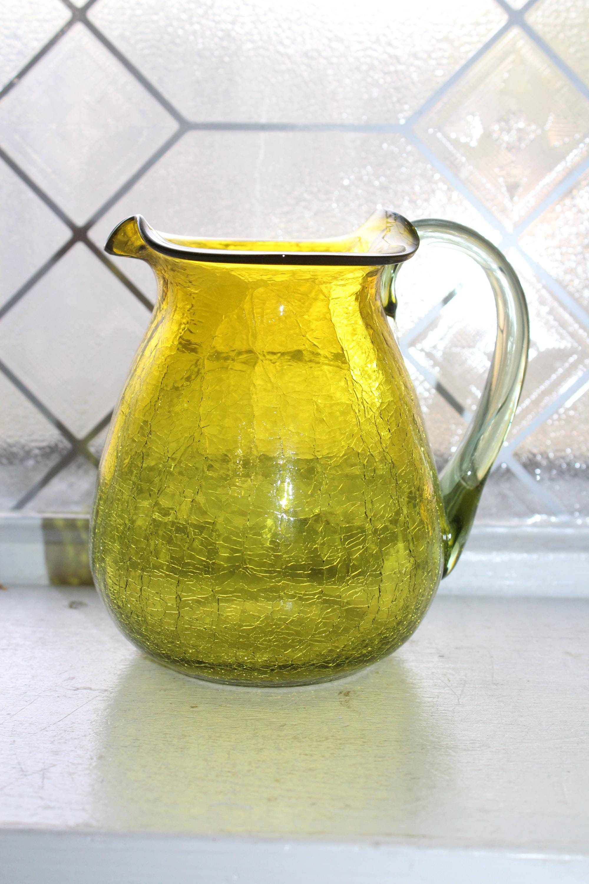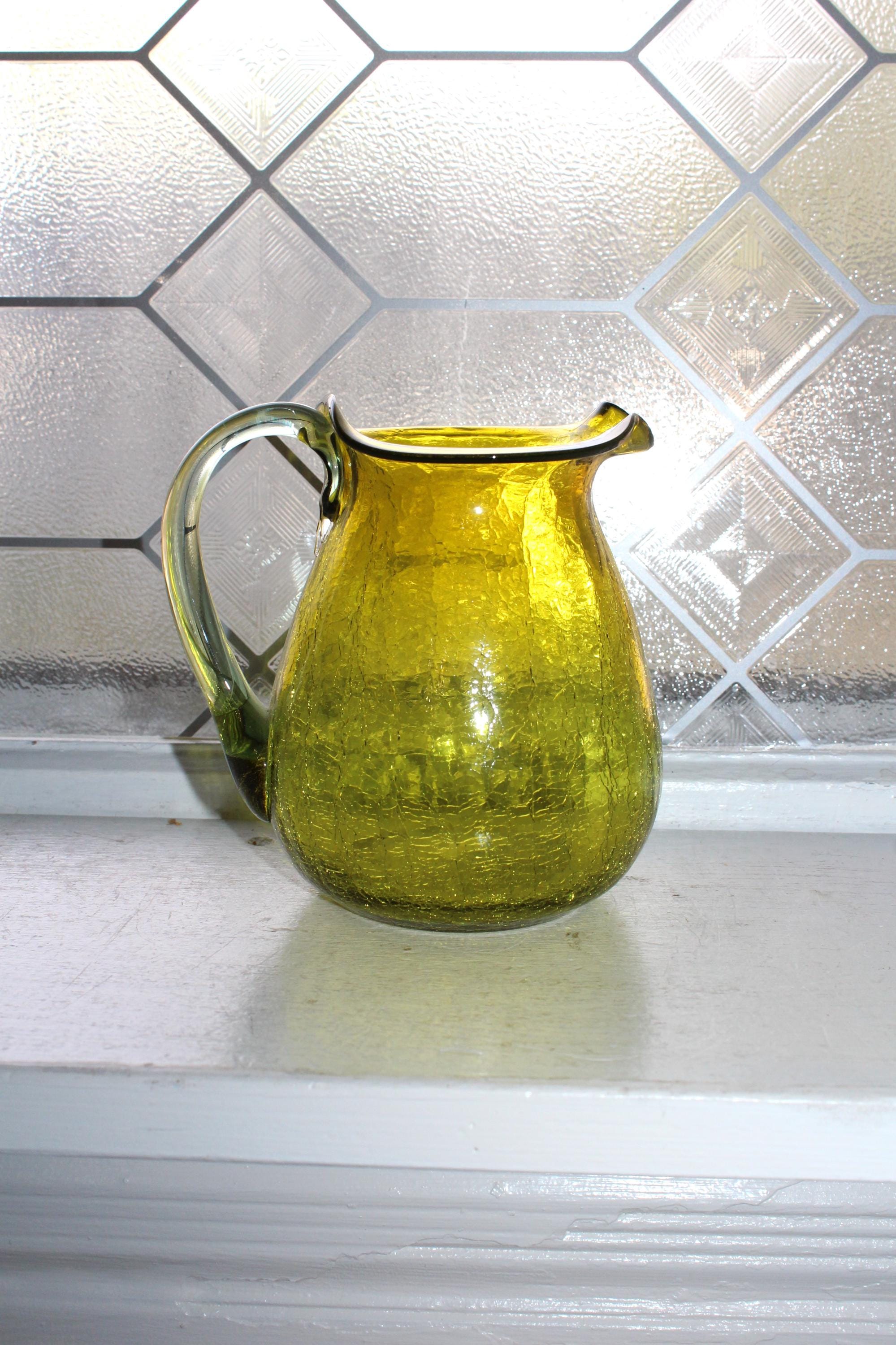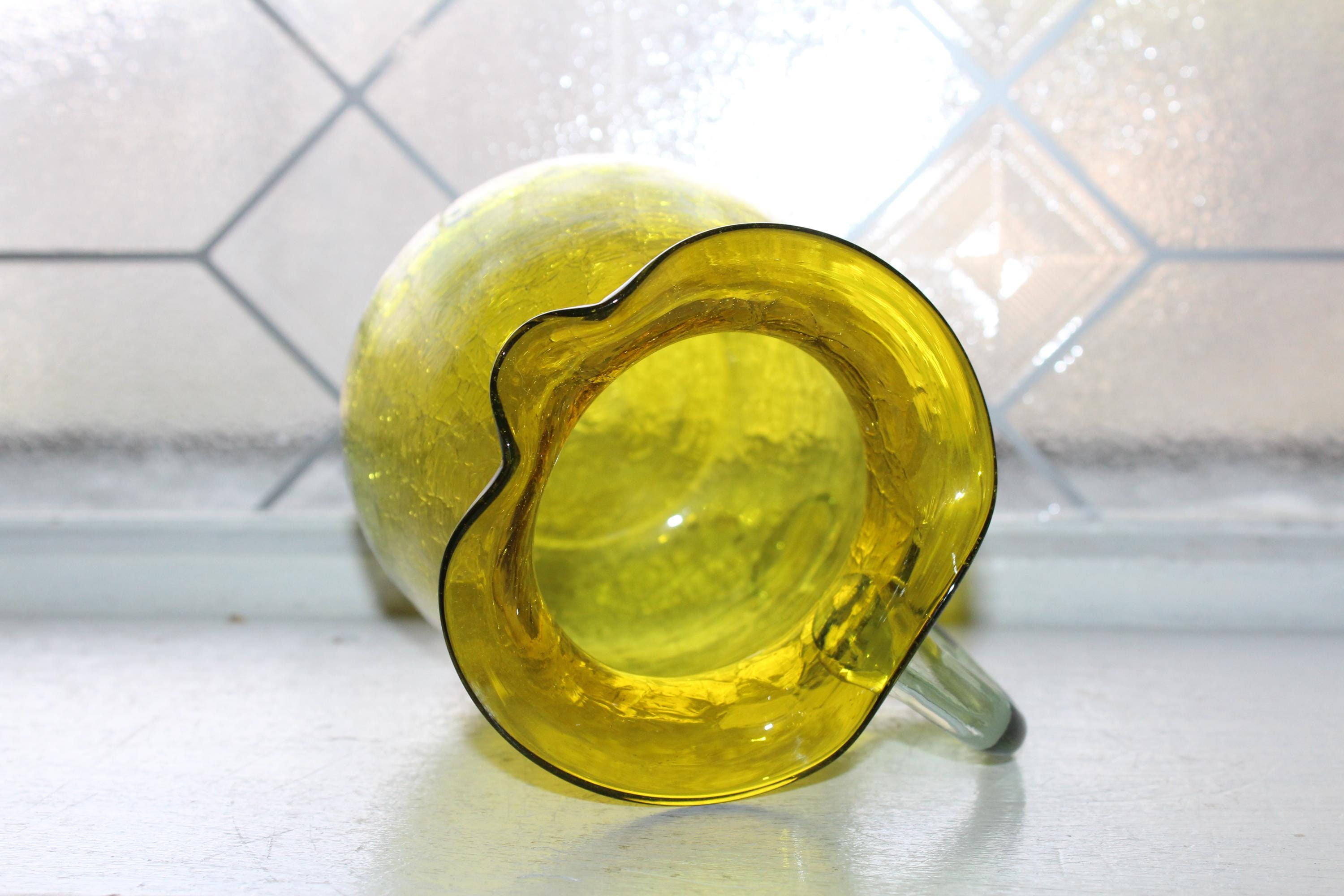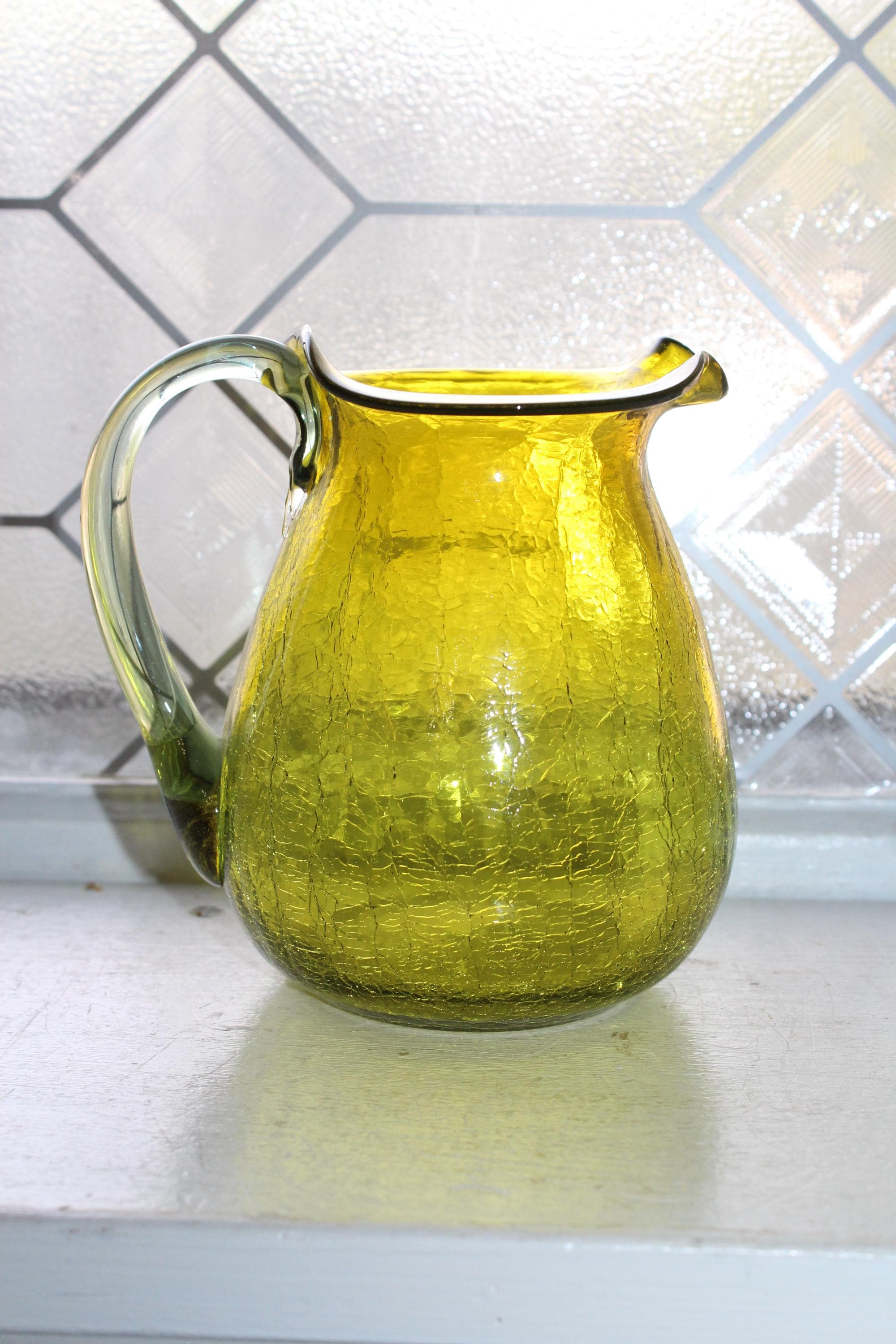Vintage 1960s hand blown yellow green crackle glass pitcher, in excellent condition and perfect for use or display in a Mid Century home. The pitcher measures 5 1/4" high. No chips or cracks. Enjoy!