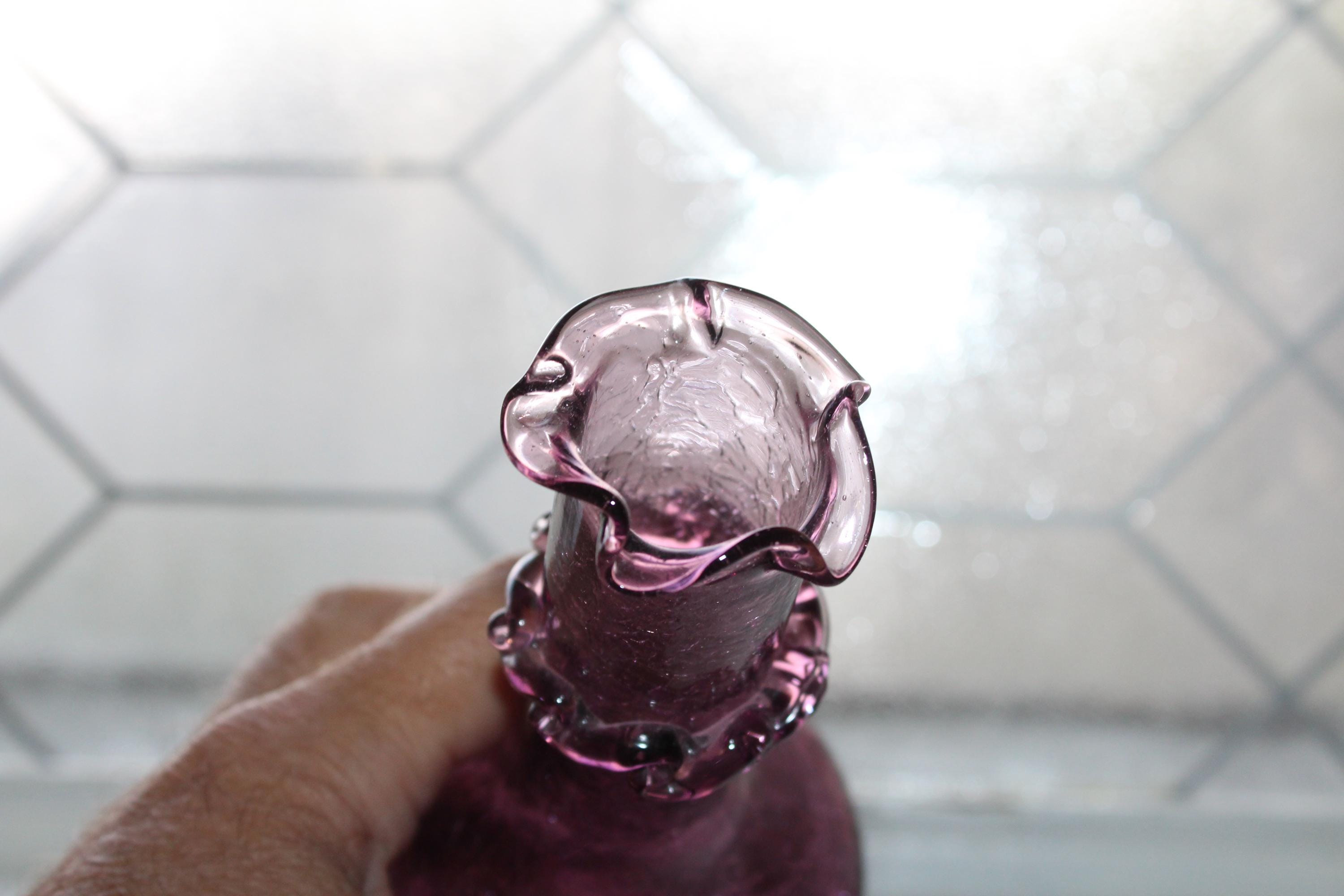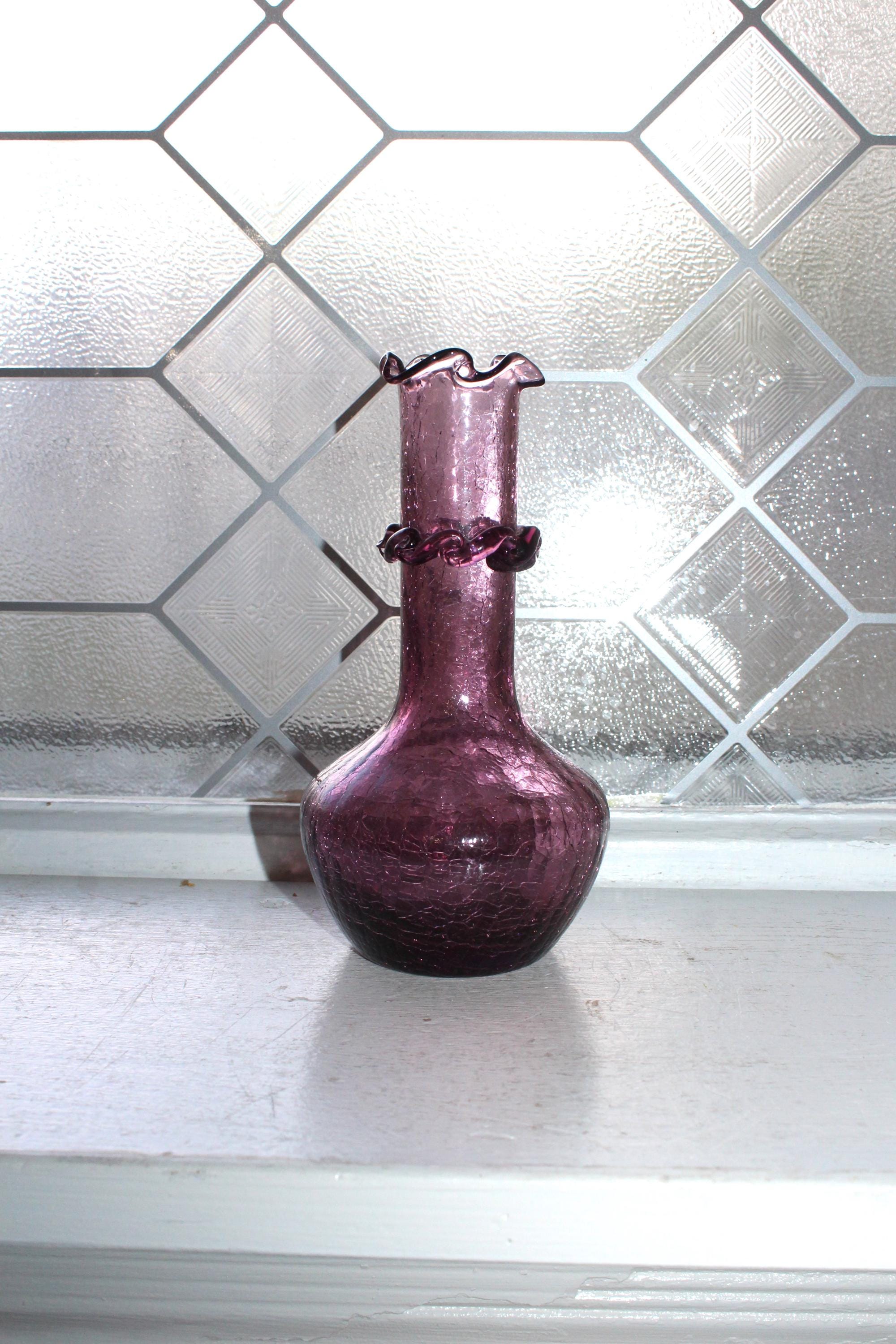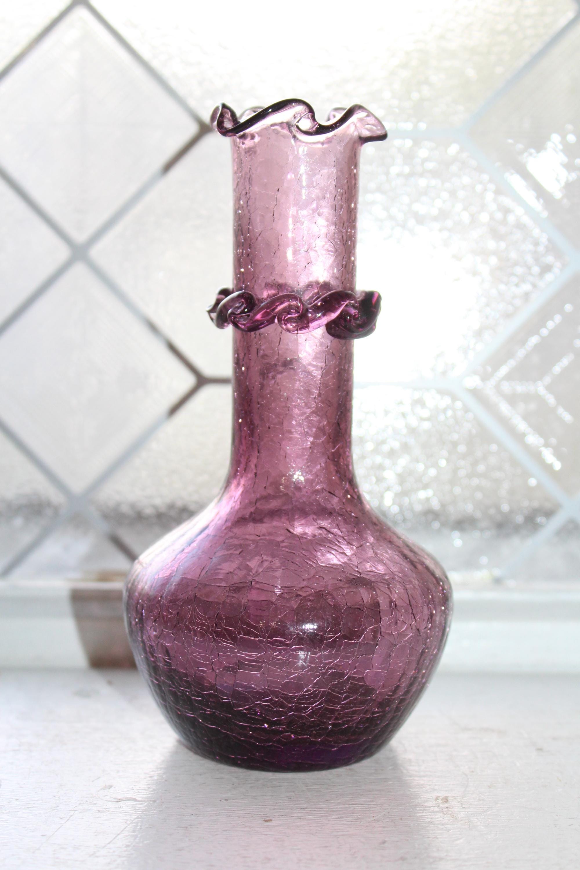 This is a vintage purple crackle Rainbow glass vase, hand blown and in excellent condition. It measures 62" high and displays very well, perfect for a Mid Century Modern home. Enjoy!