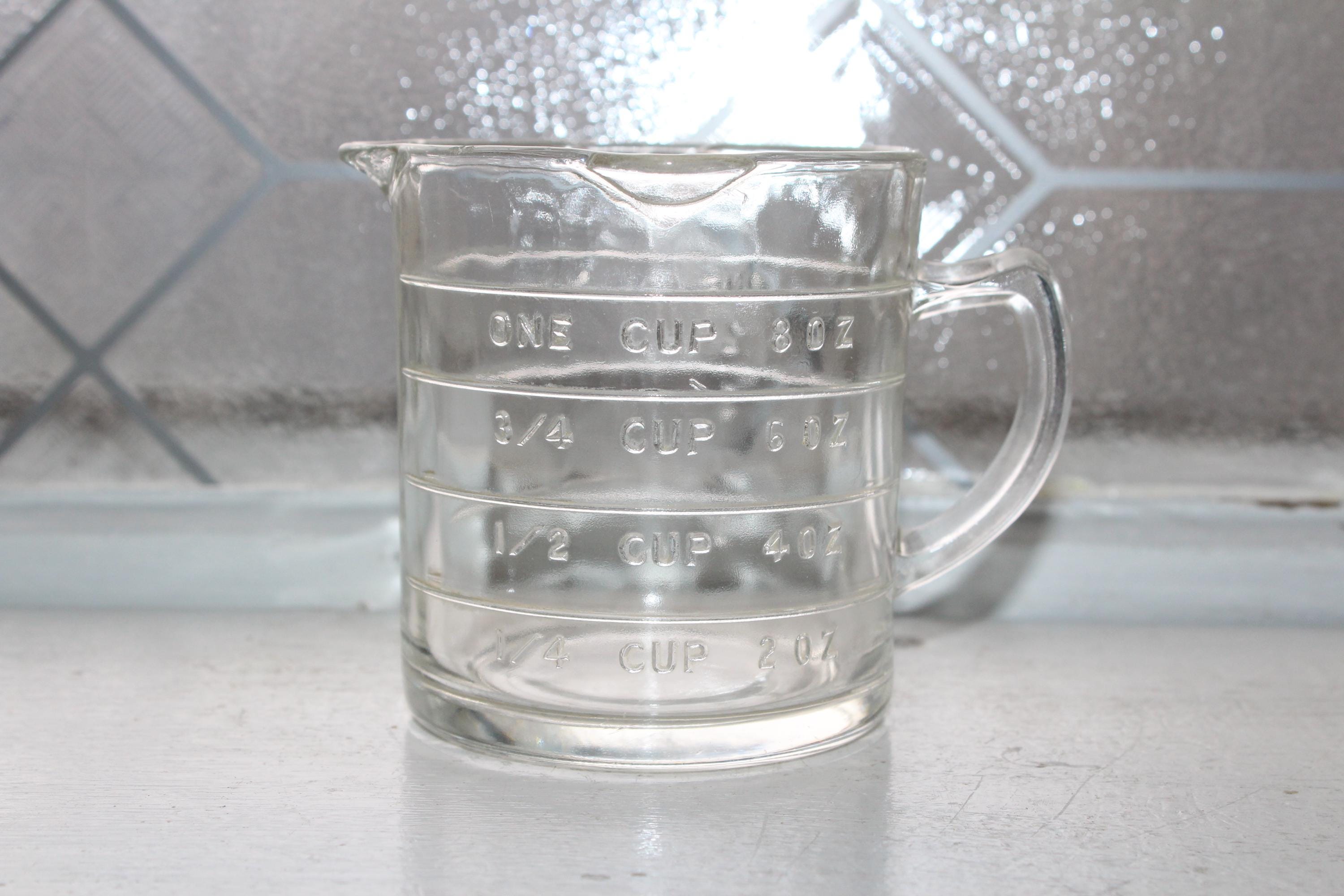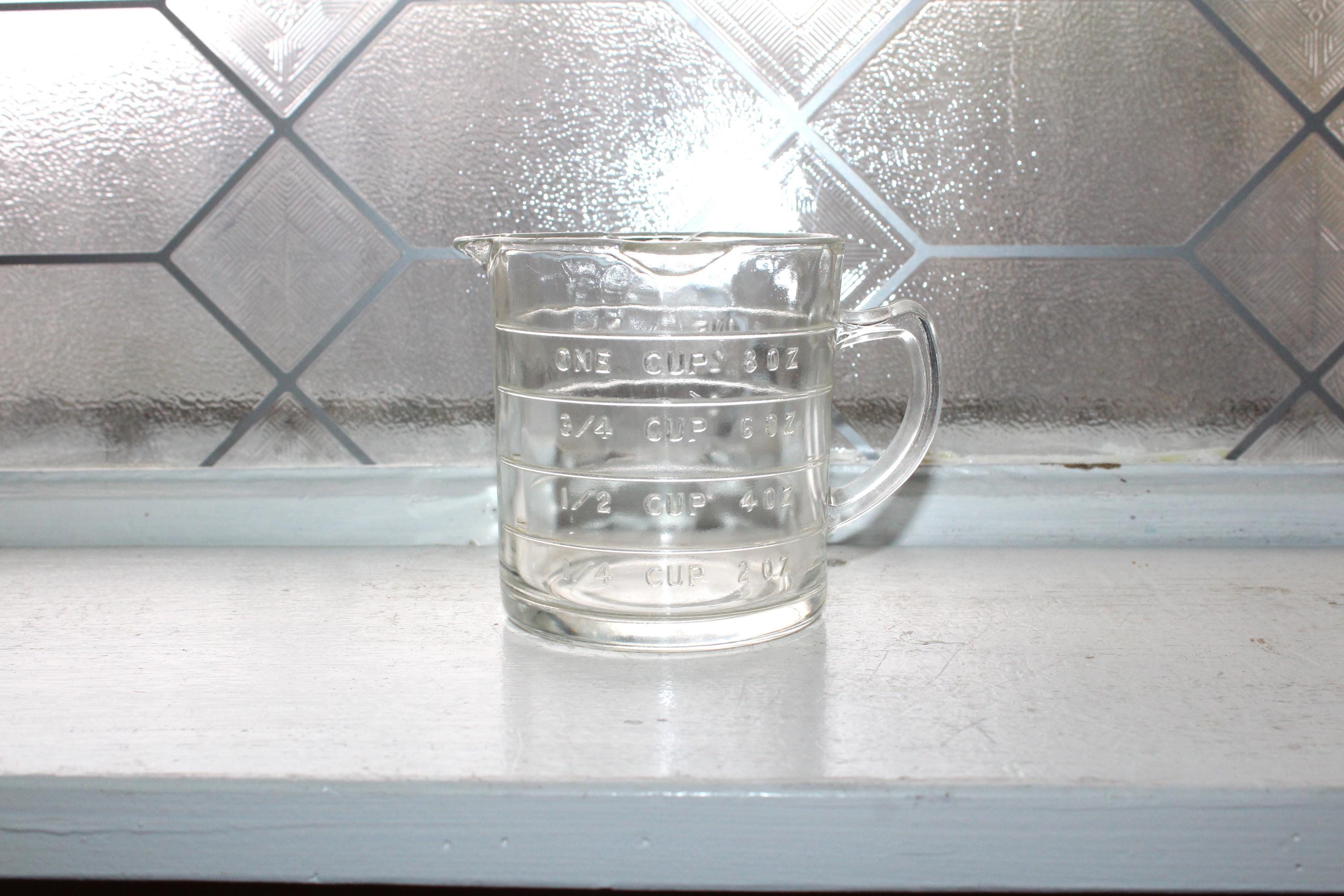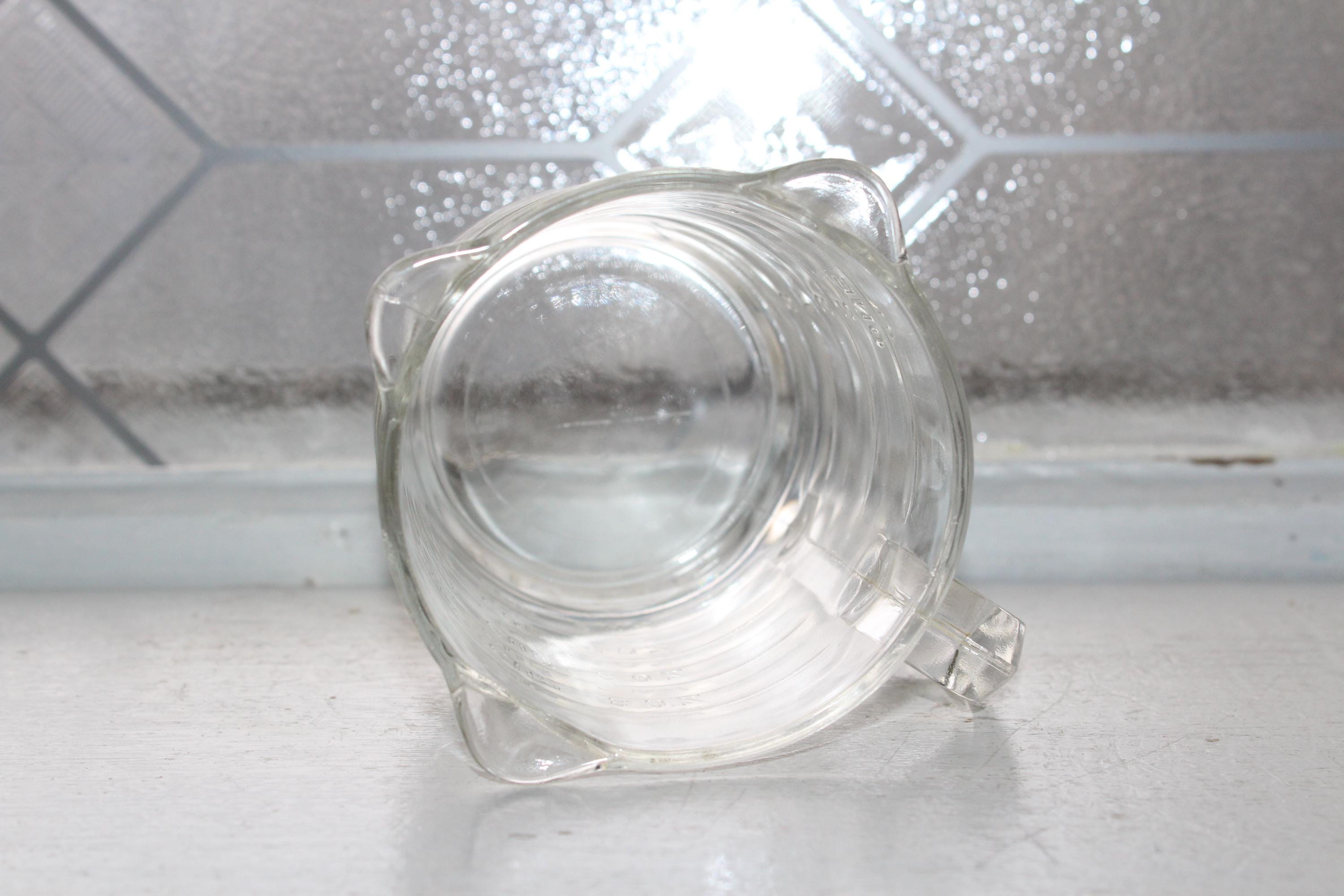 Vintage 1930s clear glass, 1 cup size, 3 spout measuring cup, in excellent condition. It measures 3 1/2" high. No chips or cracks, great for use or display. Enjoy!