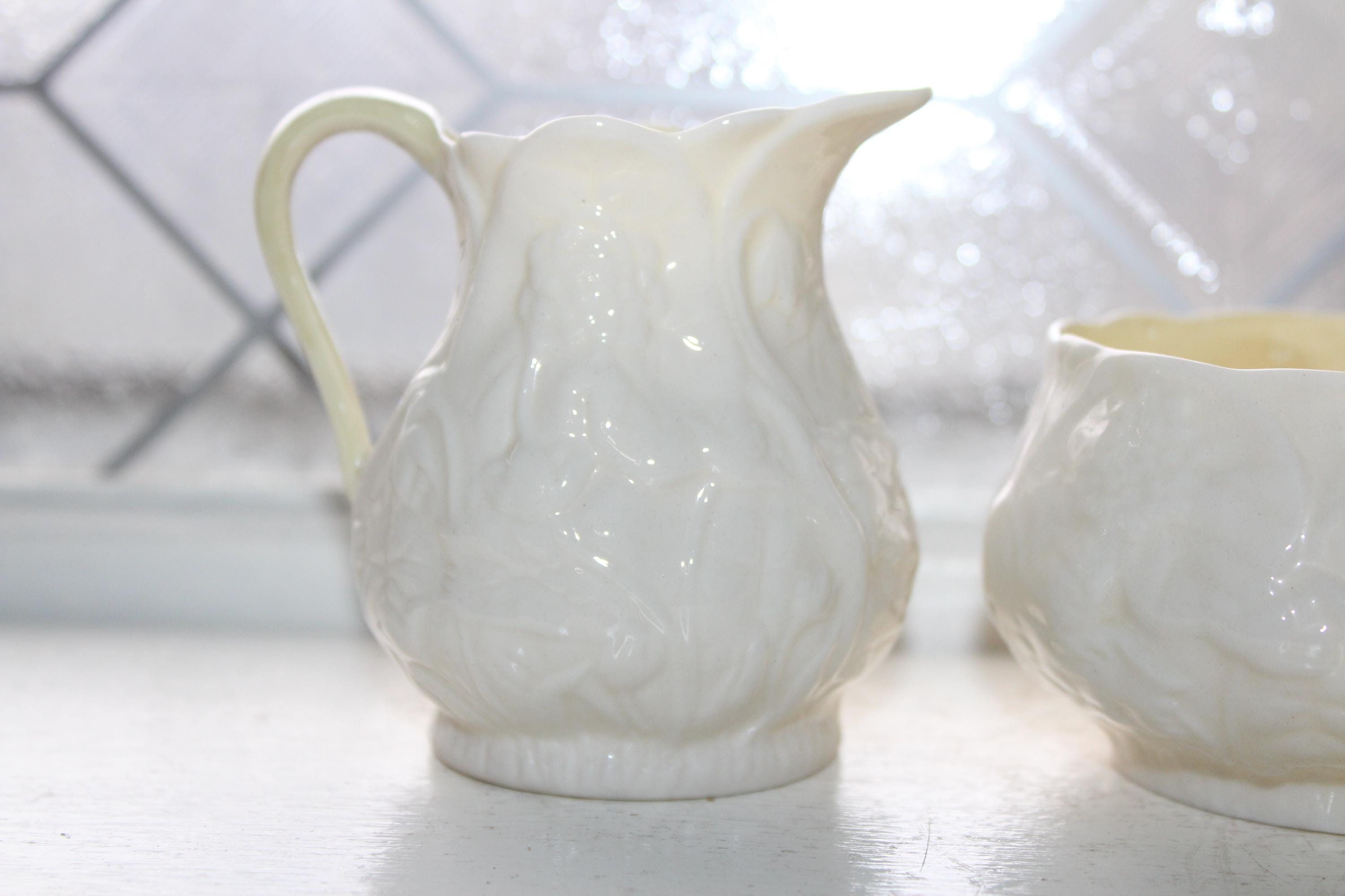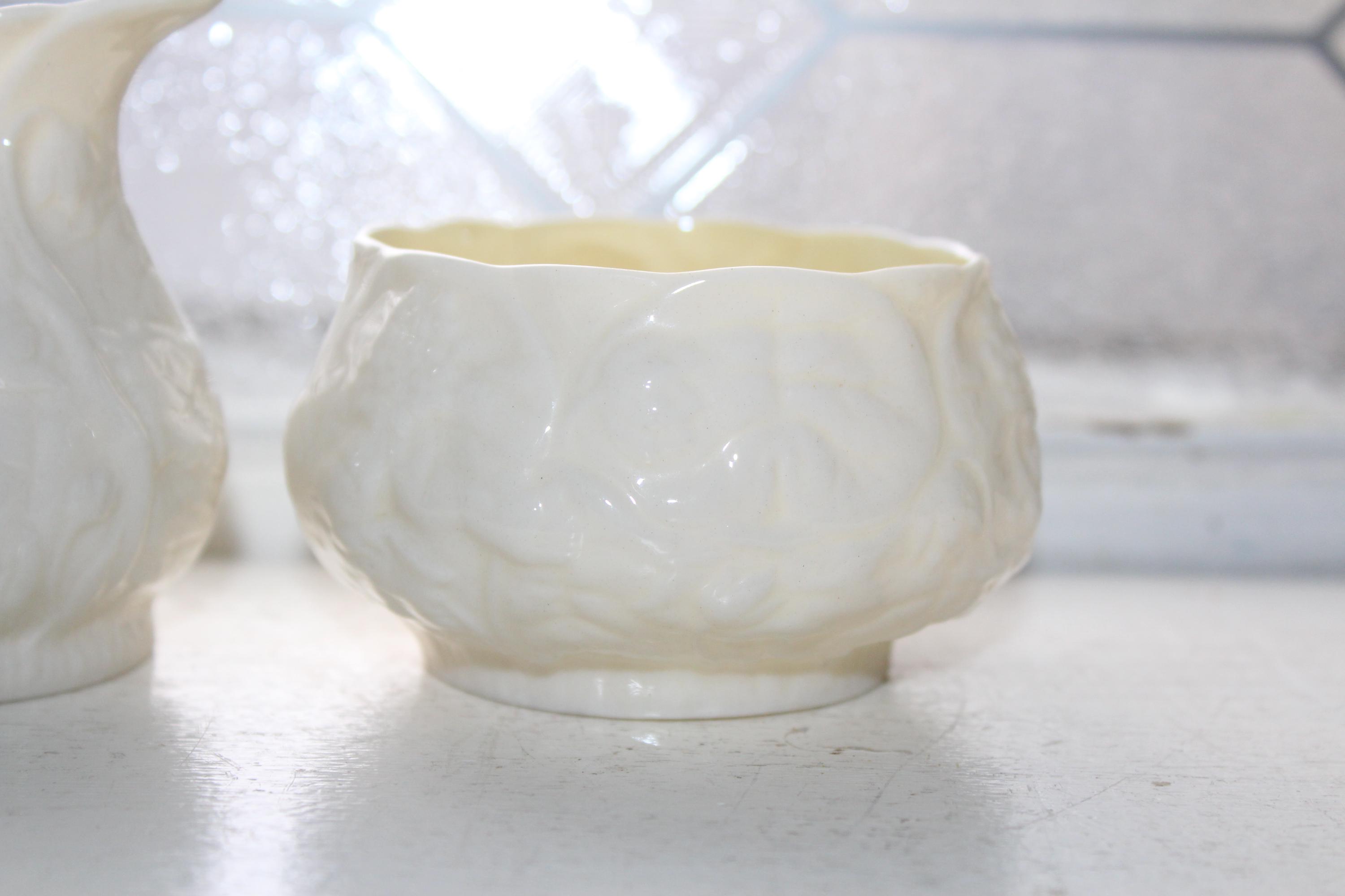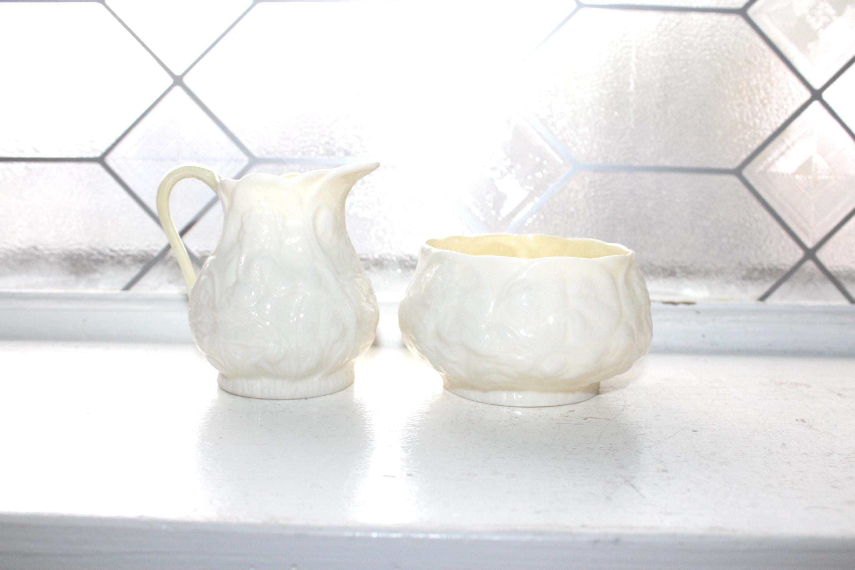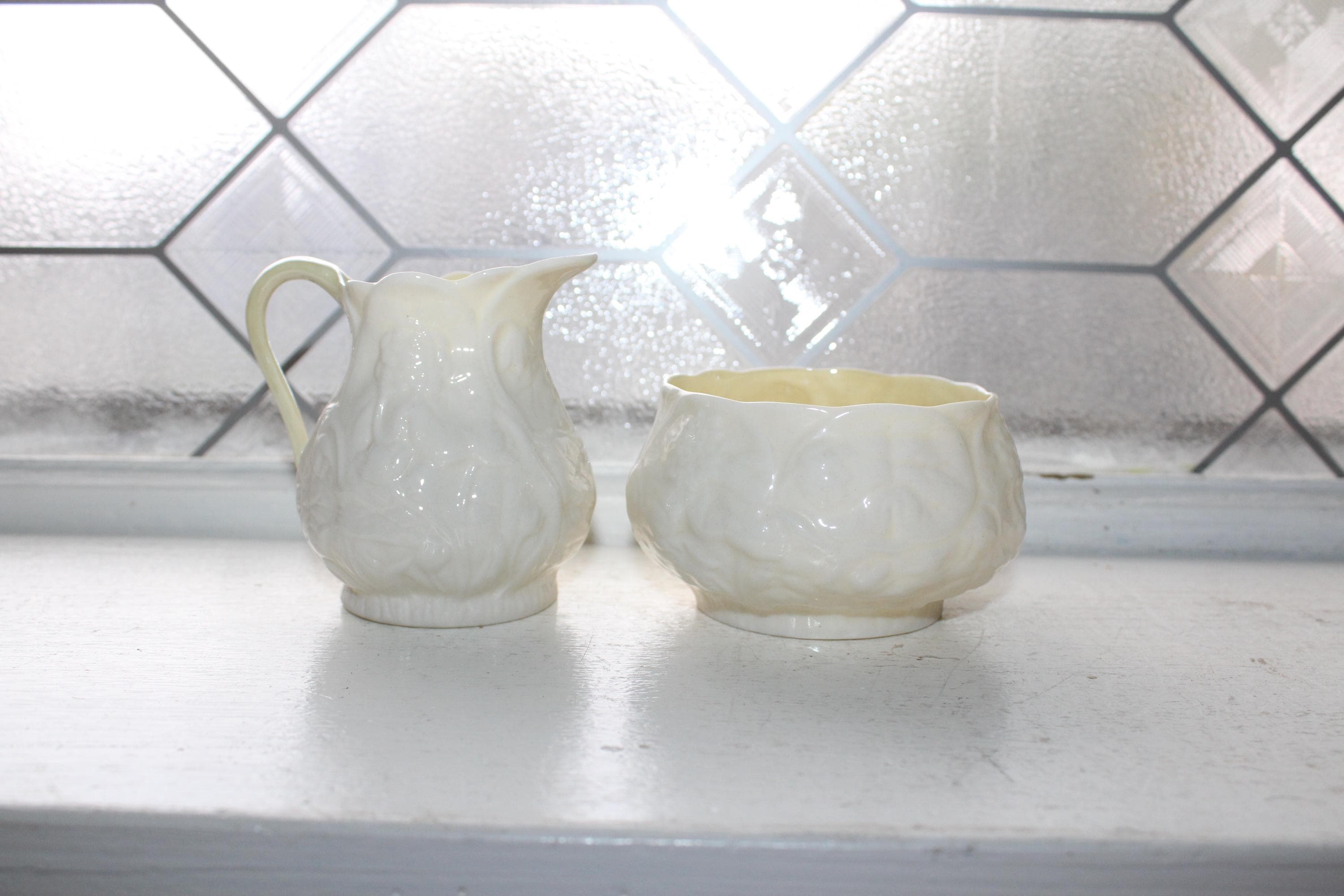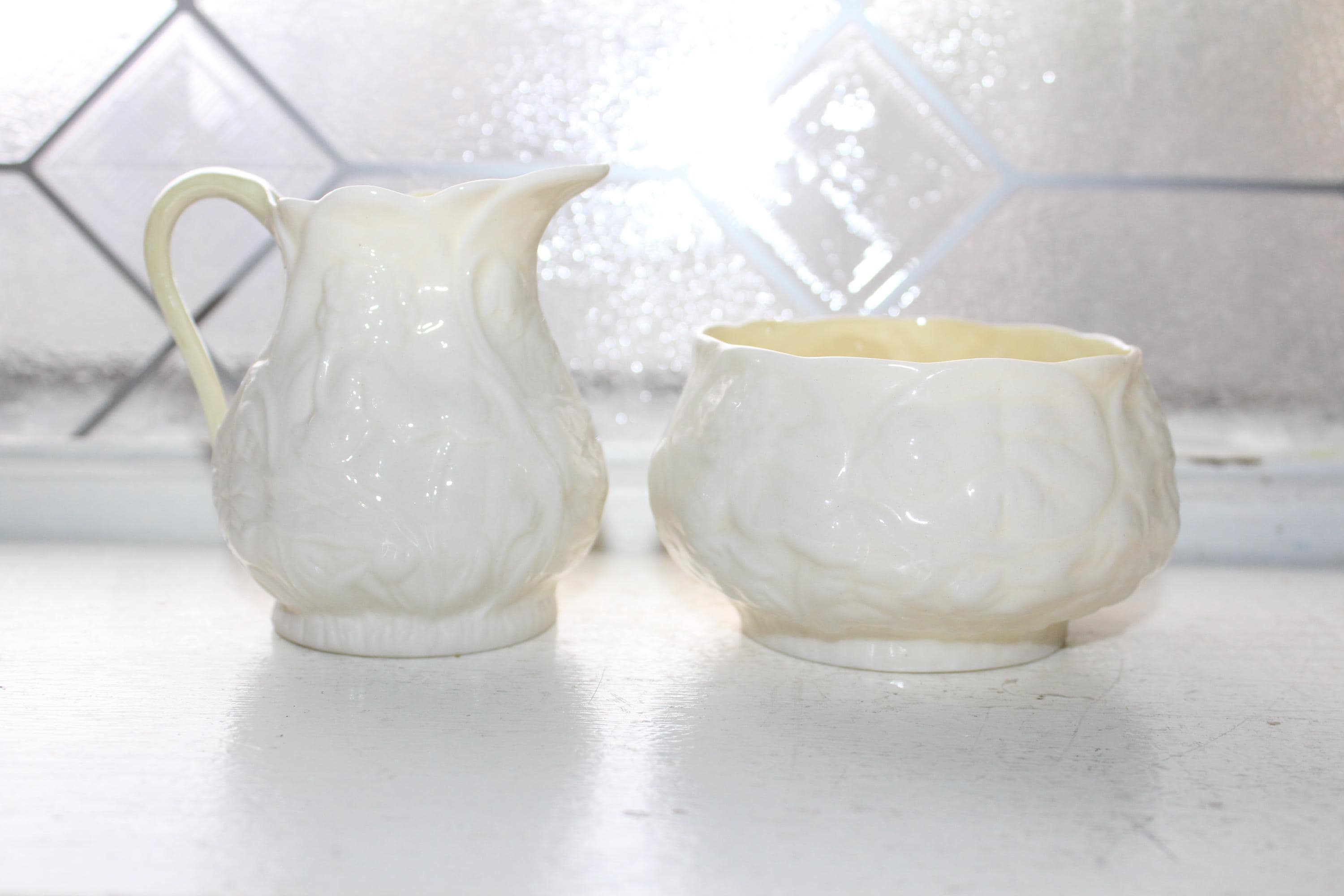 Vintage Irish Belleek Lotus creamer and sugar bowl, in excellent condition. The creamer measures 3 1/4" high. No chips or cracks, perfect for use or display. Enjoy!