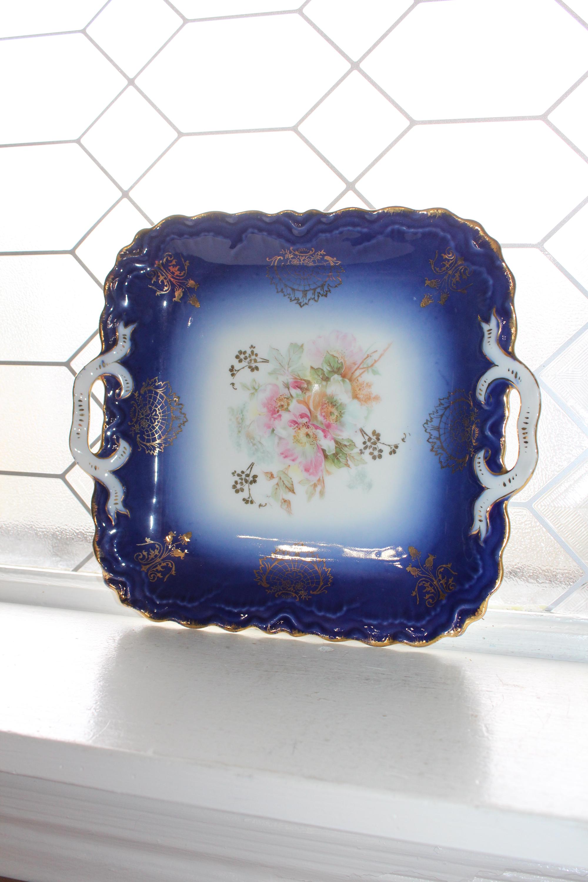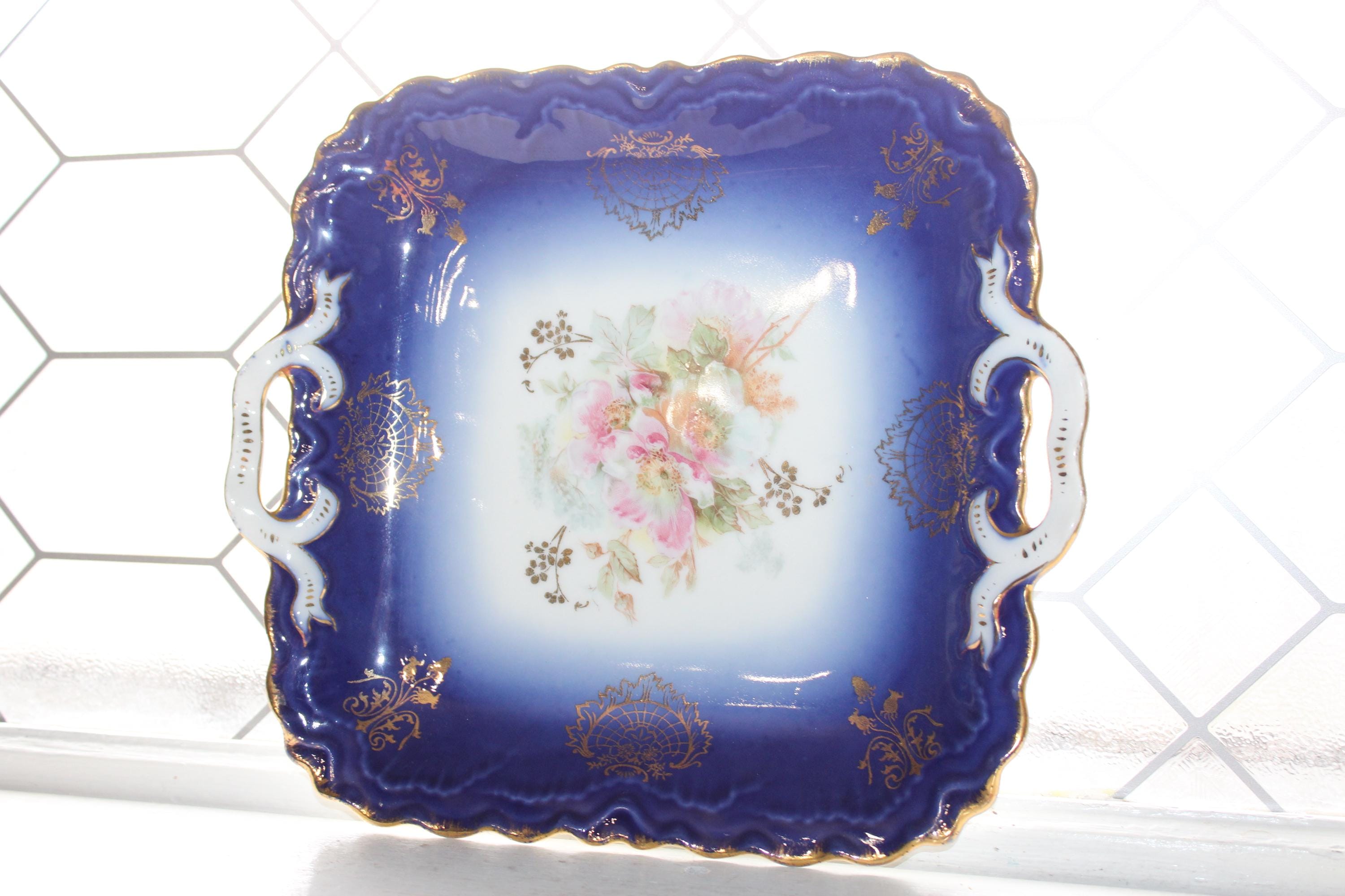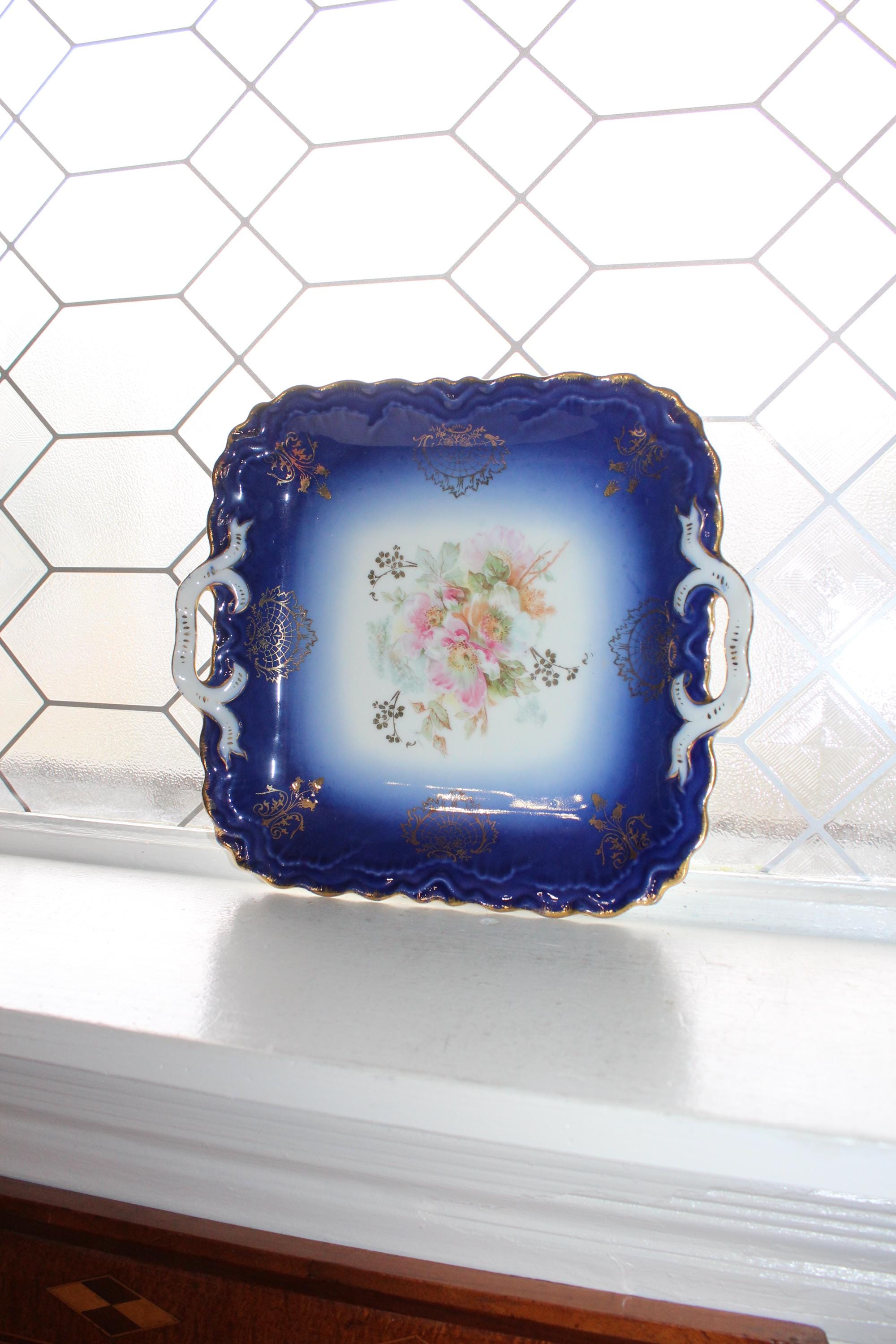 This is a gorgeous antique PM Bavaria square dish with handles featuring beautiful cobalt blue with center flowers, in good condition. The dish measures 9 1/2" wide. No chips or cracks. Enjoy!