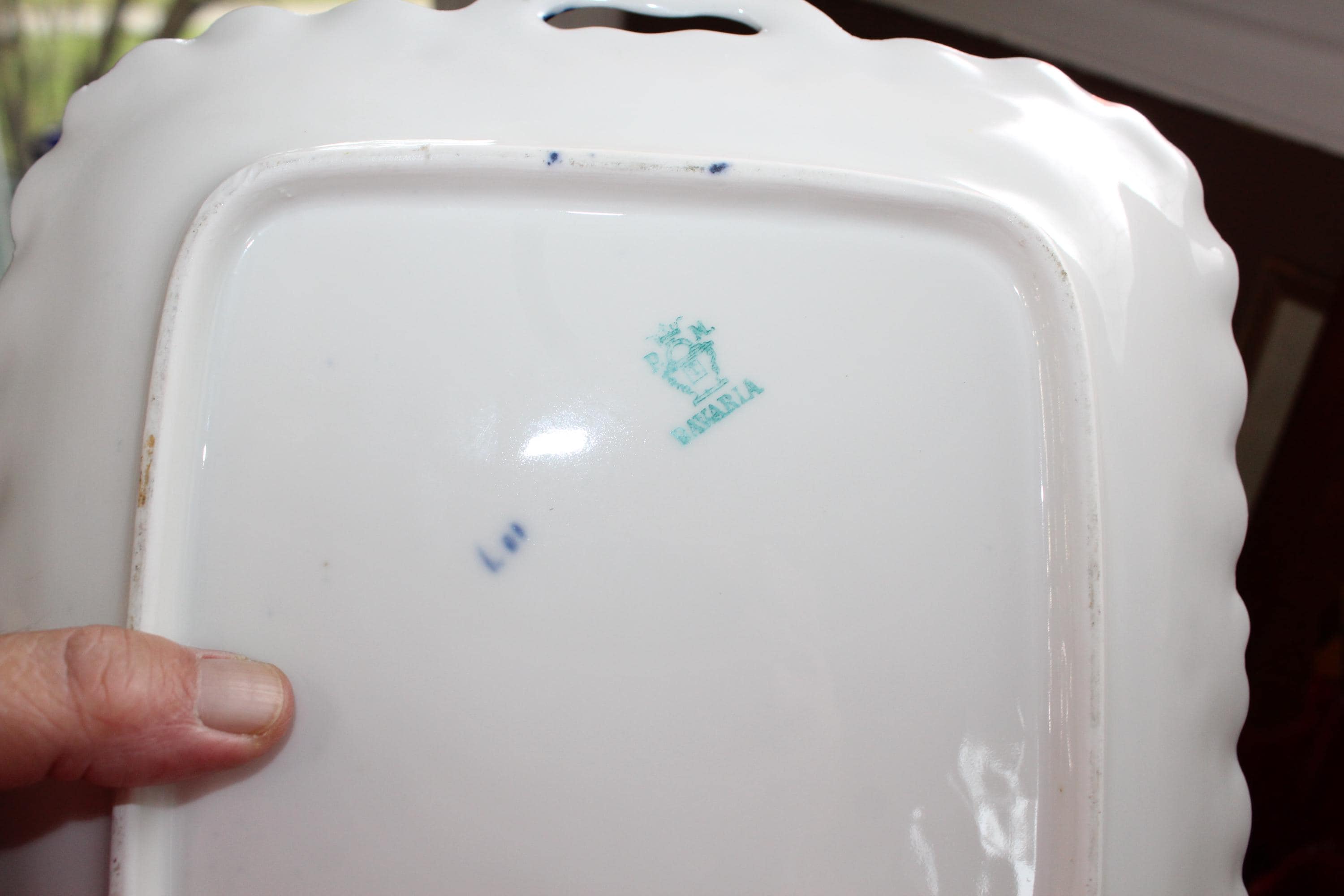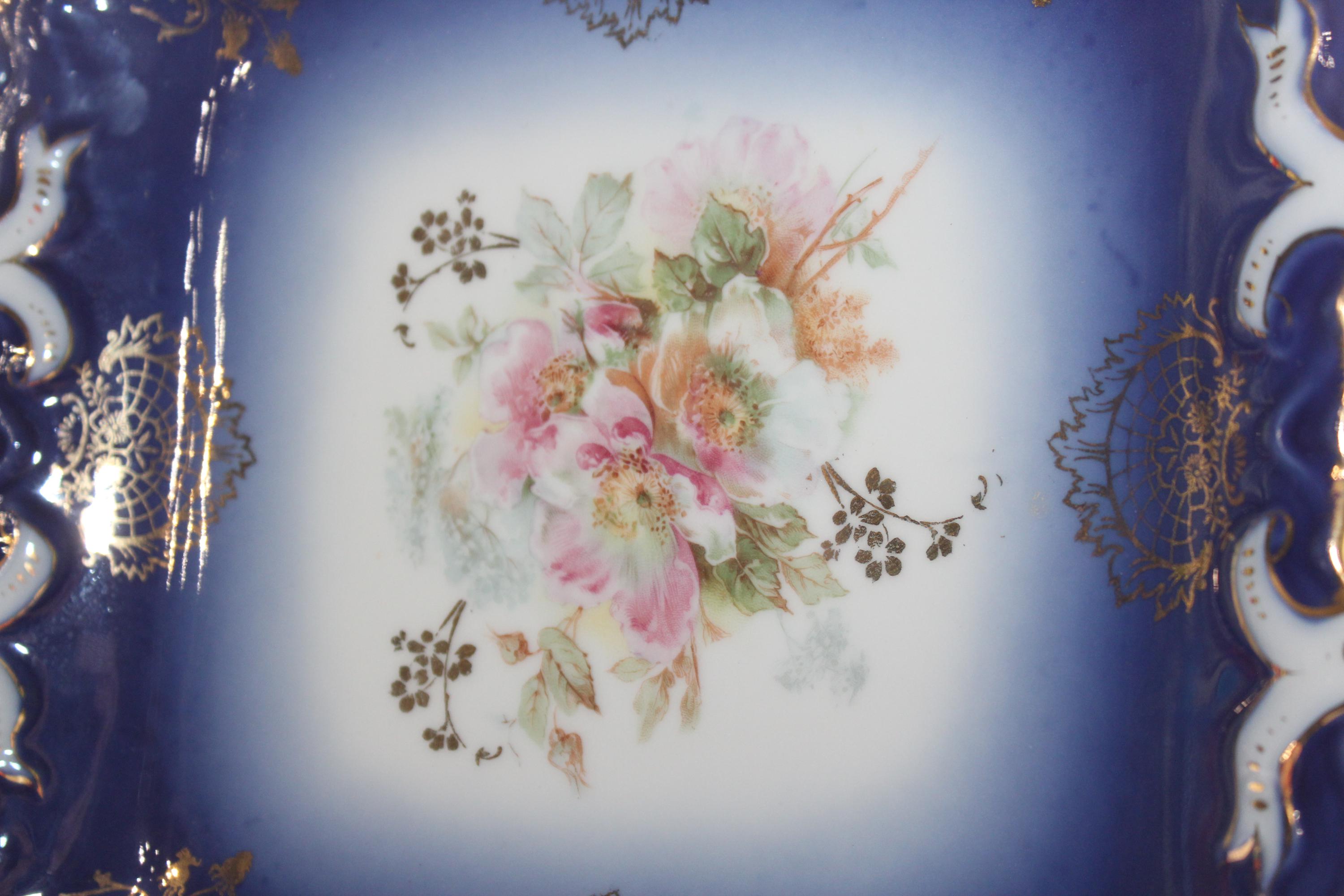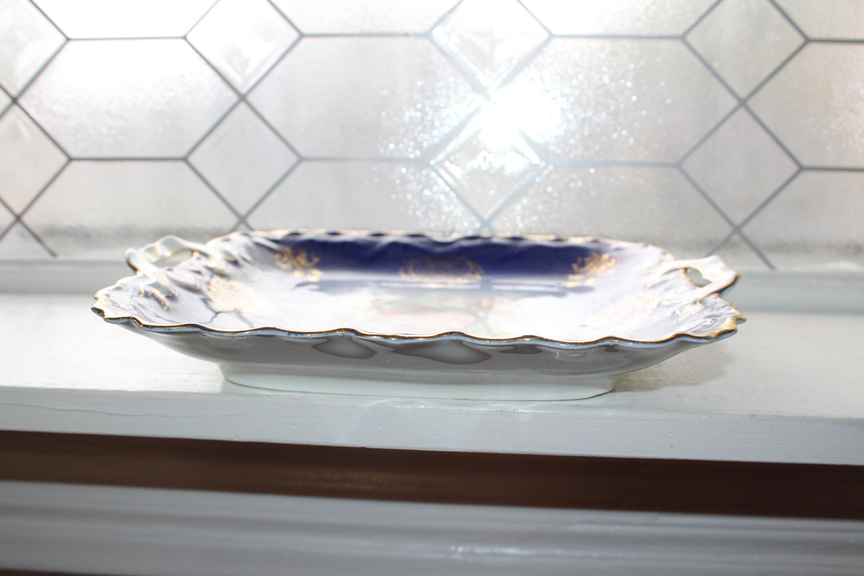 This is a gorgeous antique PM Bavaria square dish with handles featuring beautiful cobalt blue with center flowers, in good condition. The dish measures 9 1/2" wide. No chips or cracks. Enjoy!