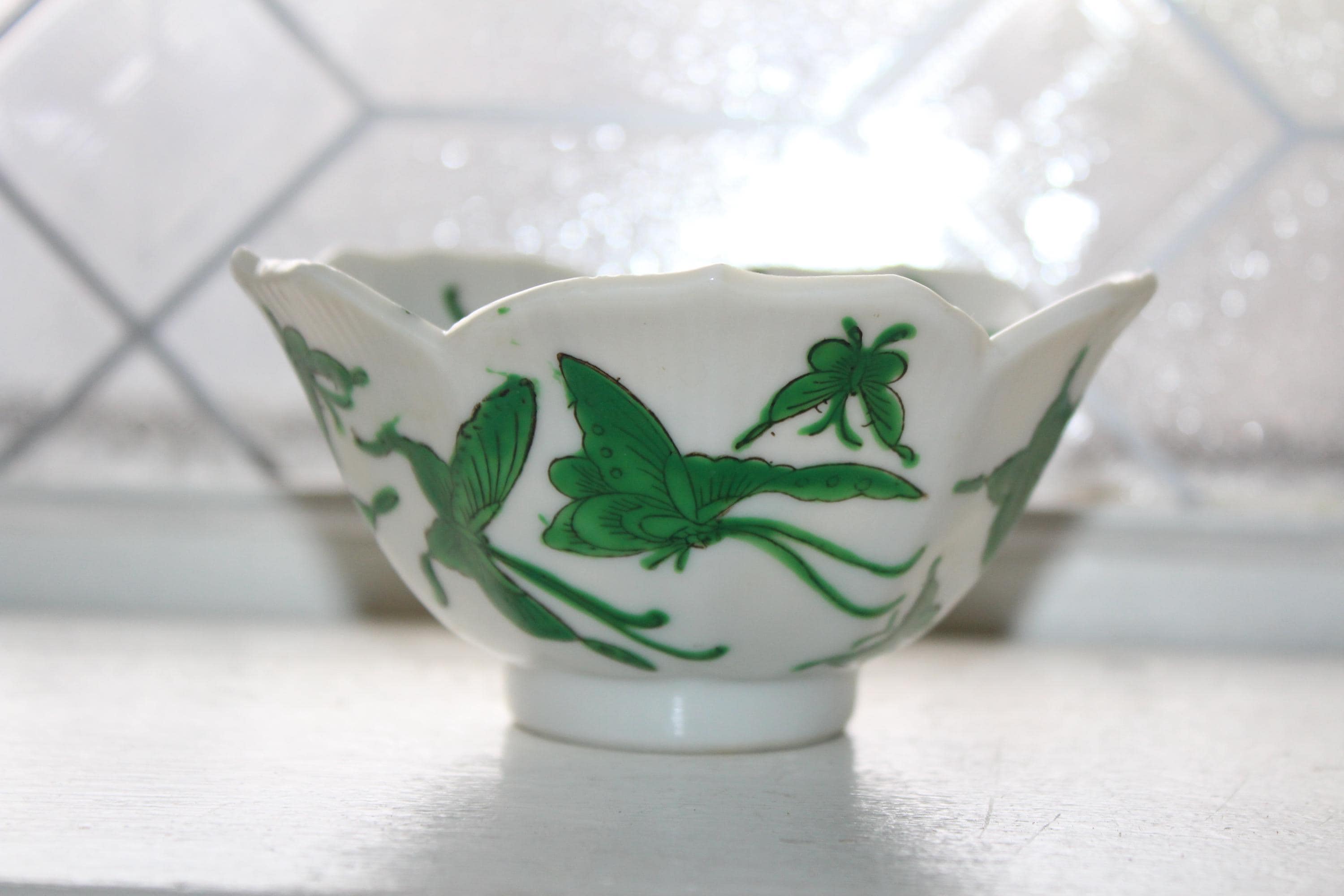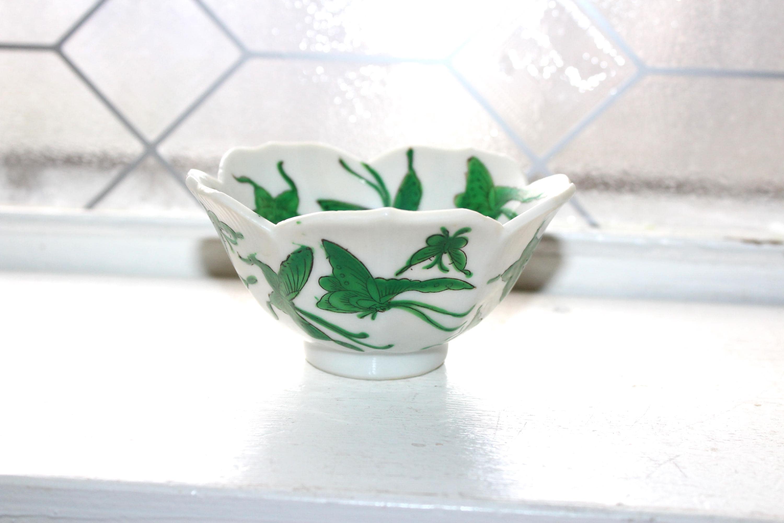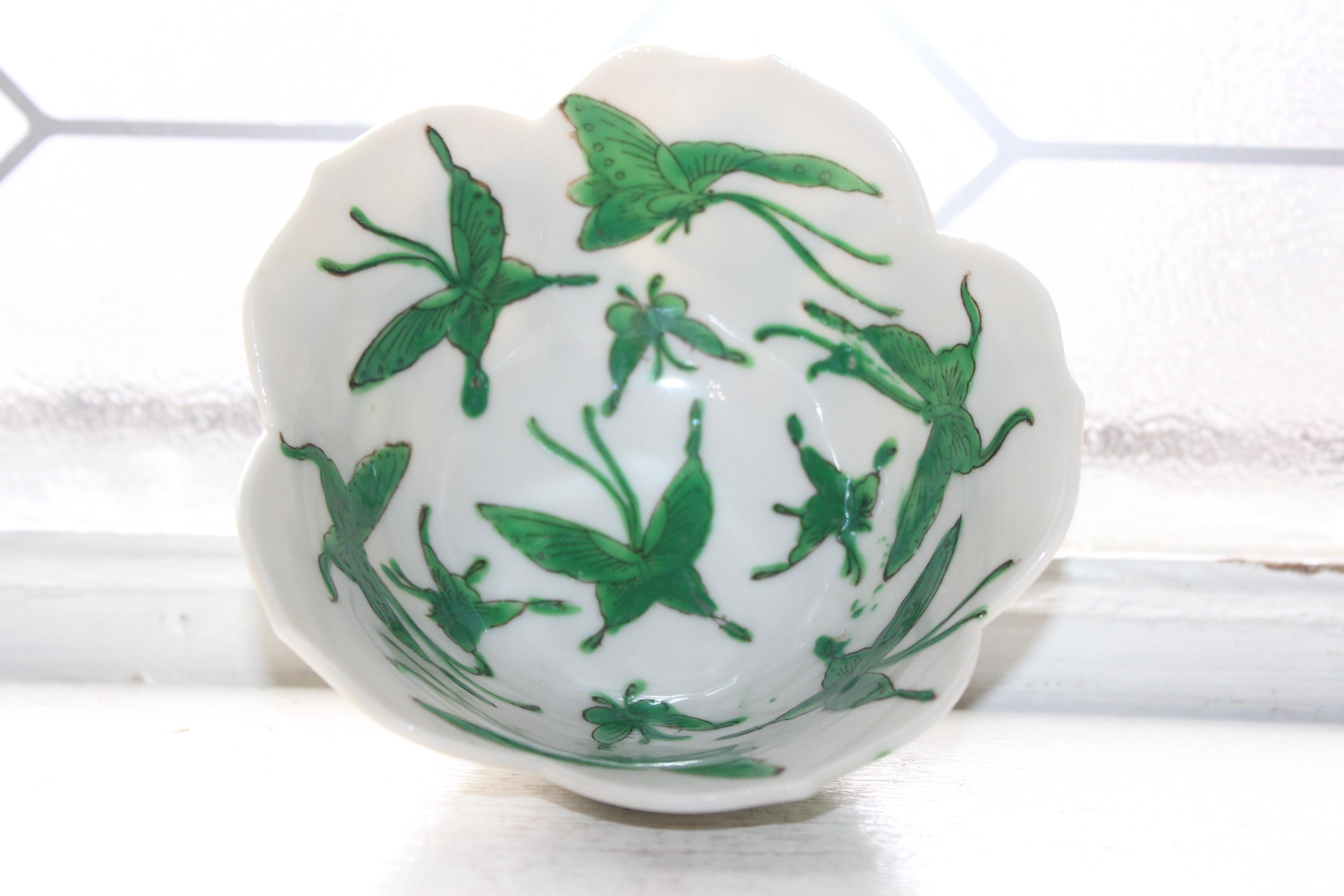 Vintage 1960s Chinese Yang Cheng porcelain lotus bowl featuring green butterflies on white, in very good condition. The bowl measures 4 3/8" in diameter and 2 1/4" high and has no chips or cracks. Enjoy!