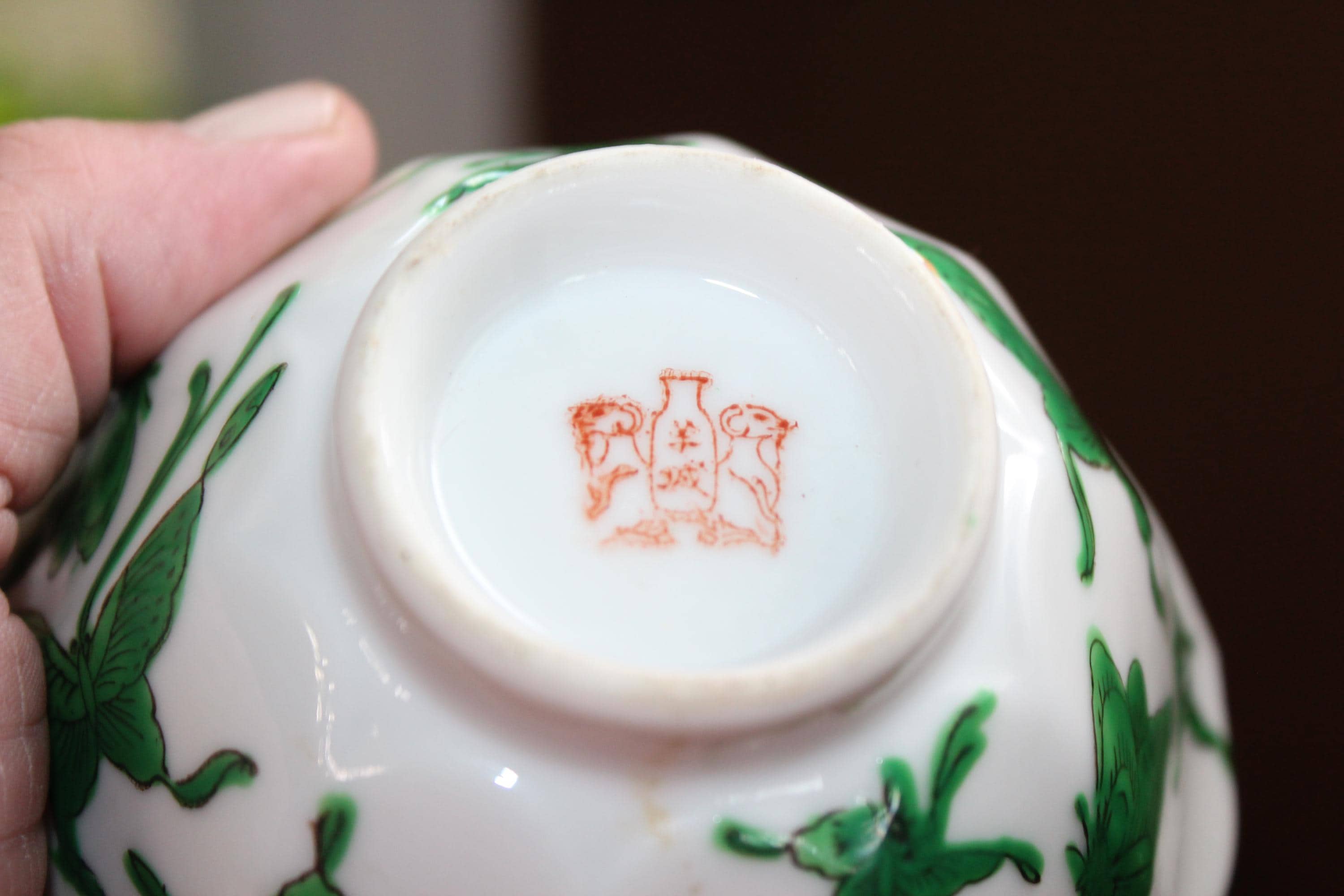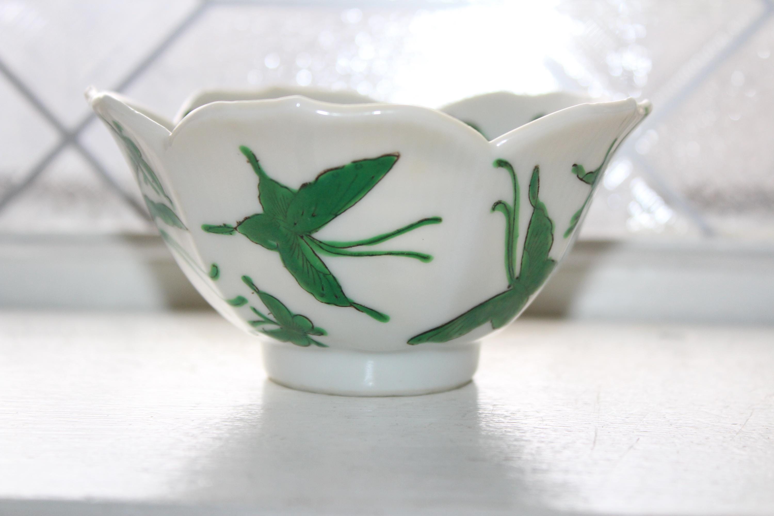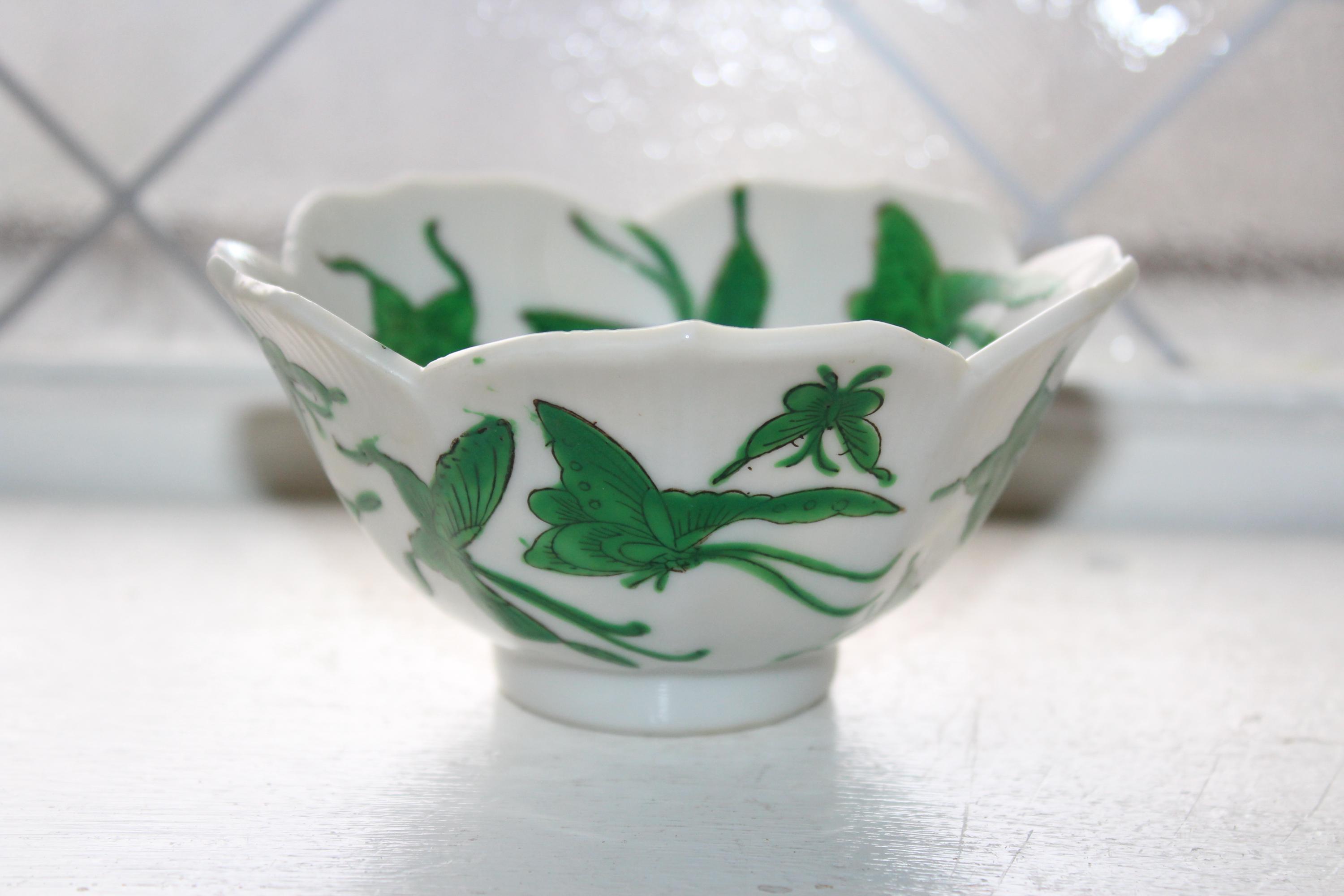 Vintage 1960s Chinese Yang Cheng porcelain lotus bowl featuring green butterflies on white, in very good condition. The bowl measures 4 3/8" in diameter and 2 1/4" high and has no chips or cracks. Enjoy!