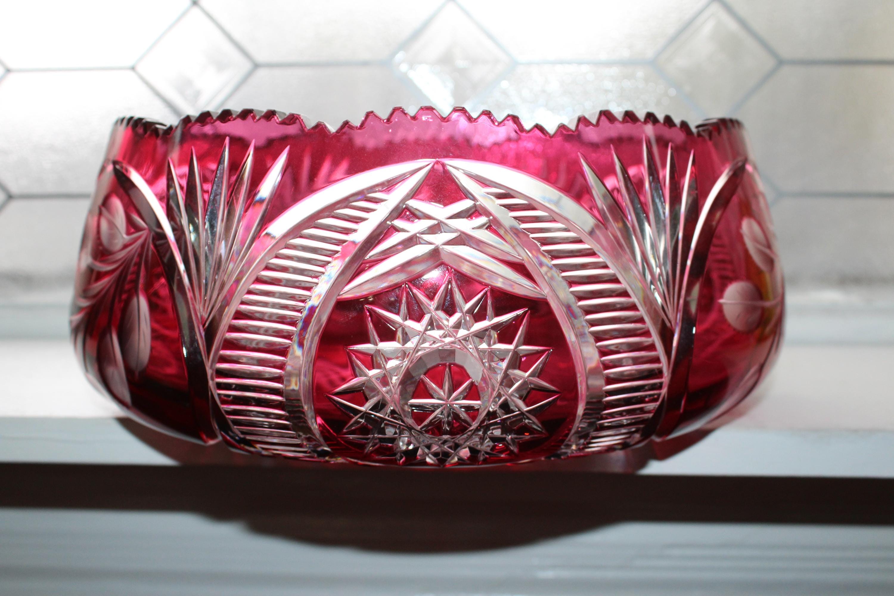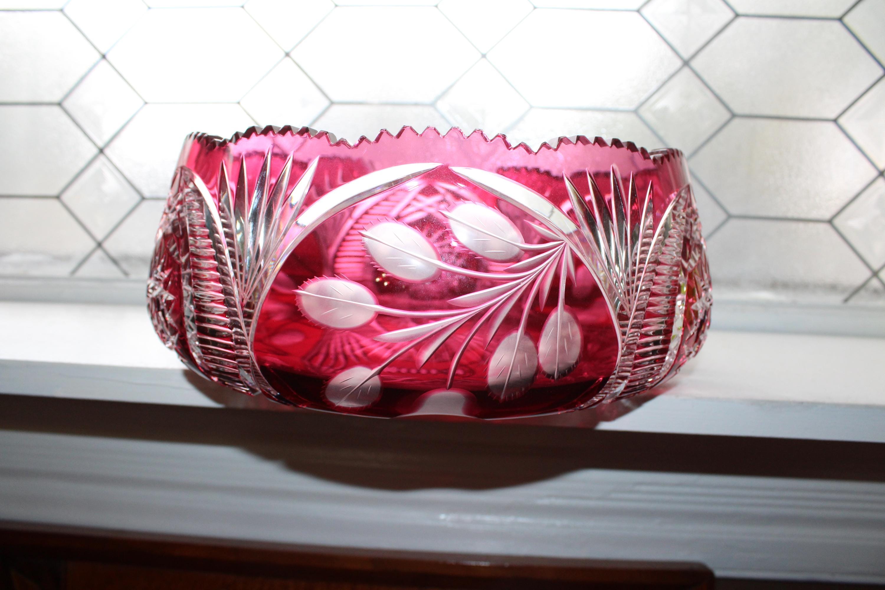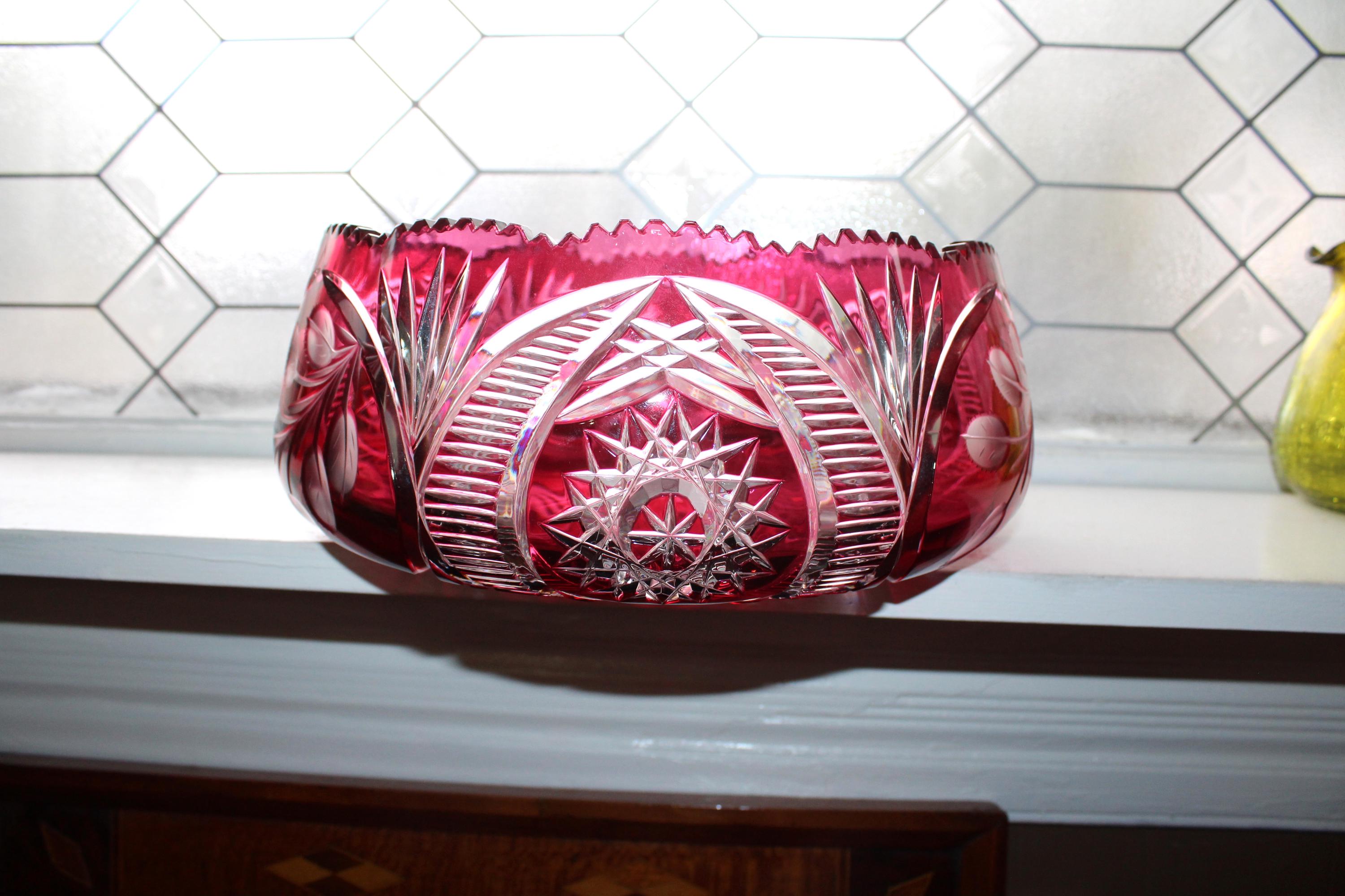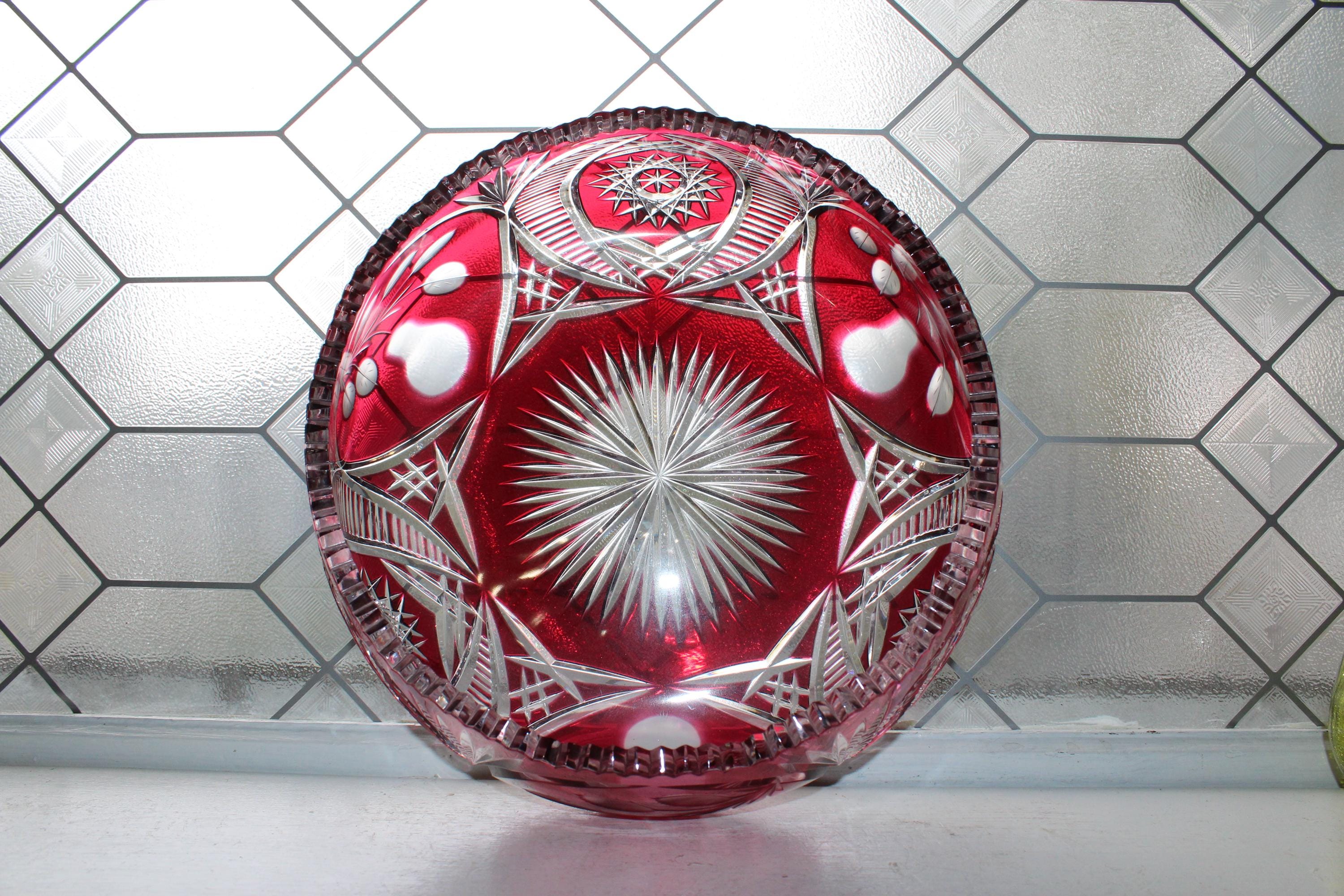 Large vintage brilliant ruby red cut to clear Bohemian glass centerpiece bowl, in excellent condition. This gorgeous bowl has no chips or cracks. It measures 12 3/8" at its widest x 4 1/2" high and weighs 8 1/2 lbs. Perfect for use or display, and certainly a show stopper. Exquisite, heavy, and balanced. Enjoy!
