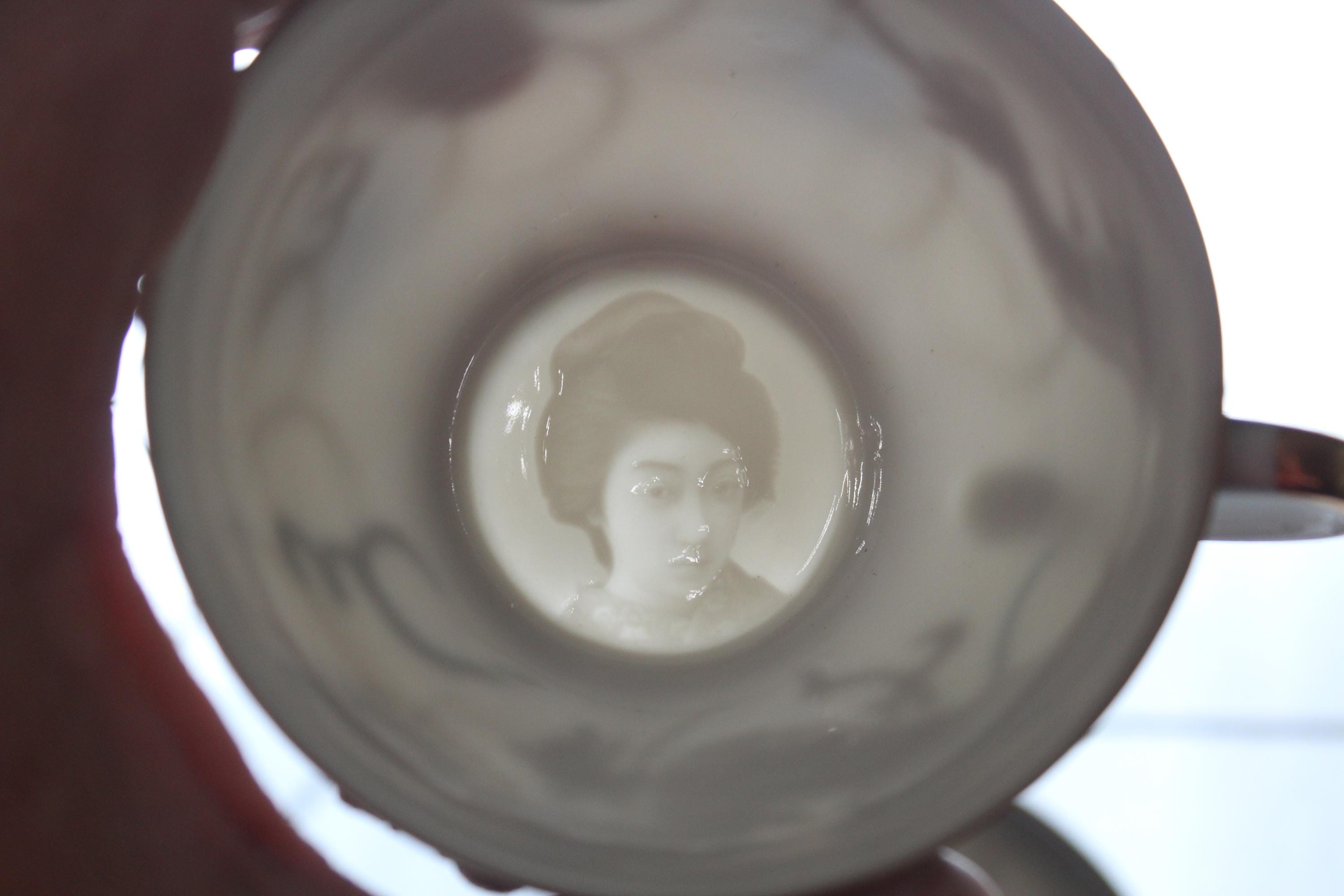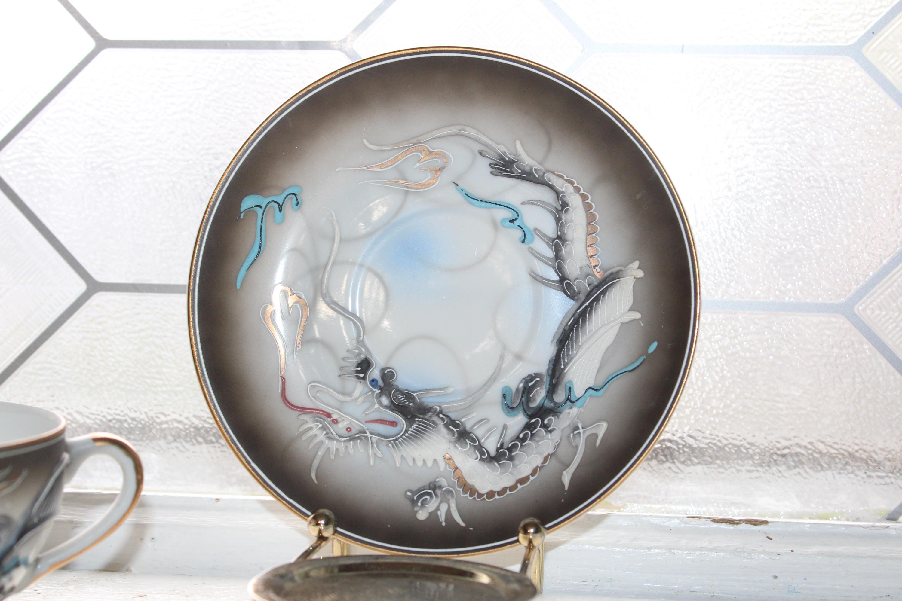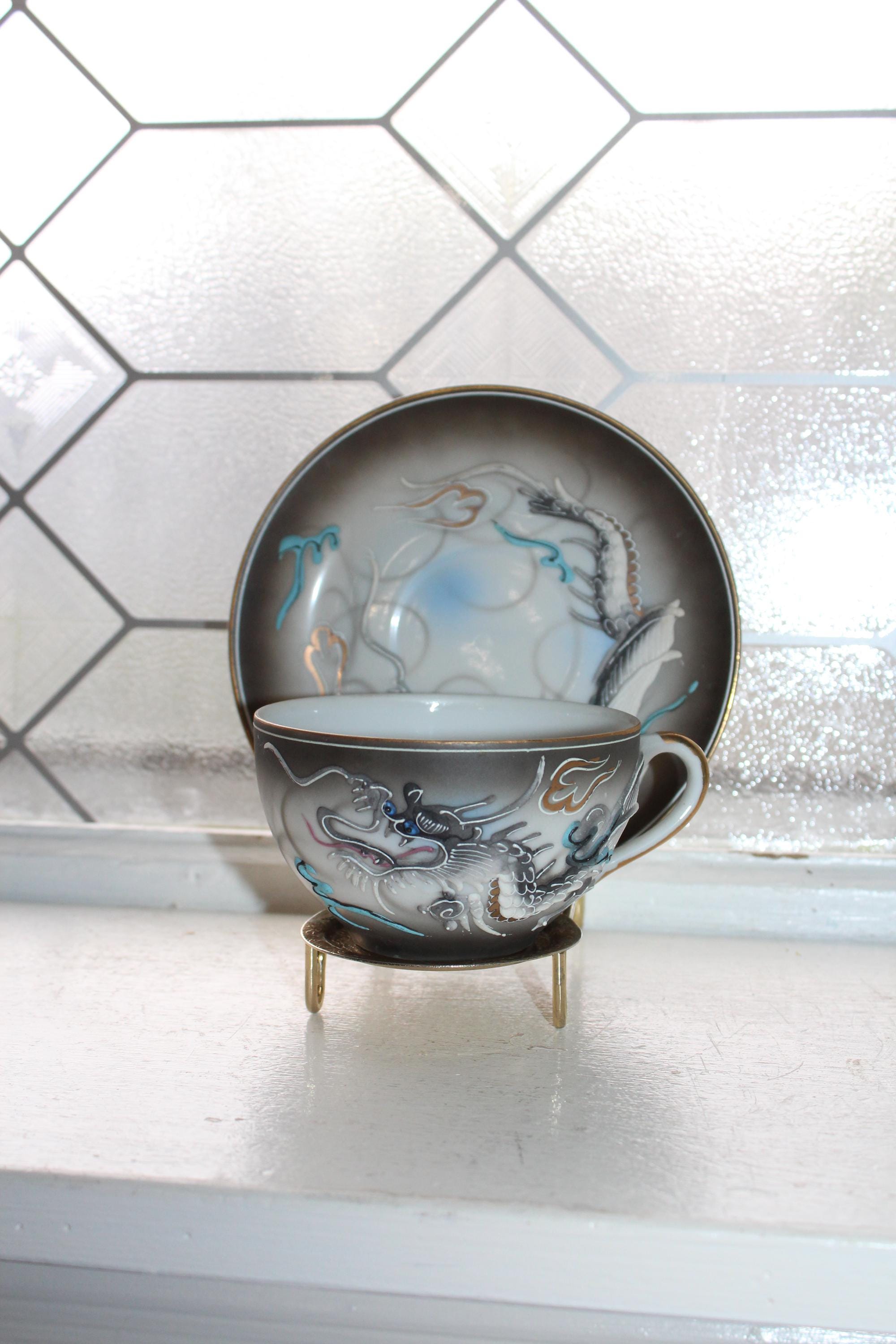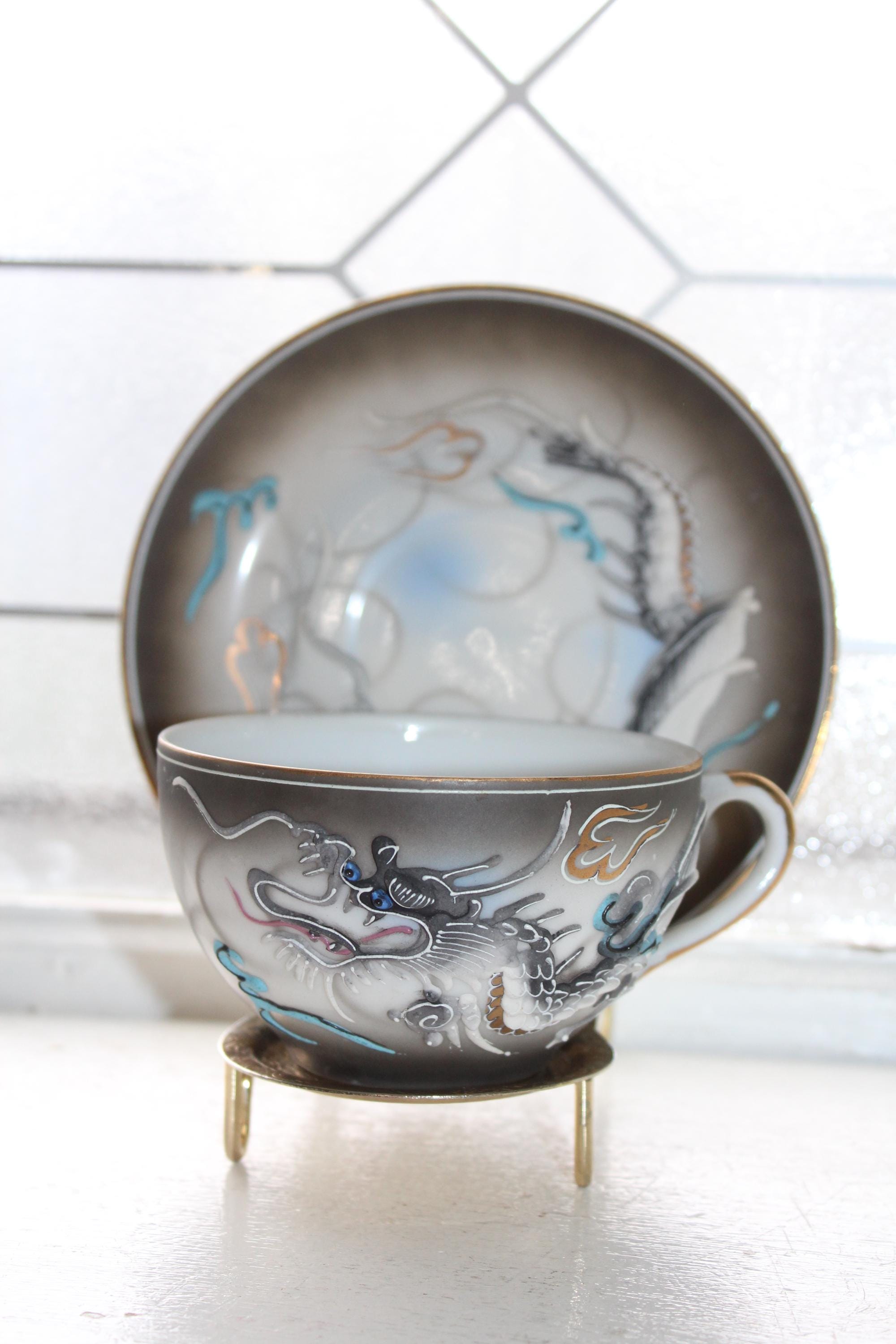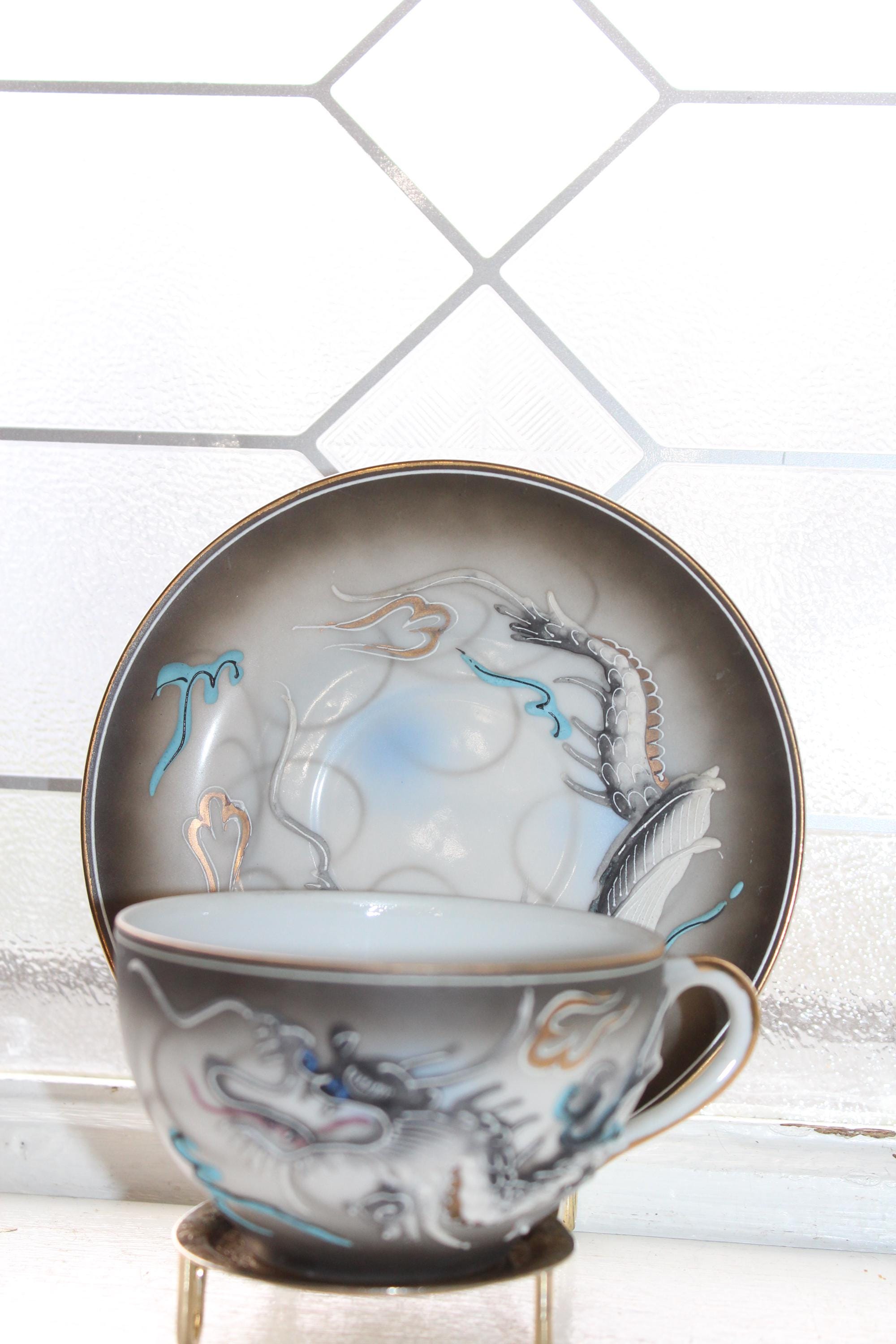 Vintage Japanese dragonware teacup and saucer with a Geisha bust lithophane in the bottom, in excellent condition. The cup measures 2 1/4" high x 3 3/4" wide and the saucer measures 5 1/2" across. No chips or cracks, perfect for use or display. Enjoy!