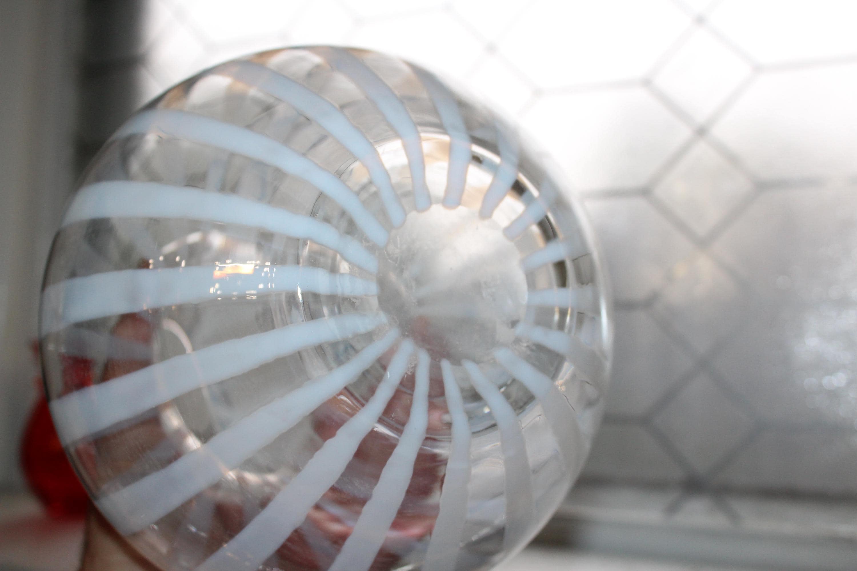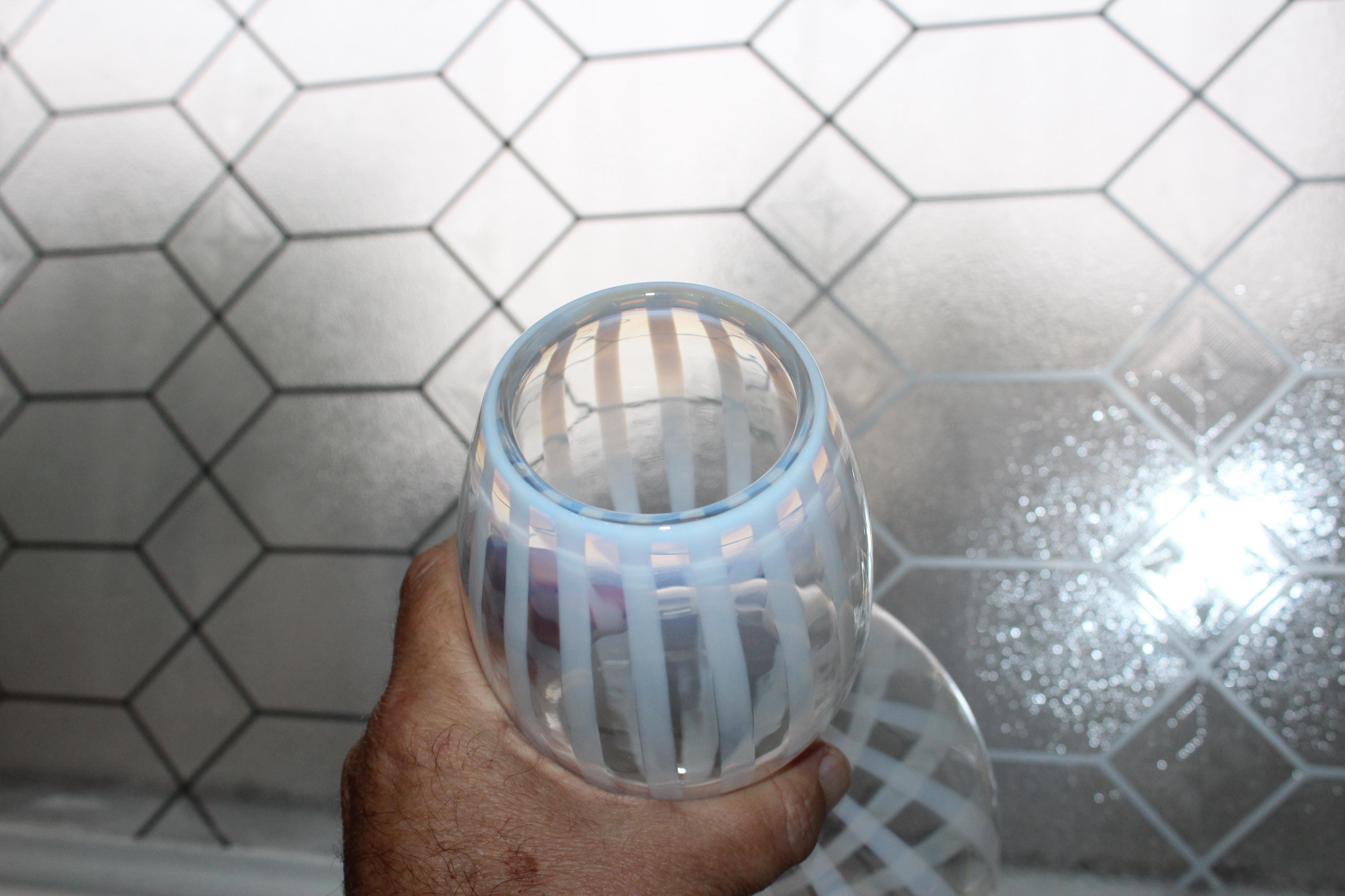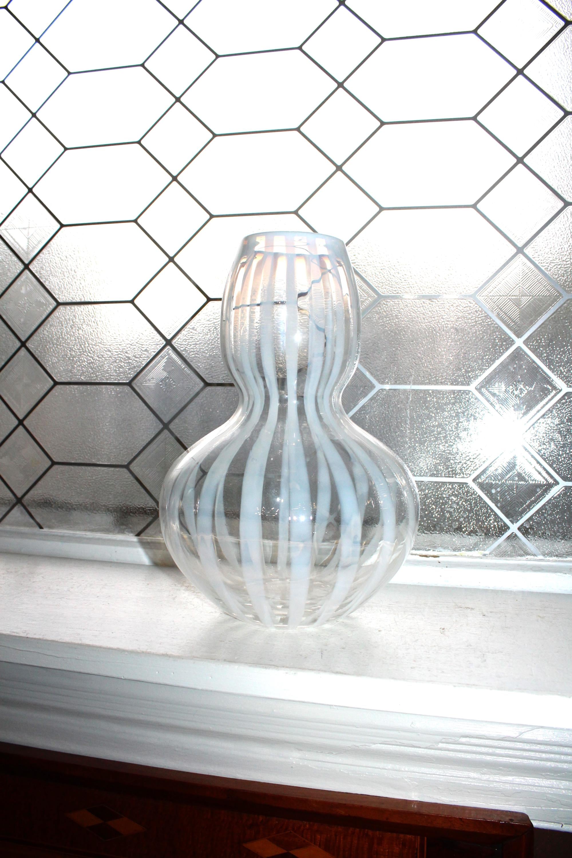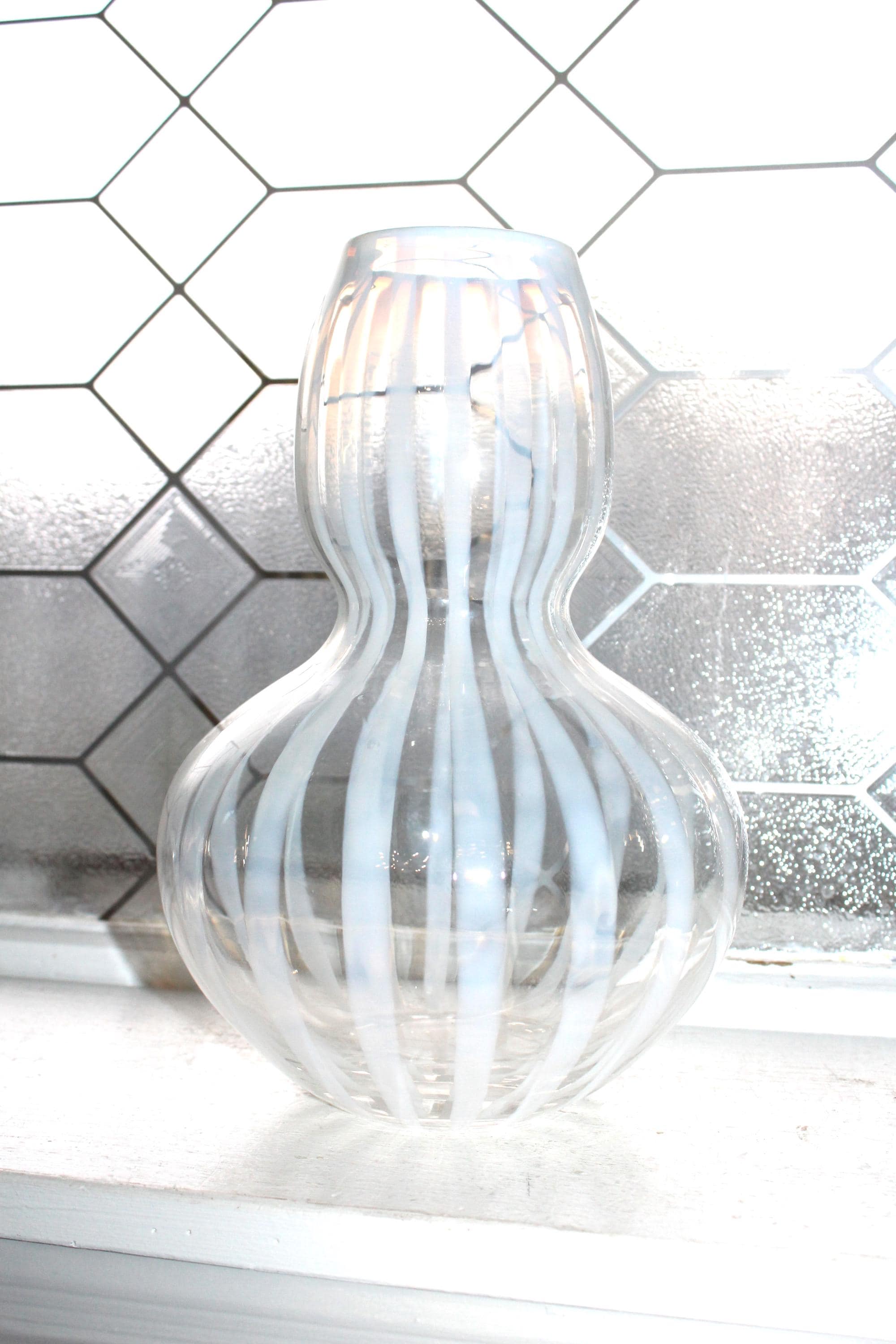 Large vintage Murano glass white striped vase with gour shape, in excellent condition. The vase measures 10" high and weighs 1 3/4 lbs. The top opening is 2 3/4" wide. No chips or cracks, perfect for use or display in a retro home. Enjoy!
