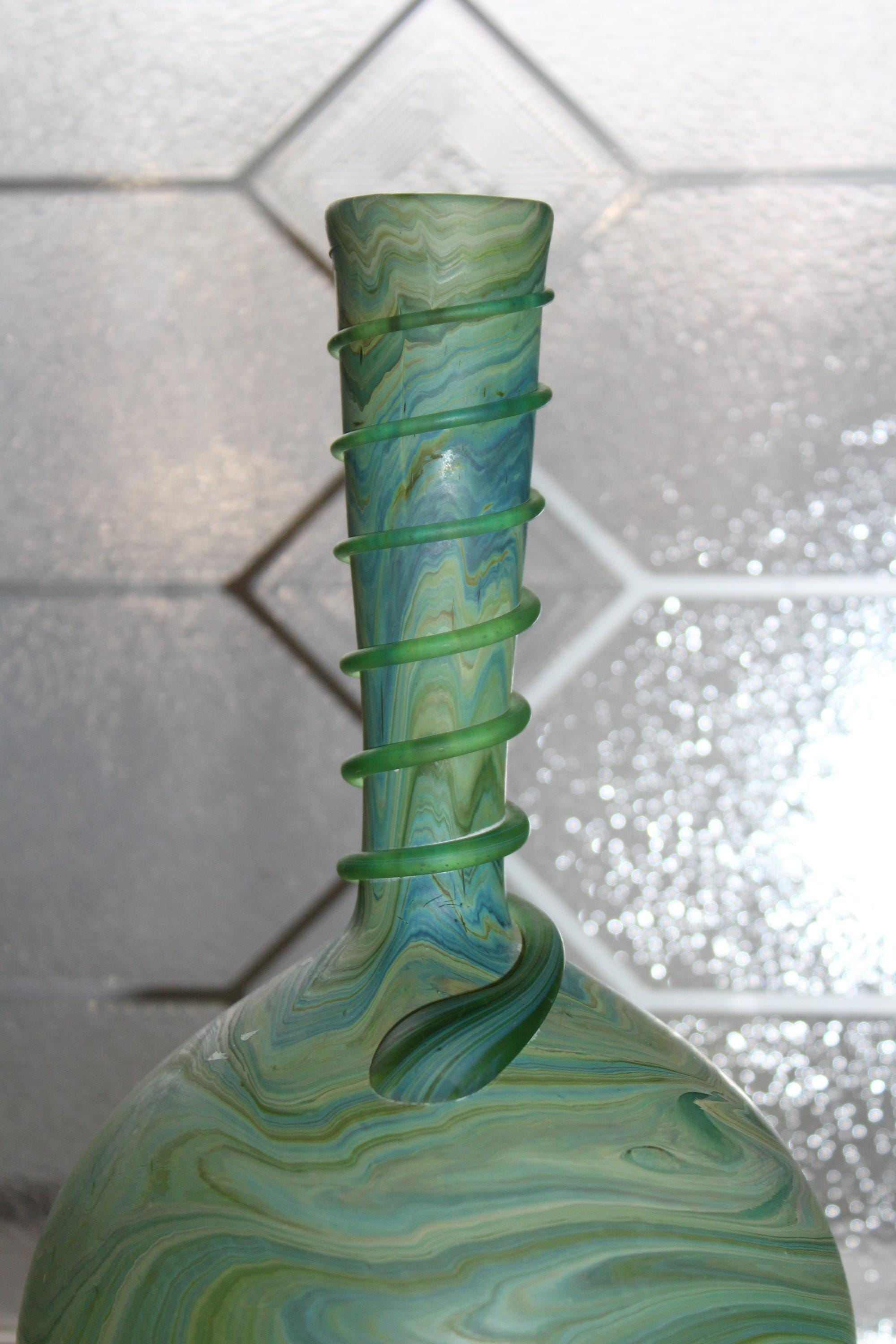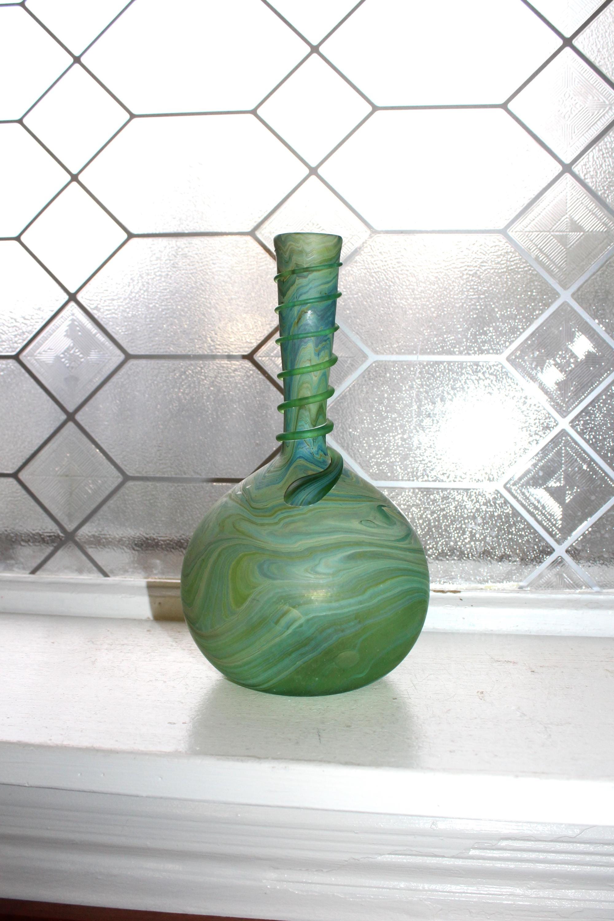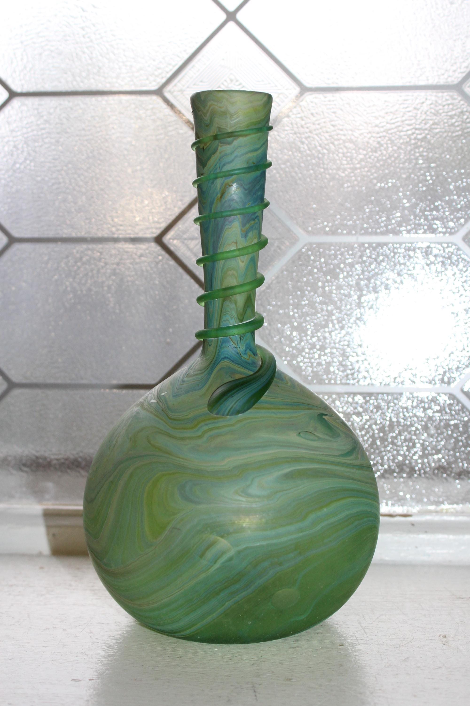 This is a fabulous handmade studio art glass matte finish bud vase, featuring green swirls and spiral thread. It measures 8 1/4" high. I see no maker's mark. No chips or cracks, excellent condition and perfect for use or display. Enjoy!