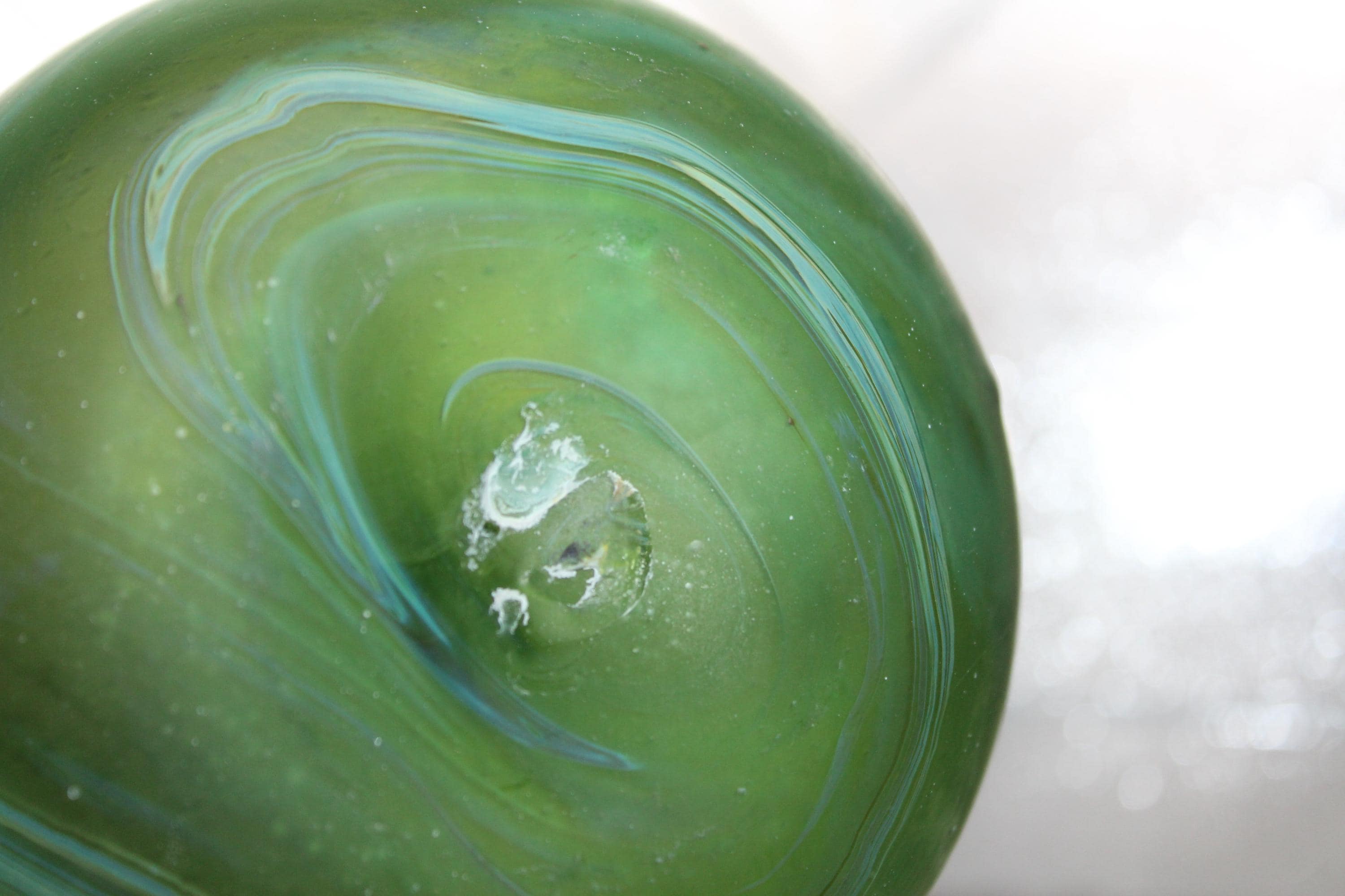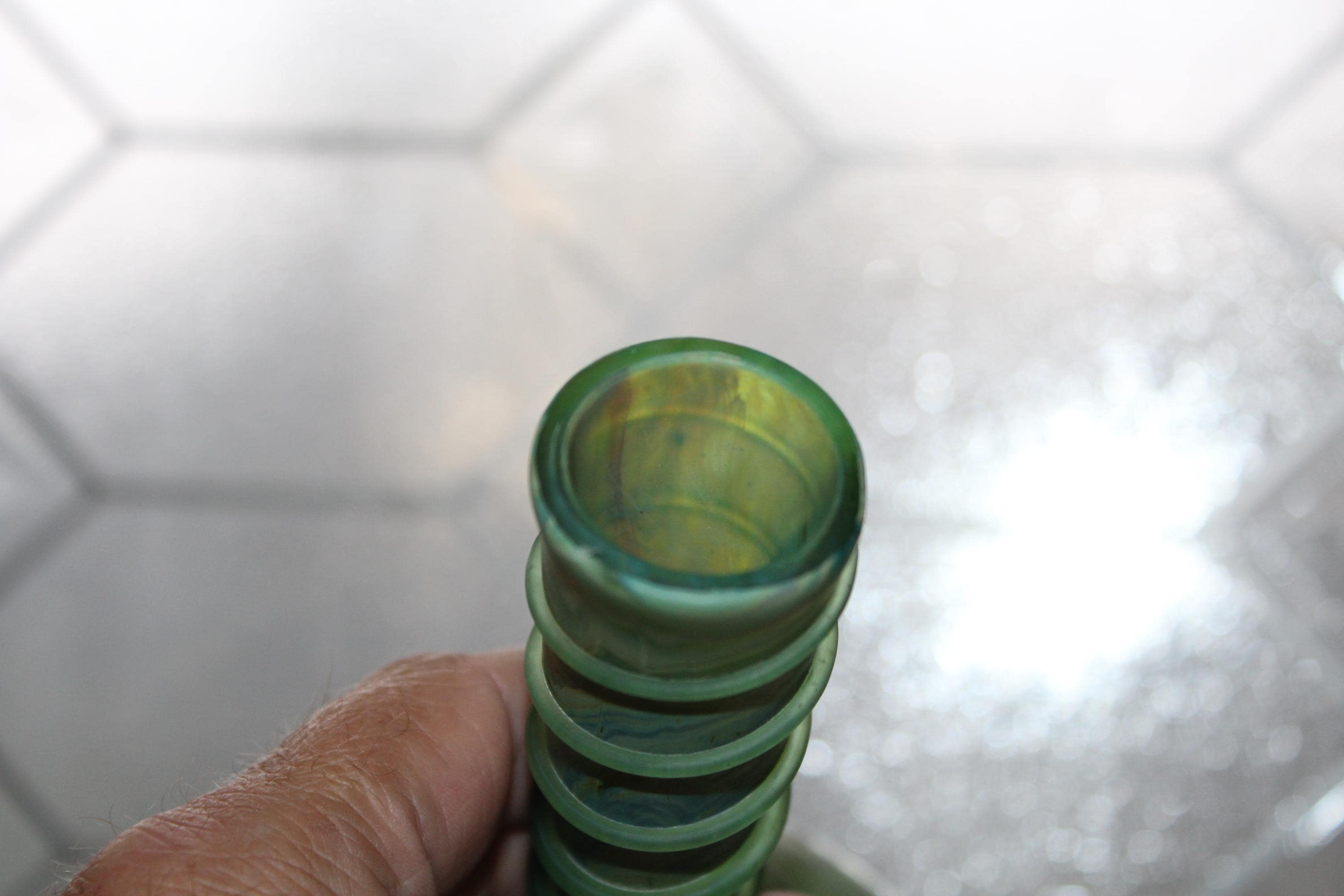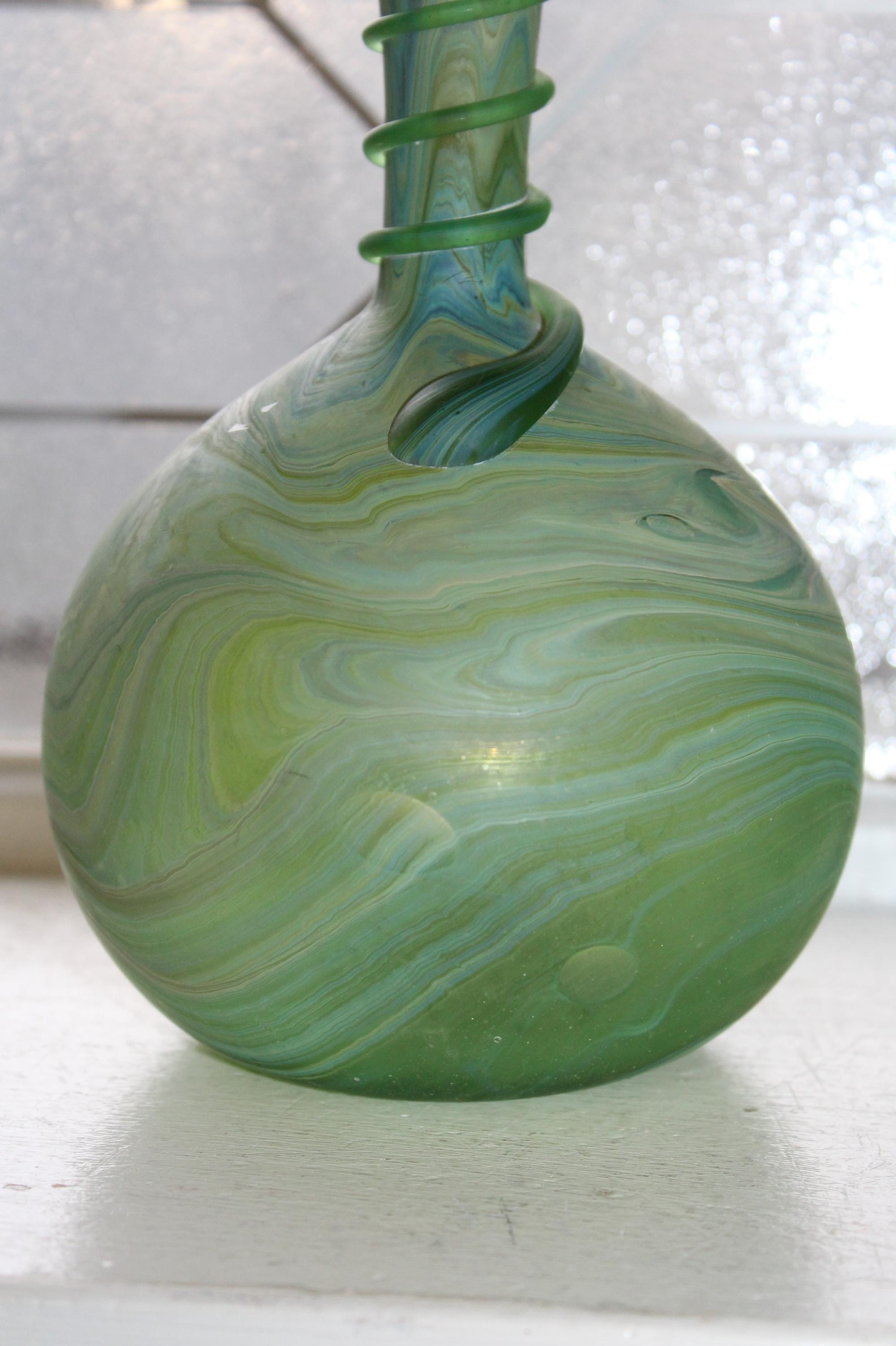 This is a fabulous handmade studio art glass matte finish bud vase, featuring green swirls and spiral thread. It measures 8 1/4" high. I see no maker's mark. No chips or cracks, excellent condition and perfect for use or display. Enjoy!