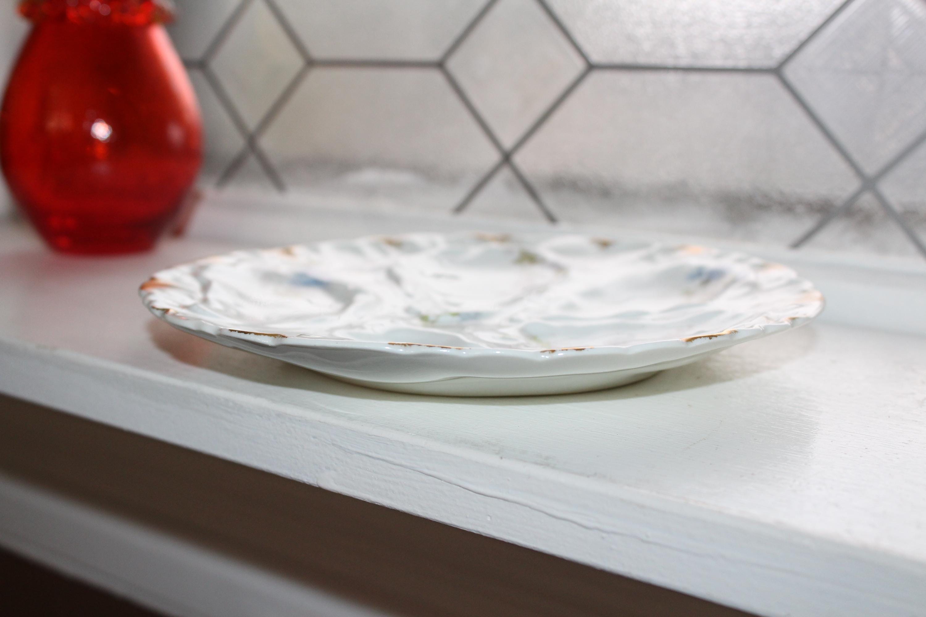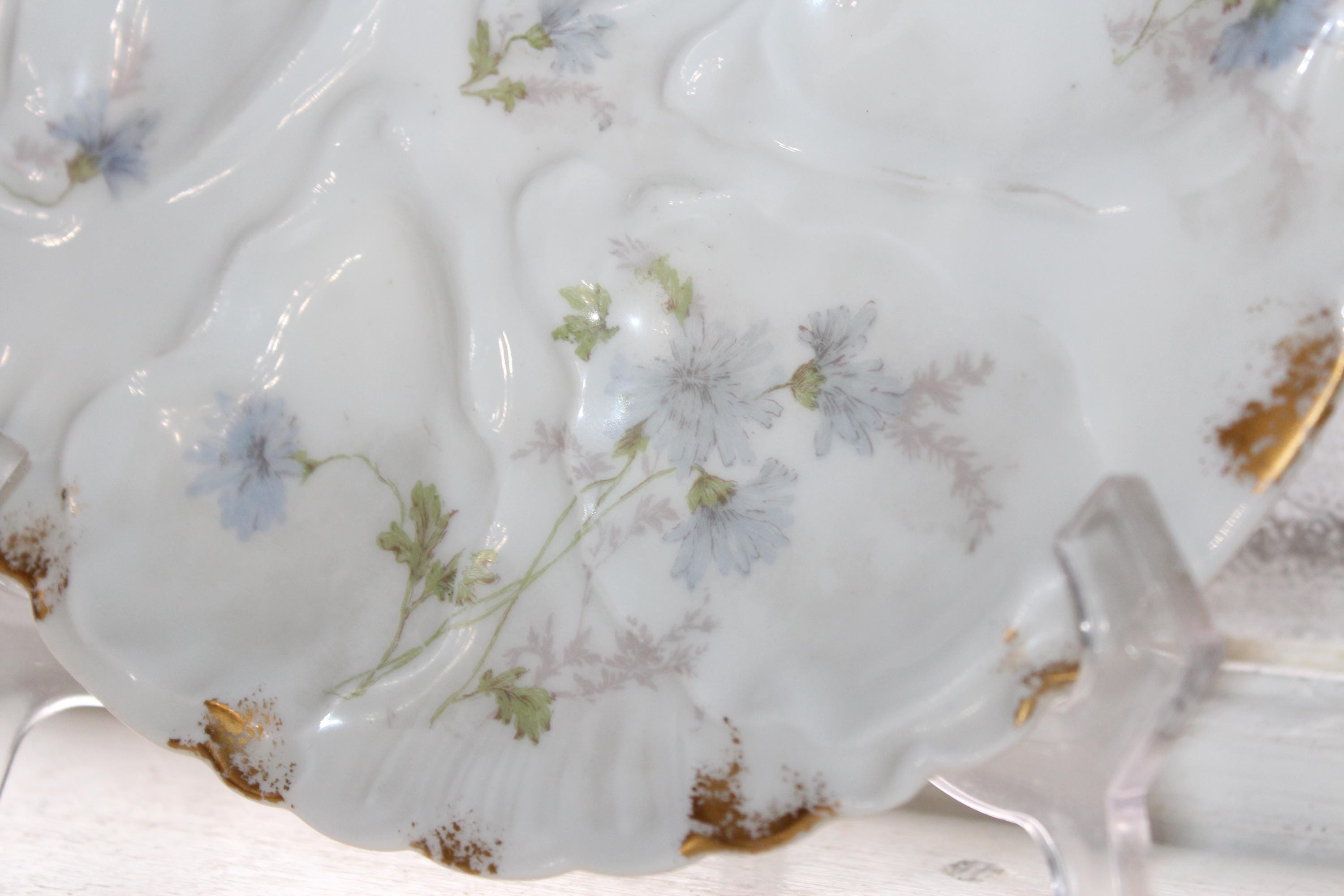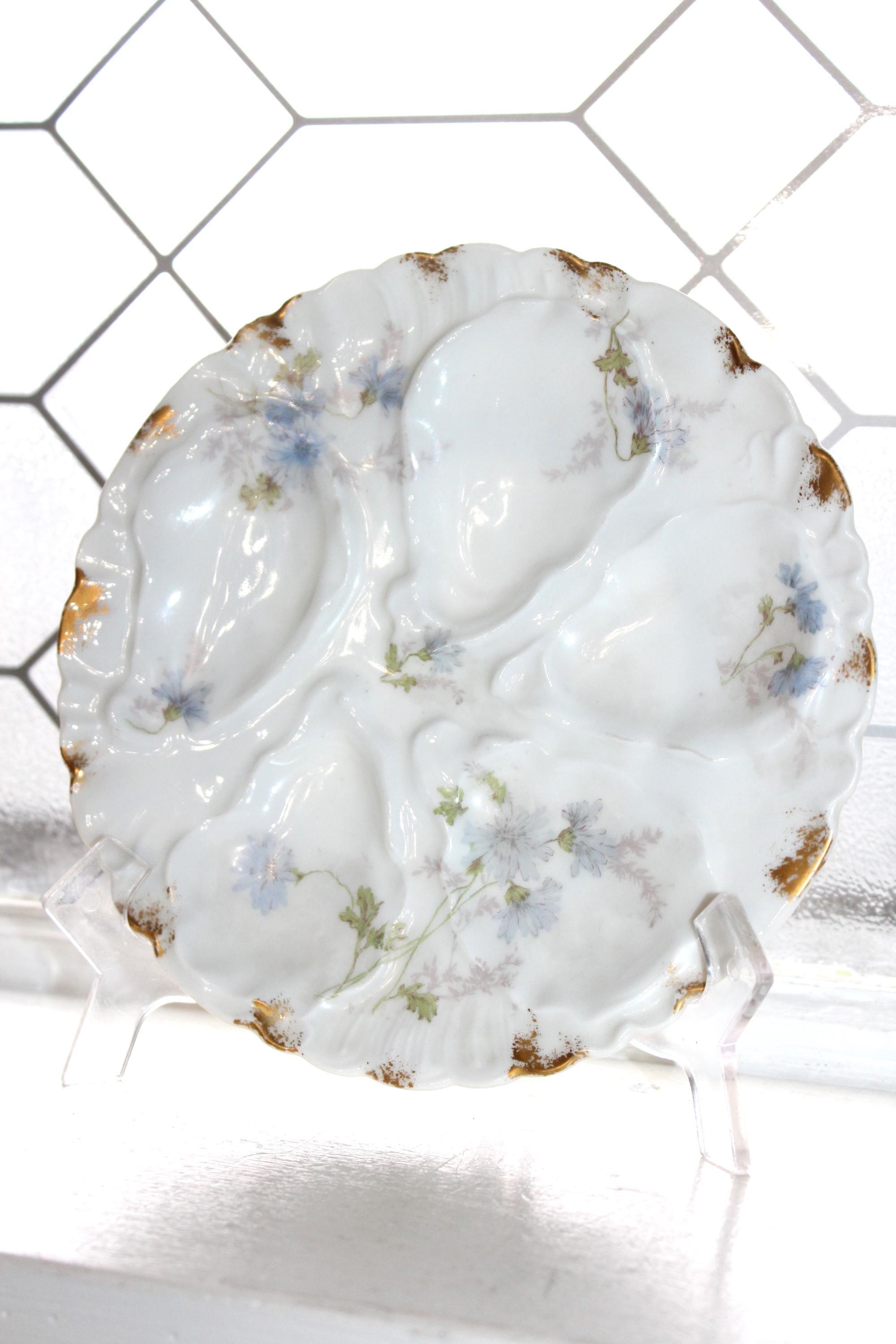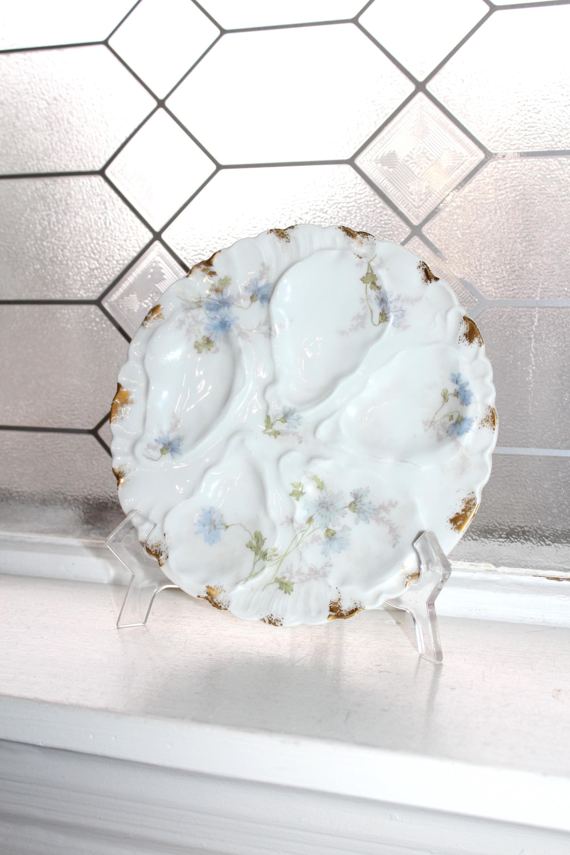 Antique Charles Field Haviland CFH GDM Limoges oyster plate, in excellent condition. It features delicate blue flowers with foliage and is just gorgeous! The plate measures 7 1/2" wide. No chips or cracks, perfect for use or display. Enjoy!