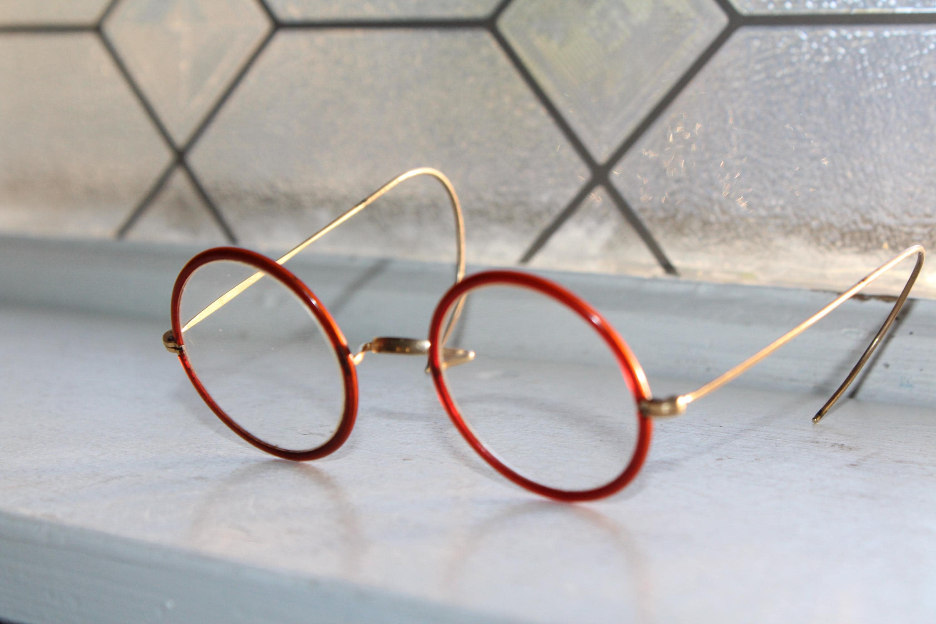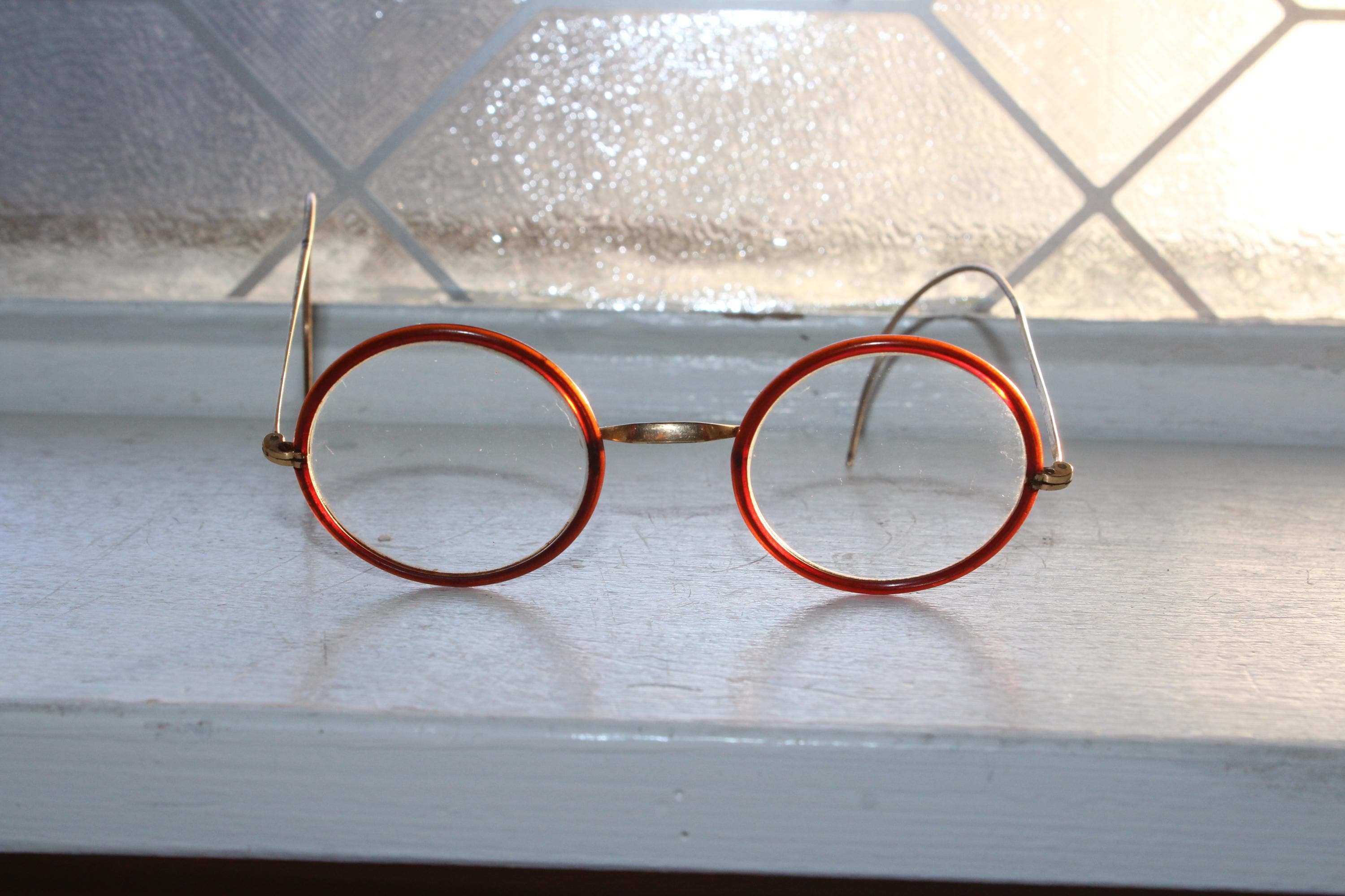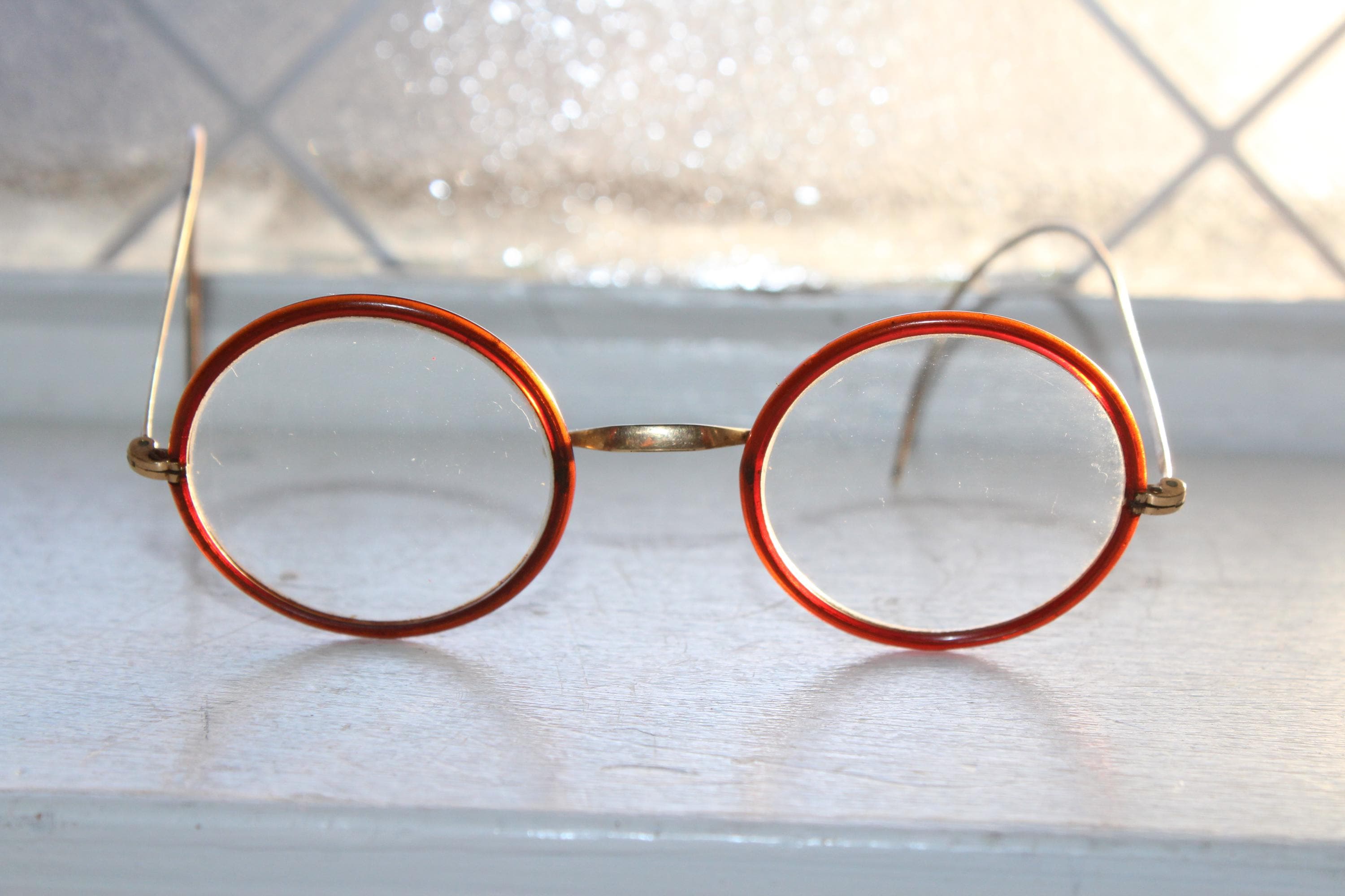 Antique Harry Potter style Windsor eyeglasses featuring brown rims, with gold colored frames. They are marked on the bridge but I can't read it. Great for use or display. They measure 4 3/4" across the front and 4 1/8" front to back. Each lens measures 1 5/8" wide. Enjoy!