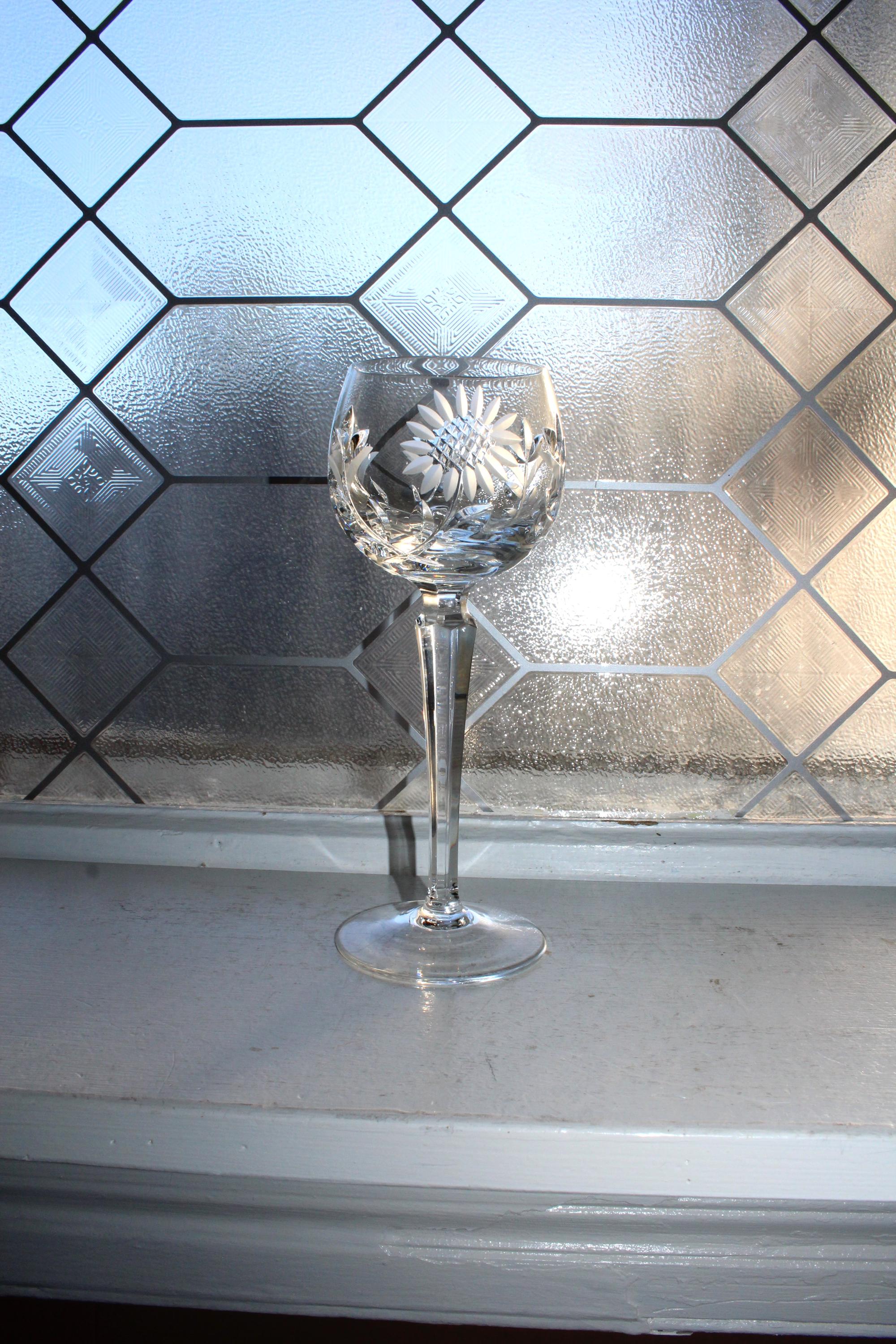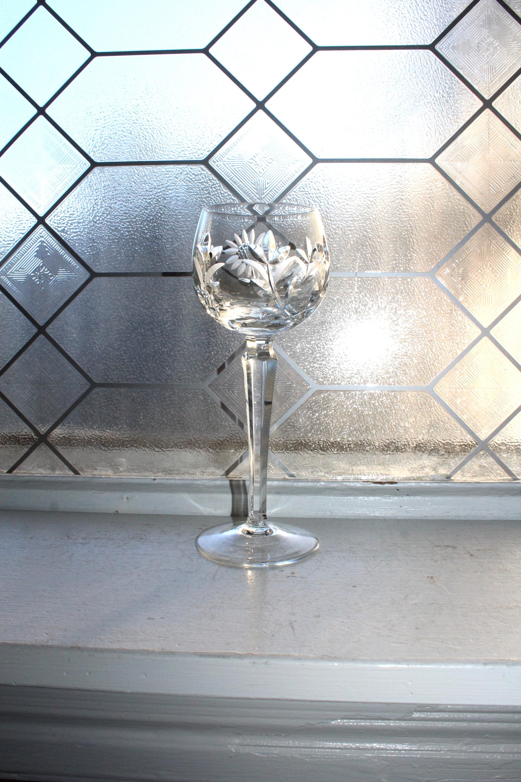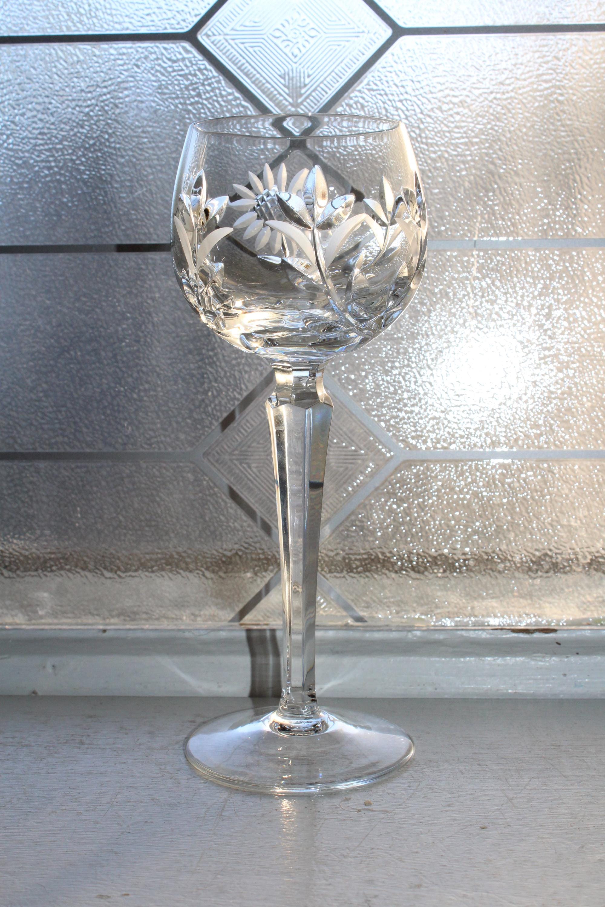 Vintage Margaret by Lausitzer cut crystal hock wine glass, in excellent condition. It measures 7 1/2" high and features a sun flower. No damage, ready to use and appreciate. Enjoy!