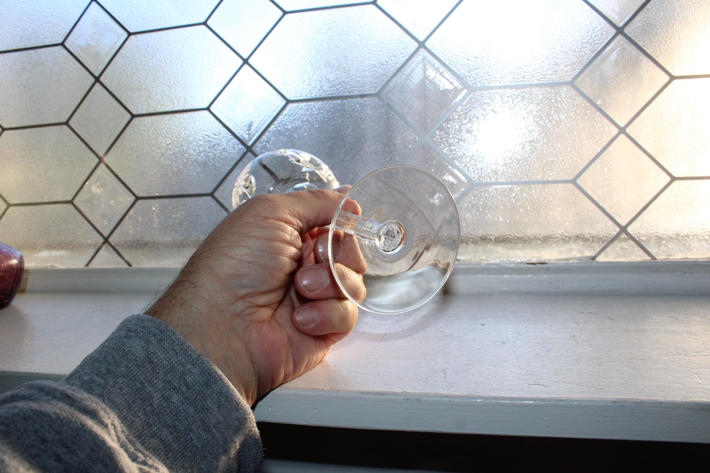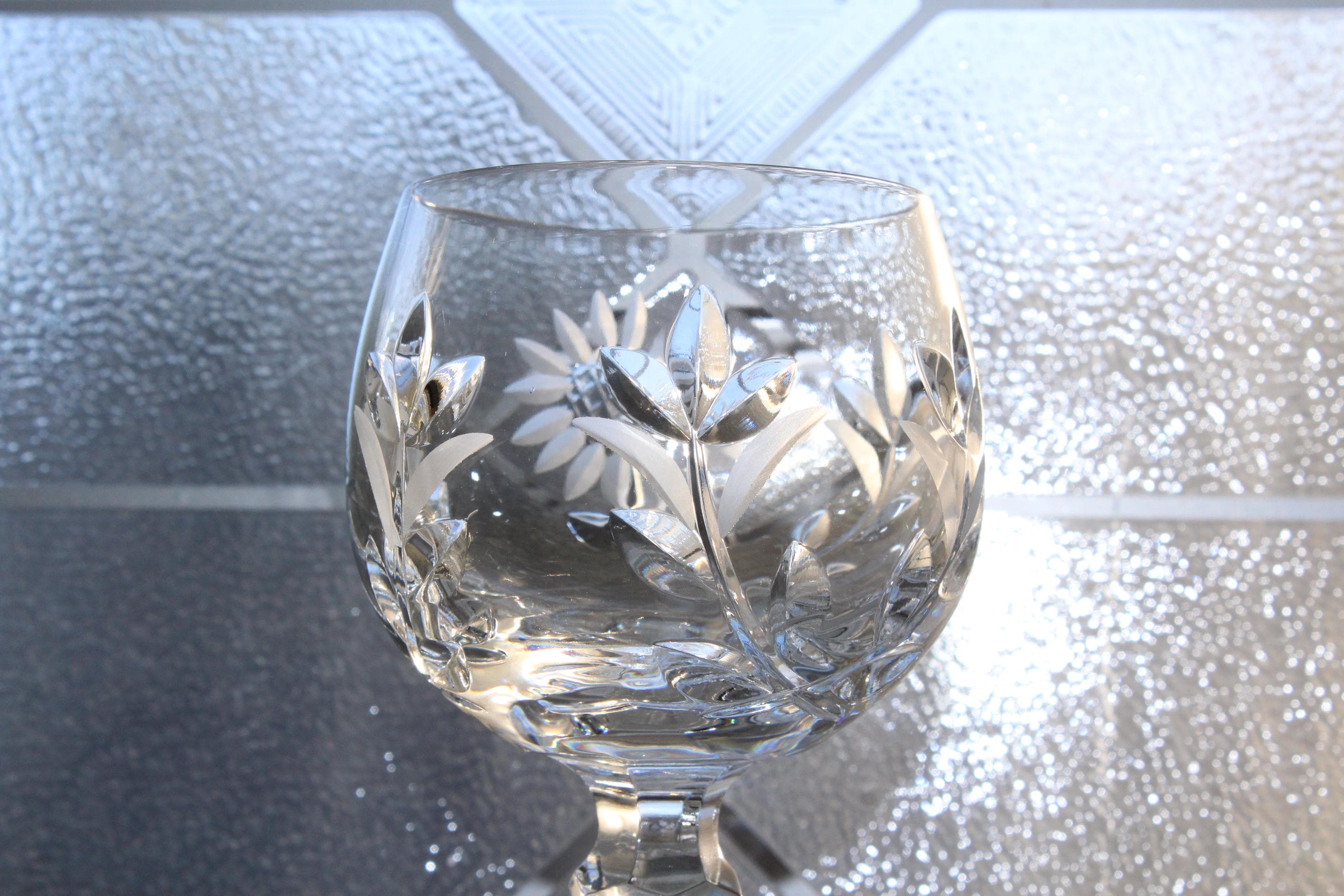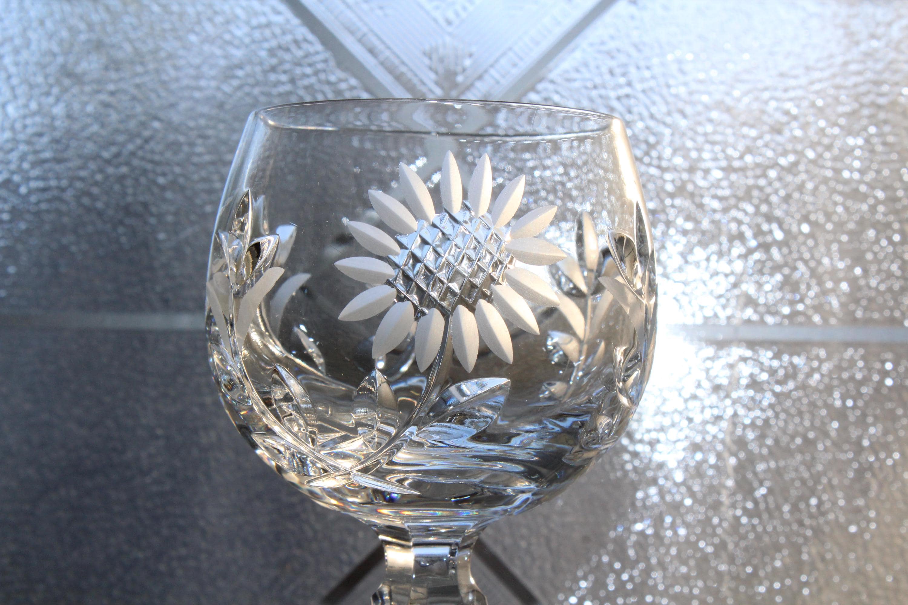 Vintage Margaret by Lausitzer cut crystal hock wine glass, in excellent condition. It measures 7 1/2" high and features a sun flower. No damage, ready to use and appreciate. Enjoy!