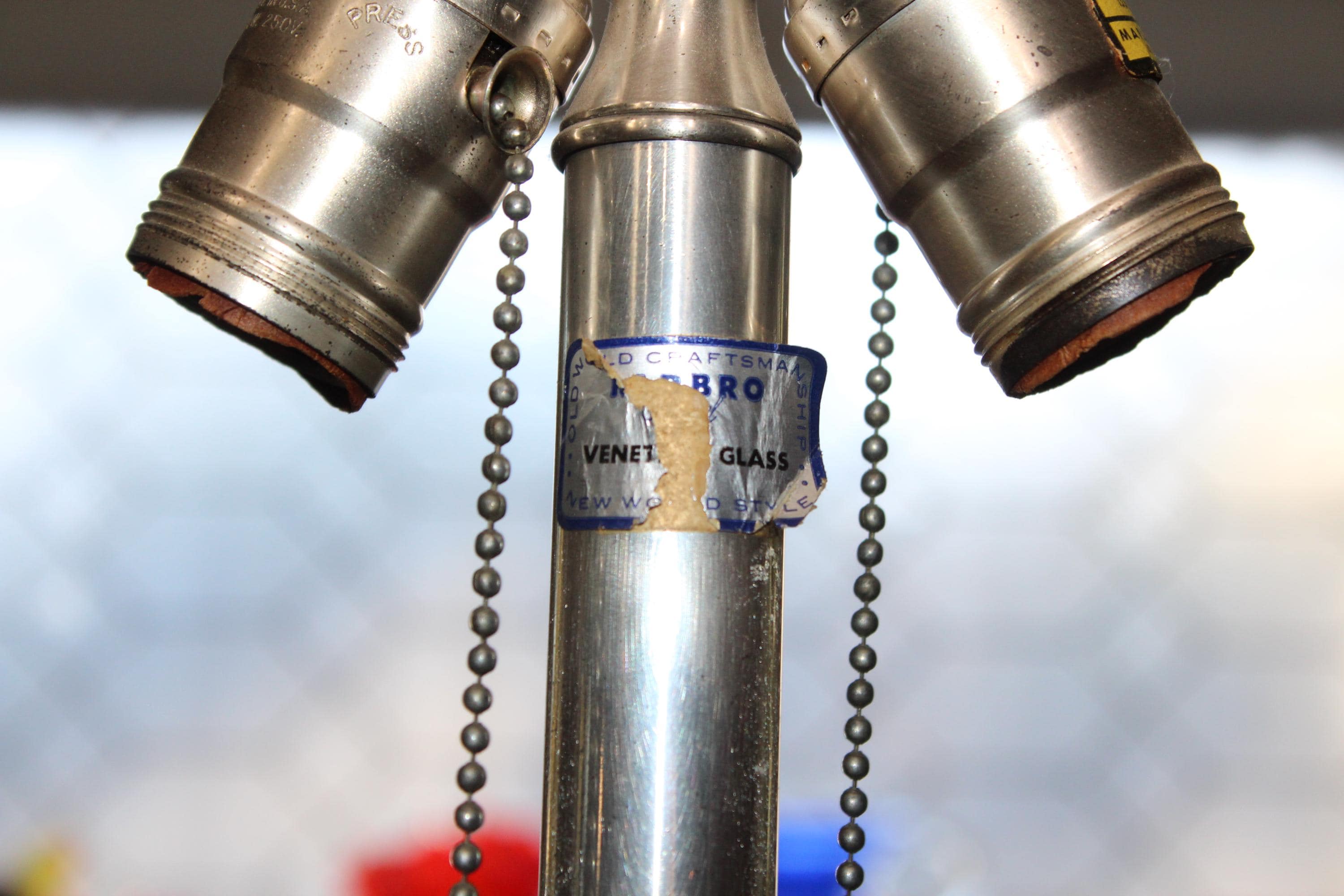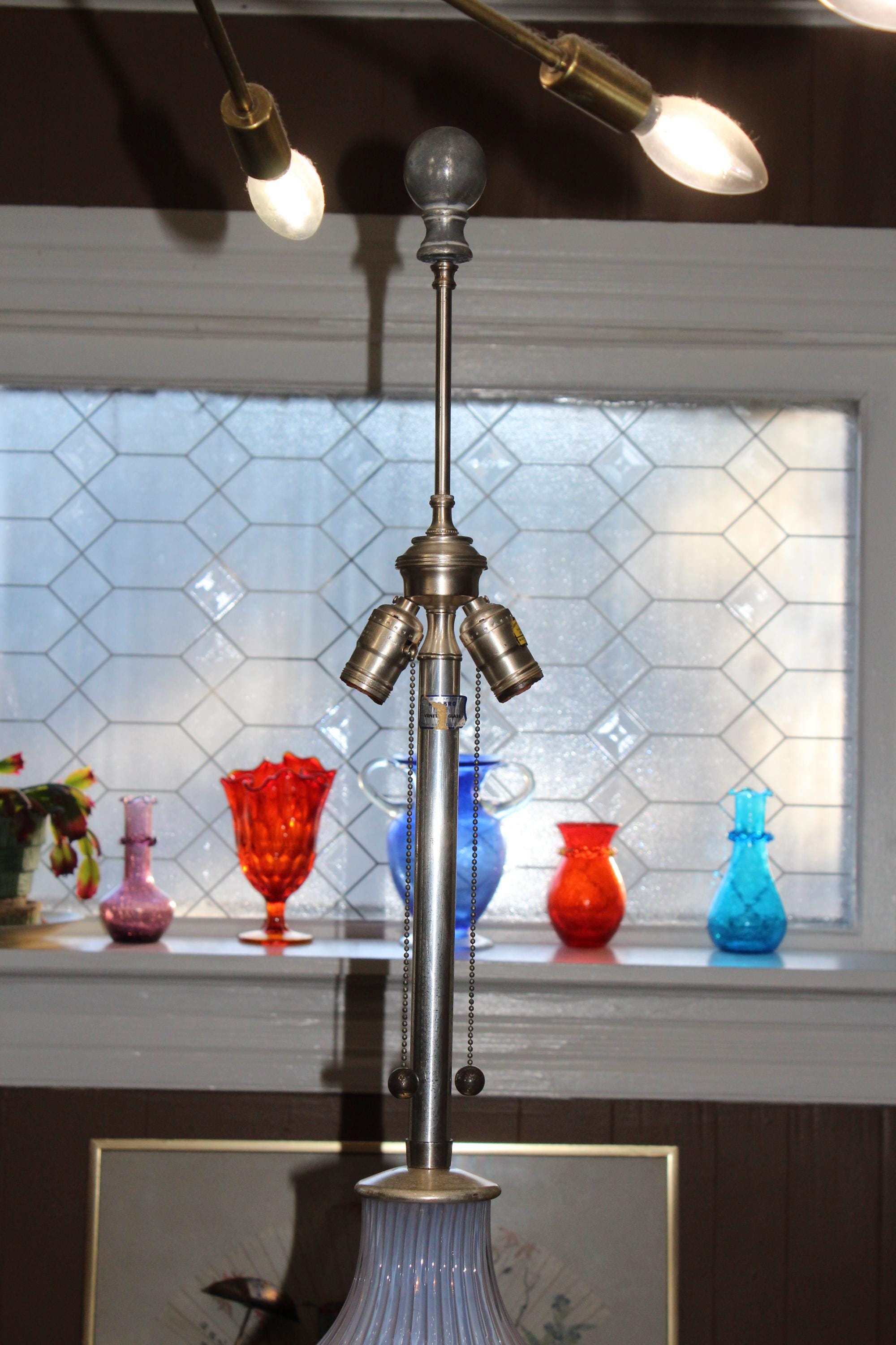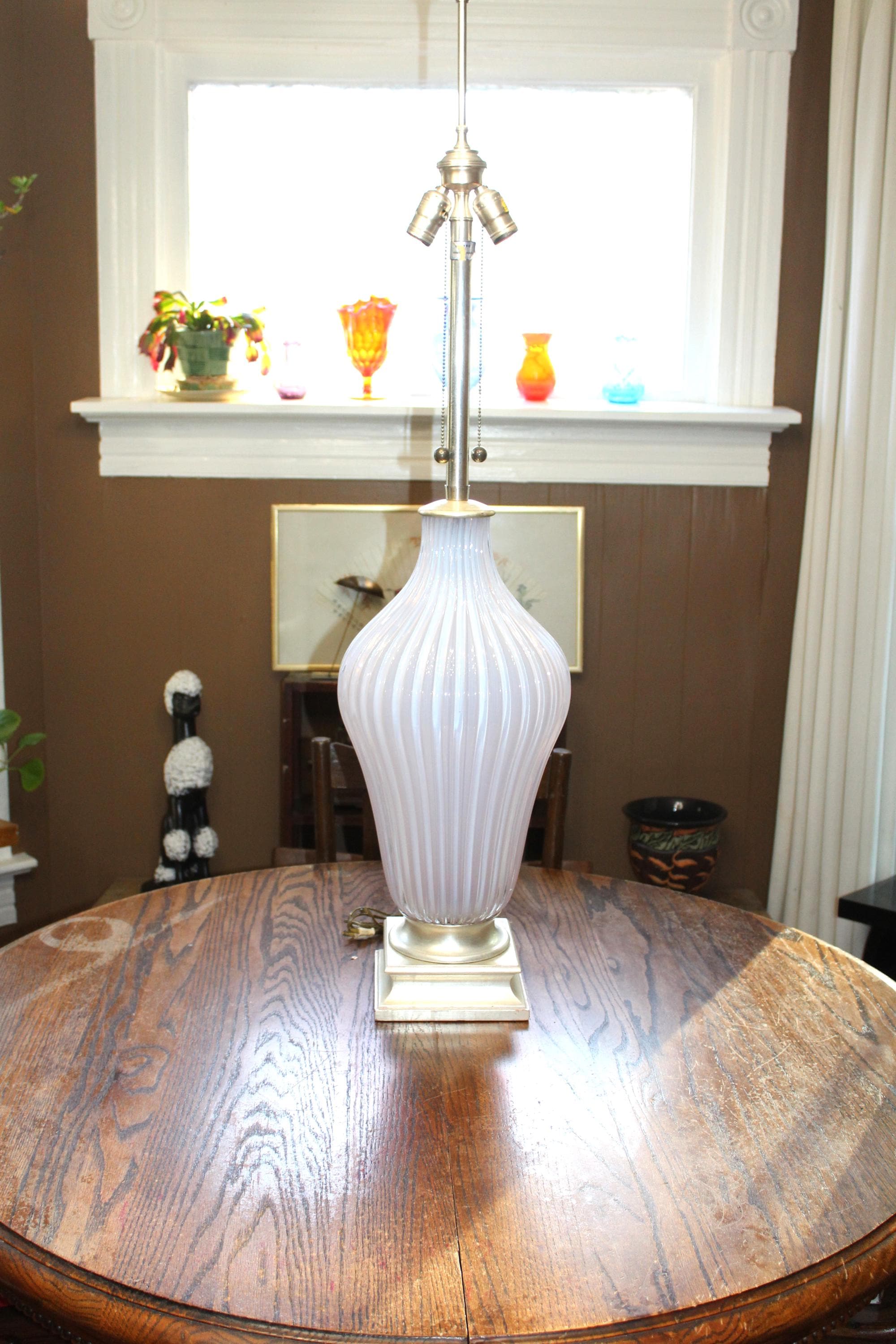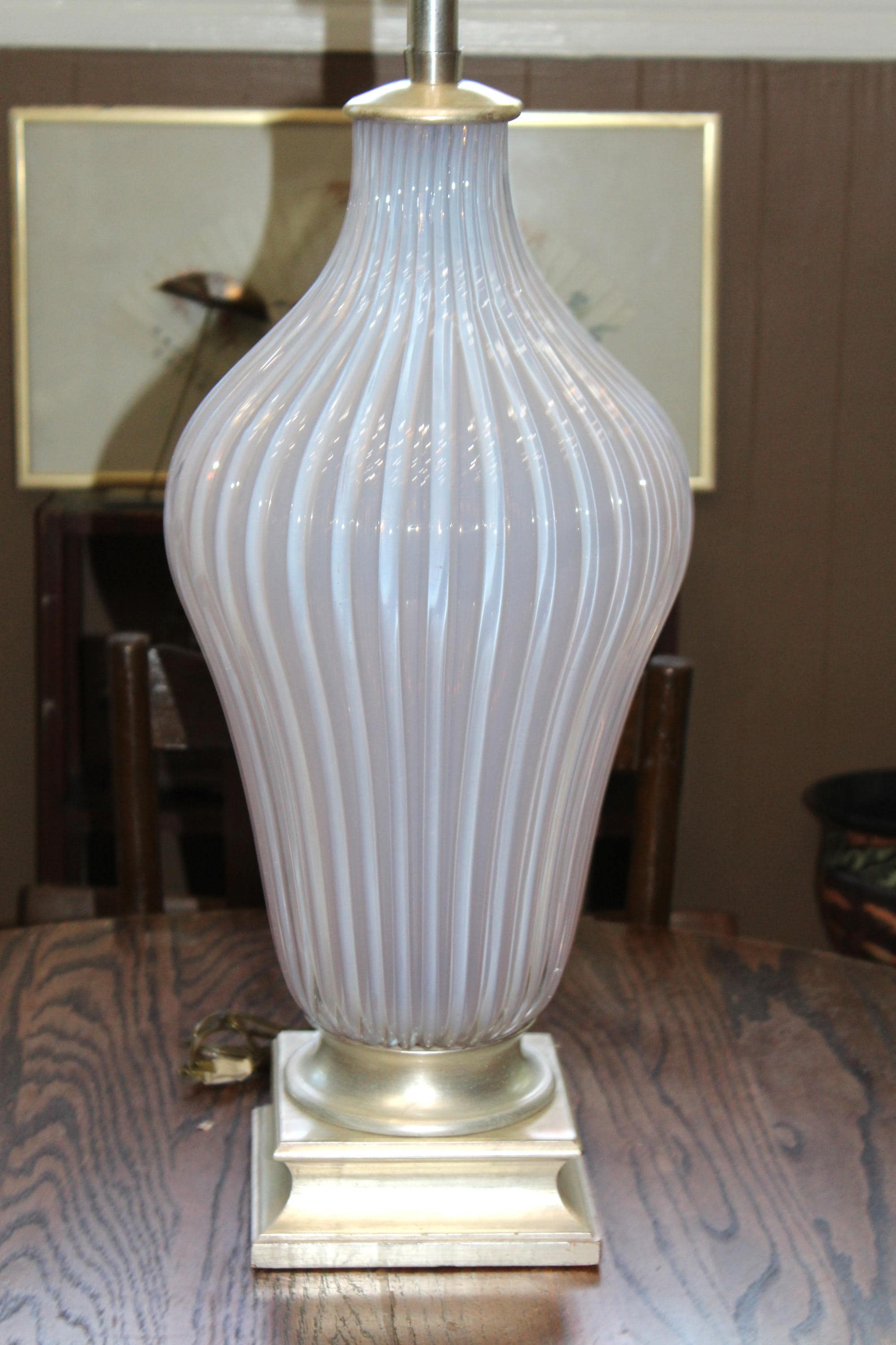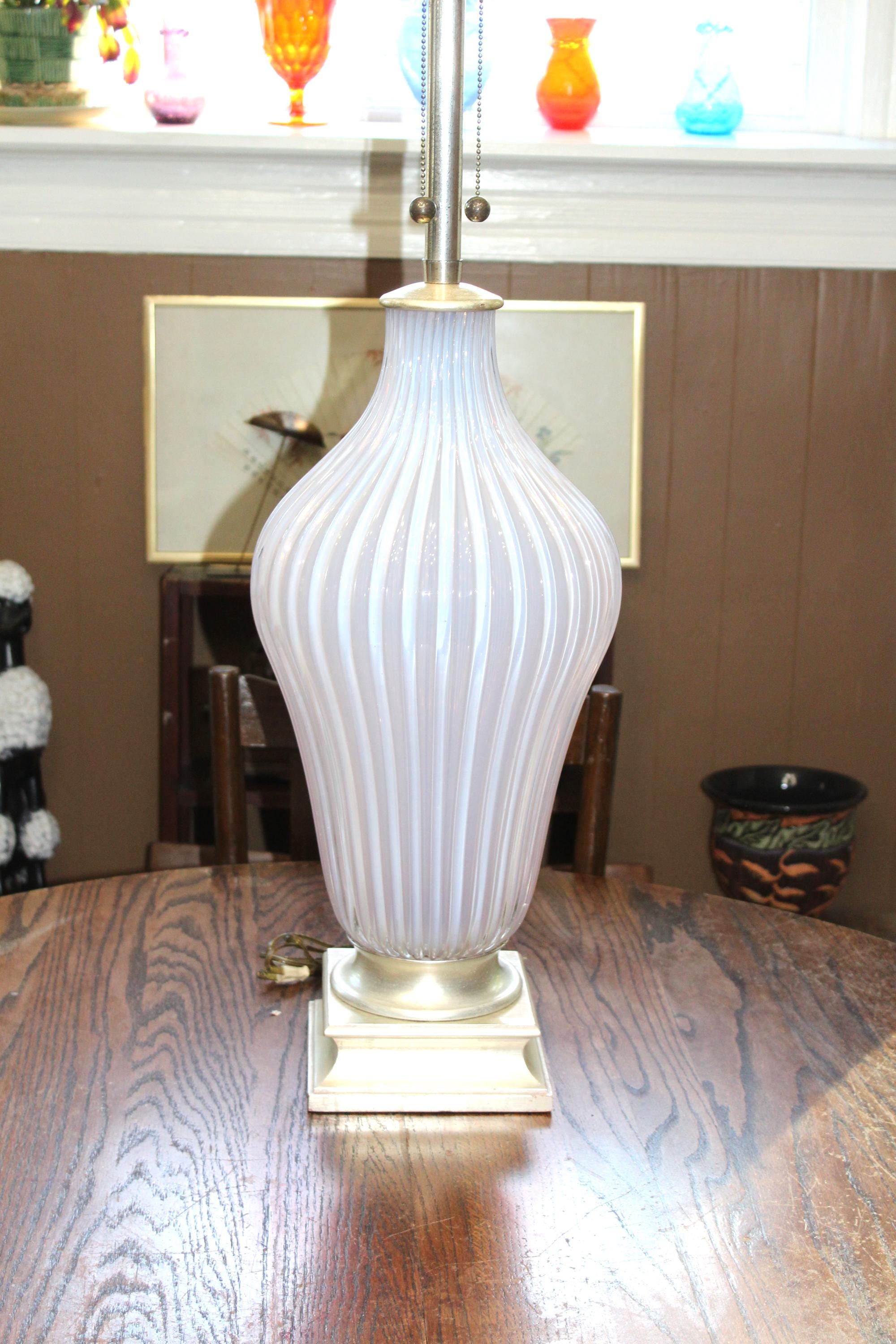 Vintage 1960s Mid Century Seguso Marbro Venetian ribbed pale pink opalescent art glass table lamp, in excellent working condition. The lamp measures 48" high to the top of the finial and the glass portion measures 18" high. No chips or cracks, ready to plug in and enjoy!