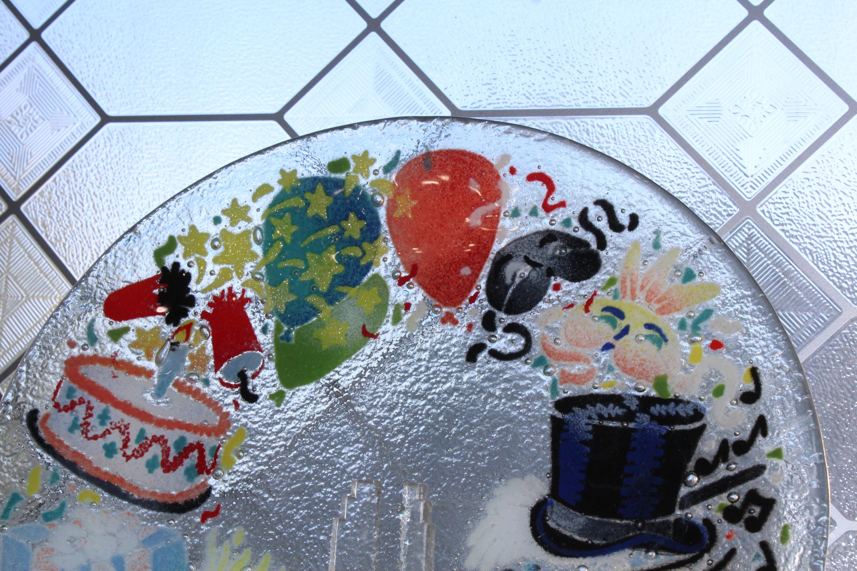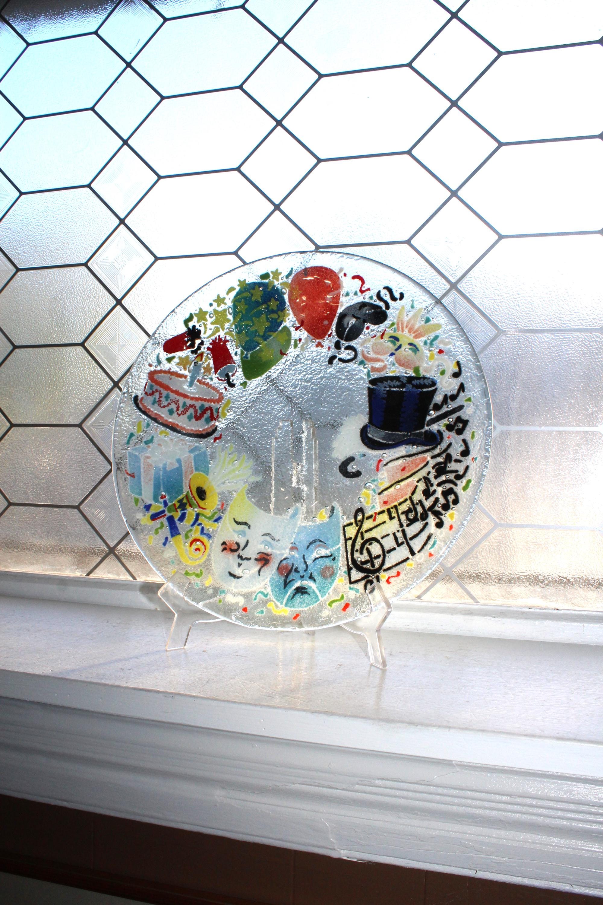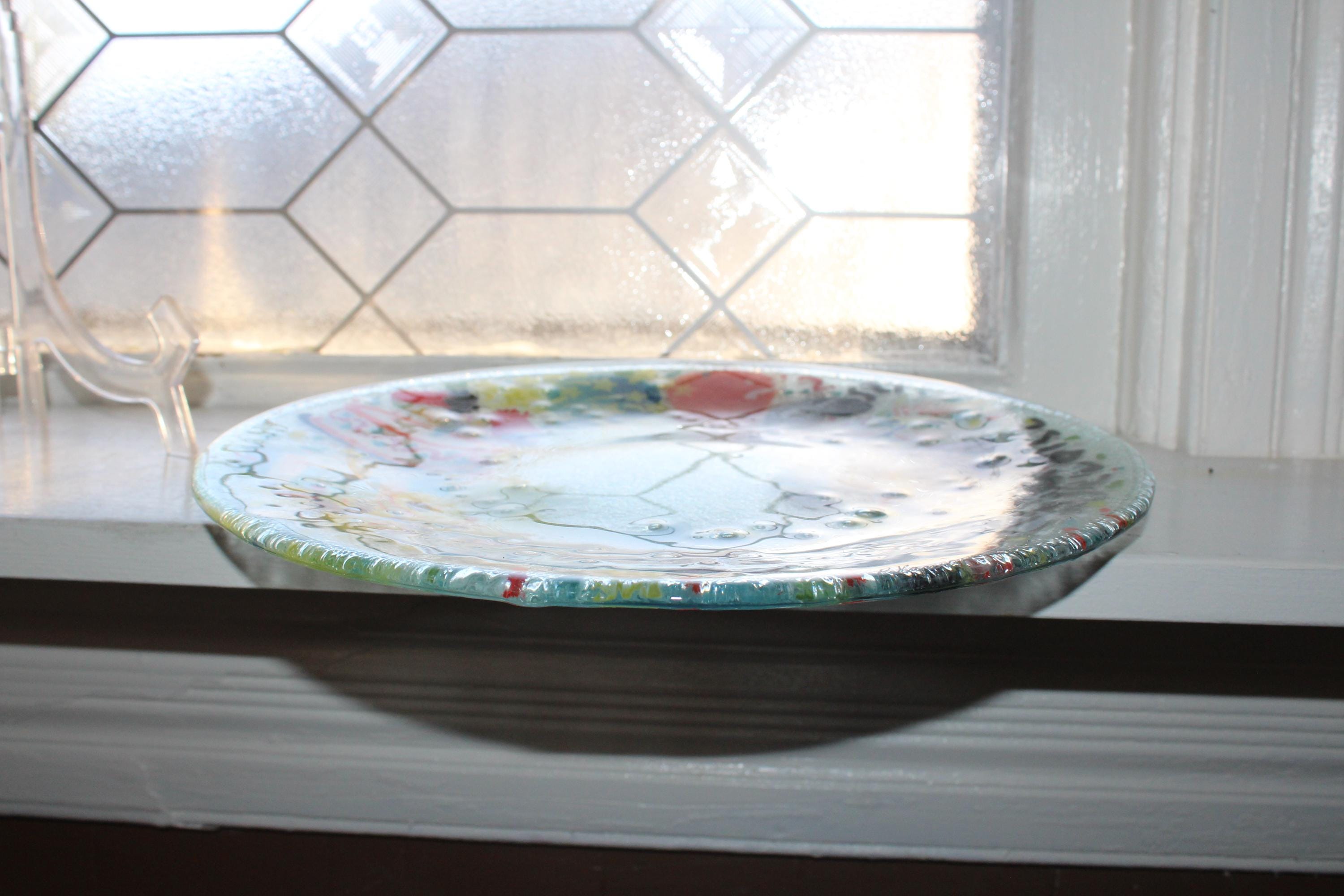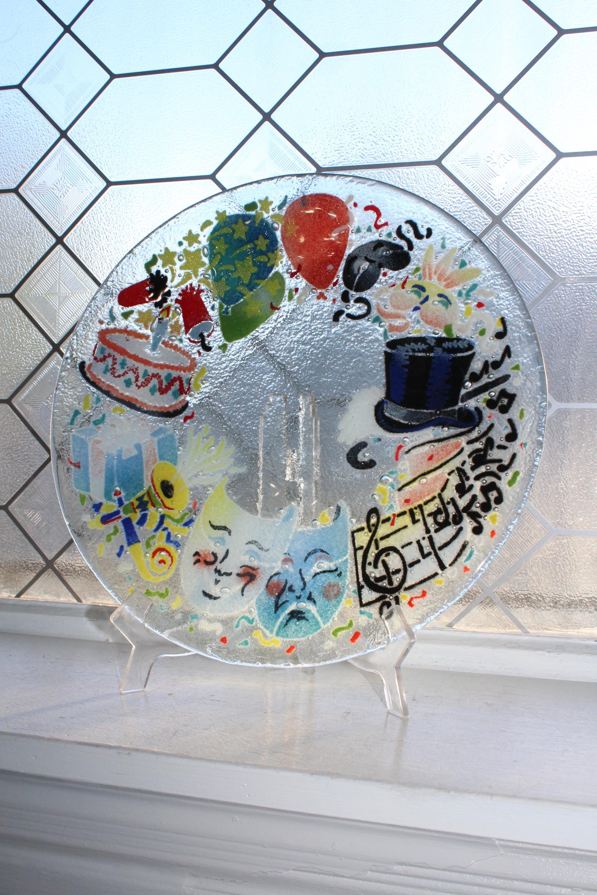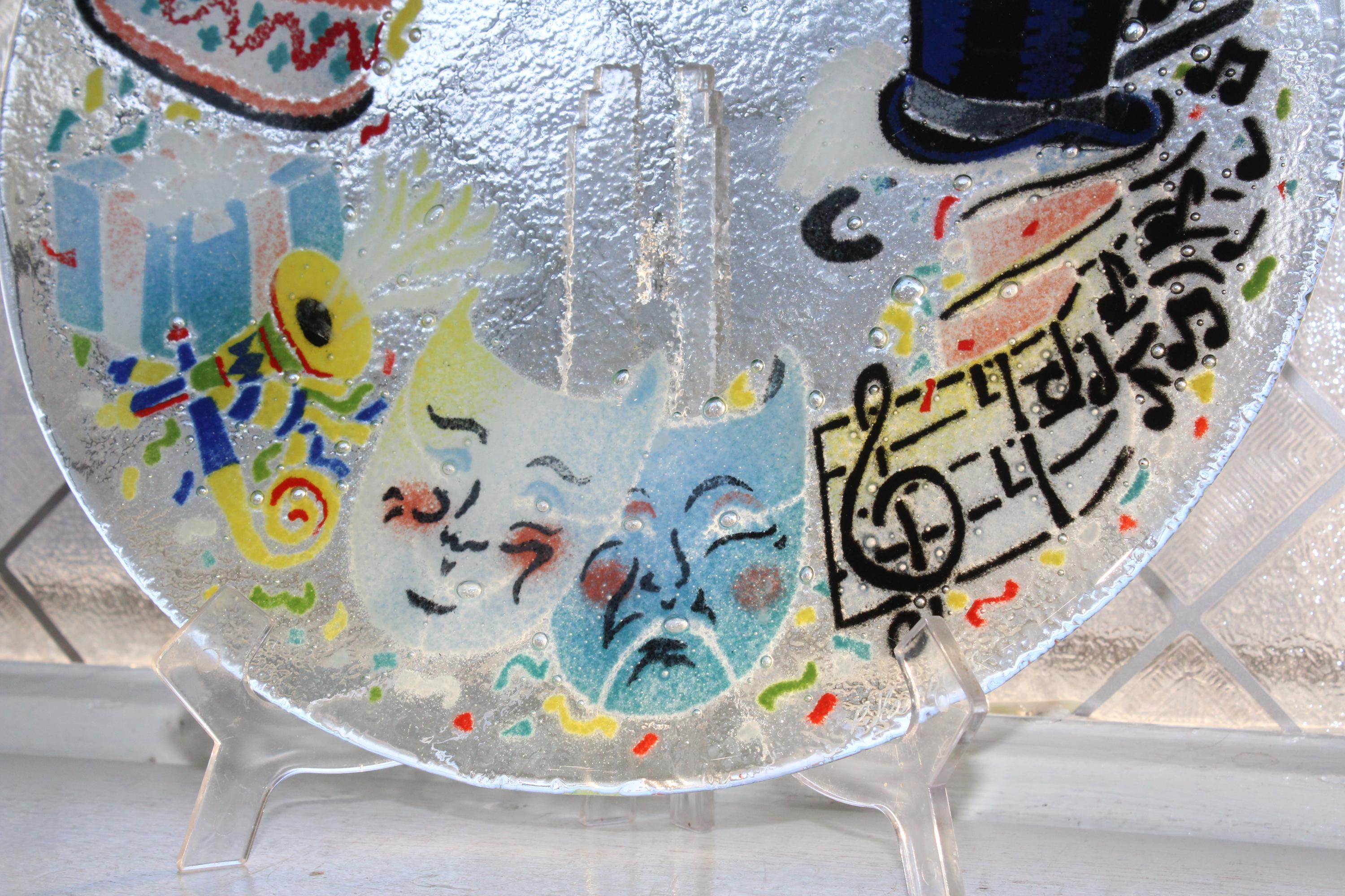 Vintage Peggy Karr fused glass Mardi Gras Celebration round platter, artist signed, in excellent condition. The platter measures 11 1/4" wide. No chips or cracks, perfect for use or display in a retro home. Enjoy!