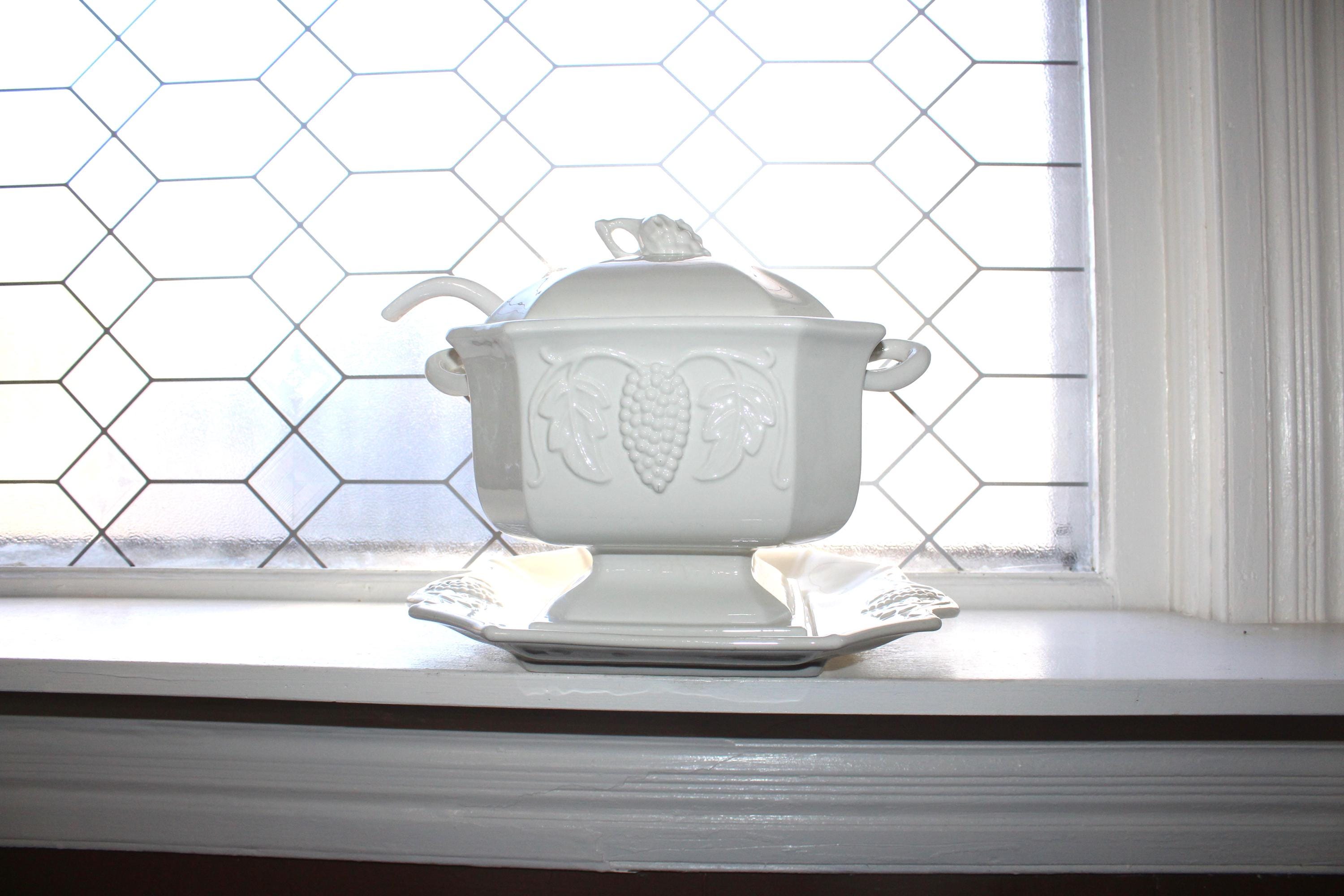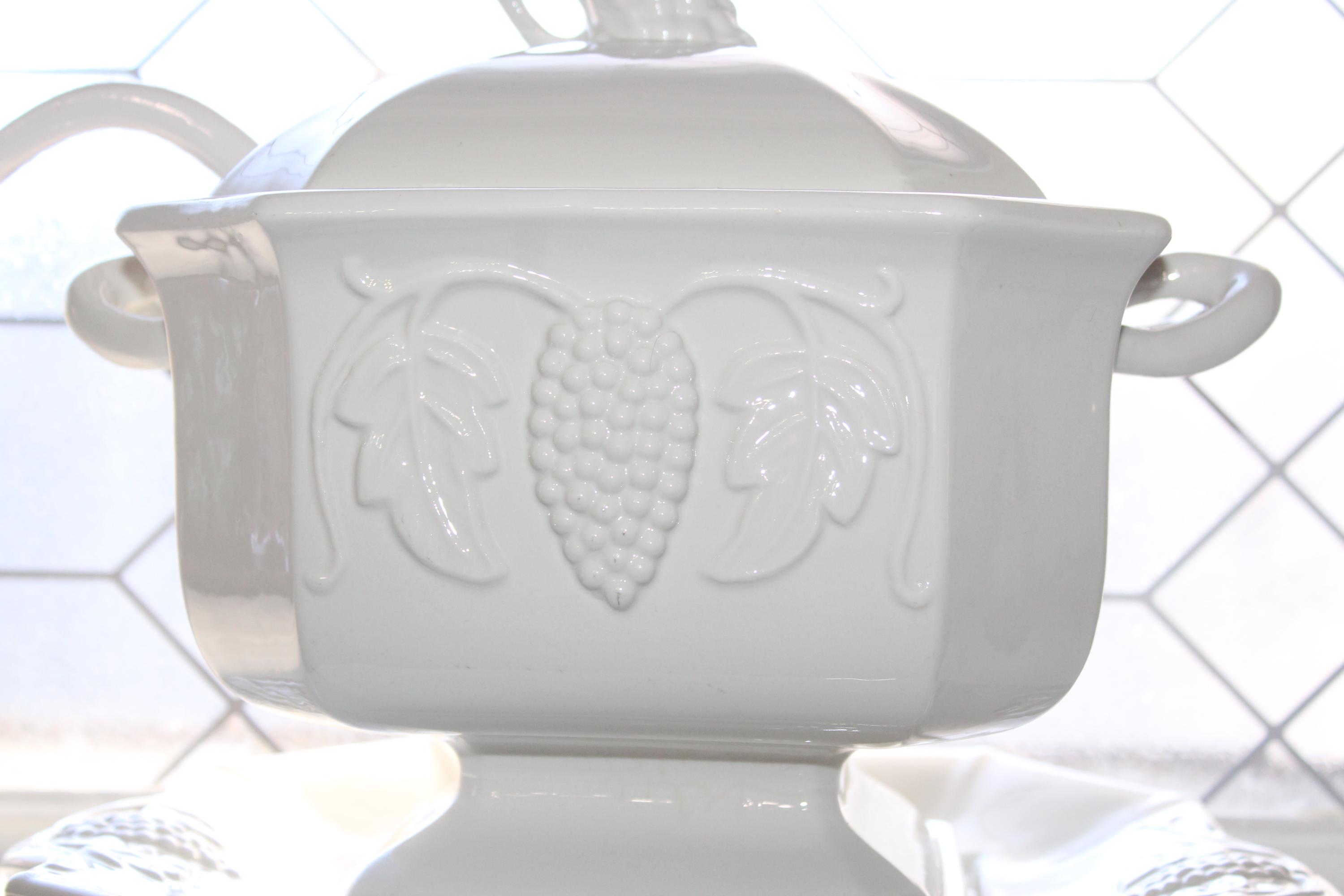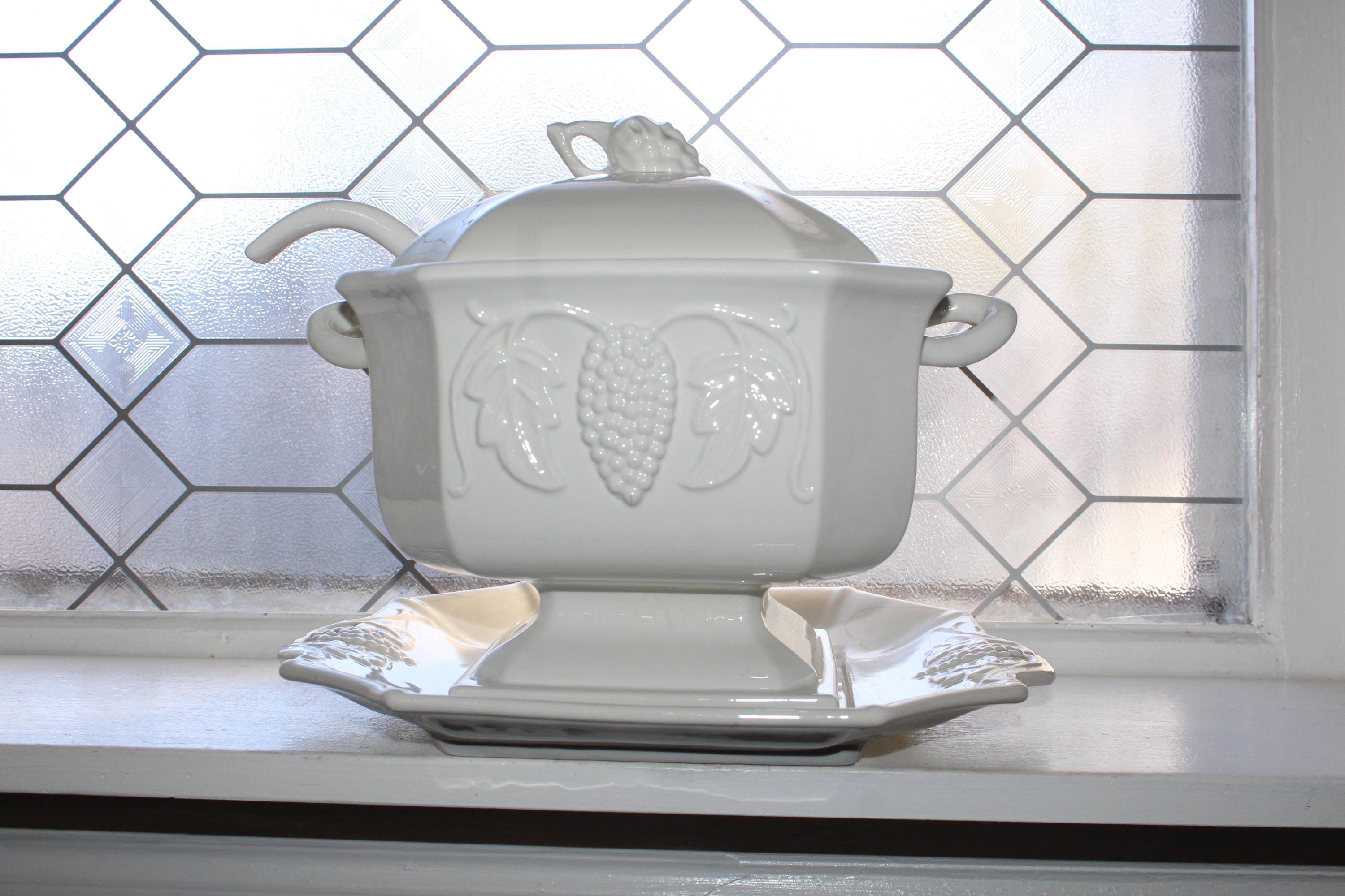 Vintage Red Cliff ironstone covered soup tureen with ladle and underplate, Grapes pattern, in excellent condition. The dish measures 9 1/2" high with the lid on and the underplate measures 12 3/4" wide. The whole thing weighs 10 lbs. No chips or cracks, perfect for use or display. Enjoy!