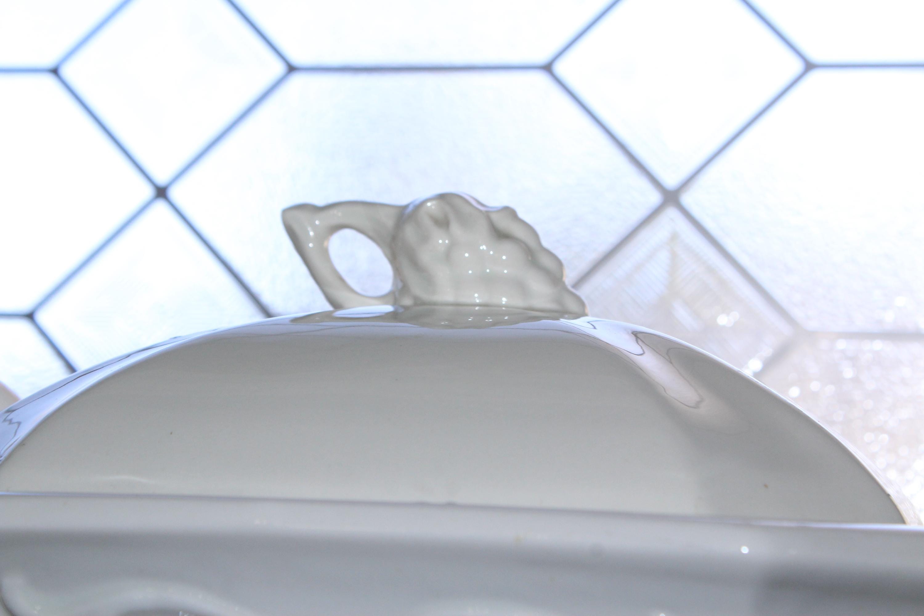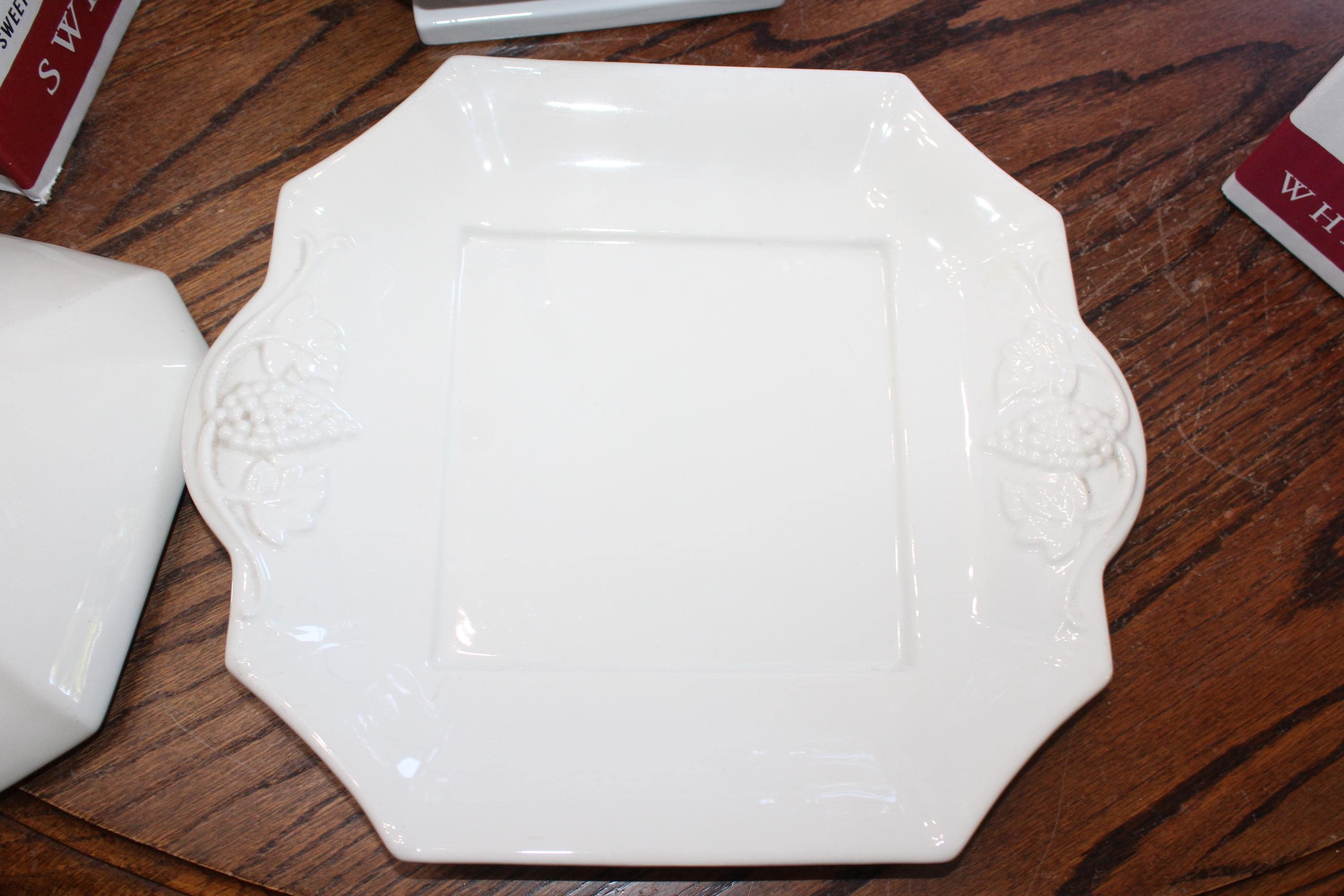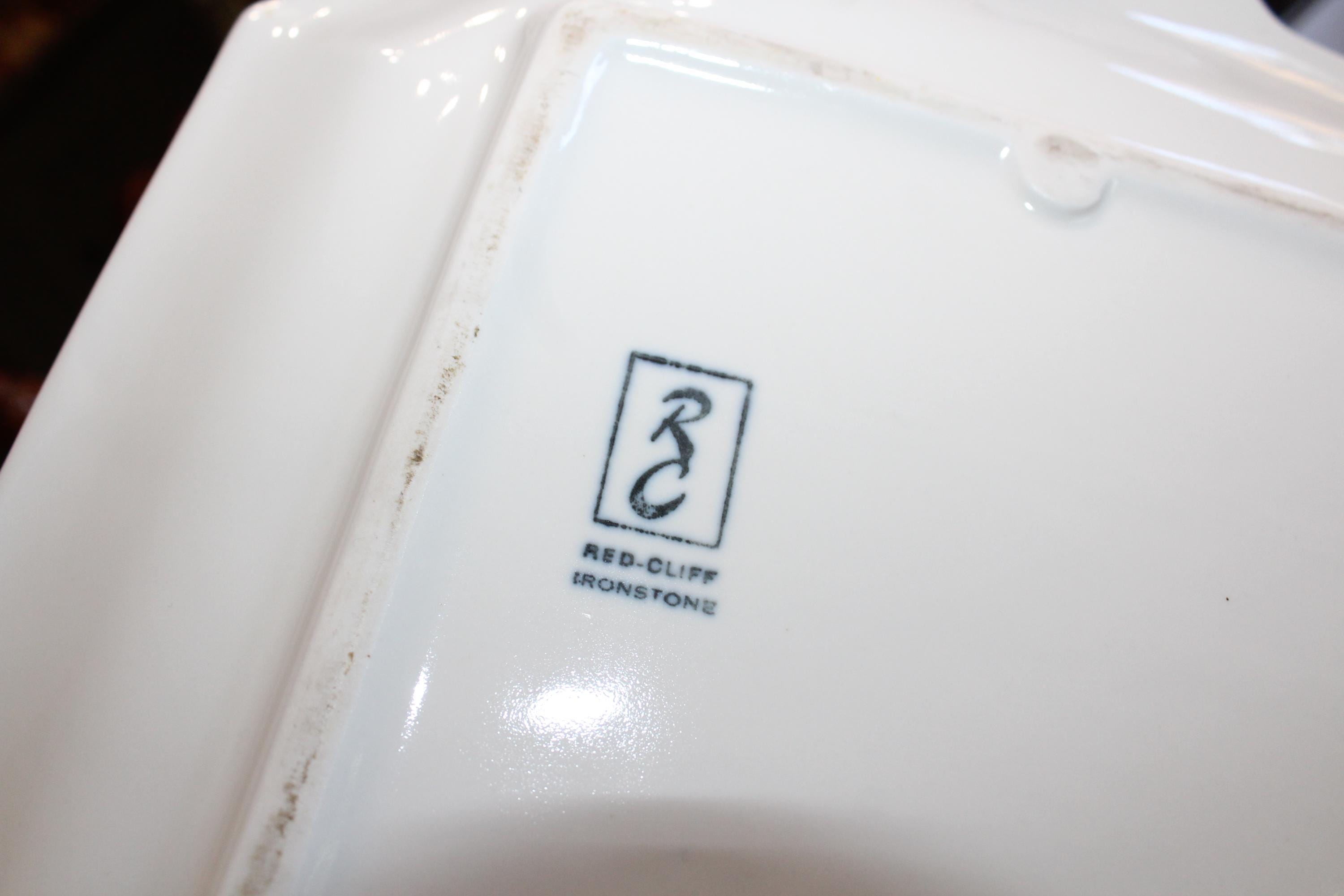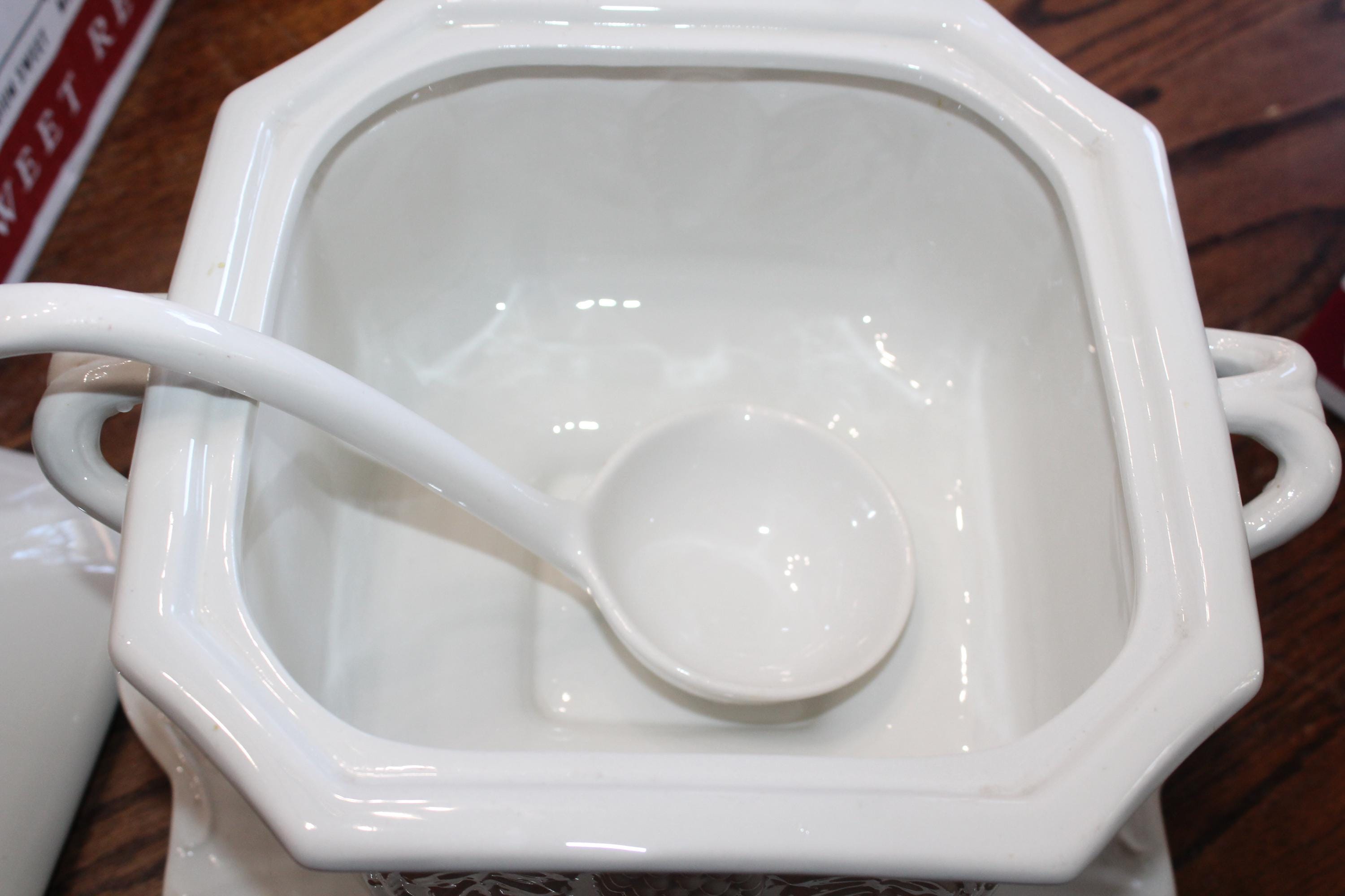 Vintage Red Cliff ironstone covered soup tureen with ladle and underplate, Grapes pattern, in excellent condition. The dish measures 9 1/2" high with the lid on and the underplate measures 12 3/4" wide. The whole thing weighs 10 lbs. No chips or cracks, perfect for use or display. Enjoy!