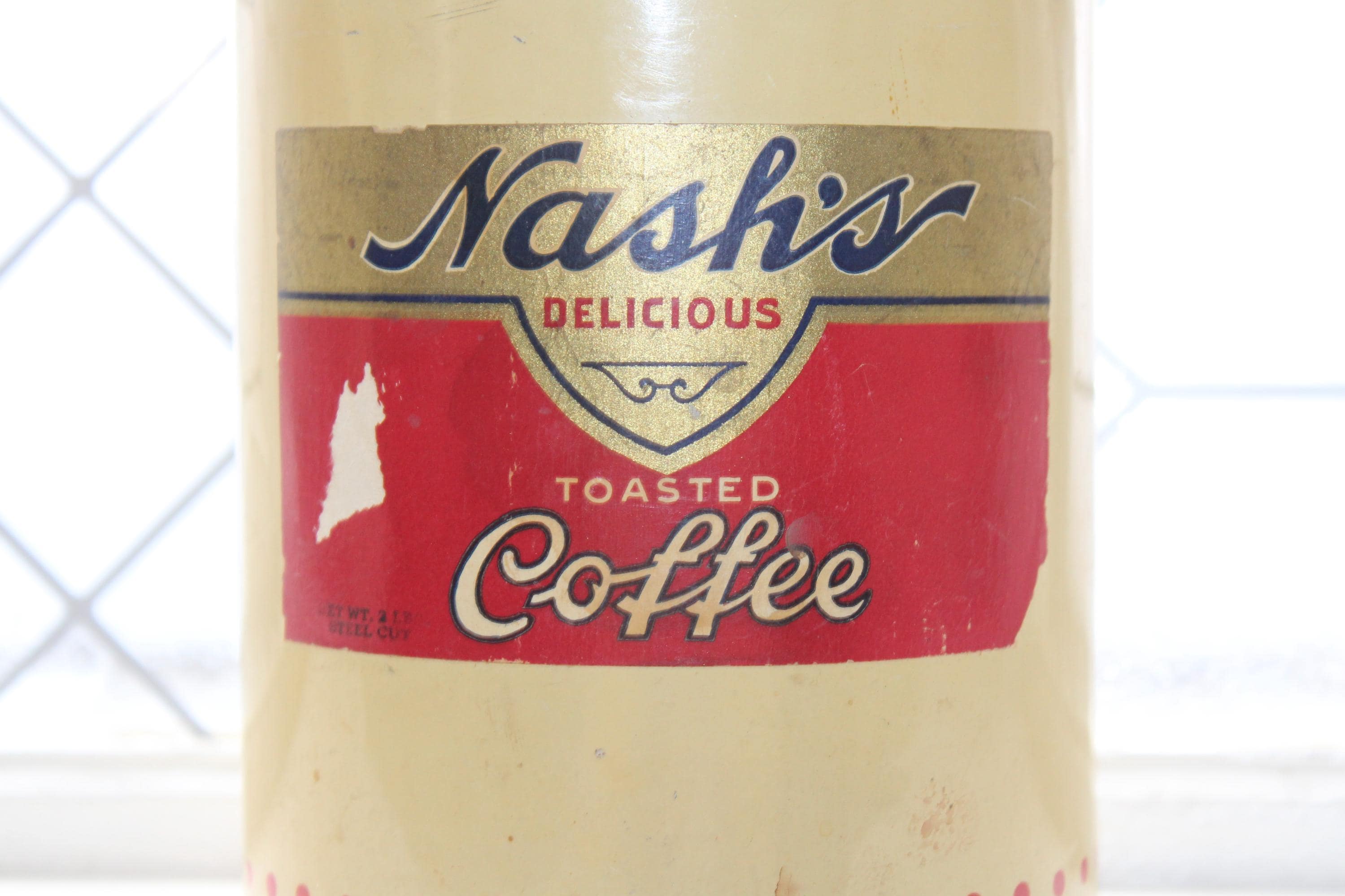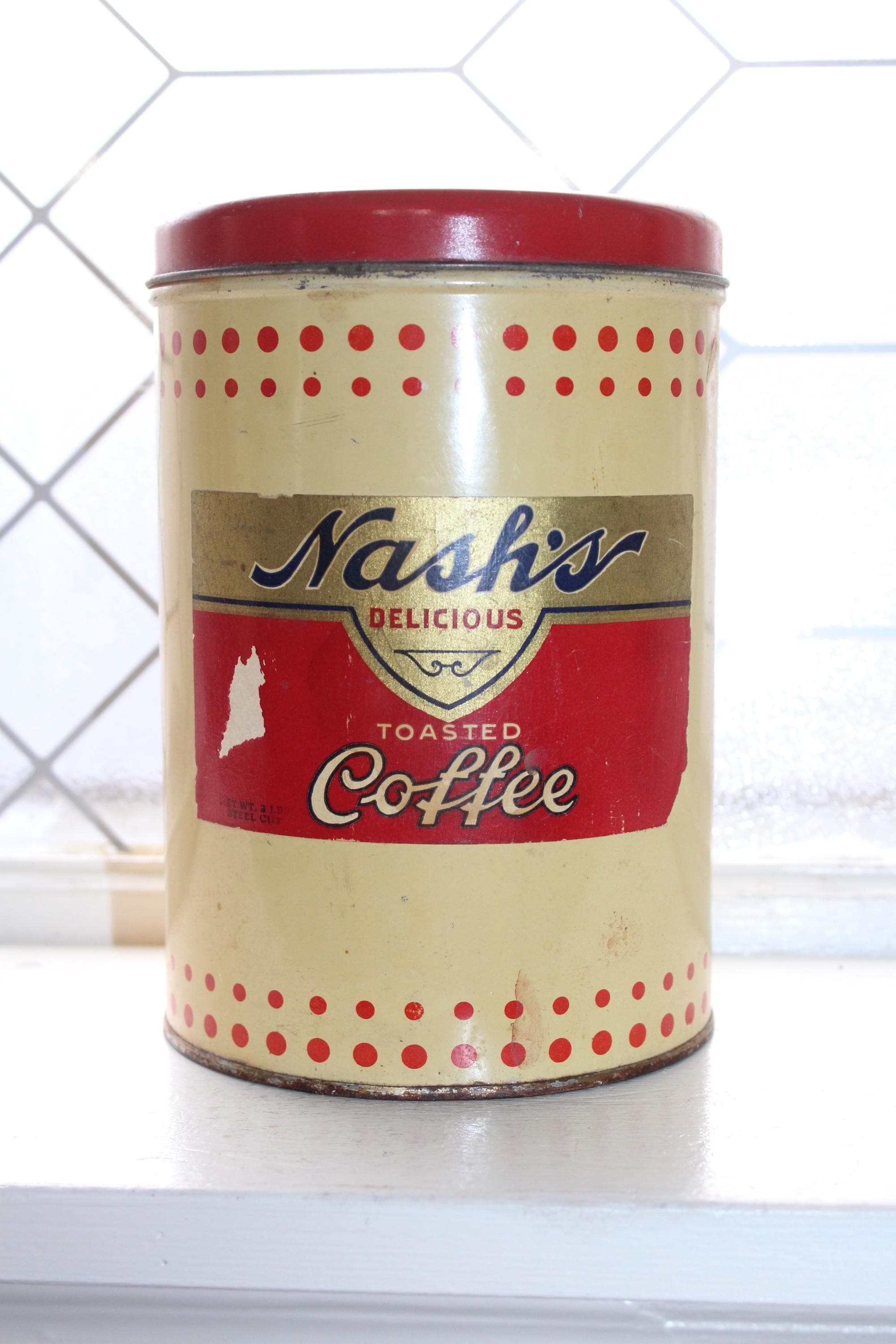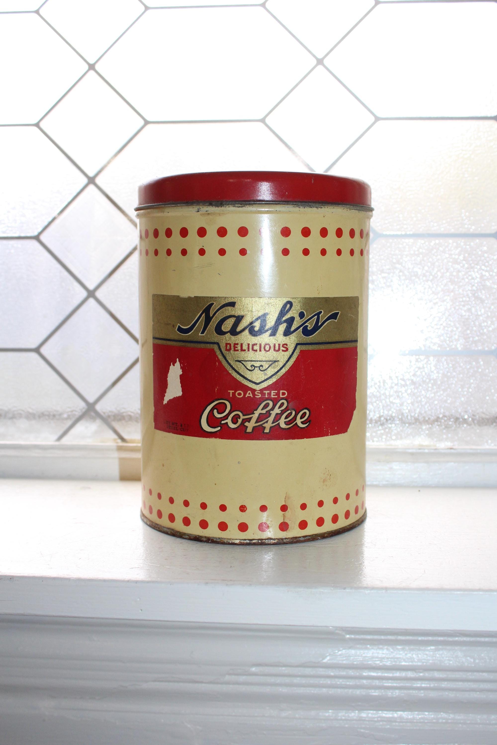 Vintage 1930s Nash Coffee tin featuring a paper label on a tin with bands of red dots on a cream base, with red lid. The tin measures 7 1/4" high x 5" in diameter and looks great. Enjoy!