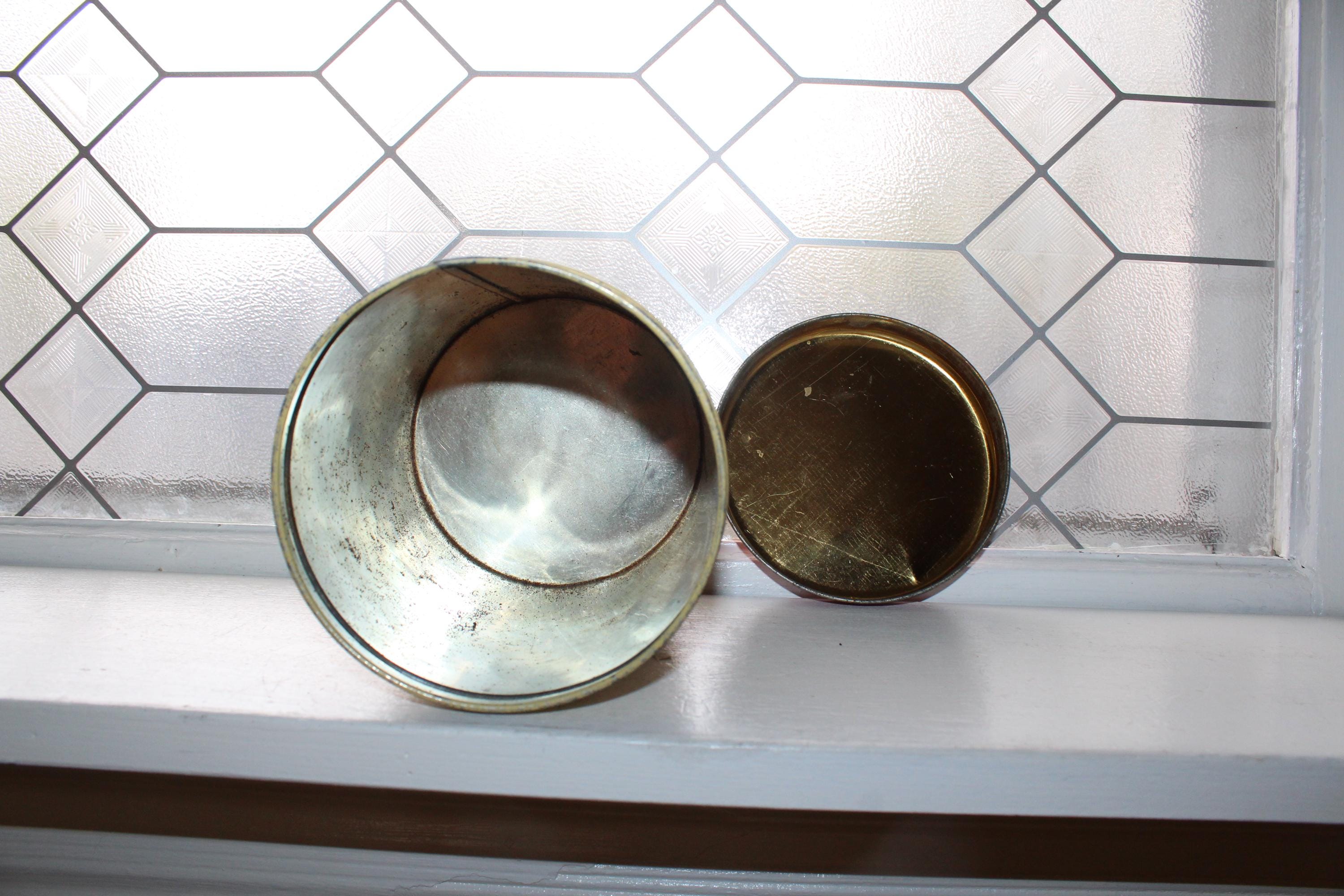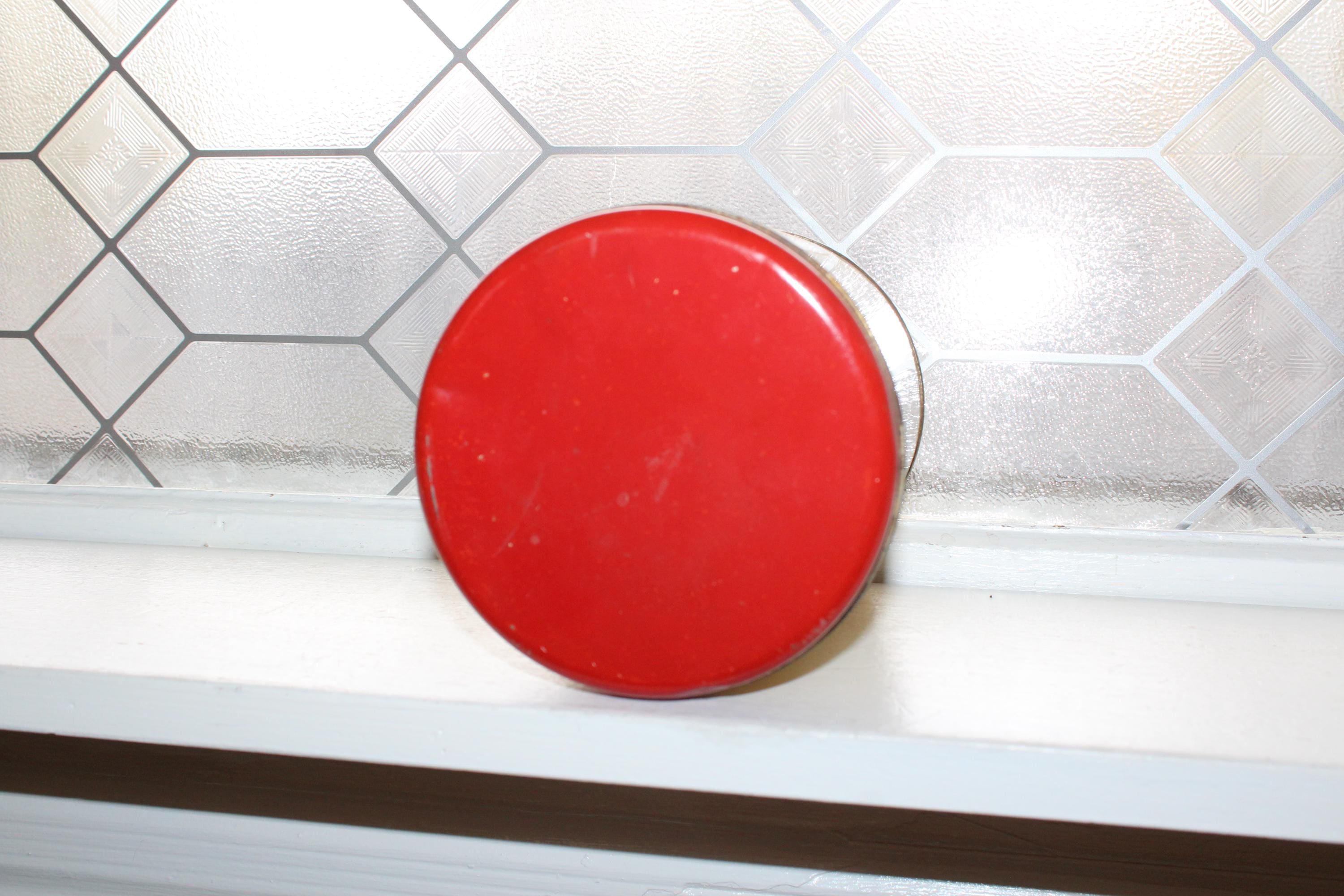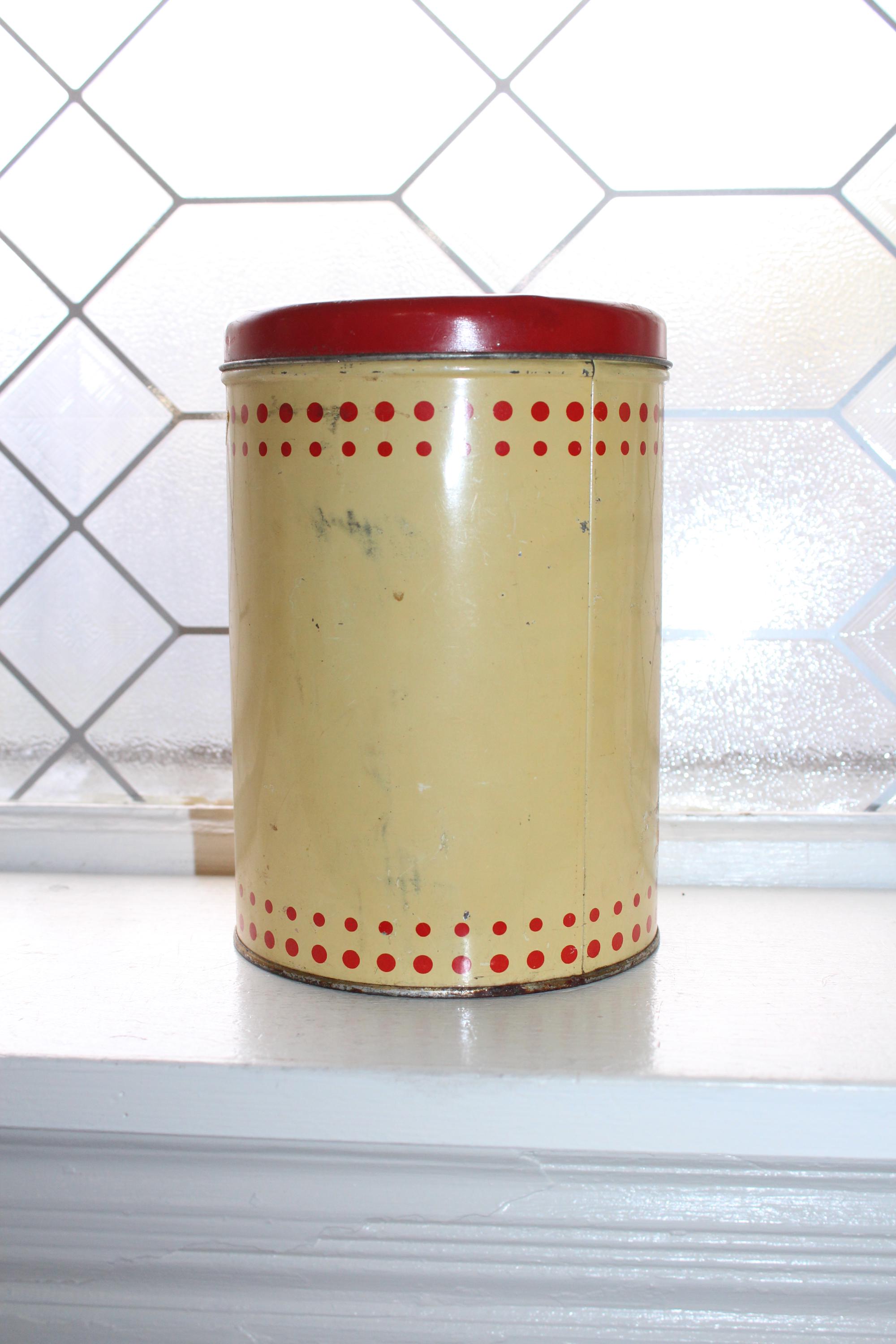 Vintage 1930s Nash Coffee tin featuring a paper label on a tin with bands of red dots on a cream base, with red lid. The tin measures 7 1/4" high x 5" in diameter and looks great. Enjoy!