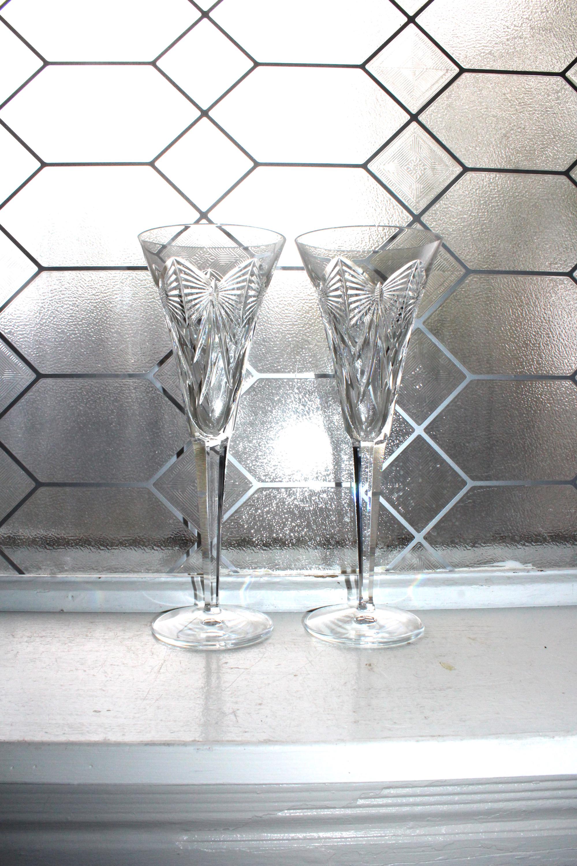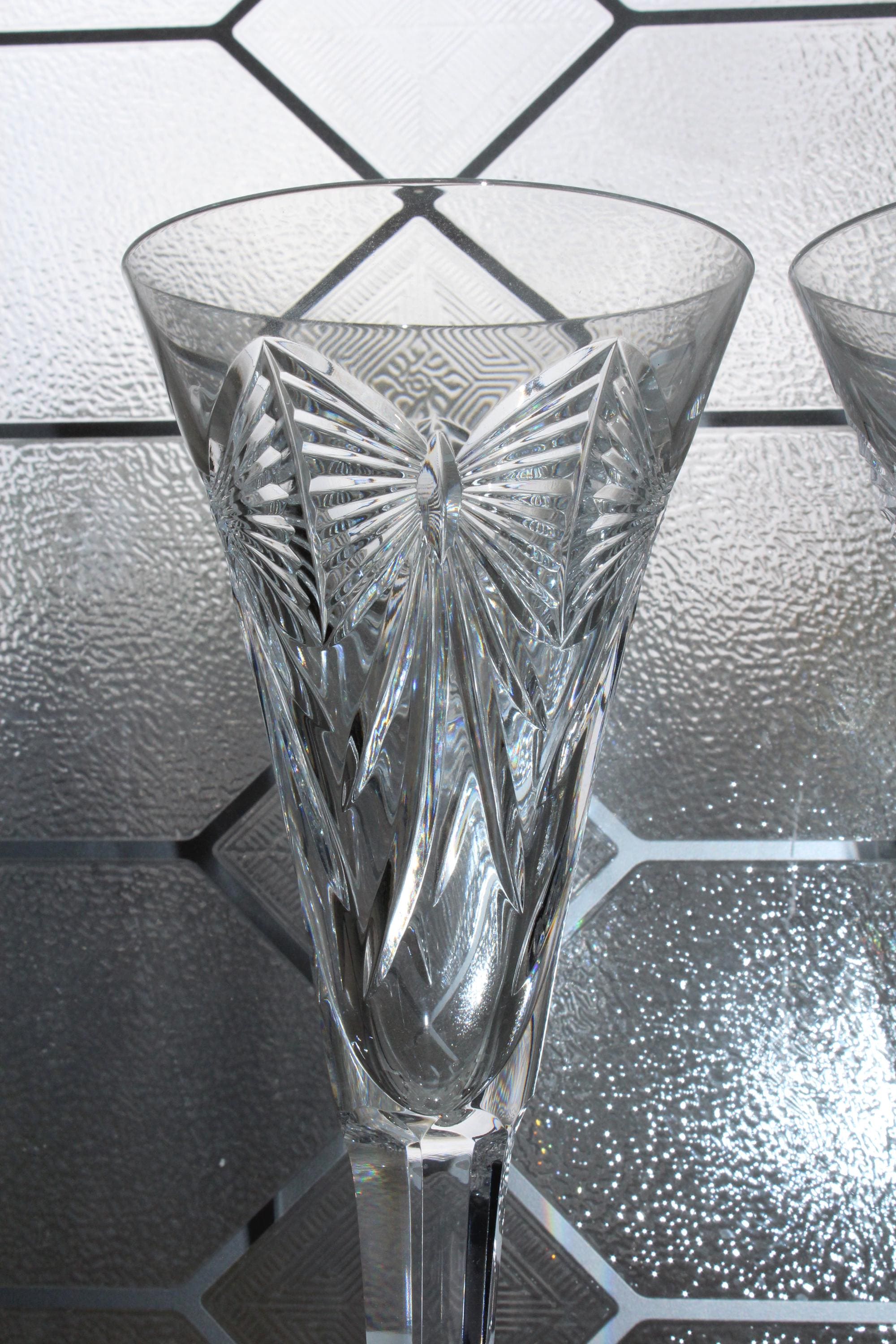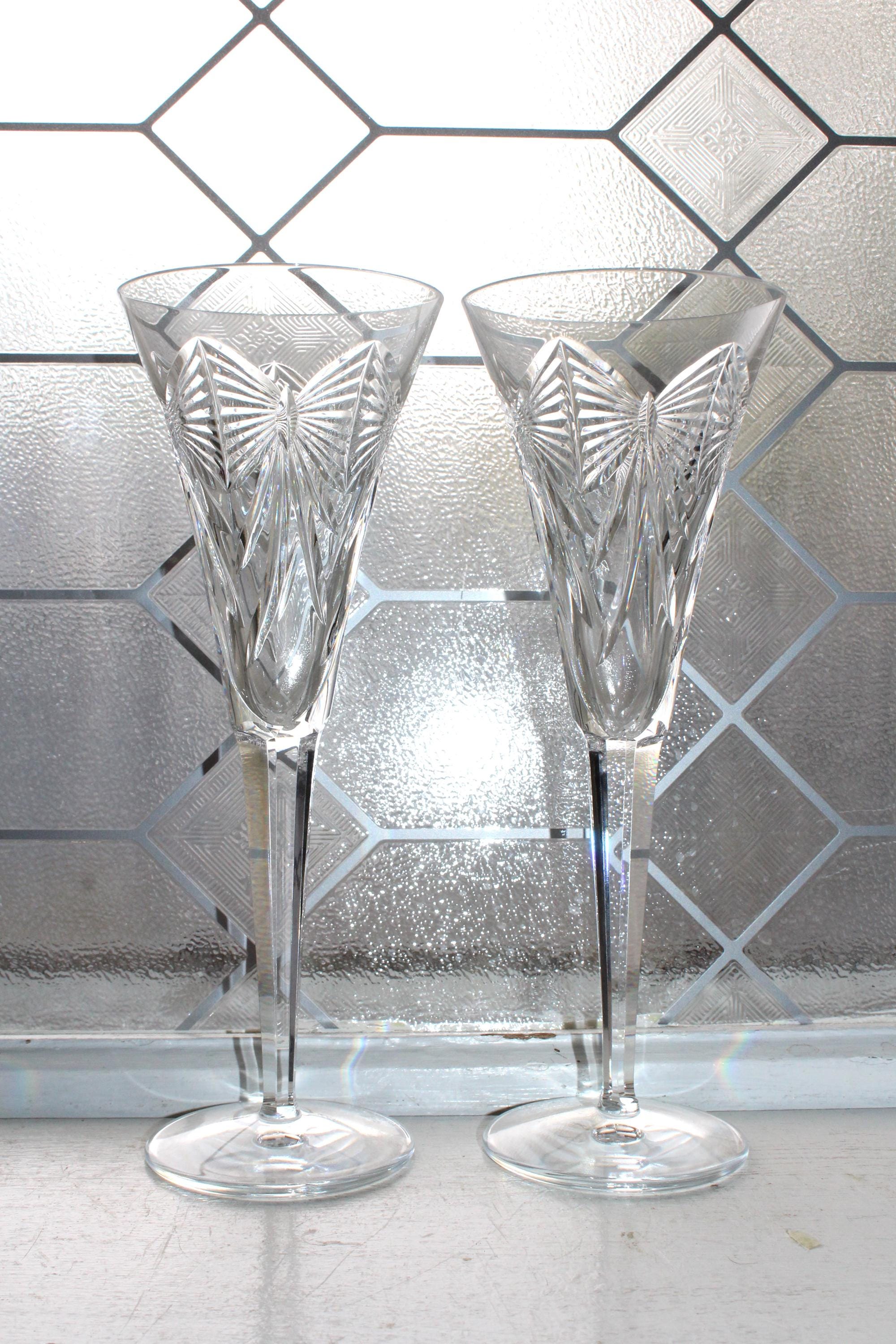 Pair of Waterford Marquis Happiness champagne toasting flutes/glasses, in excellent condition. Each glass measures 9 1/4" high. No wear, chips or cracks, perfect for use or display. Enjoy!