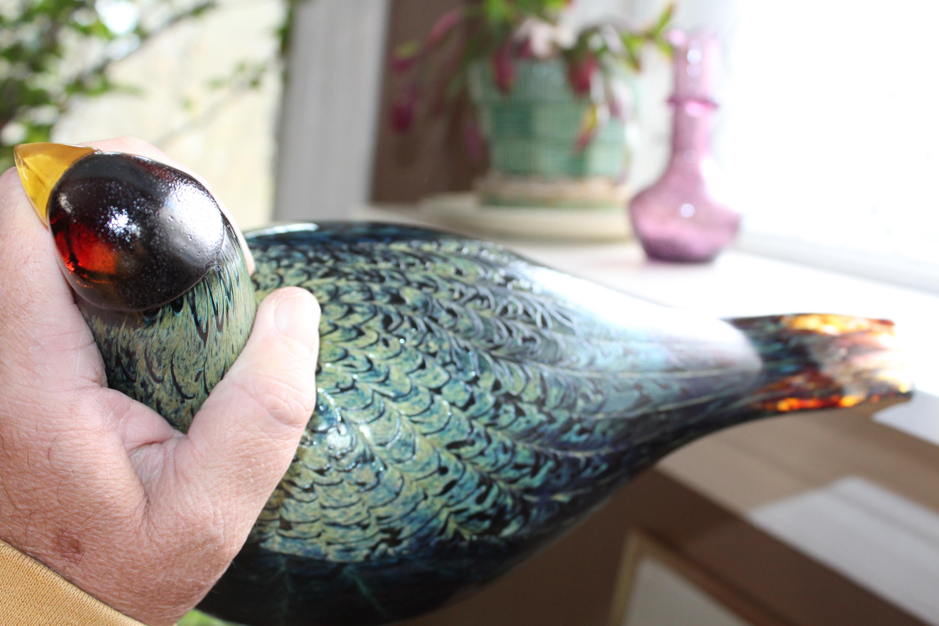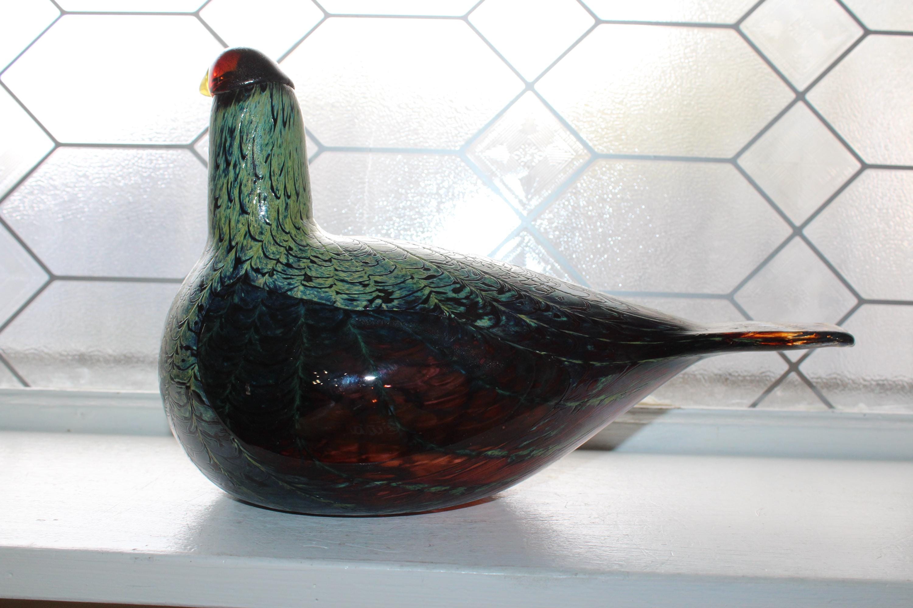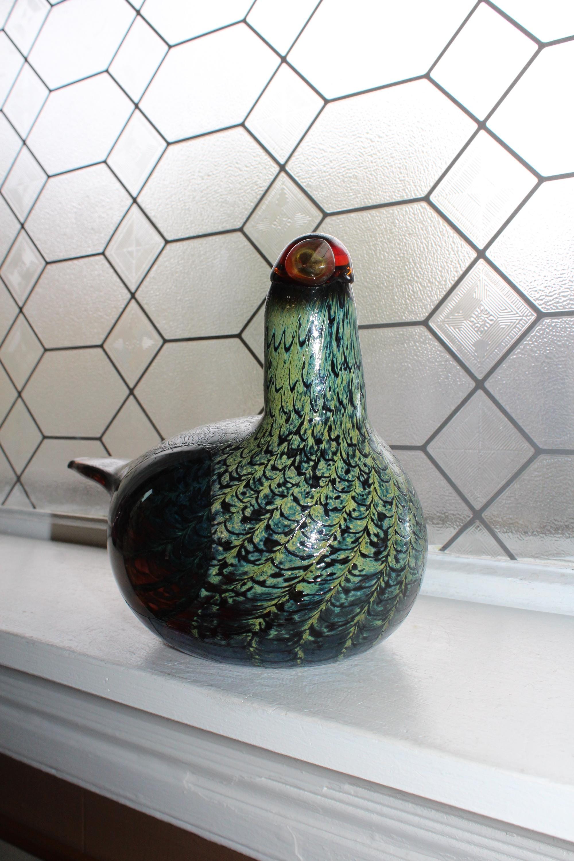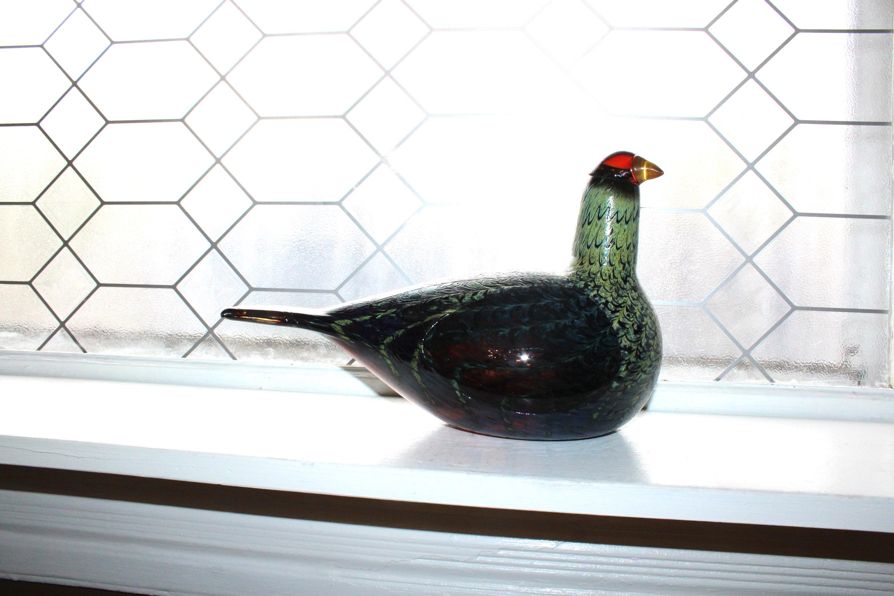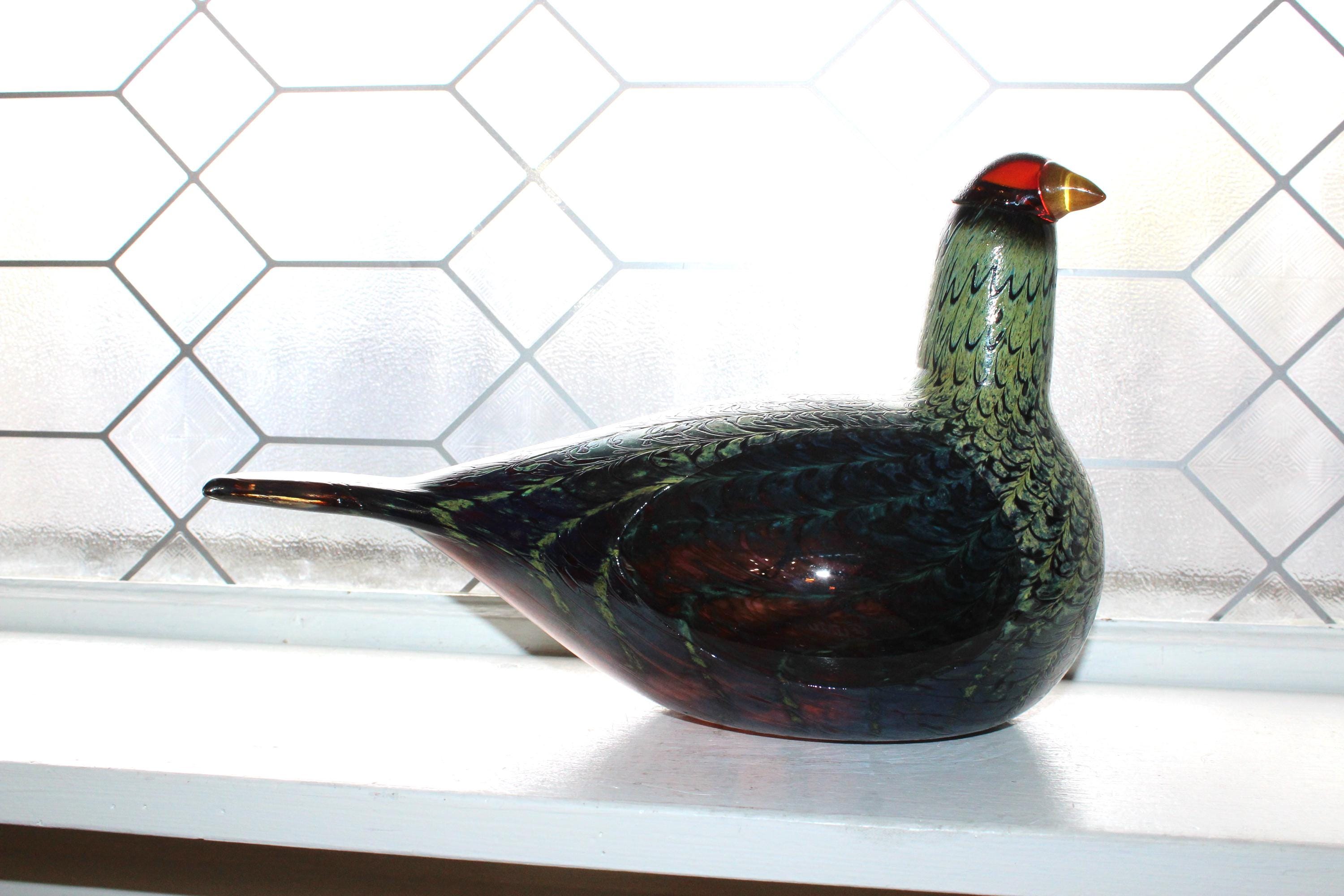 This is a large vintage Oiva Toikka glass pheasant bird, Iittala Finland Nuutajärvi Arabia. This rare piece measures 11 1/2" long x 7 1/2" high. There is a small manufacturer's bubble pop/chip on the corner of the tail, no other chips or cracks, perfect for use or display. Enjoy!