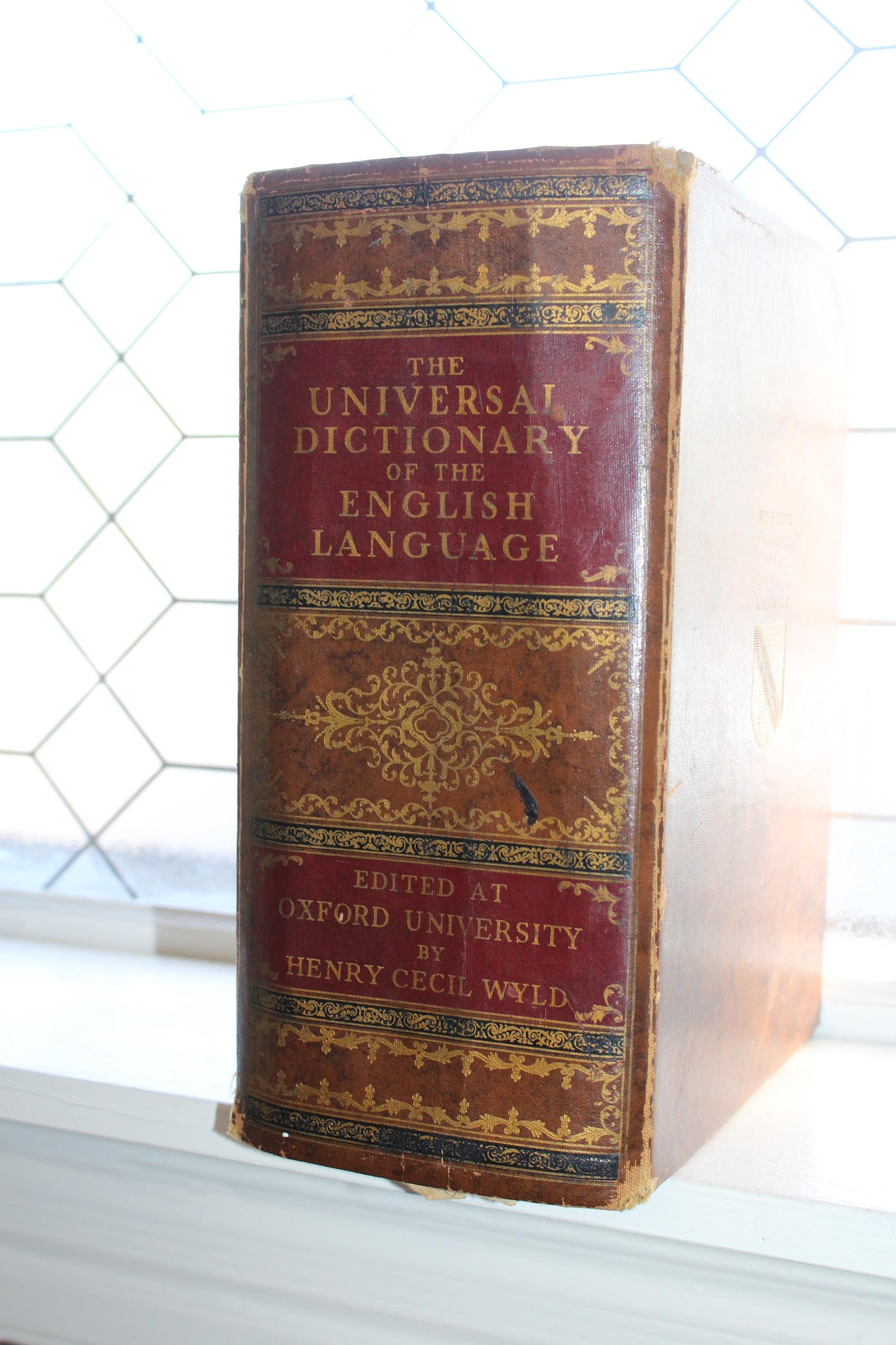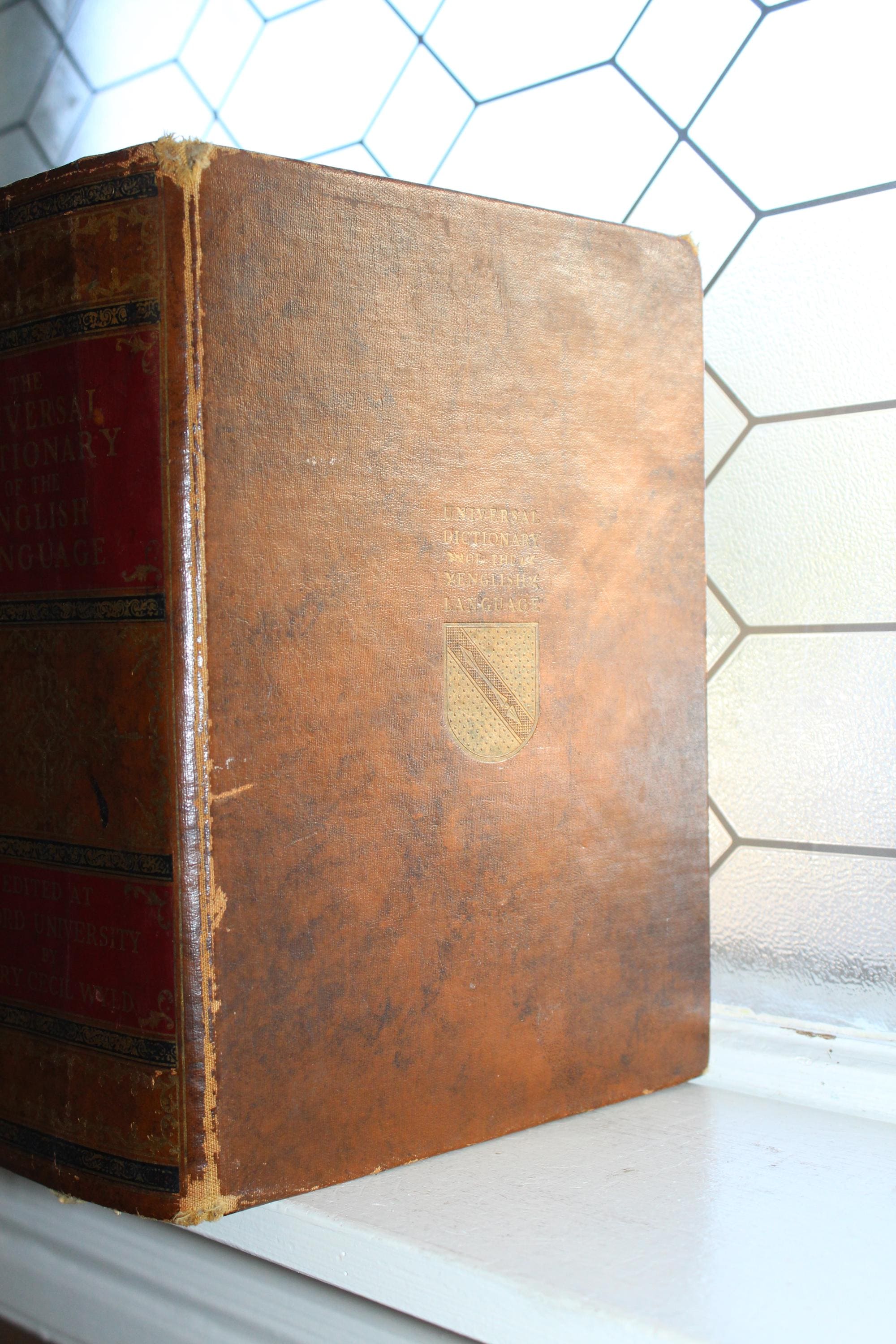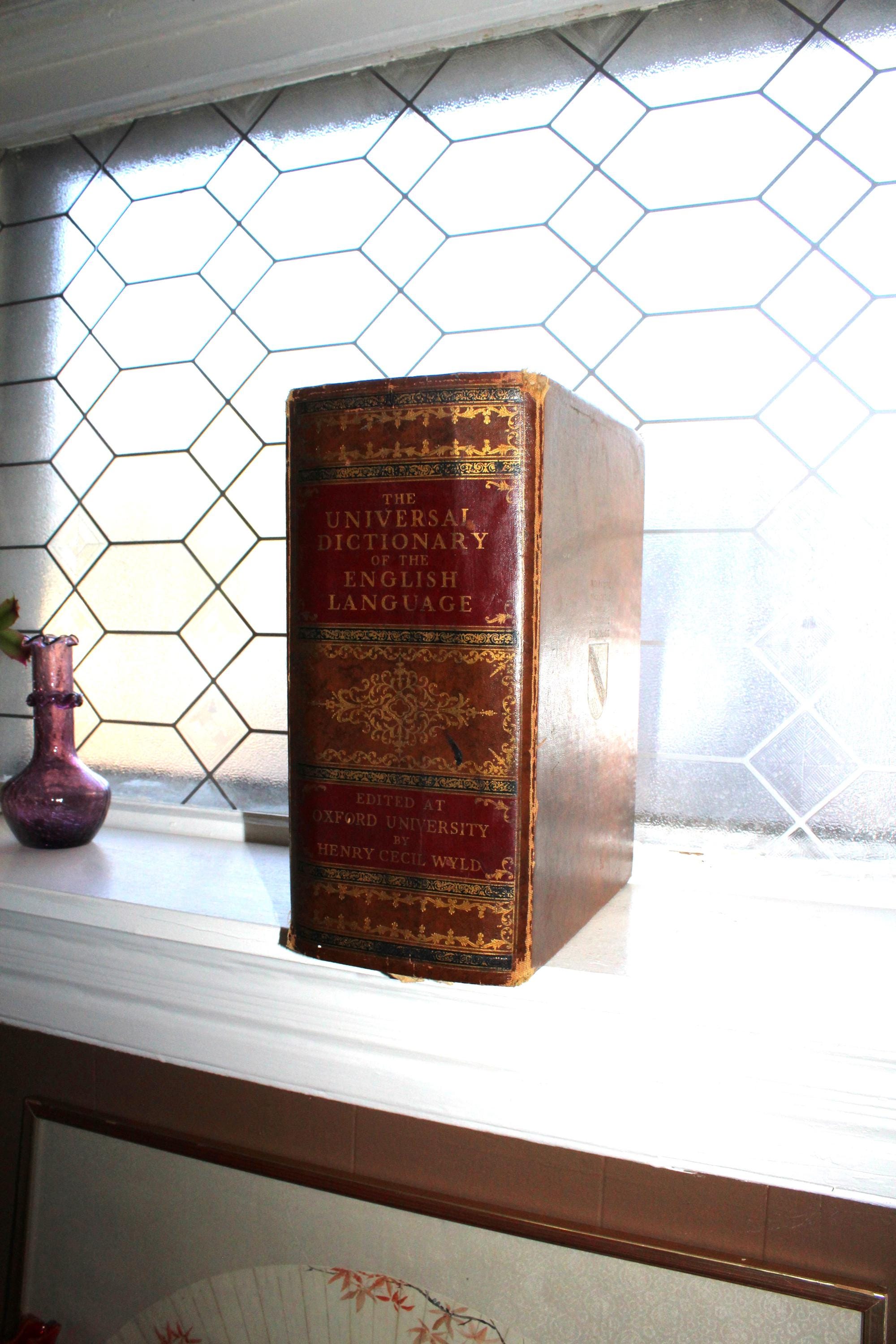 Huge vintage 1938 Universal Dictionary of the English Language, edited at Oxford, with leather cover, great for display in a retro home. It measures 11 1/2" x 8 1/2" and is 5 1/4" thick. It weighs 7 3/4 pounds. The book displays very well, although the cover is loose. Enjoy!