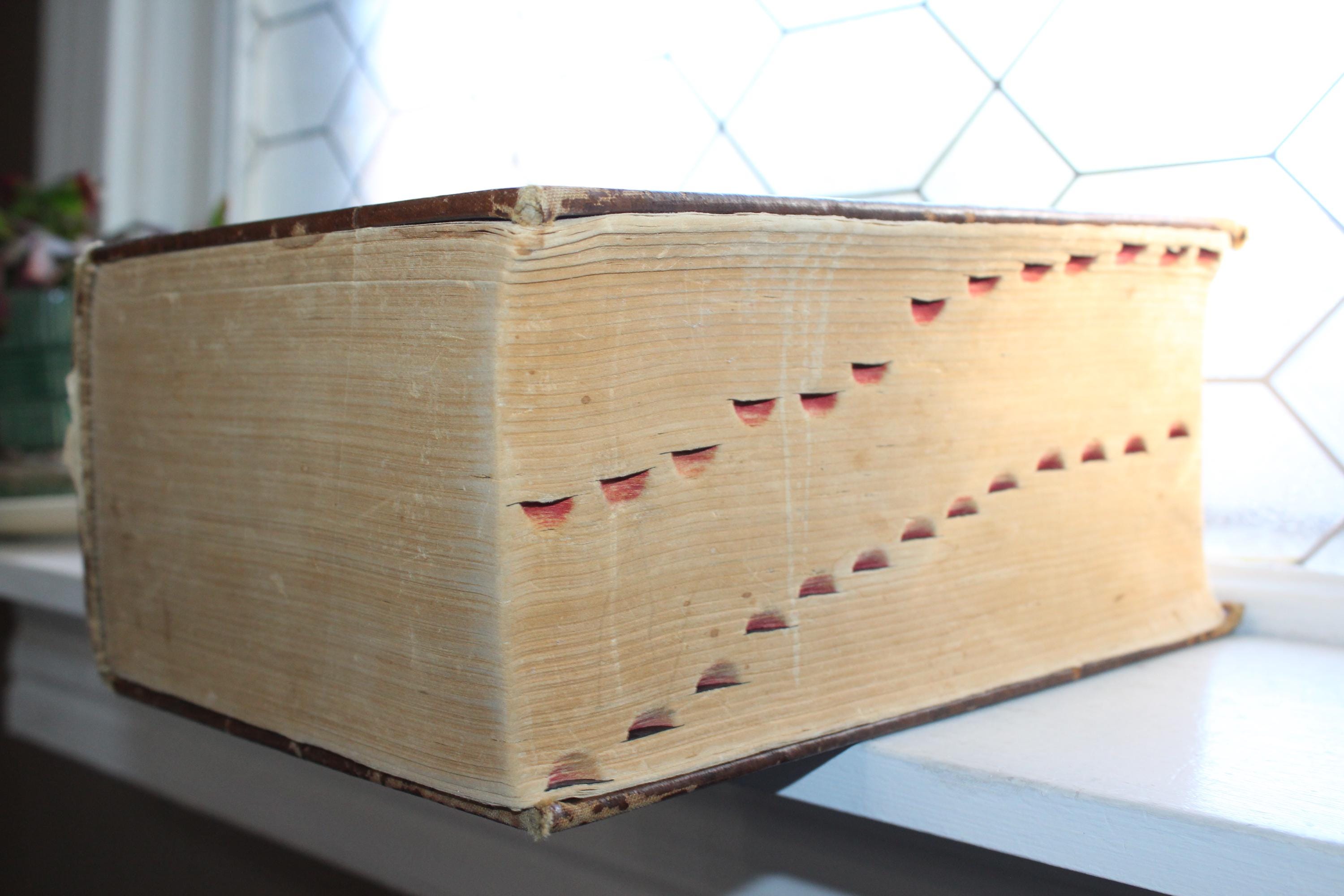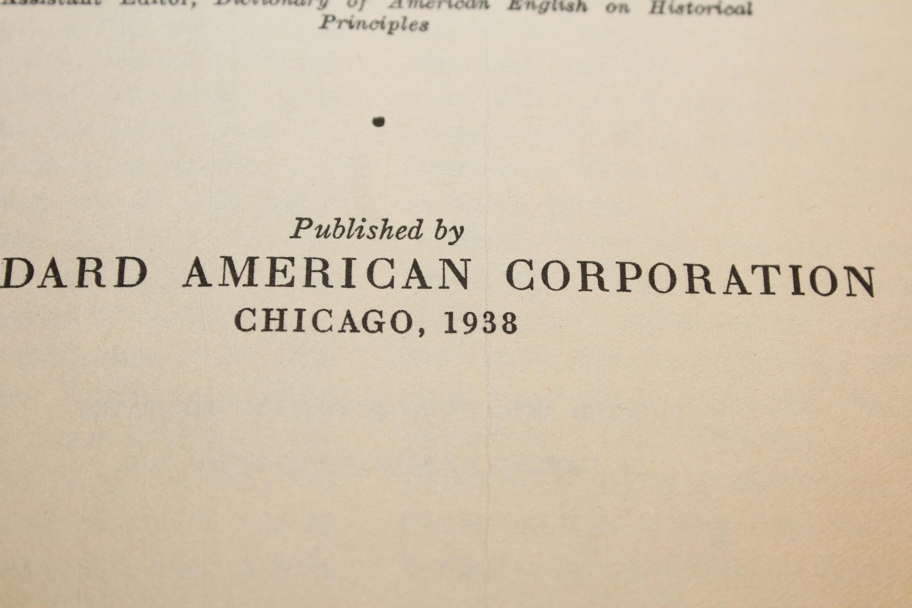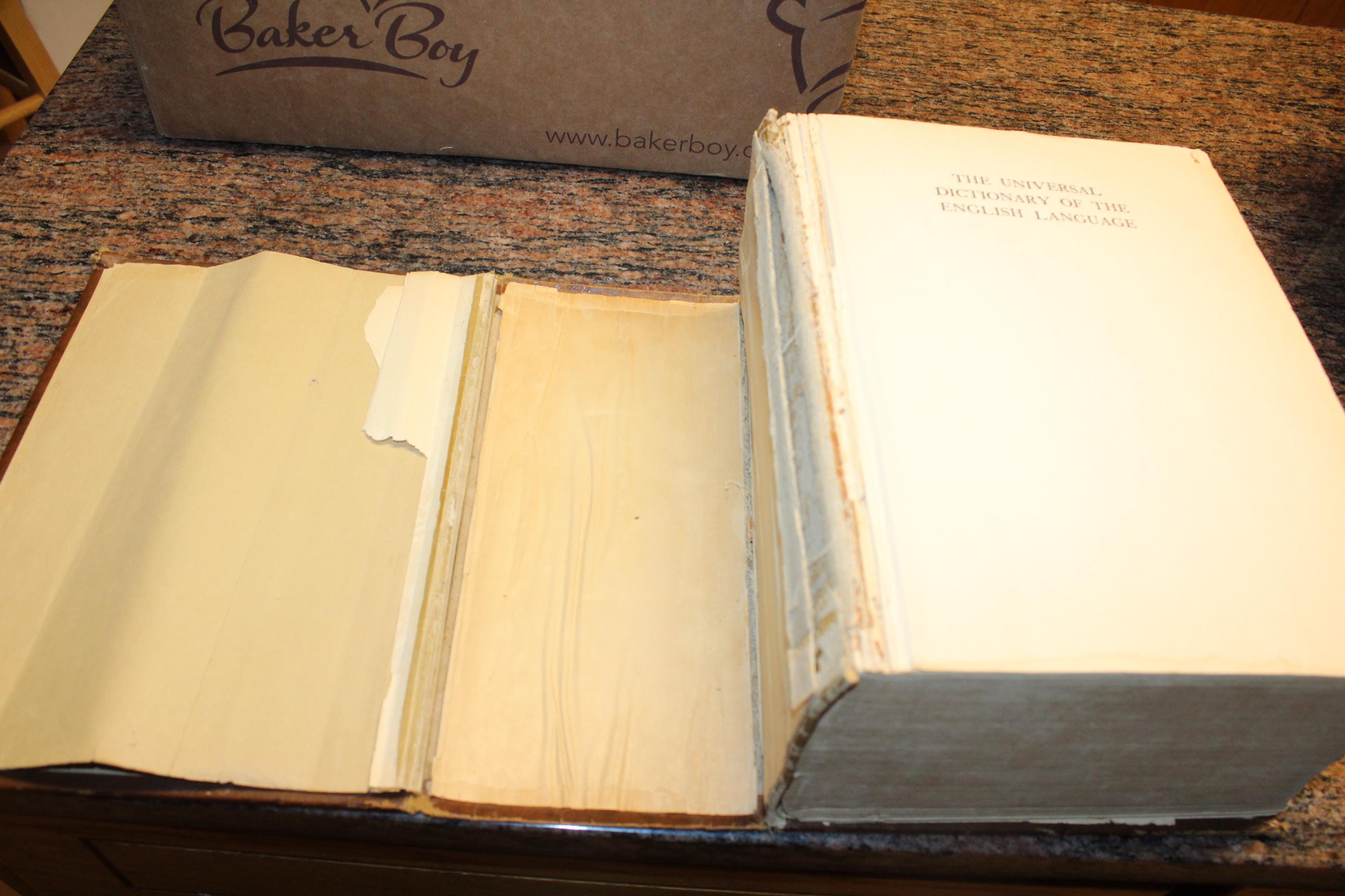 Huge vintage 1938 Universal Dictionary of the English Language, edited at Oxford, with leather cover, great for display in a retro home. It measures 11 1/2" x 8 1/2" and is 5 1/4" thick. It weighs 7 3/4 pounds. The book displays very well, although the cover is loose. Enjoy!