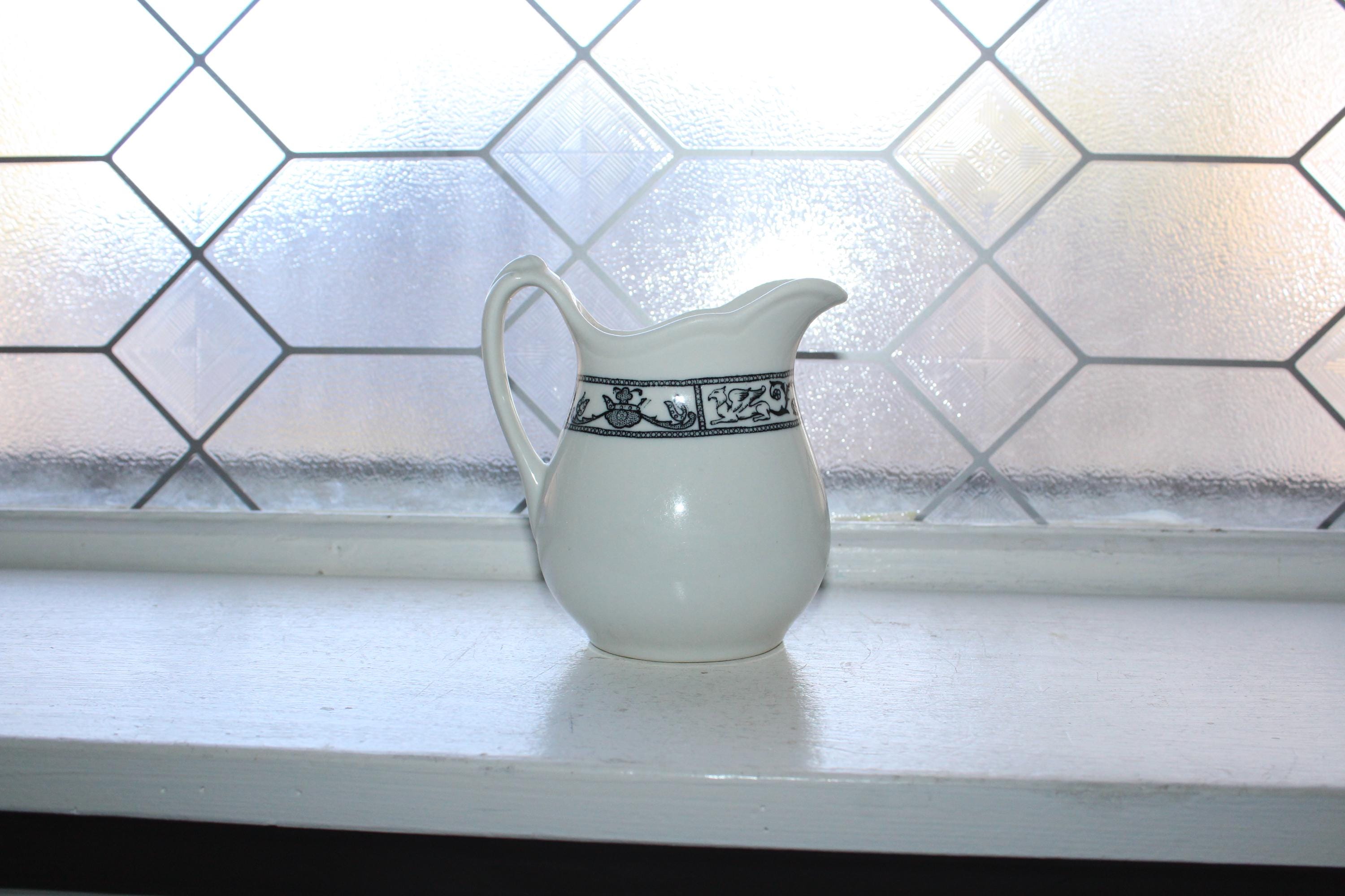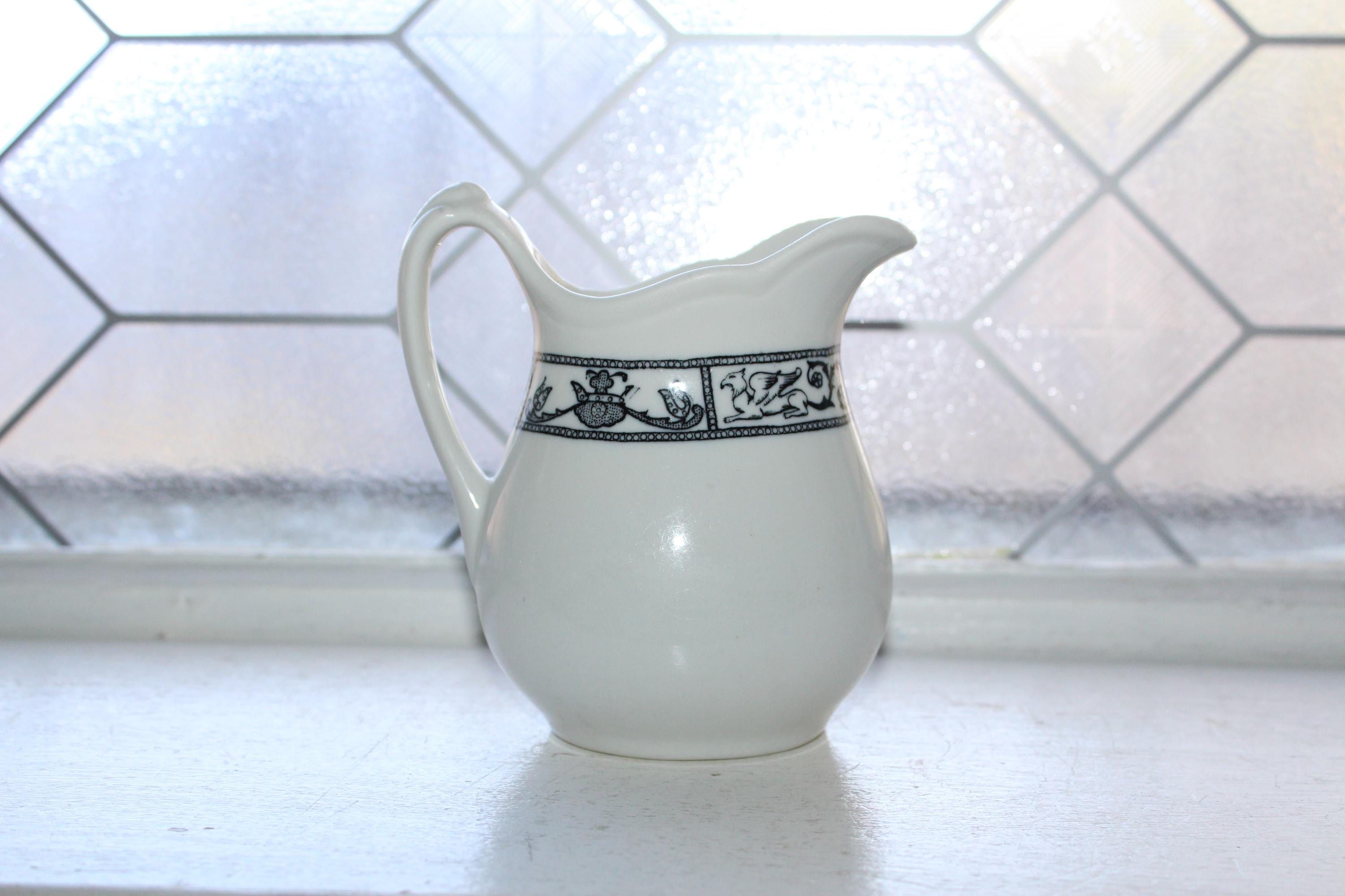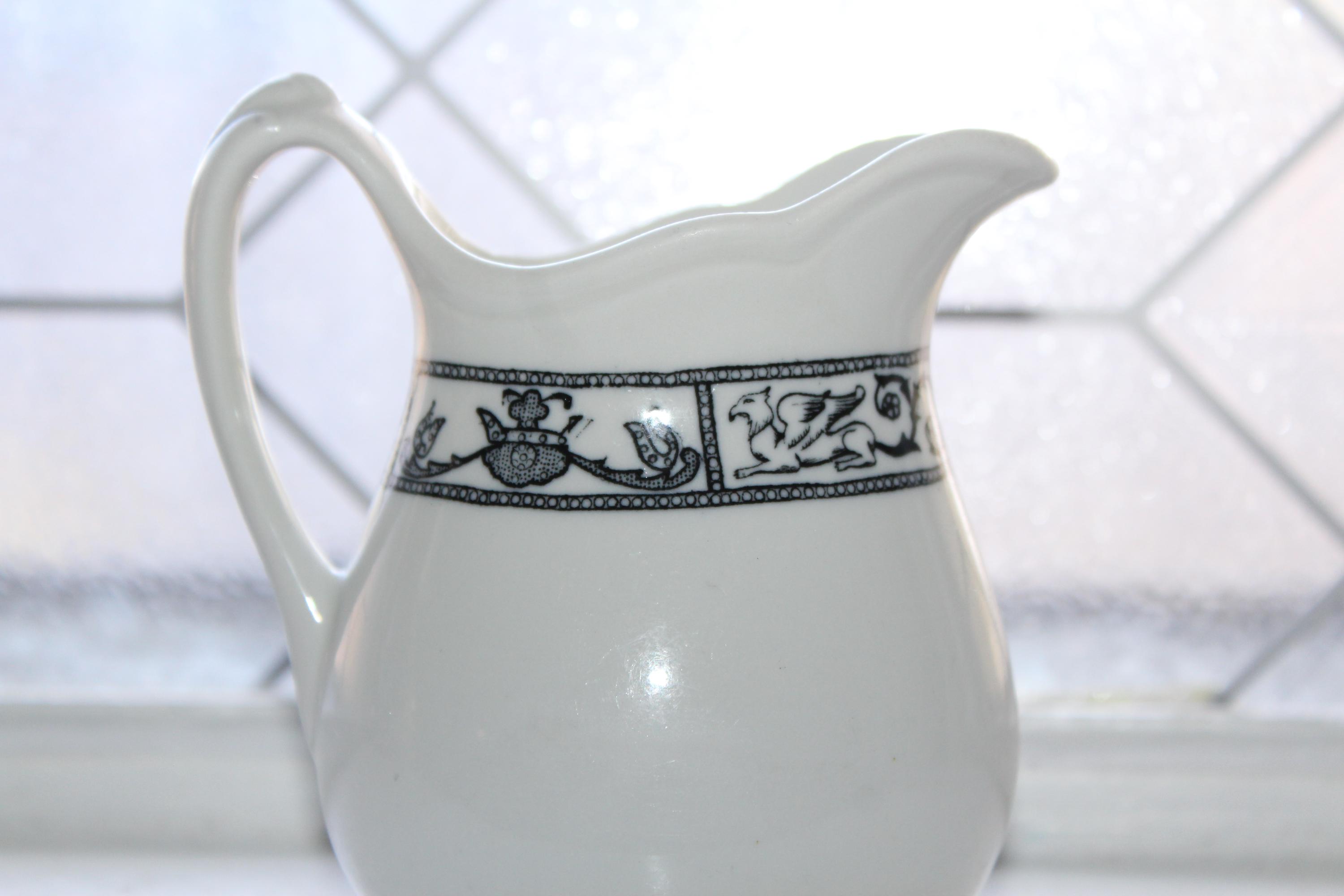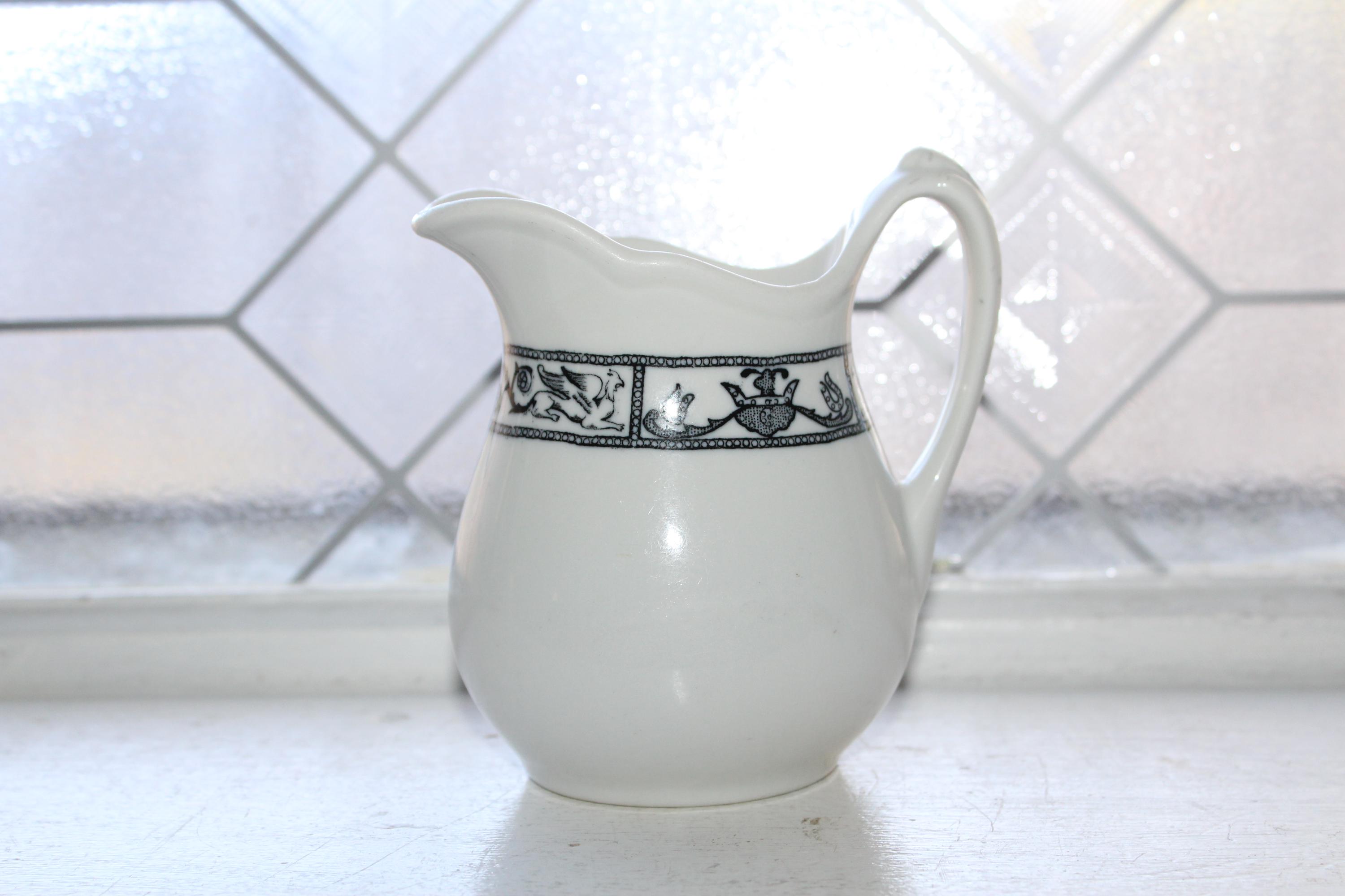 Antique 1920s restaurant ware creamer by Bailey Walker Vitrified China in the Black Seville pattern with griffins, 4 1/2" high, in excellent condition. Perfect for use or display in a country home. Enjoy!