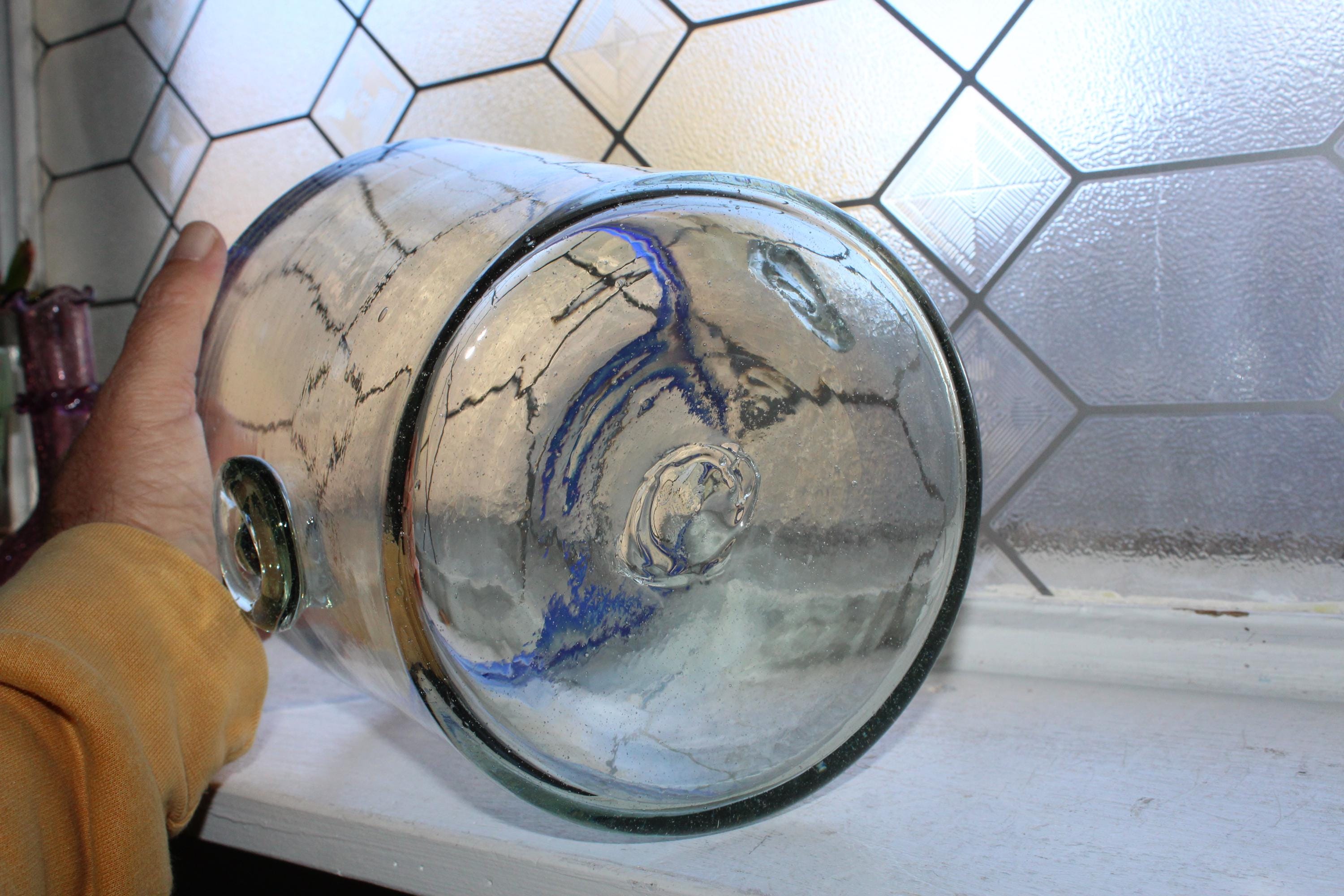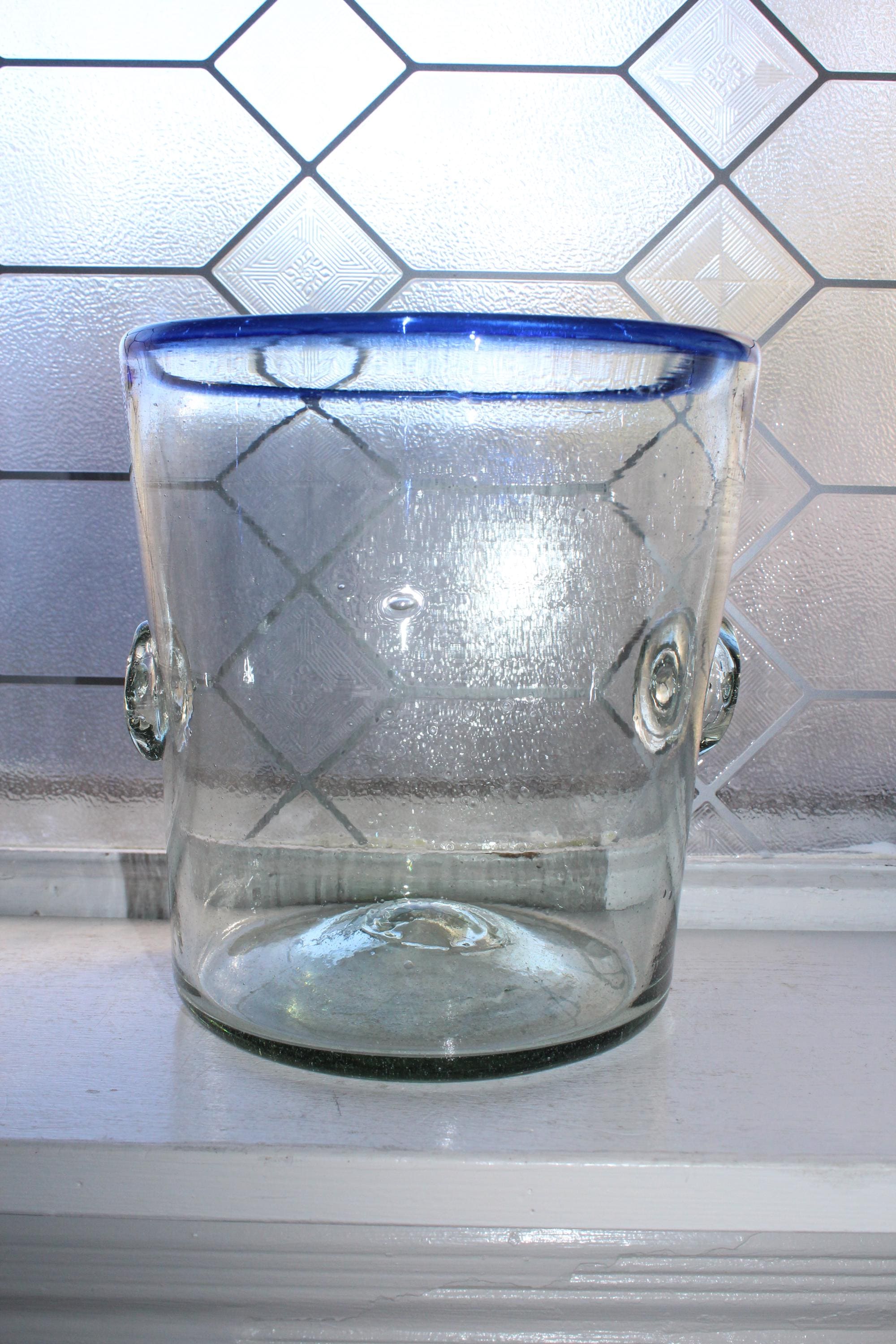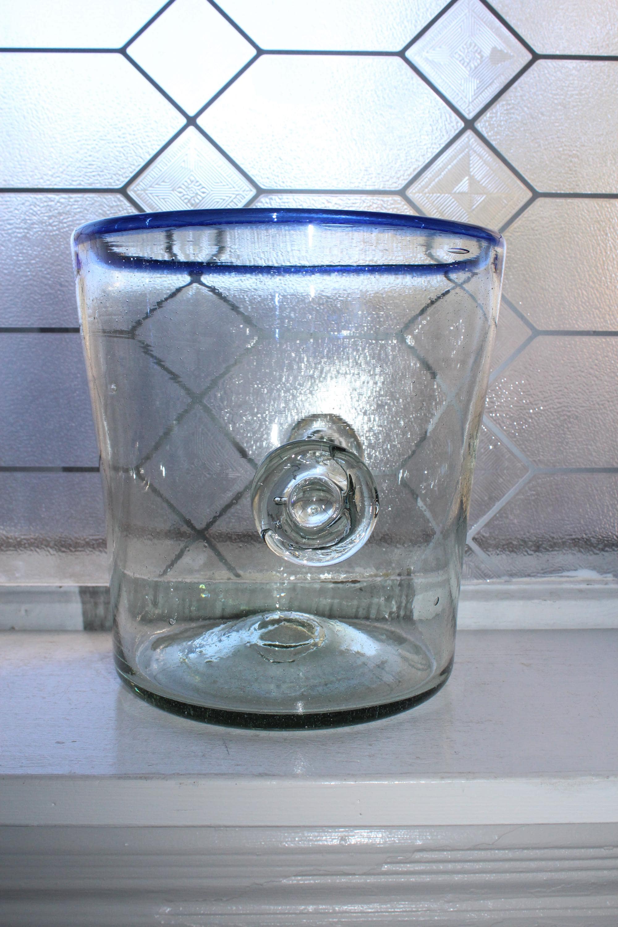 Vintage Mexican glass champagne or wine cooler / ice bucket blue rim and with knob handles, in excellent condition. It measures 7 3/4" high x 7 1/2" wide at the top and weighs 3 1/4 lbs. No chips or cracks, perfect for use or display. Enjoy!
