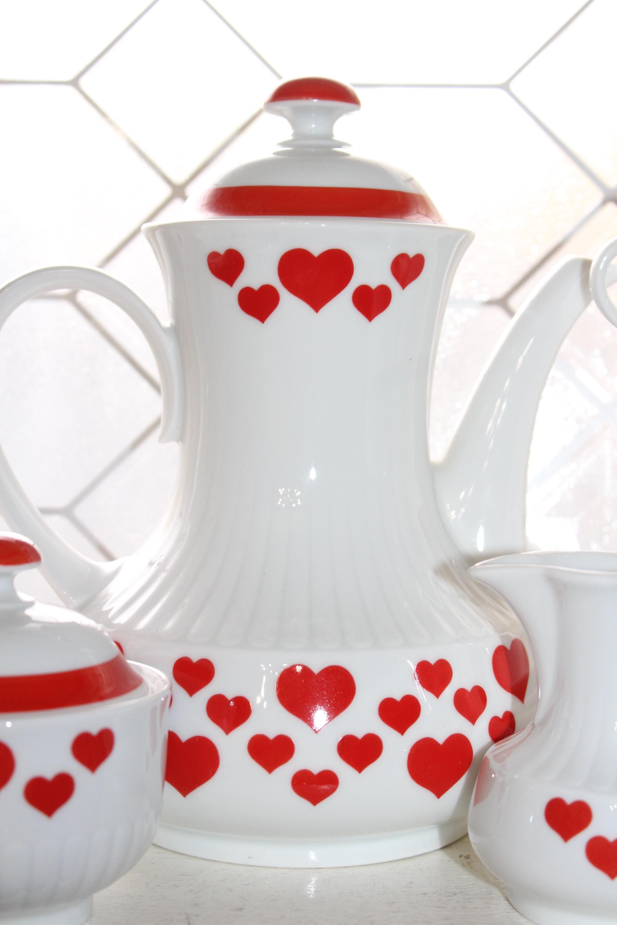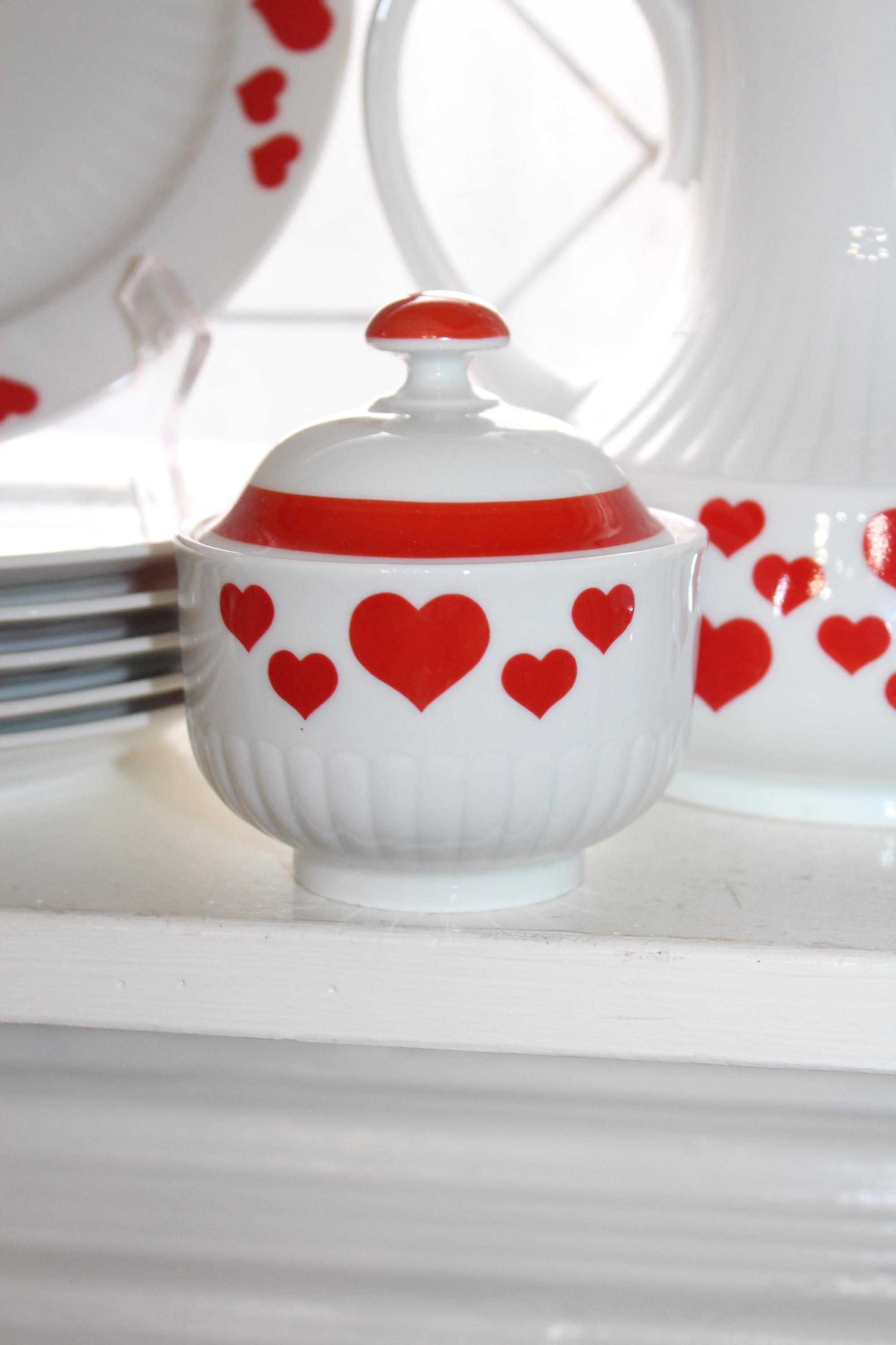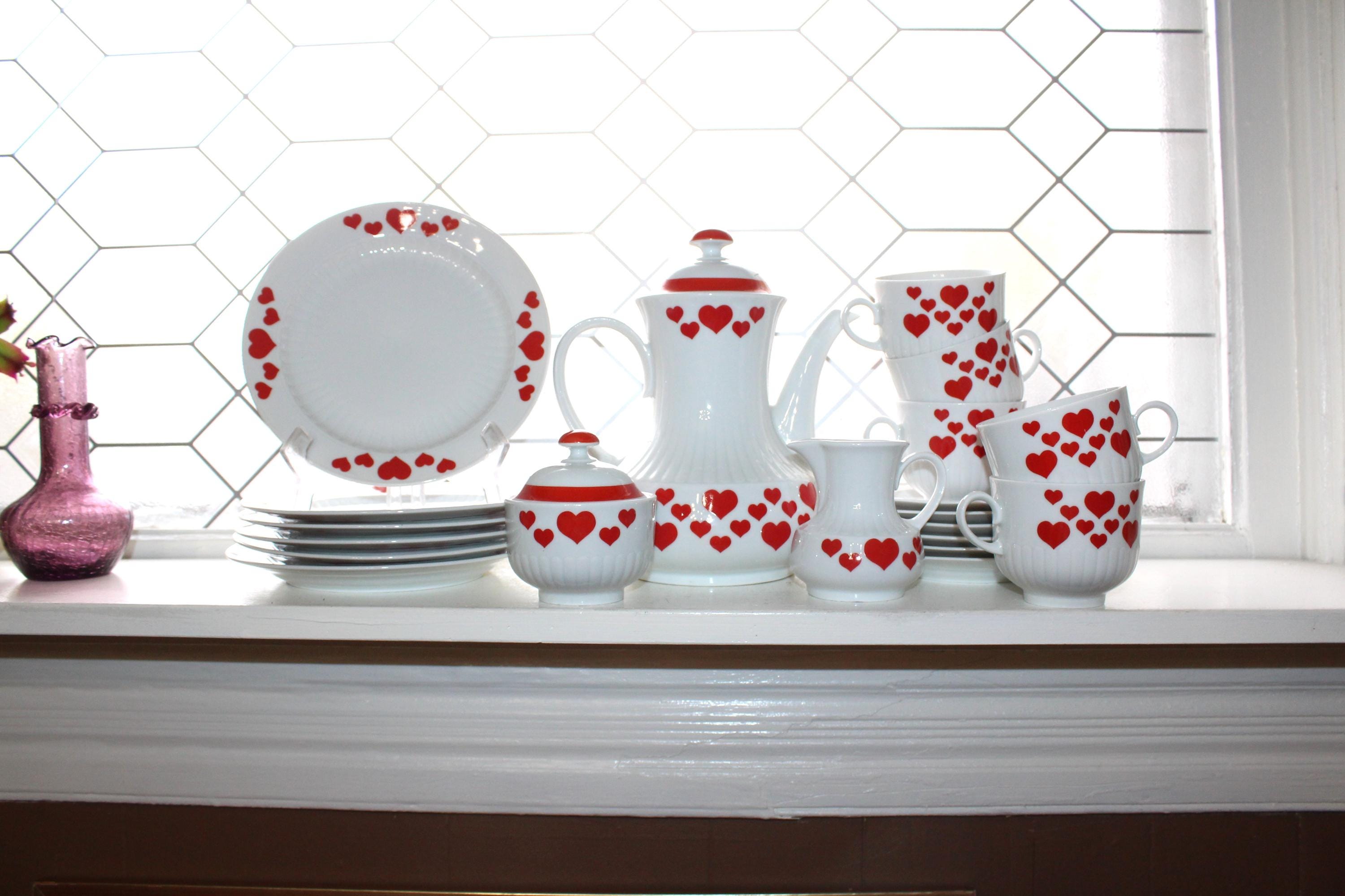 Vintage Winterling Marktleuthen Bavaria Hearts luncheon set/tea service, great for use or display. Wonderful Mid Century styling with a bold red and white hearts design. The set consists of teapot or coffee pot with lid, creamer, sugar bowl with lid, 6 luncheon or salad plates, 5 cups, 6 saucers. The plates measure 7 3/4" wide. No chips or cracks, just some age appropriate light wear on the plates. Enjoy!
